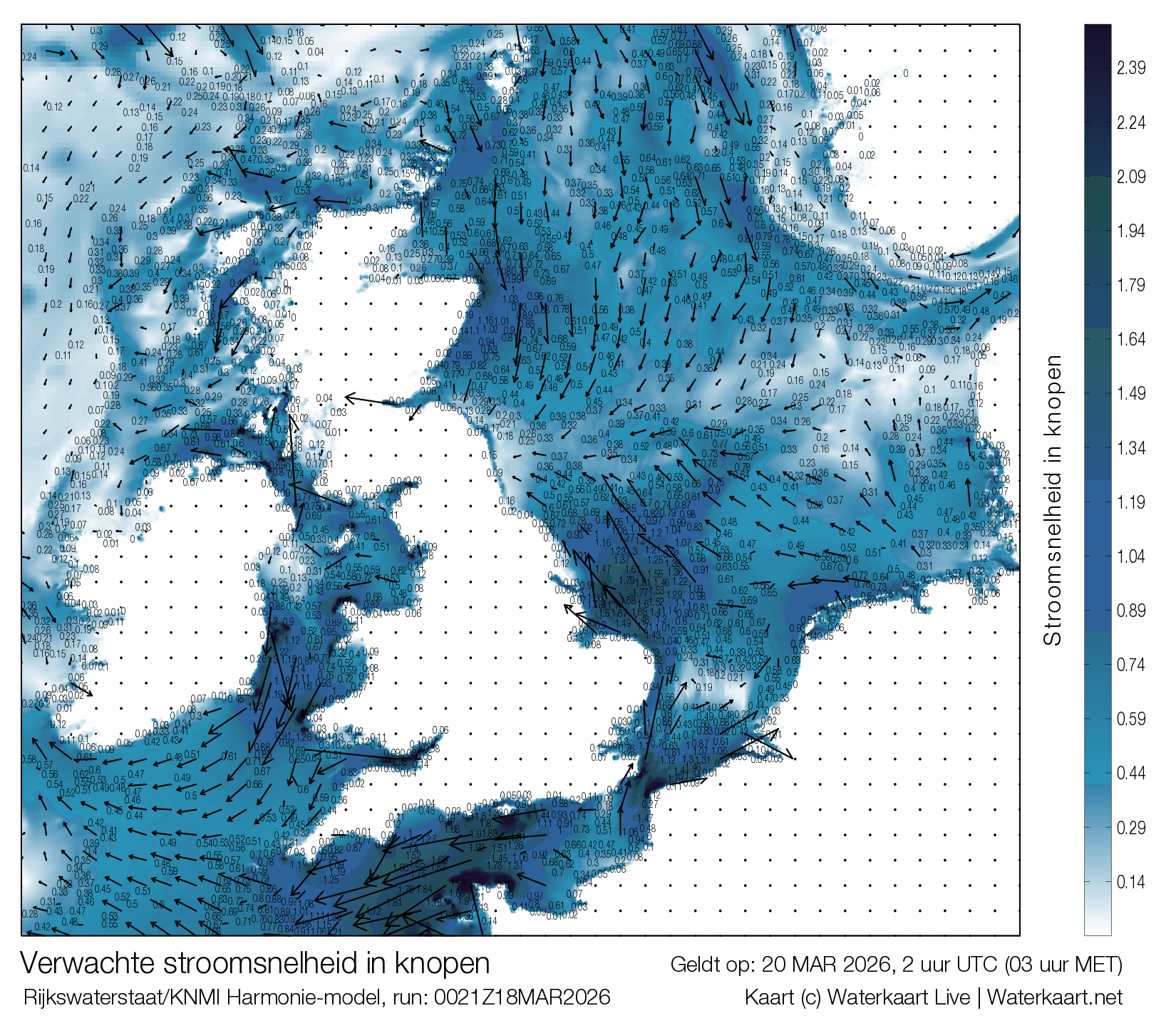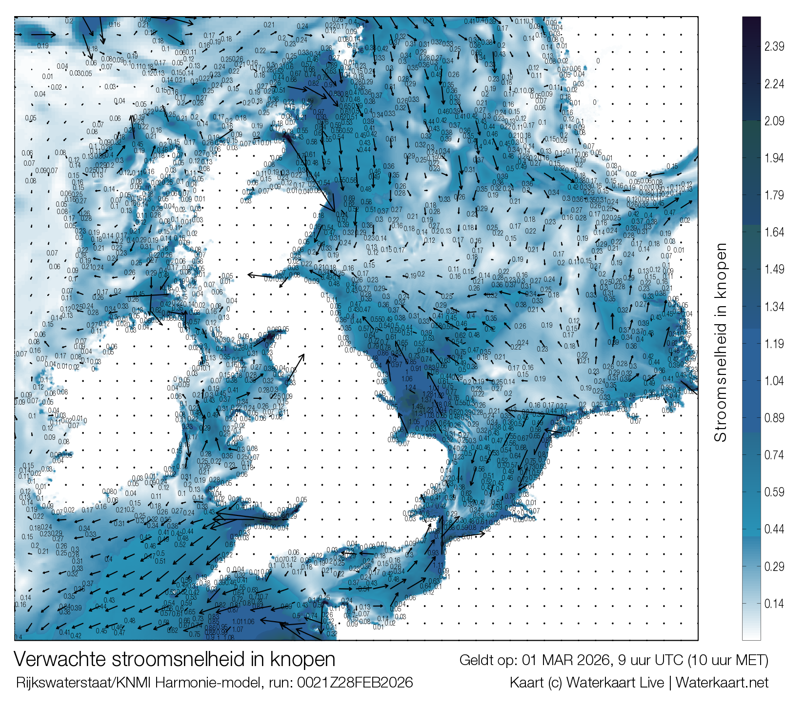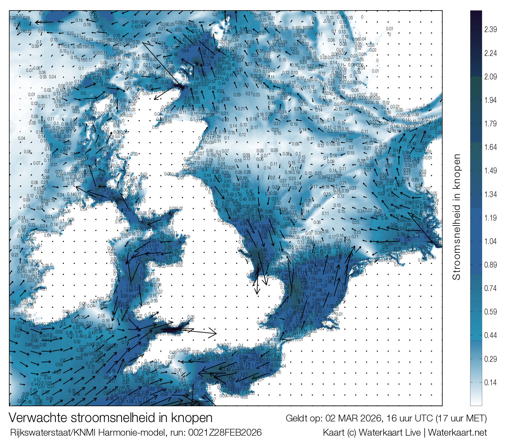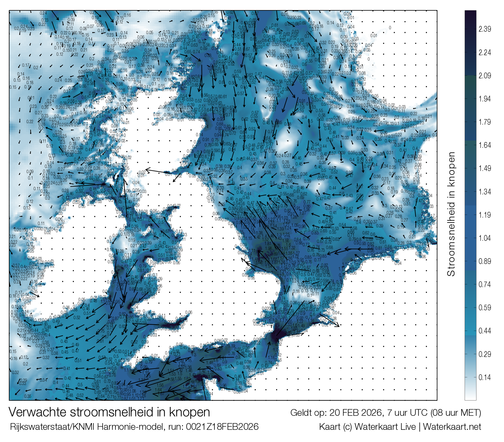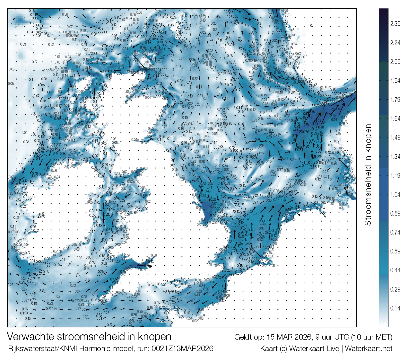 Stroomsnelheden in de Noordzee op basis van de Stroomatlas, verrekend met weersinvloeden. Deze worden iedere dag ververst met data uit het zeestromingen model van Rijkswaterstaat op basis van Harmonie weerdata, voor ieder uur een kaart, tot 48 uur in de toekomst. Lees hieronder meer over dit model