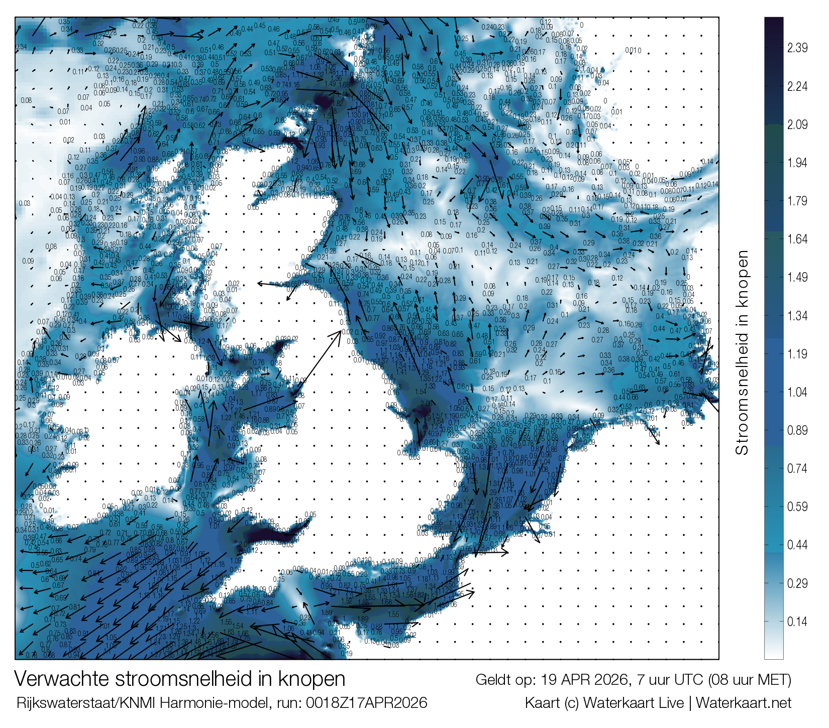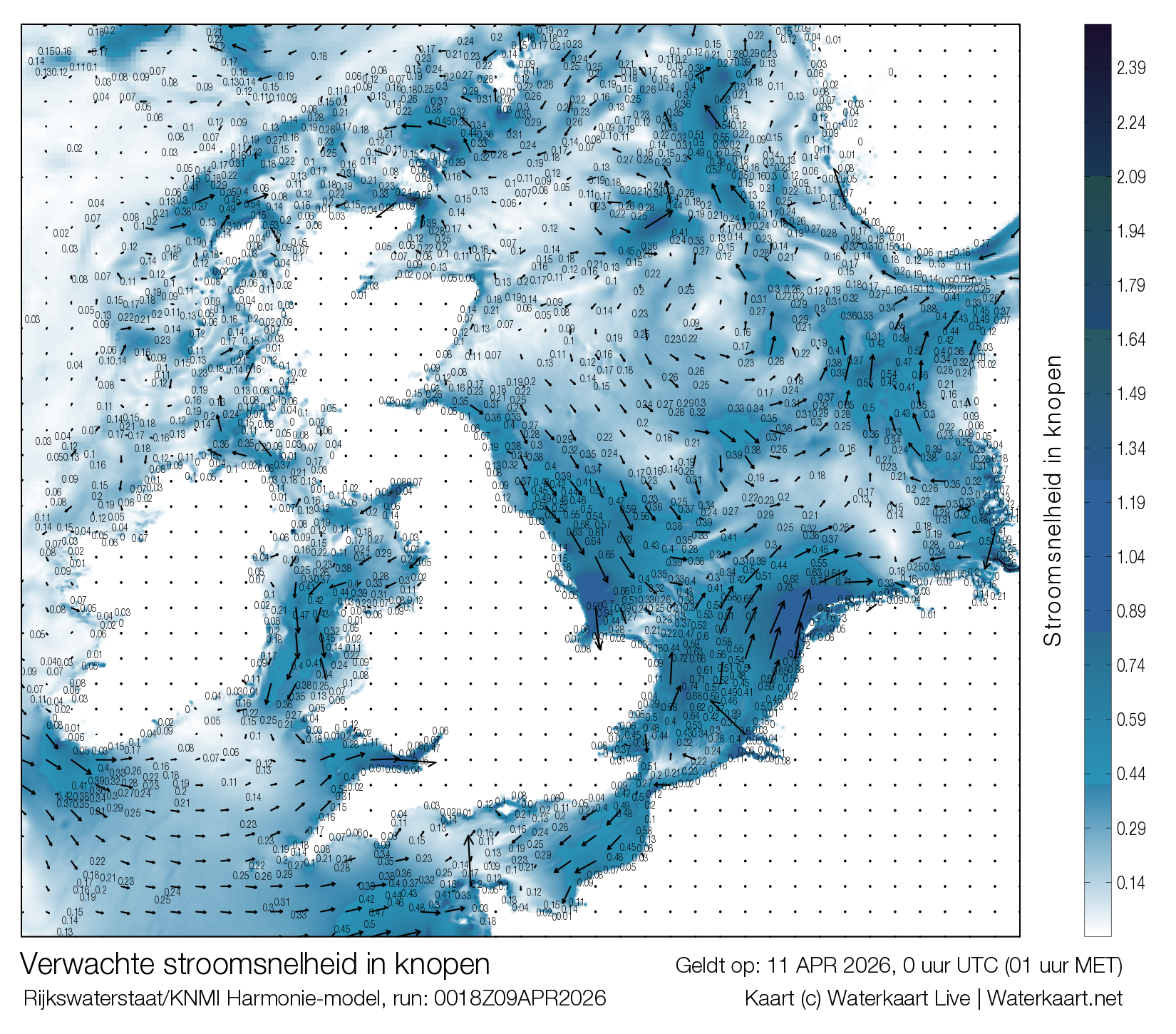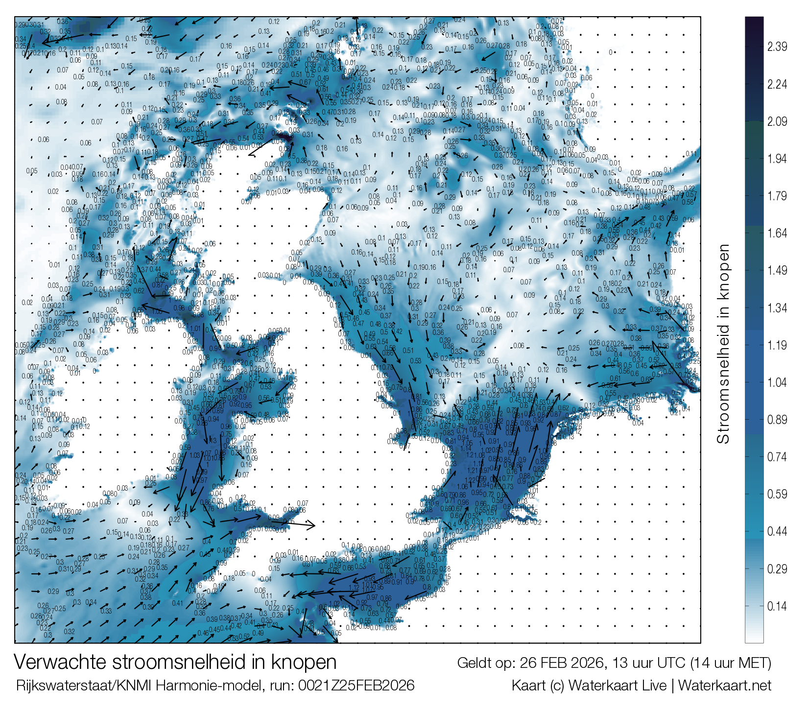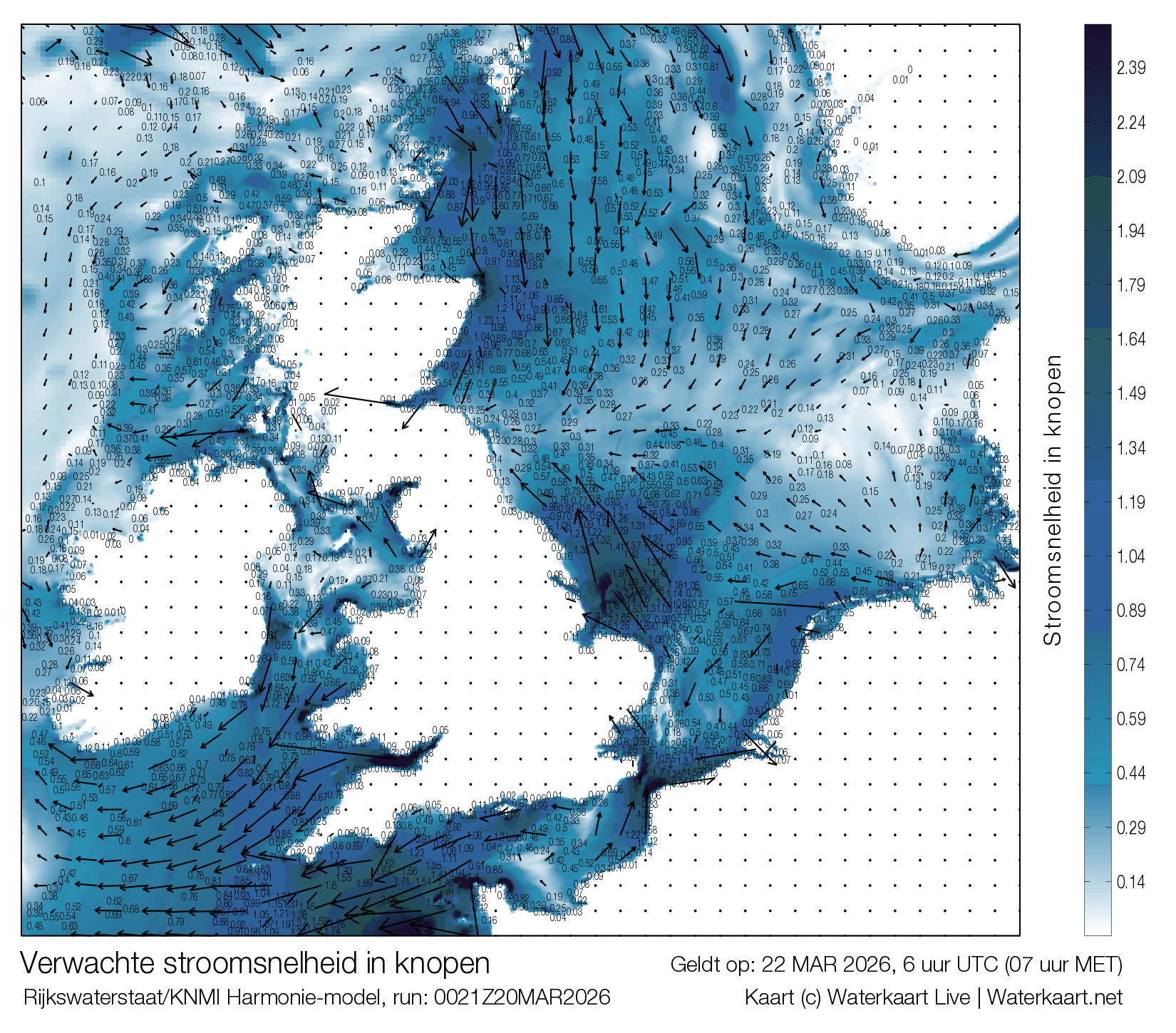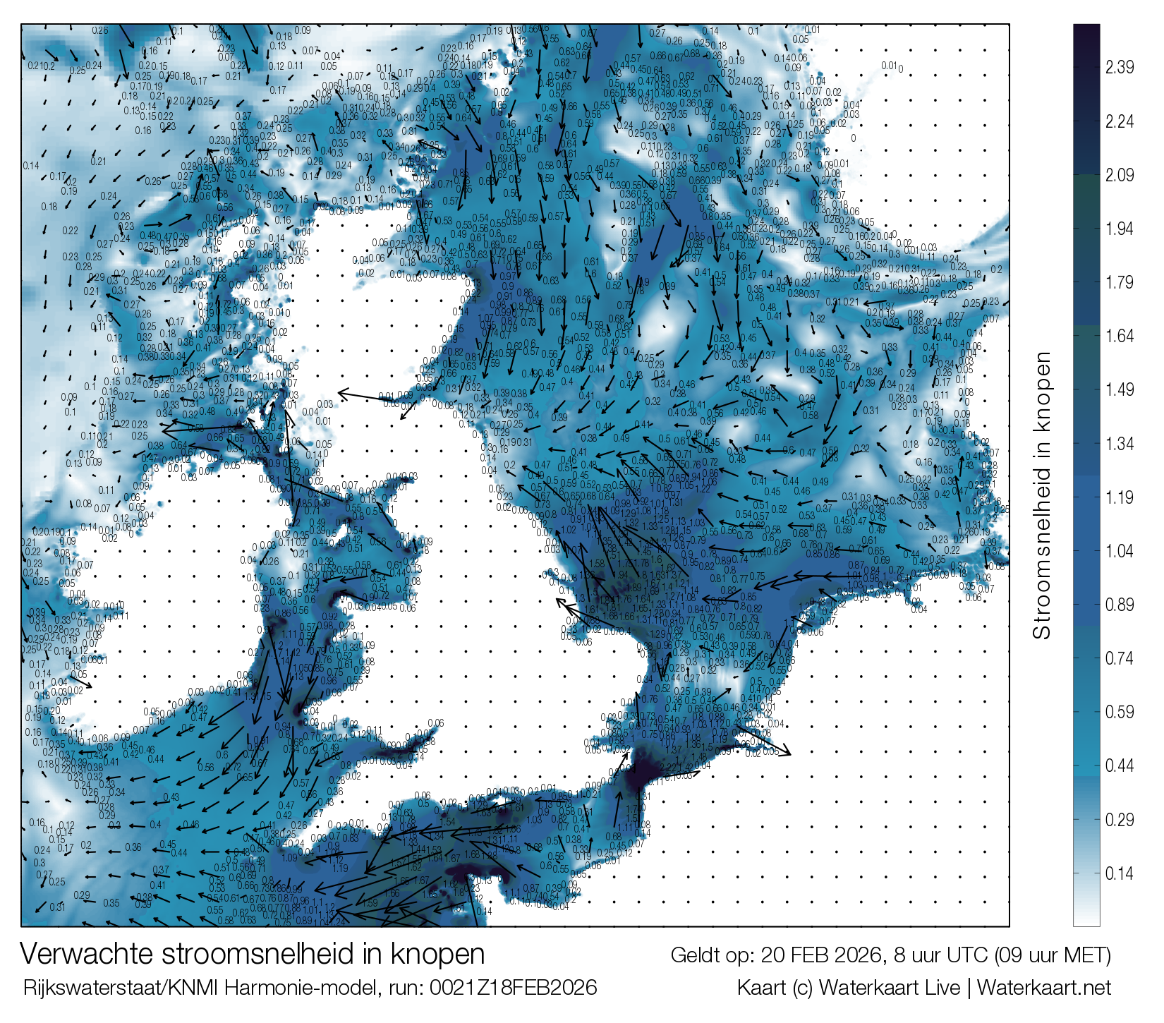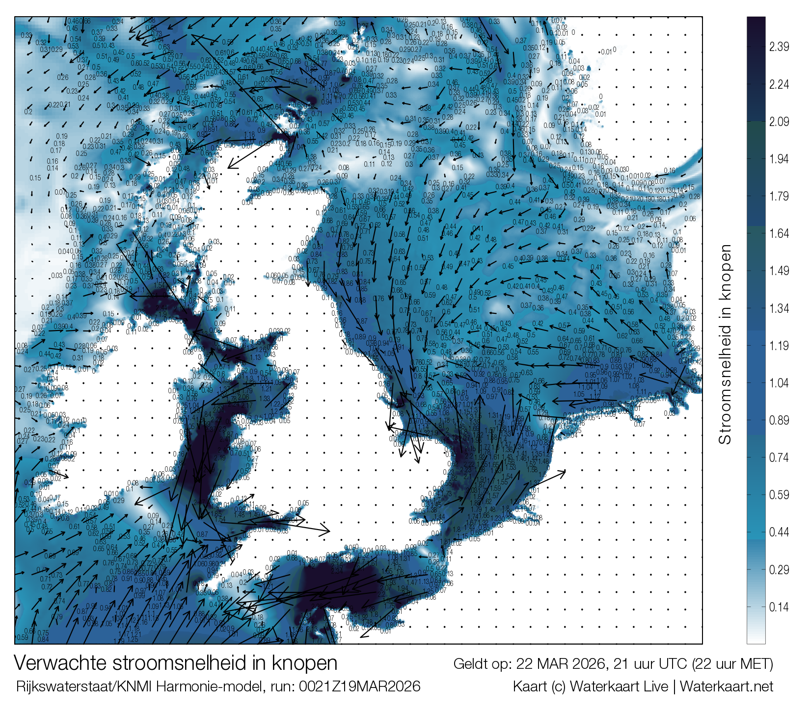 Stroomsnelheden in de Noordzee op basis van de Stroomatlas, verrekend met weersinvloeden. Deze worden iedere dag ververst met data uit het zeestromingen model van Rijkswaterstaat op basis van Harmonie weerdata, voor ieder uur een kaart, tot 48 uur in de toekomst. Lees hieronder meer over dit model