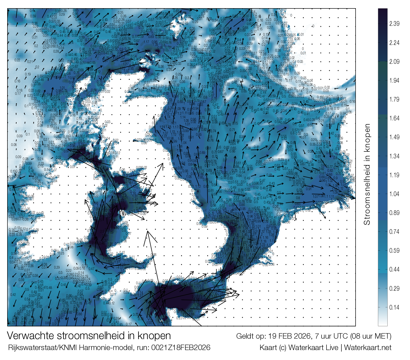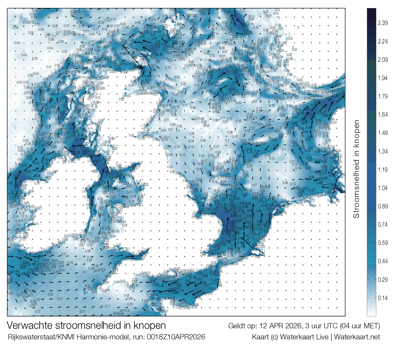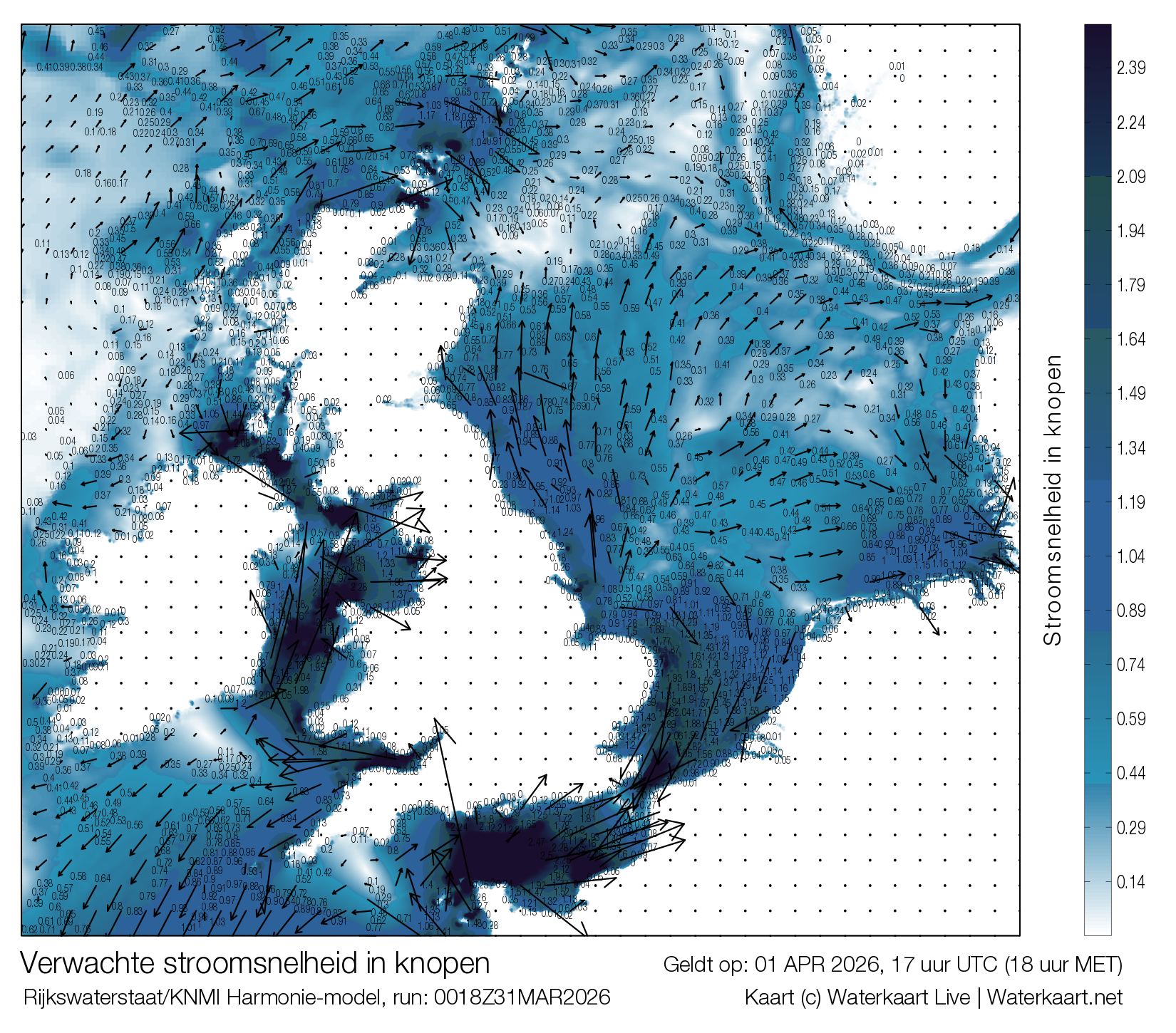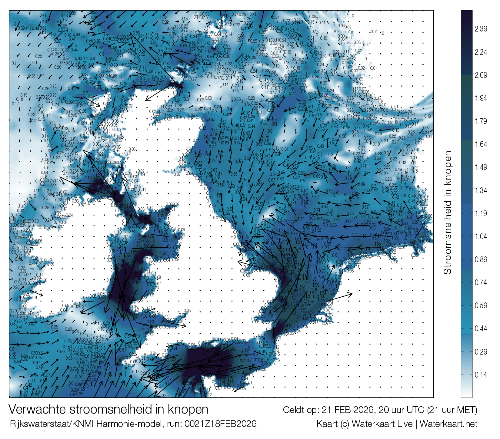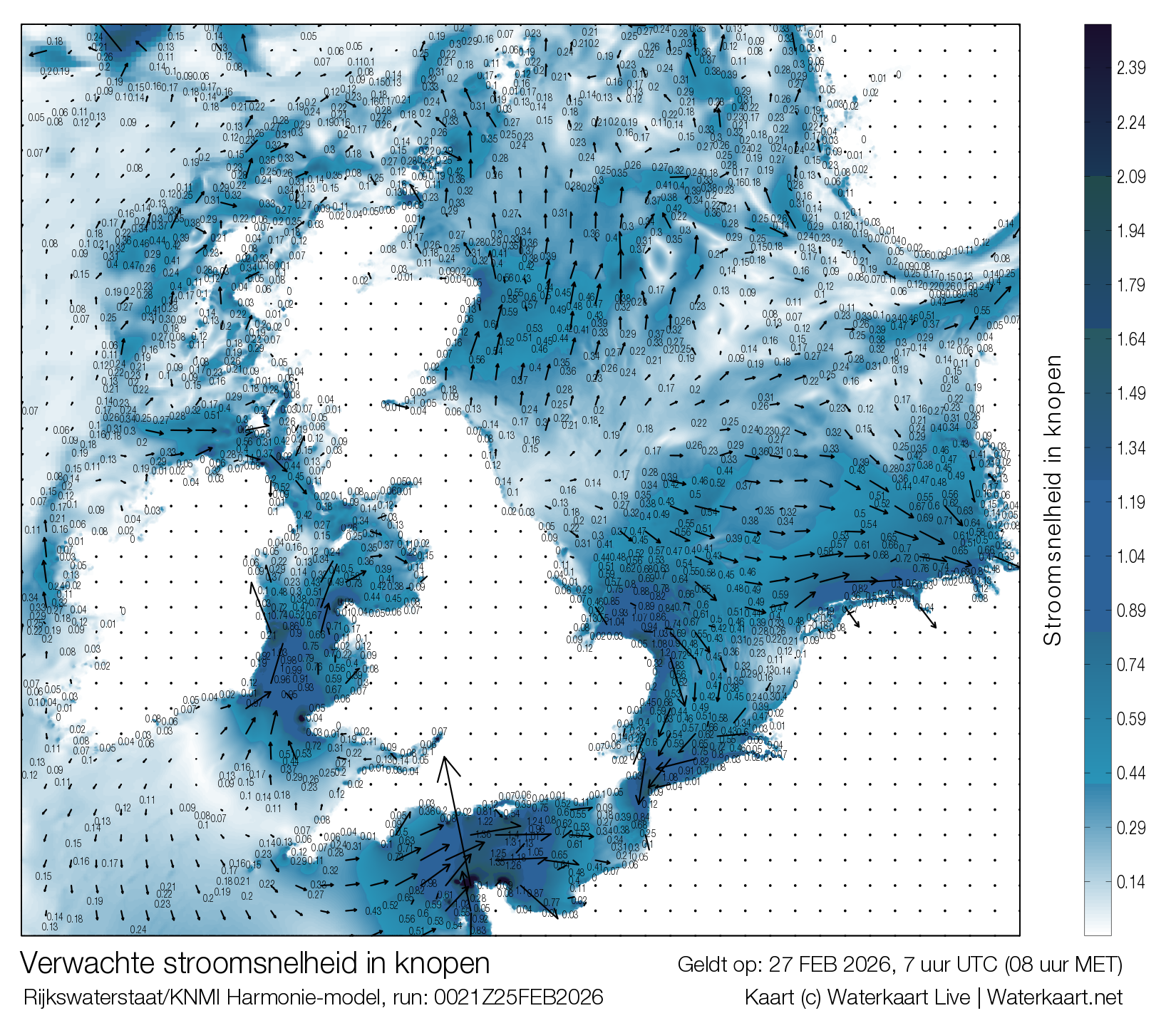 Stroomsnelheden in de Noordzee op basis van de Stroomatlas, verrekend met weersinvloeden. Deze worden iedere dag ververst met data uit het zeestromingen model van Rijkswaterstaat op basis van Harmonie weerdata, voor ieder uur een kaart, tot 48 uur in de toekomst. Lees hieronder meer over dit model