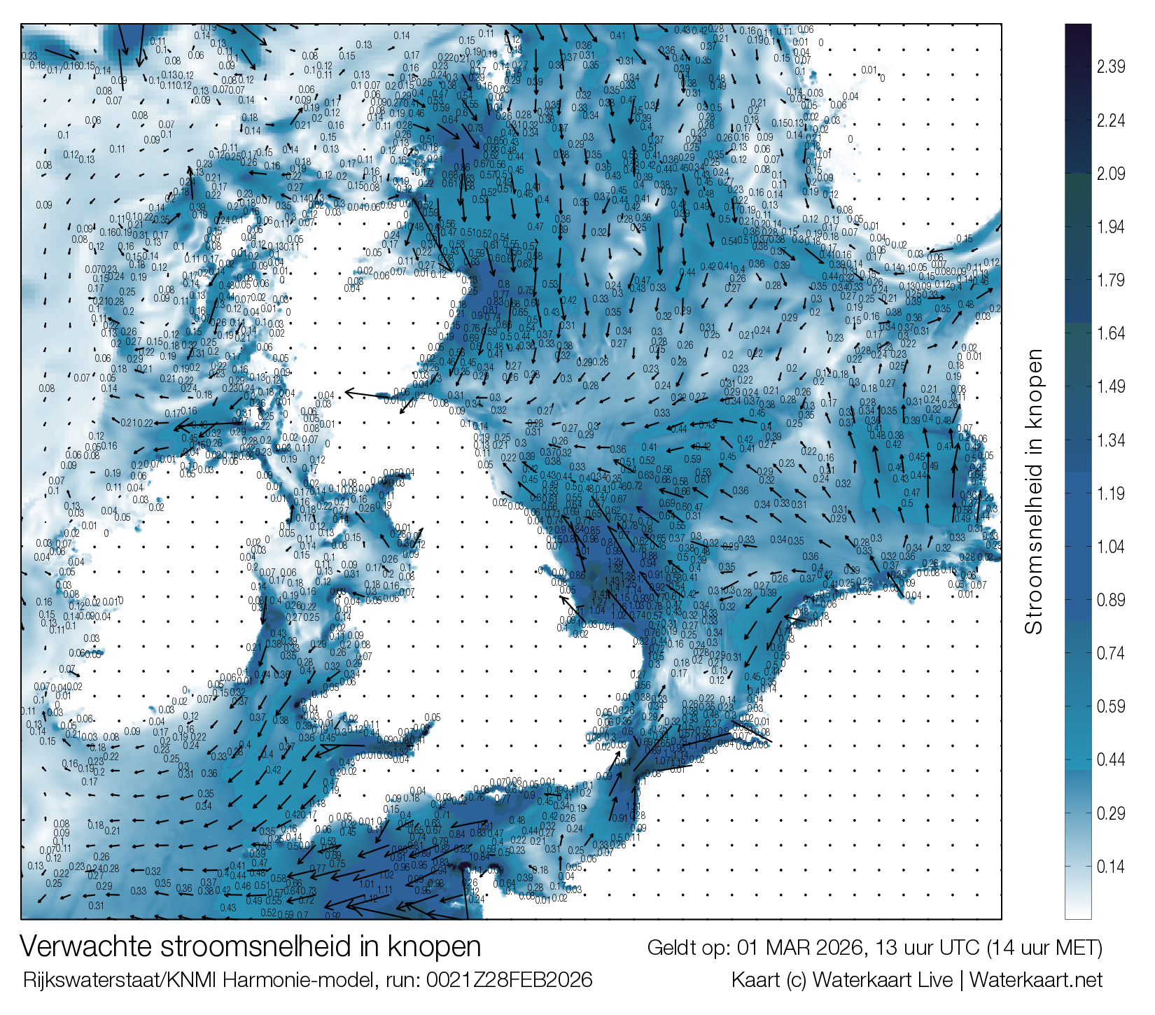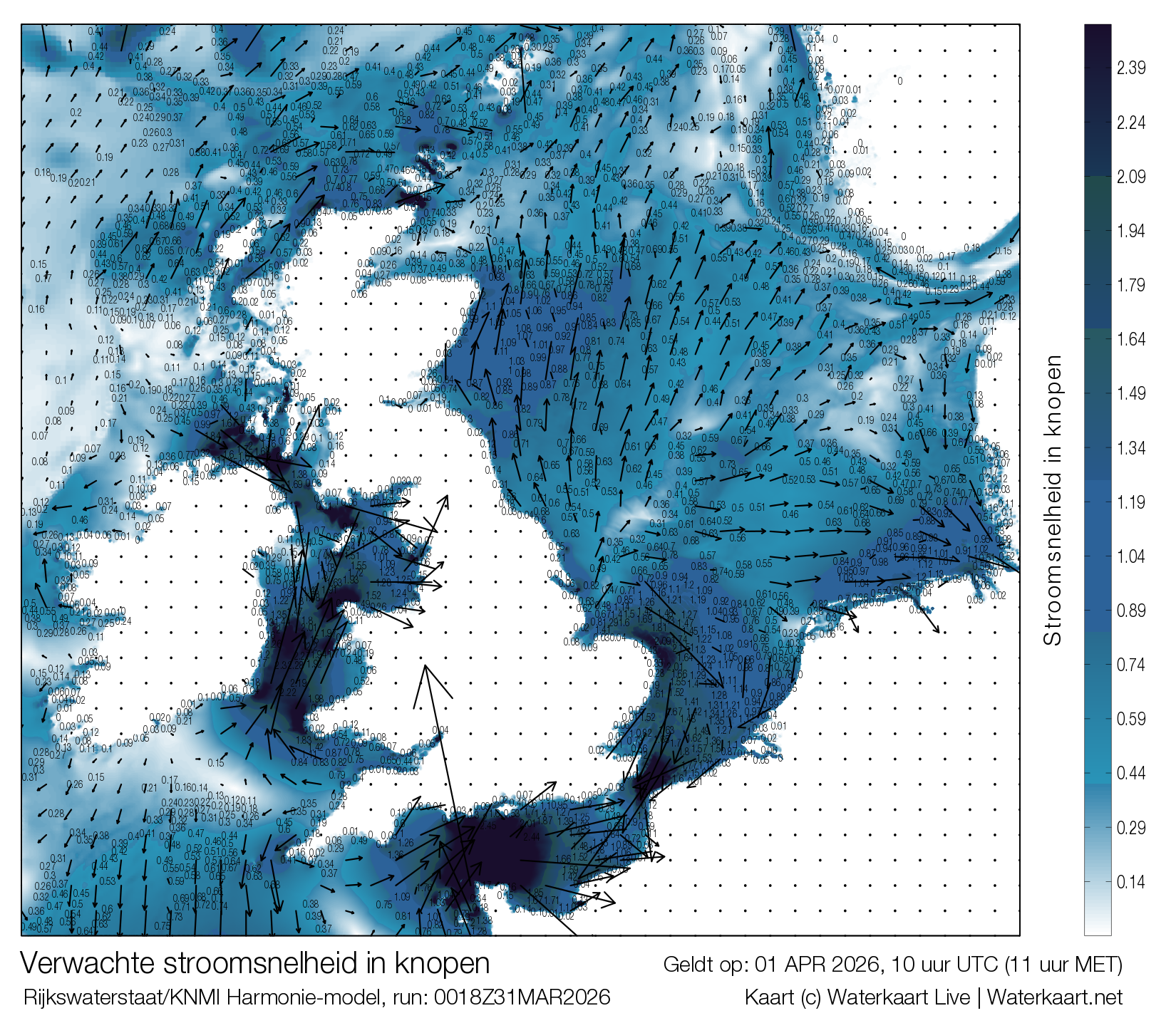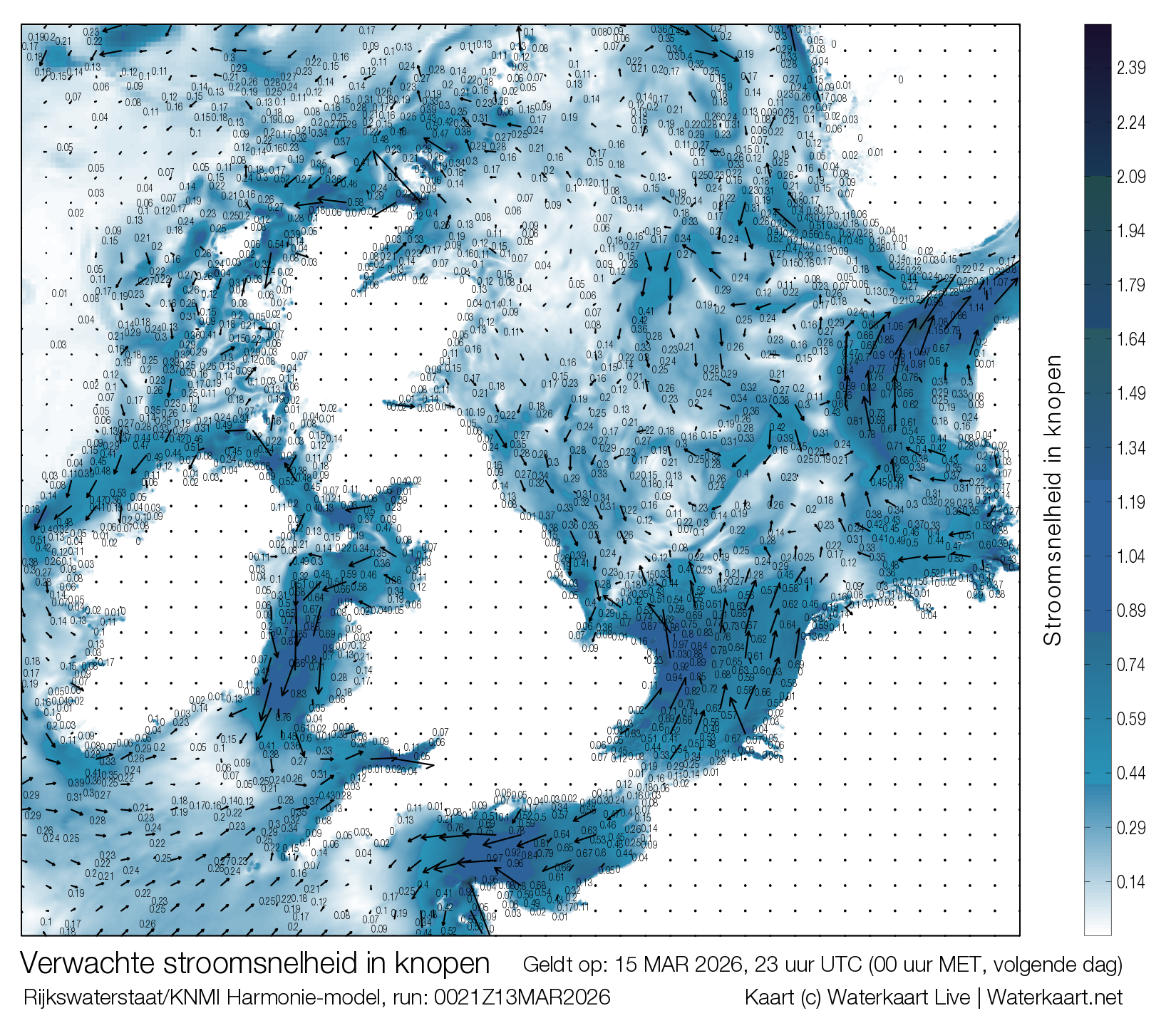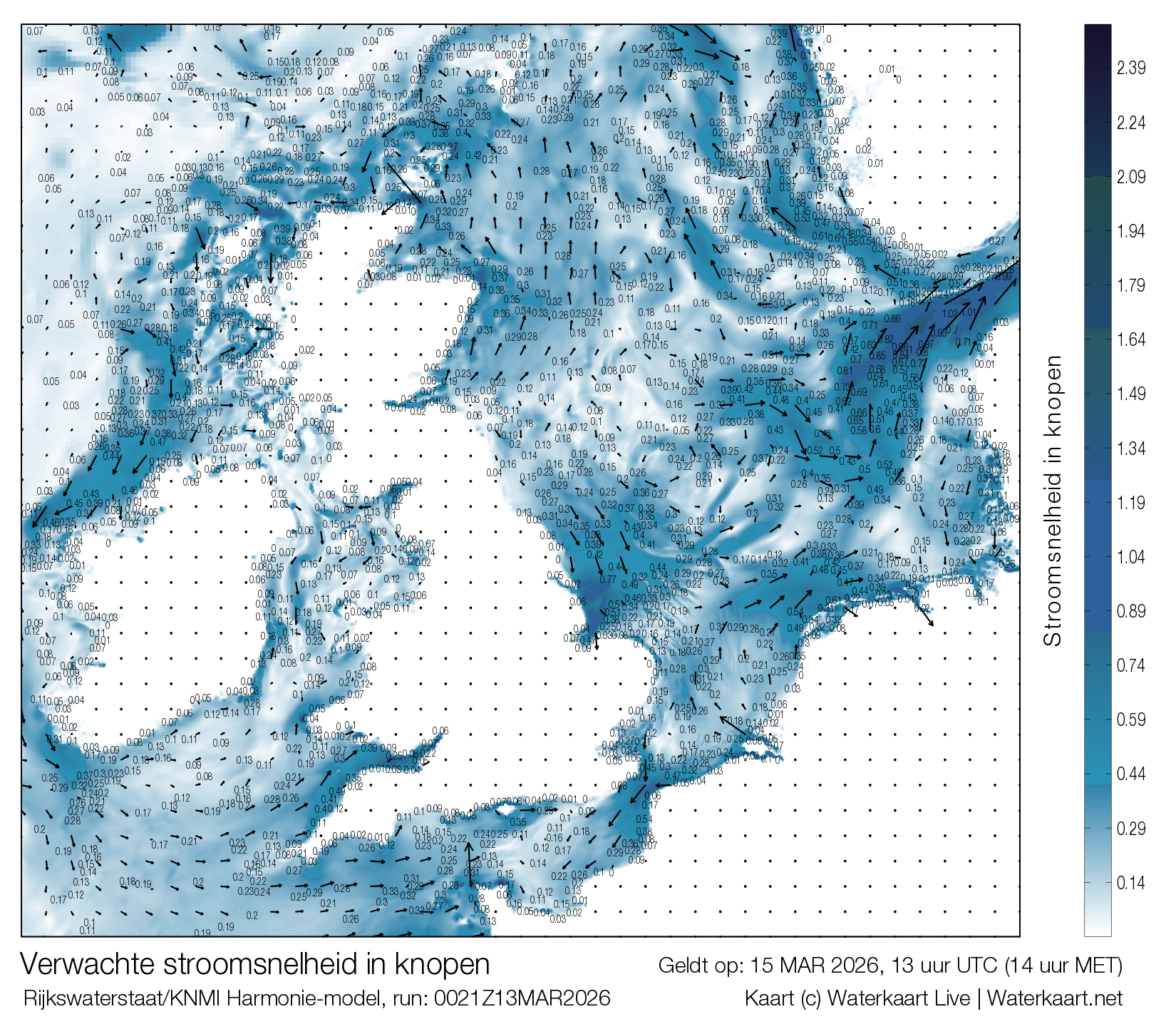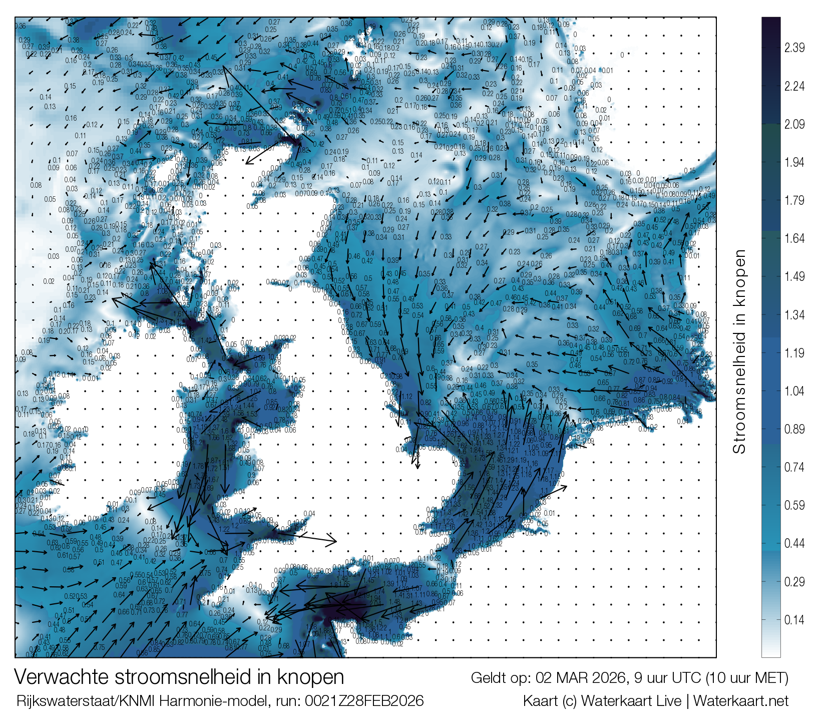 Stroomsnelheden in de Noordzee op basis van de Stroomatlas, verrekend met weersinvloeden. Deze worden iedere dag ververst met data uit het zeestromingen model van Rijkswaterstaat op basis van Harmonie weerdata, voor ieder uur een kaart, tot 48 uur in de toekomst. Lees hieronder meer over dit model