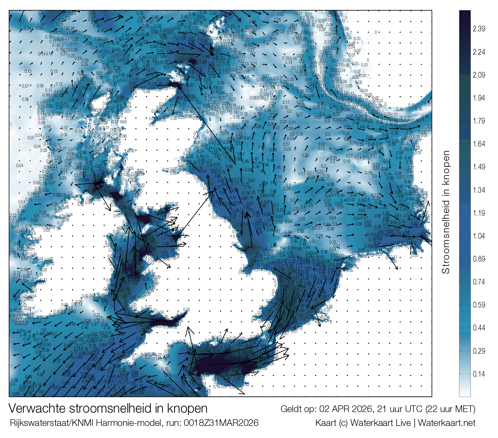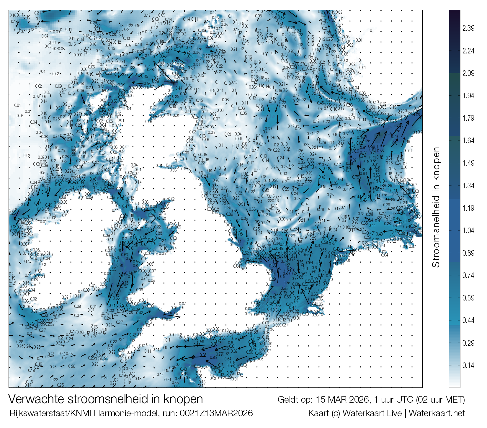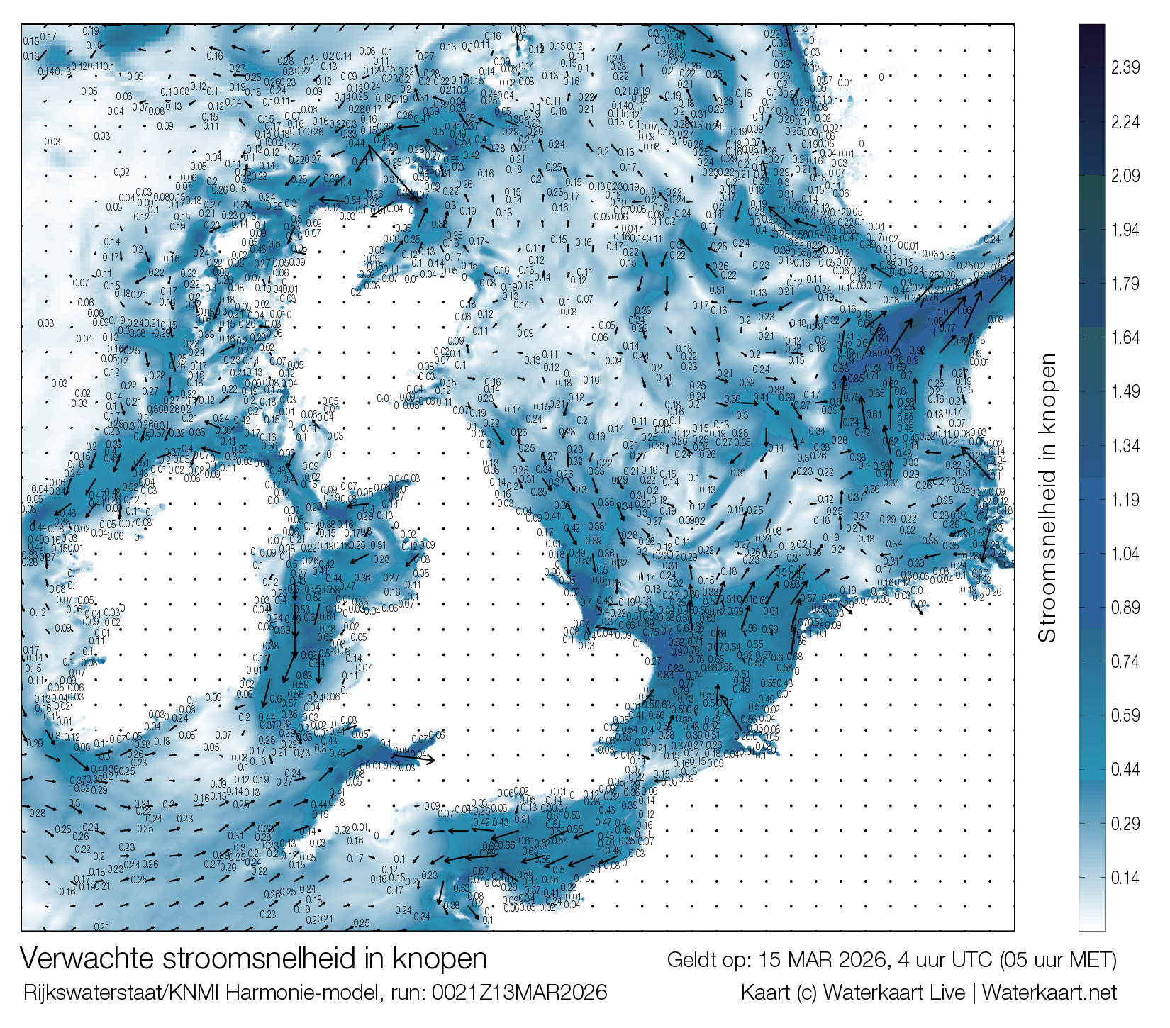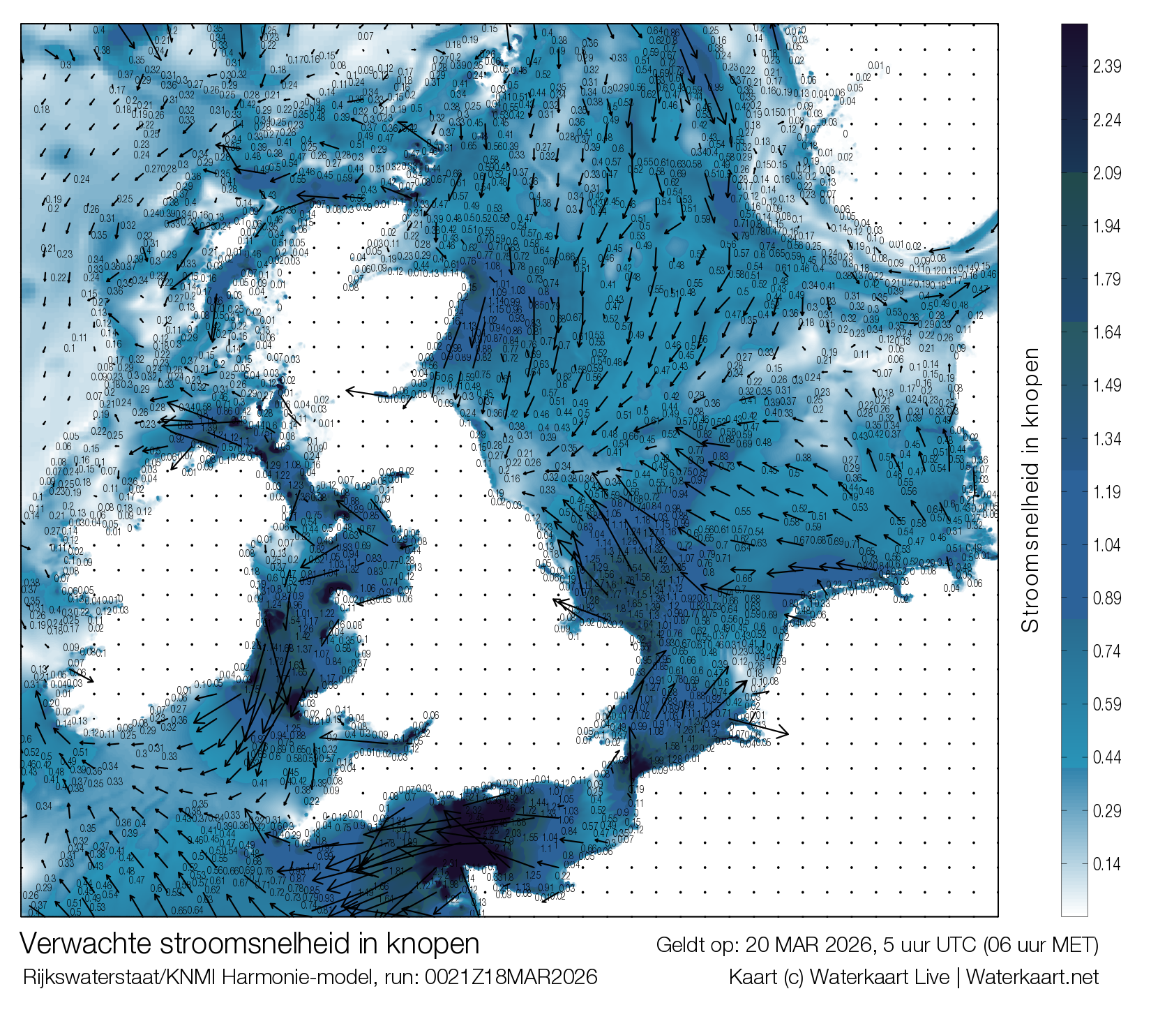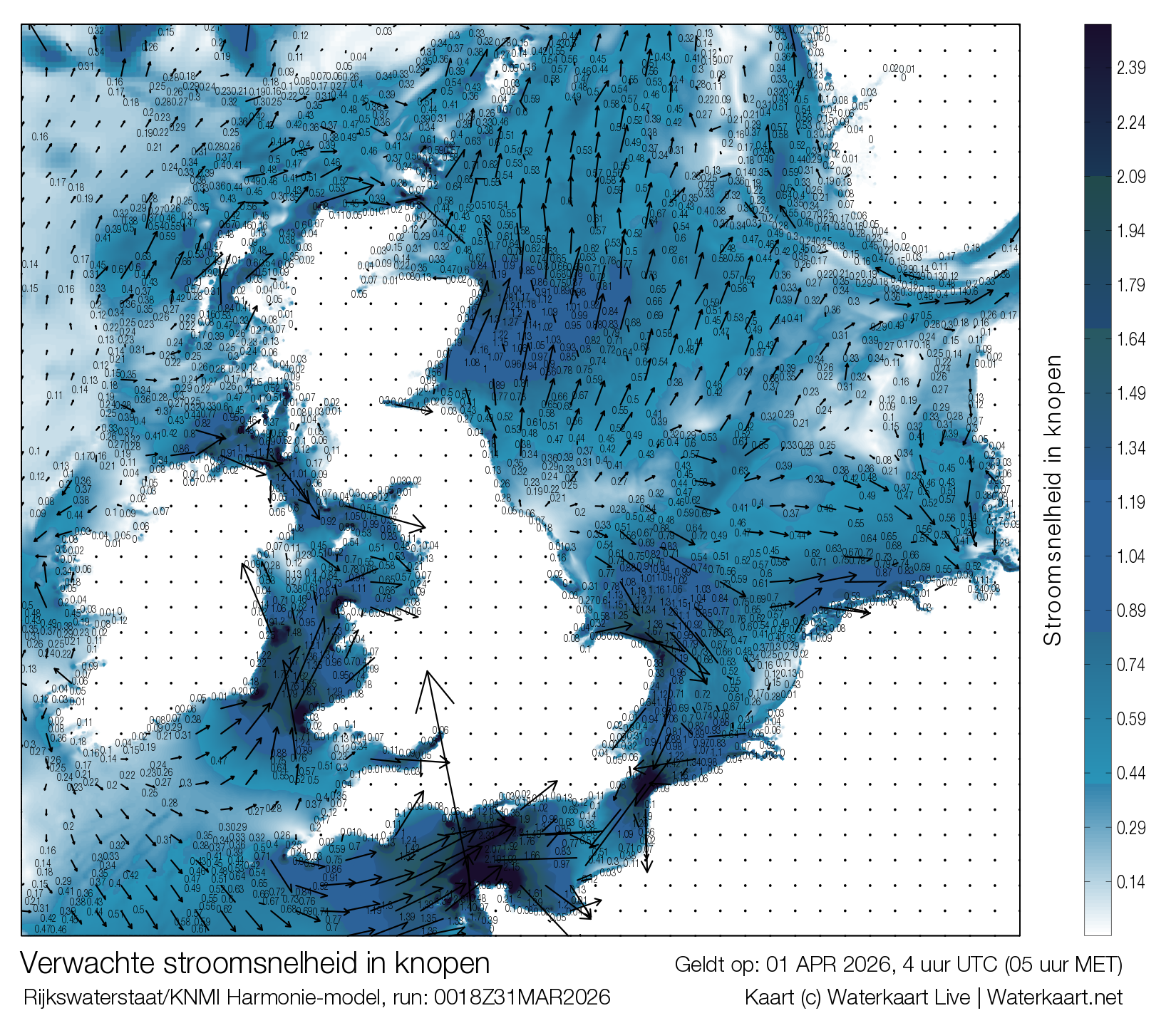 Stroomsnelheden in de Noordzee op basis van de Stroomatlas, verrekend met weersinvloeden. Deze worden iedere dag ververst met data uit het zeestromingen model van Rijkswaterstaat op basis van Harmonie weerdata, voor ieder uur een kaart, tot 48 uur in de toekomst. Lees hieronder meer over dit model