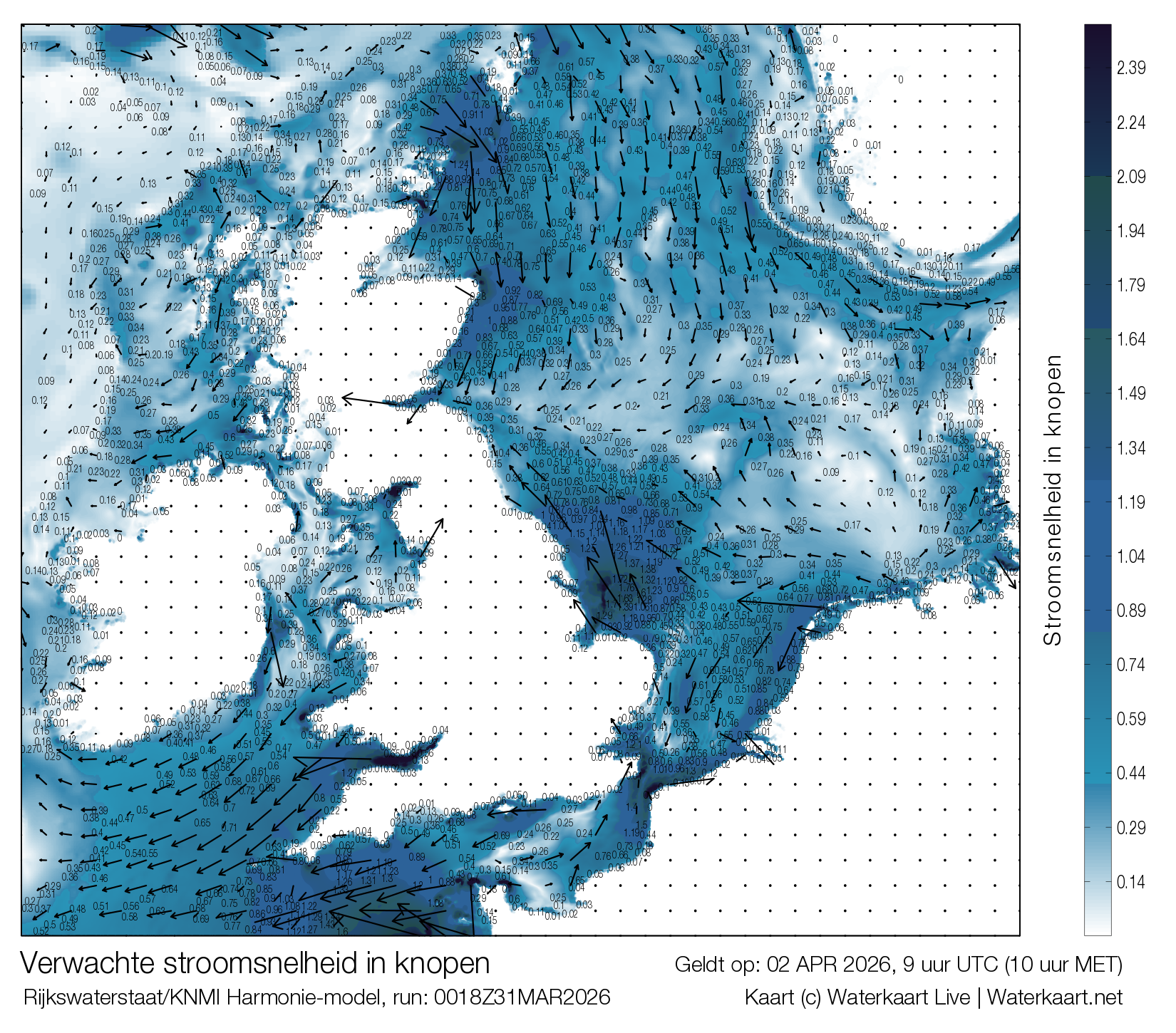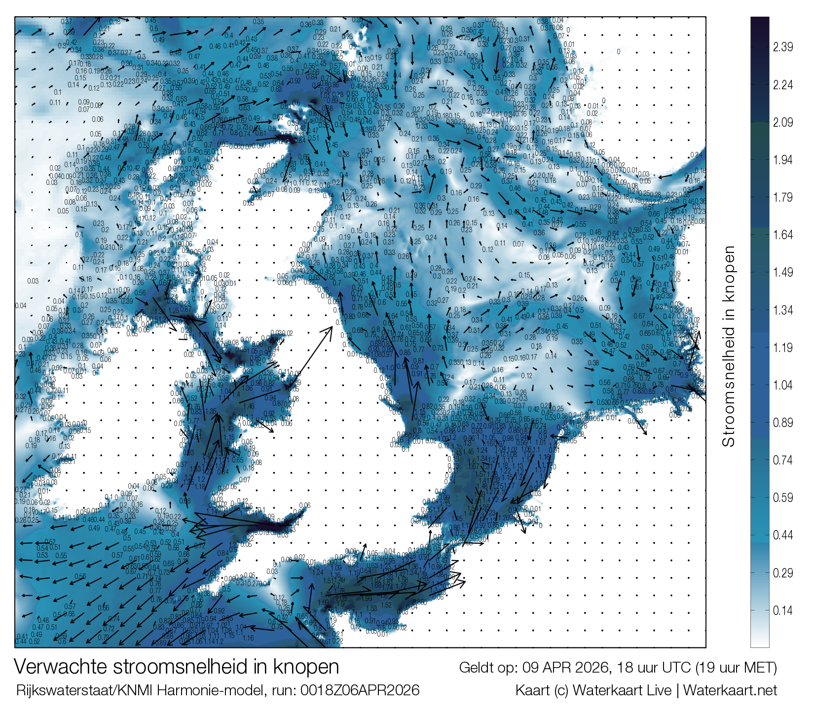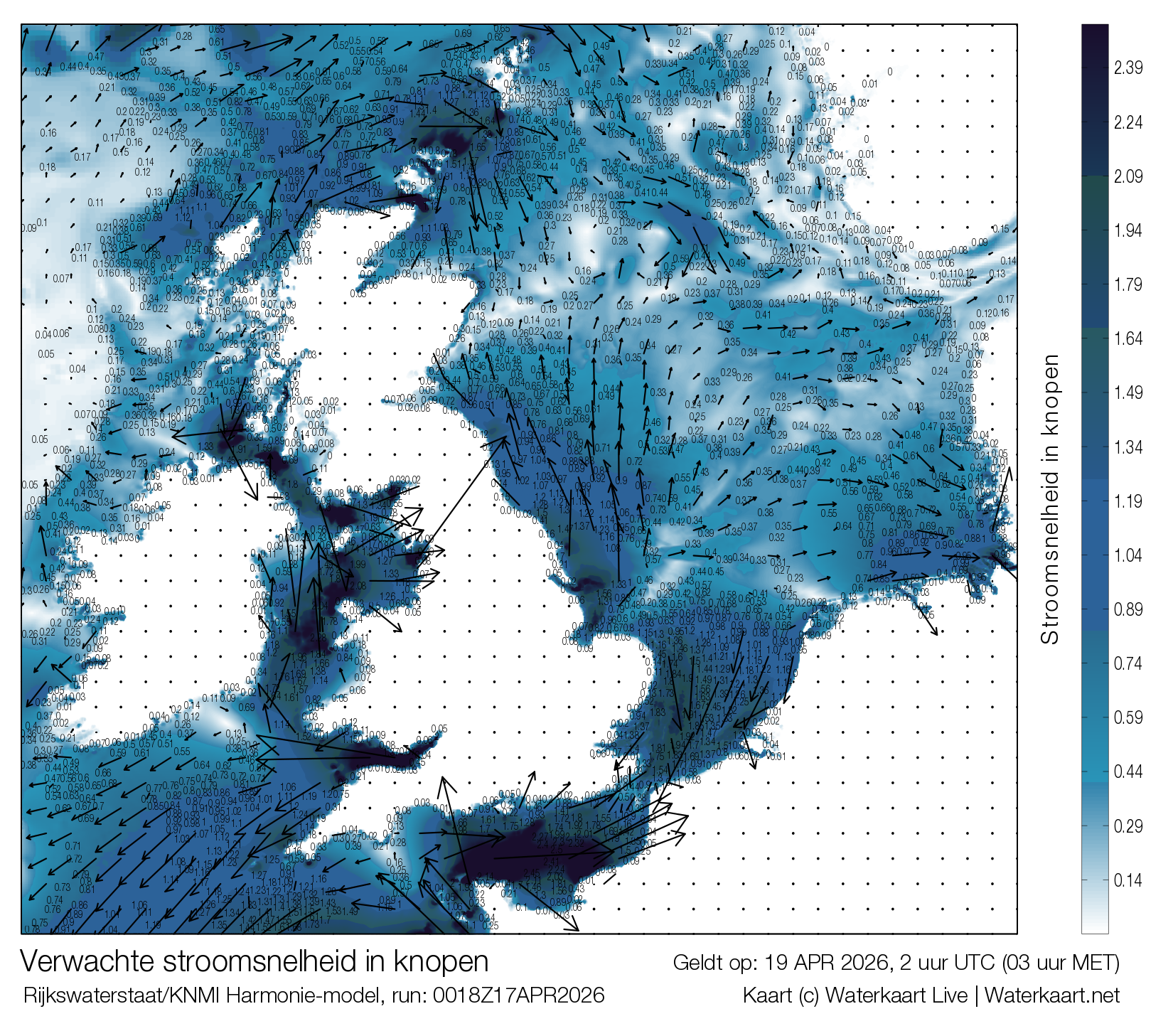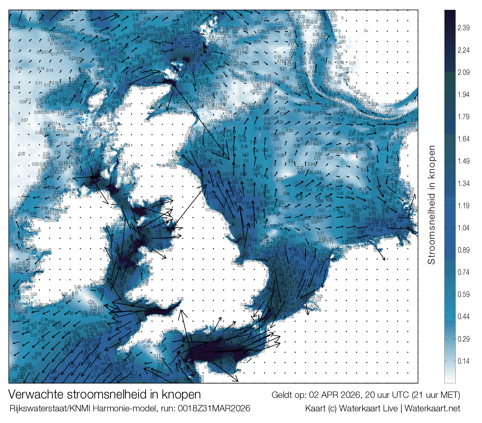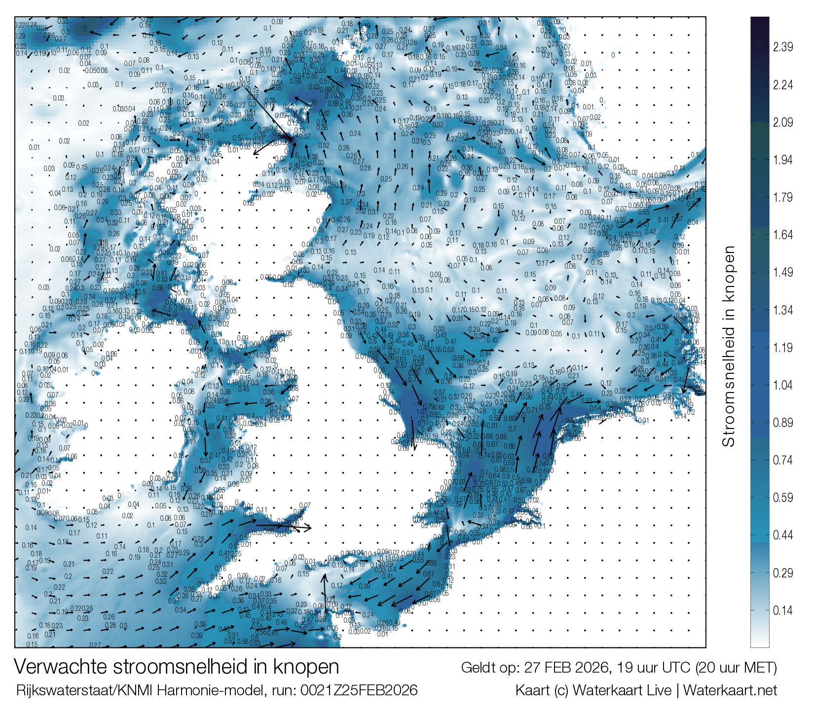 Stroomsnelheden in de Noordzee op basis van de Stroomatlas, verrekend met weersinvloeden. Deze worden iedere dag ververst met data uit het zeestromingen model van Rijkswaterstaat op basis van Harmonie weerdata, voor ieder uur een kaart, tot 48 uur in de toekomst. Lees hieronder meer over dit model