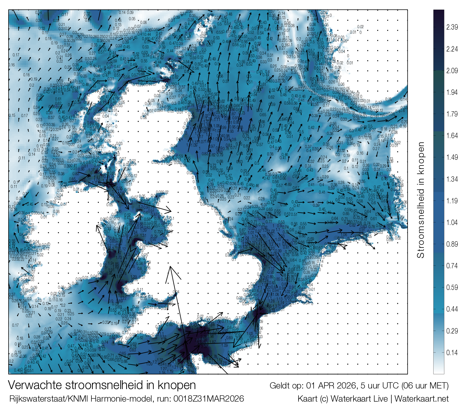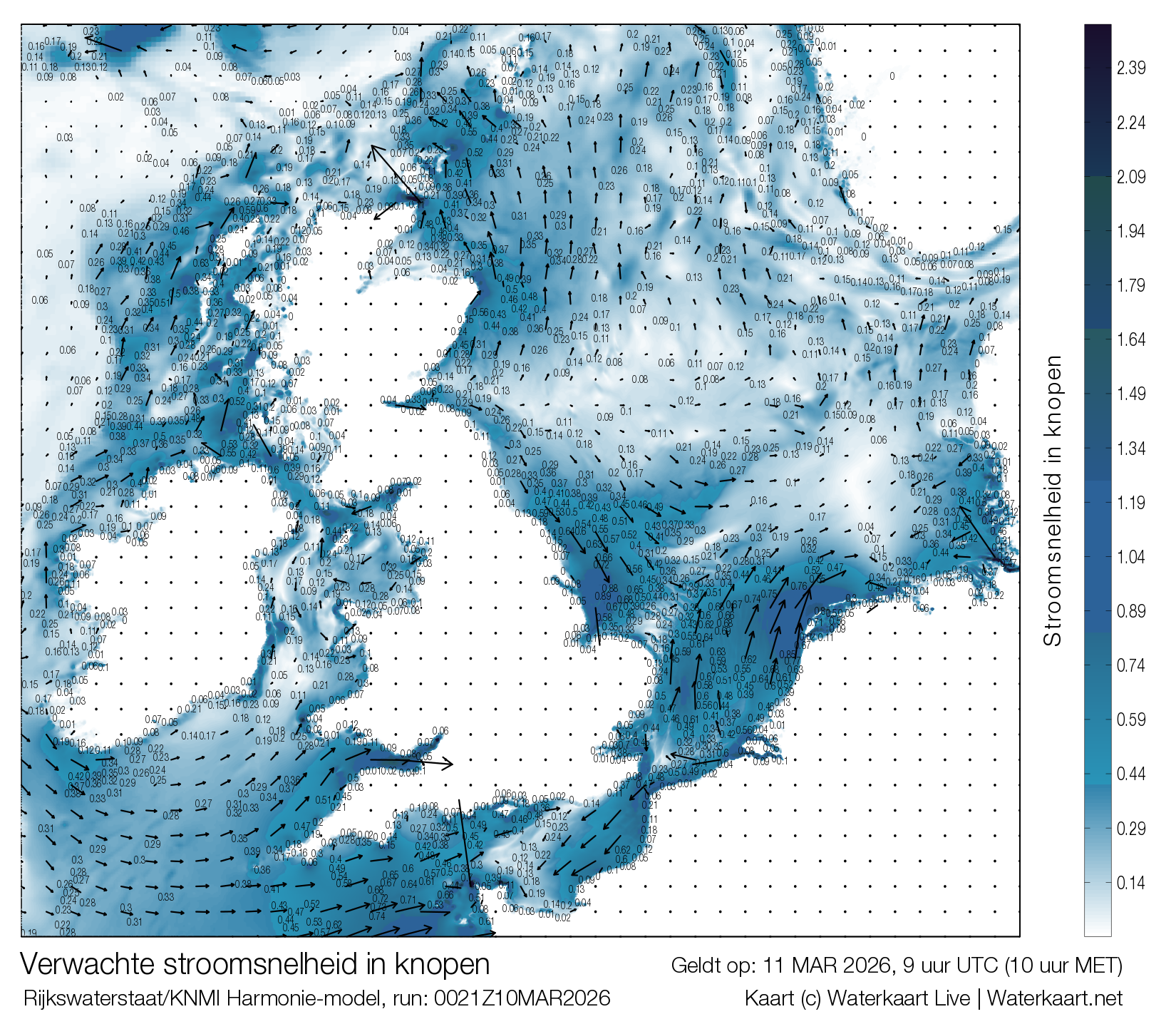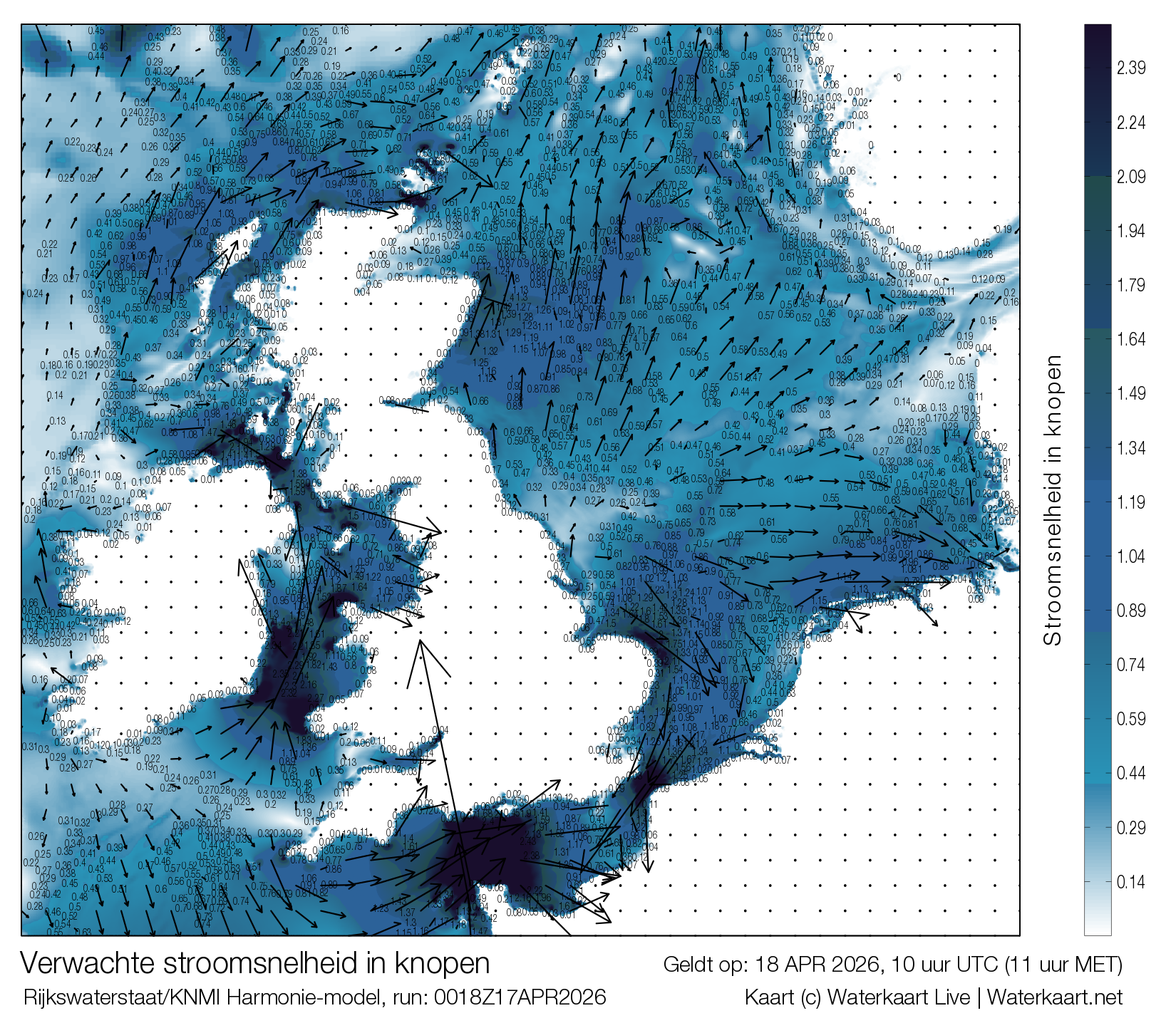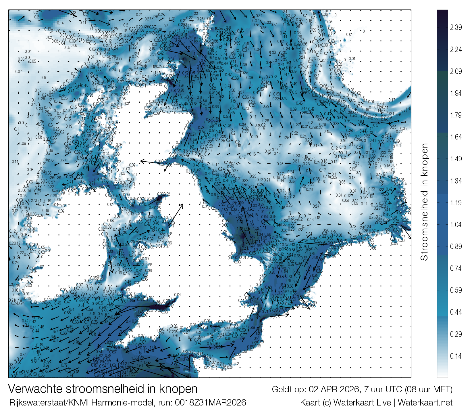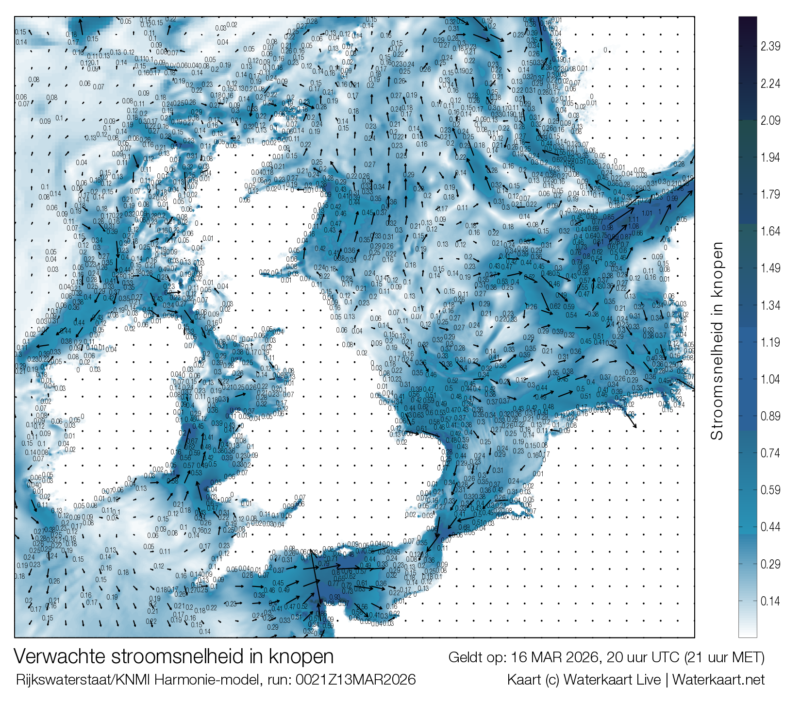 Stroomsnelheden in de Noordzee op basis van de Stroomatlas, verrekend met weersinvloeden. Deze worden iedere dag ververst met data uit het zeestromingen model van Rijkswaterstaat op basis van Harmonie weerdata, voor ieder uur een kaart, tot 48 uur in de toekomst. Lees hieronder meer over dit model