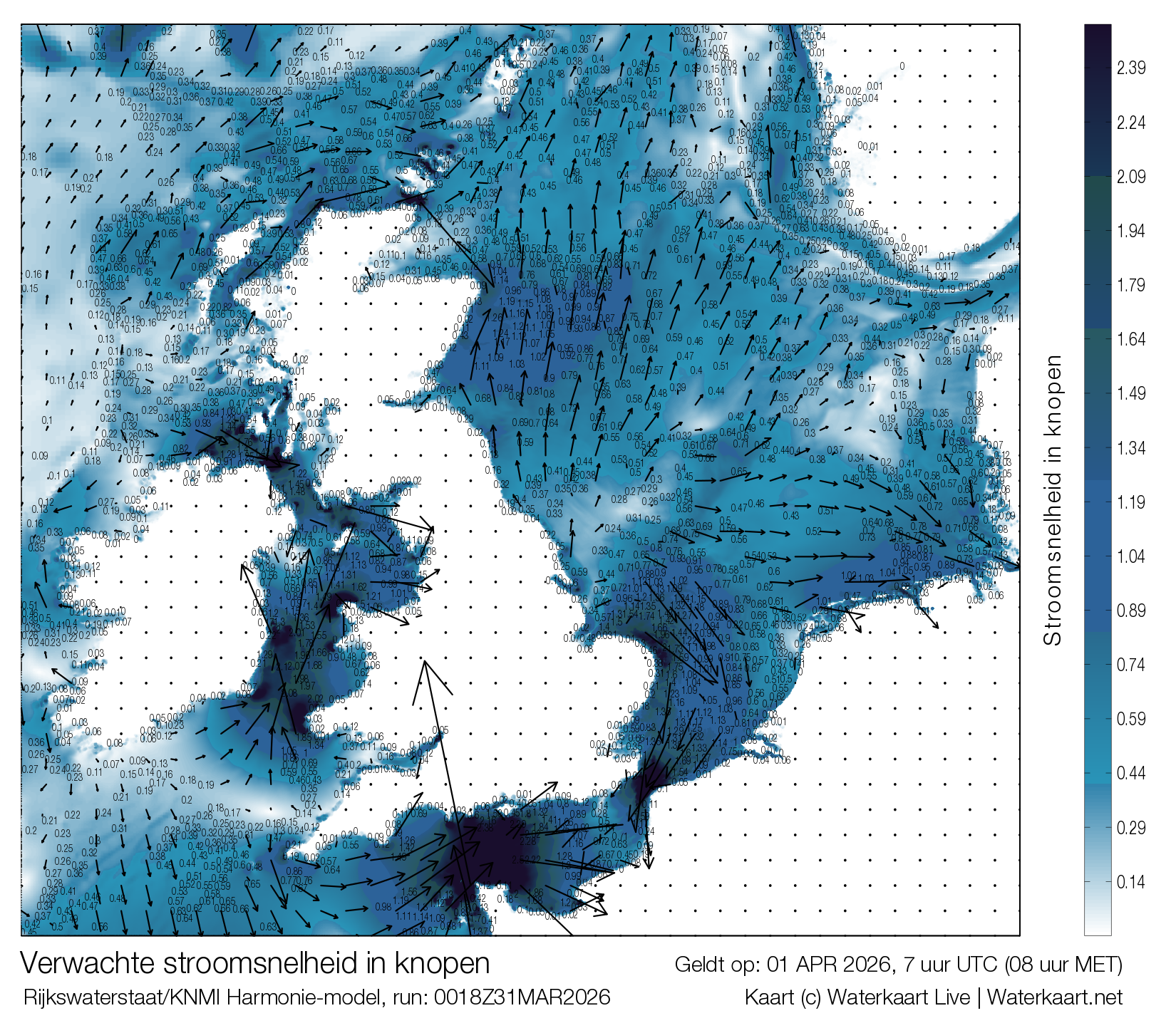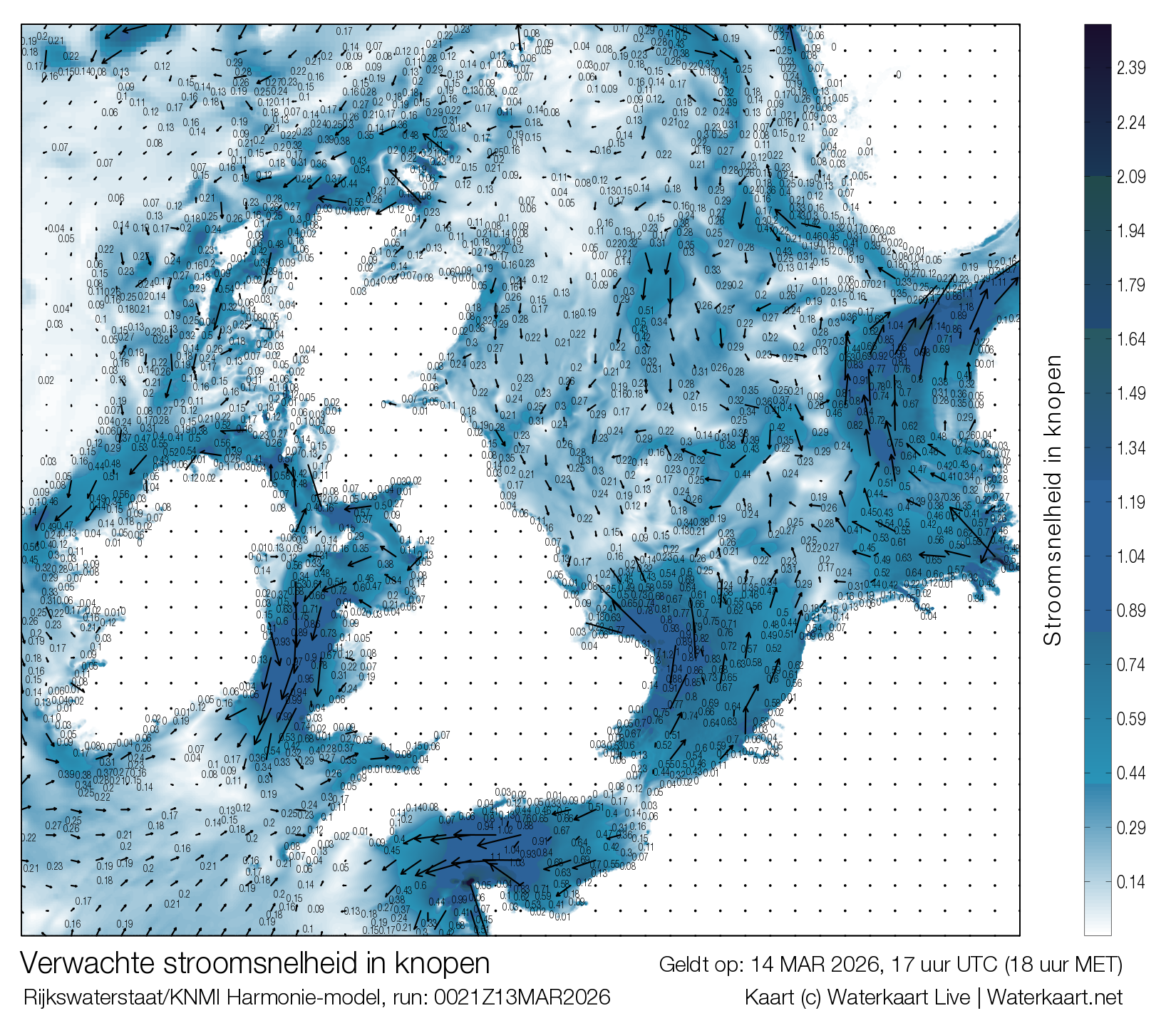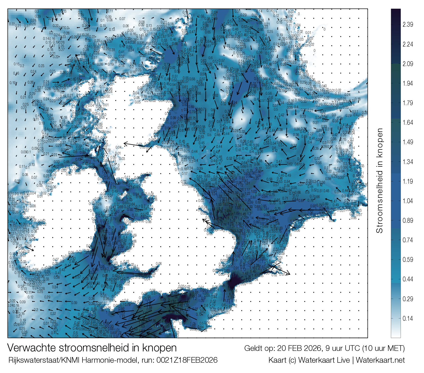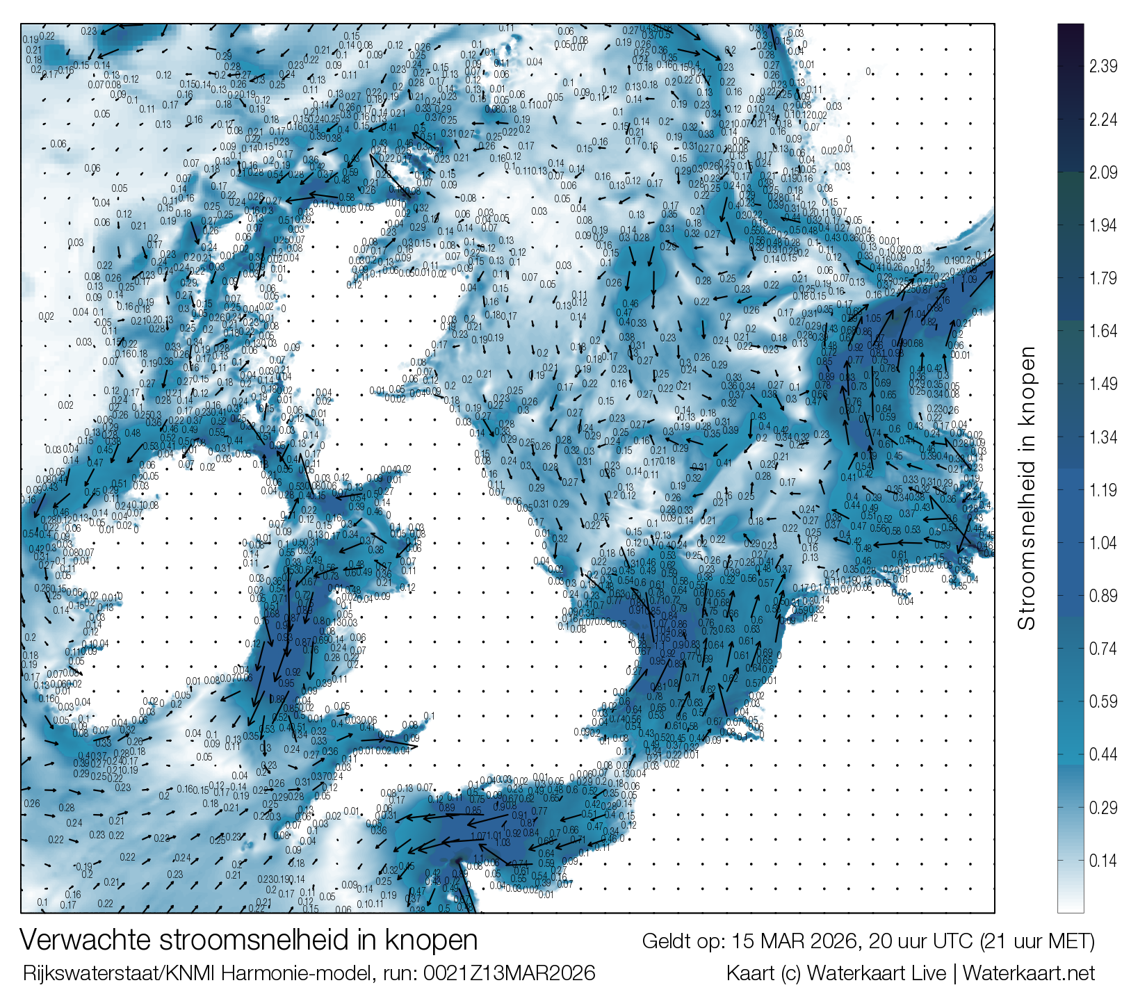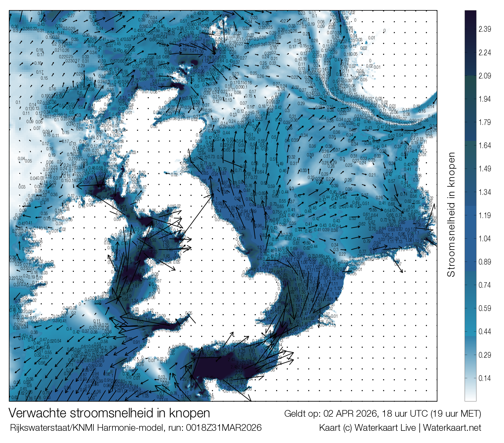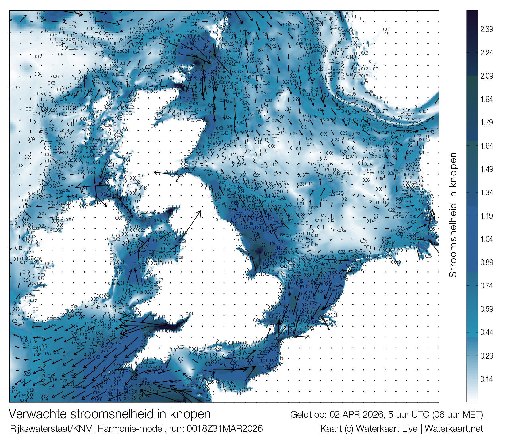Stroomsnelheden in de Noordzee op basis van de Stroomatlas, verrekend met weersinvloeden. Deze worden iedere dag ververst met data uit het zeestromingen model van Rijkswaterstaat op basis van Harmonie weerdata, voor ieder uur een kaart, tot 48 uur in de toekomst. Lees hieronder meer over dit model