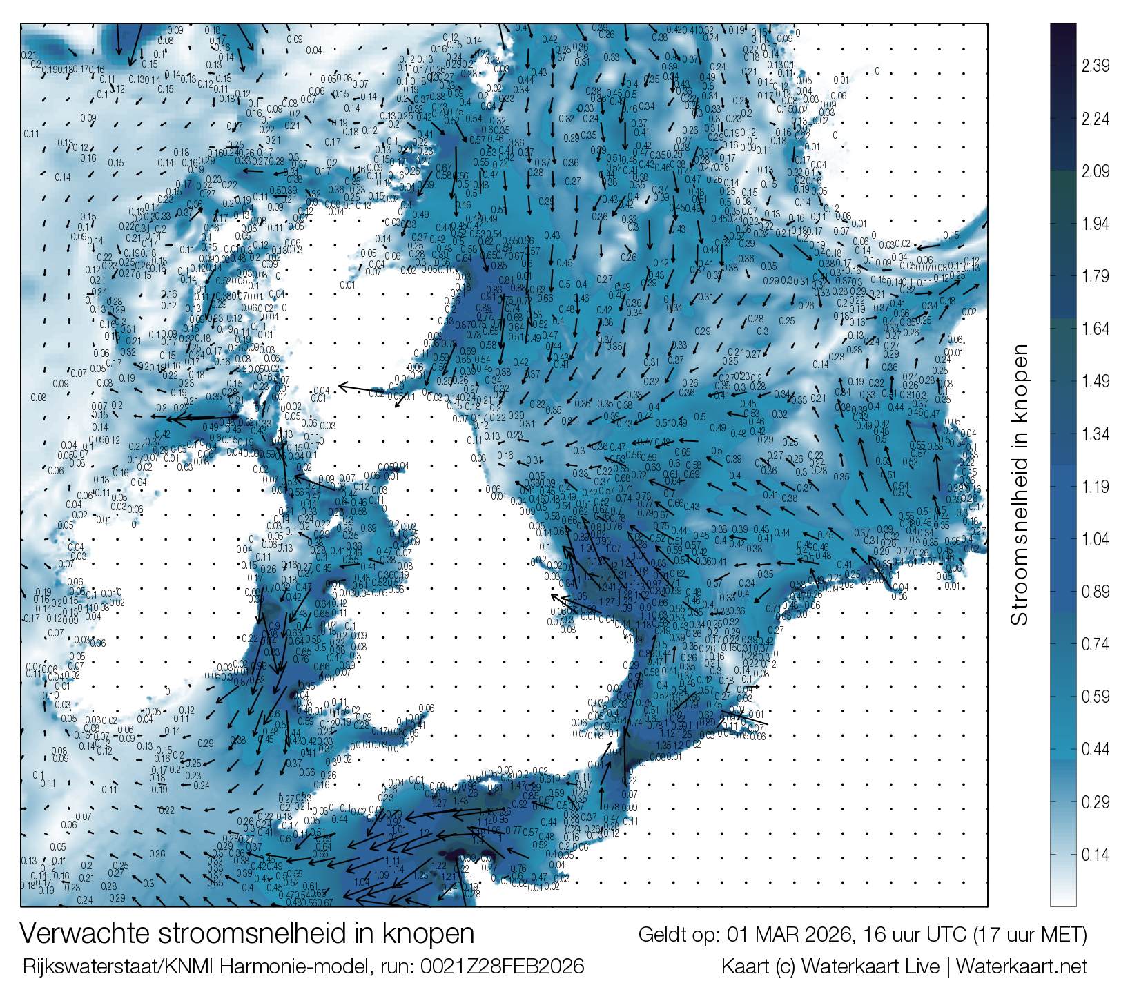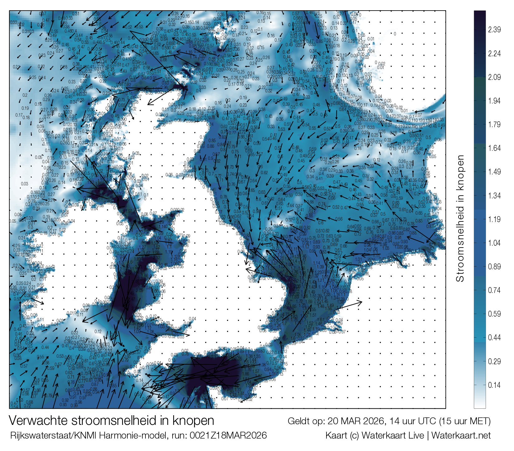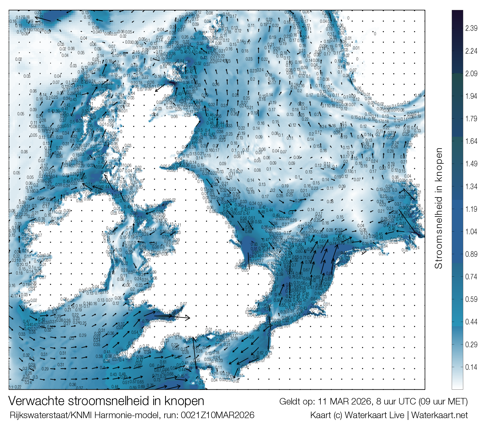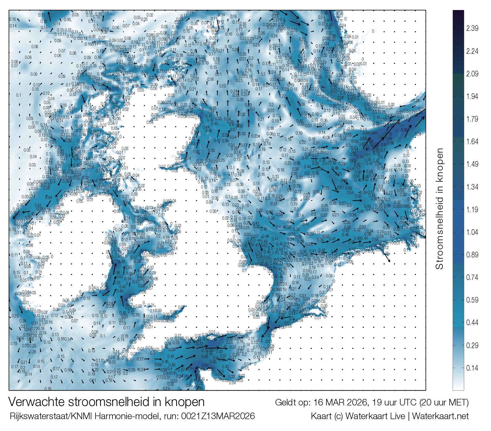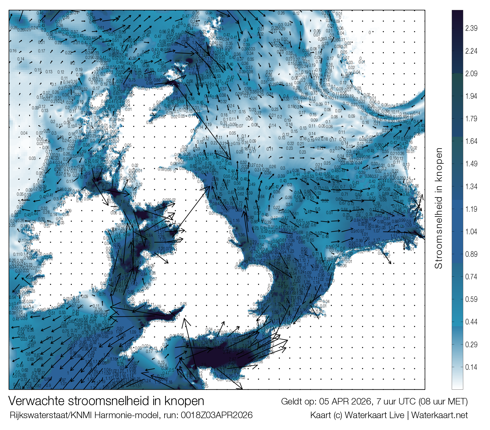 Stroomsnelheden in de Noordzee op basis van de Stroomatlas, verrekend met weersinvloeden. Deze worden iedere dag ververst met data uit het zeestromingen model van Rijkswaterstaat op basis van Harmonie weerdata, voor ieder uur een kaart, tot 48 uur in de toekomst. Lees hieronder meer over dit model