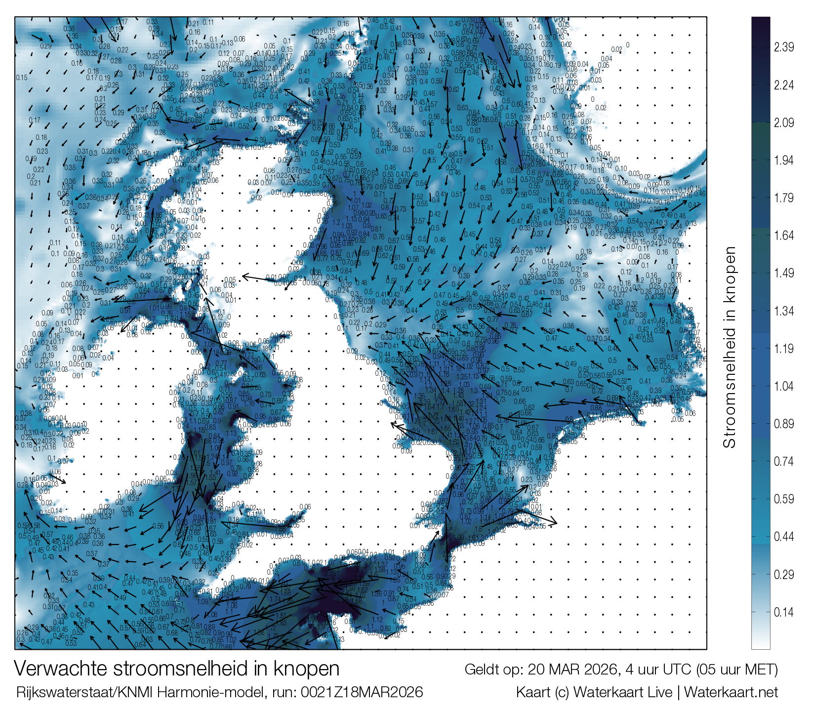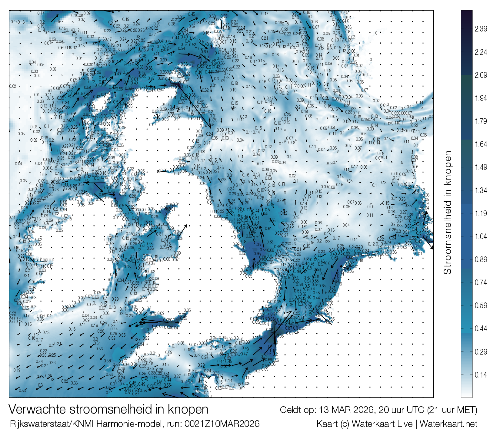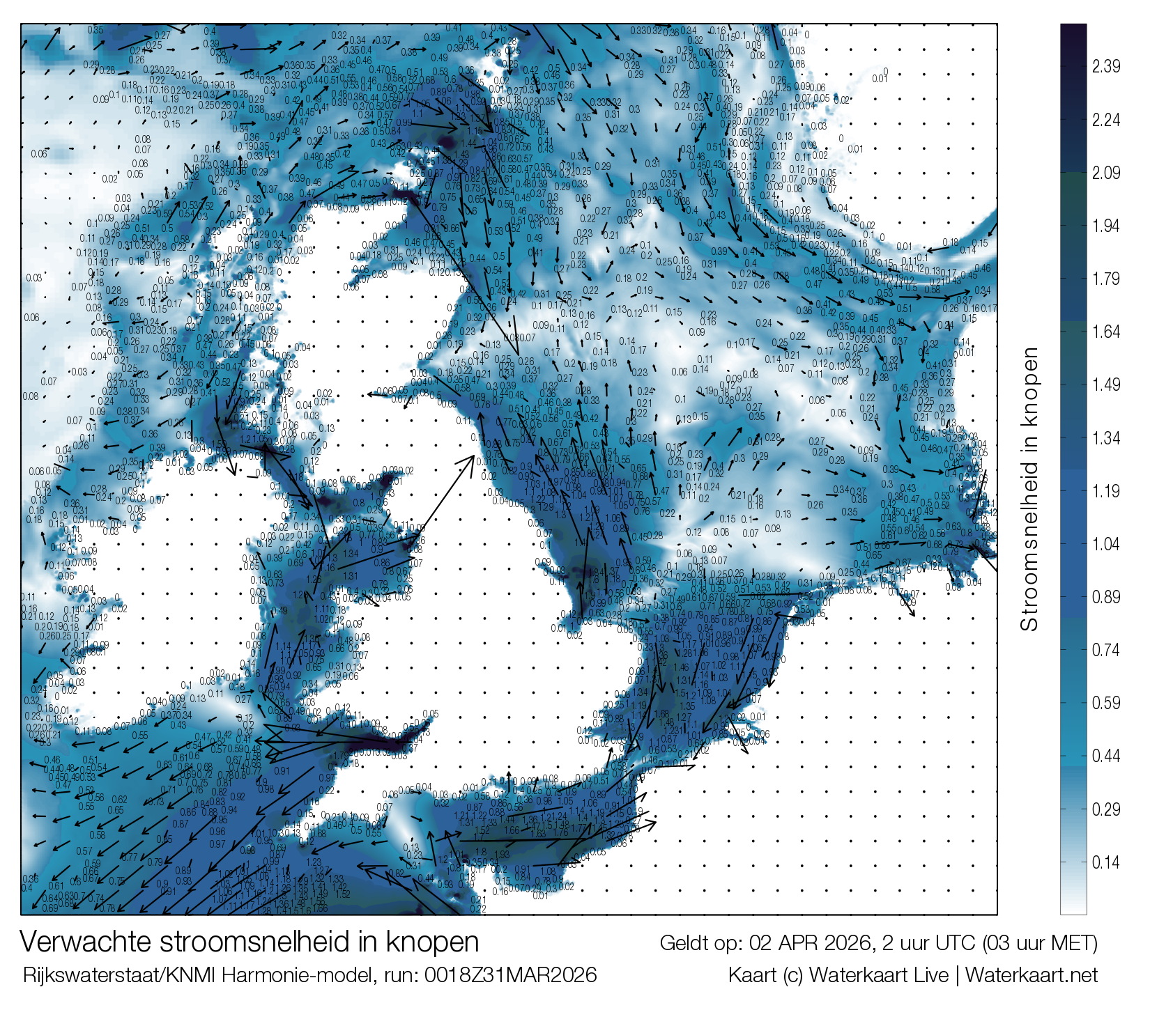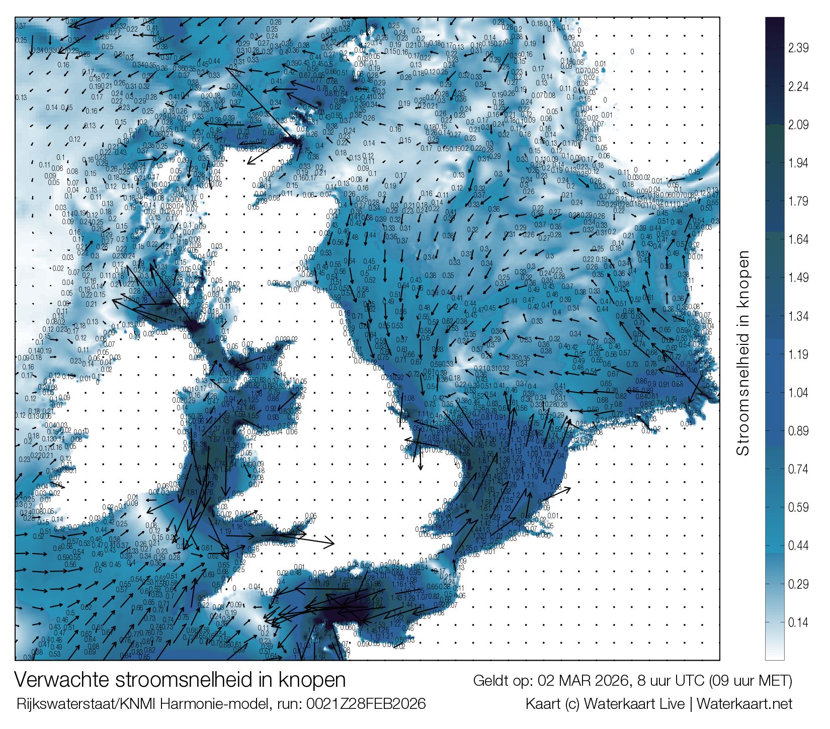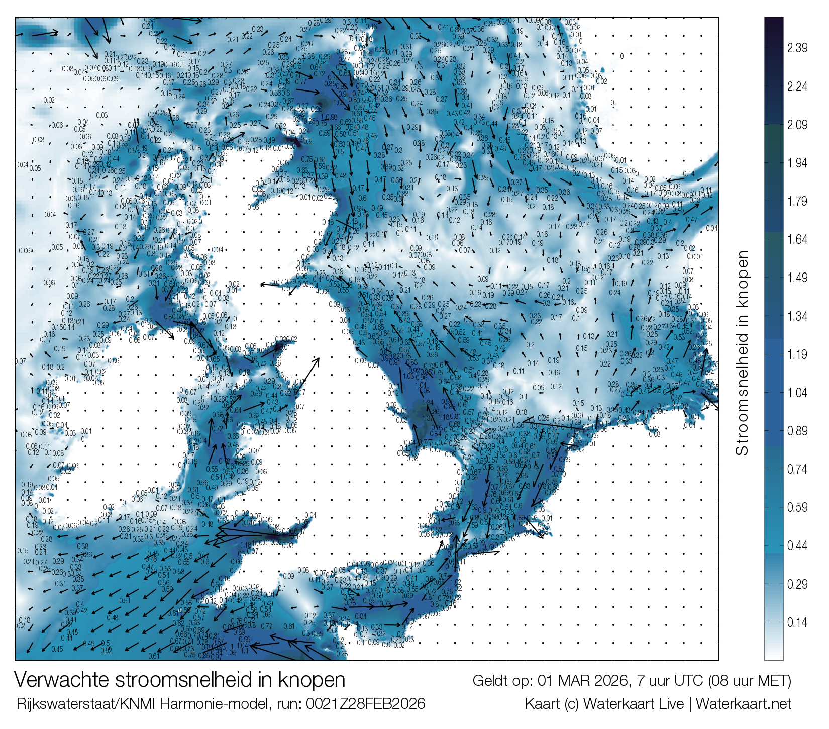 Stroomsnelheden in de Noordzee op basis van de Stroomatlas, verrekend met weersinvloeden. Deze worden iedere dag ververst met data uit het zeestromingen model van Rijkswaterstaat op basis van Harmonie weerdata, voor ieder uur een kaart, tot 48 uur in de toekomst. Lees hieronder meer over dit model