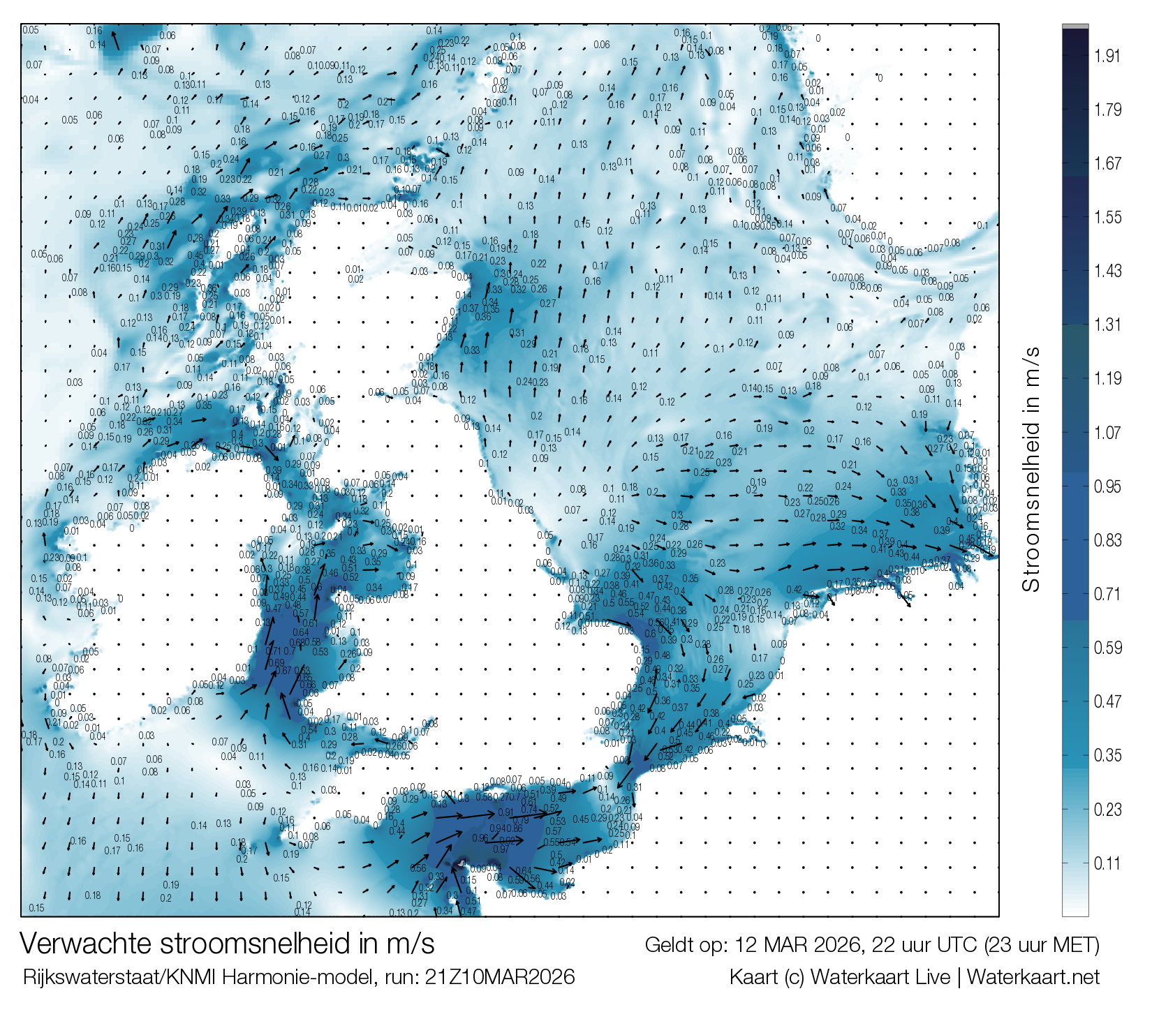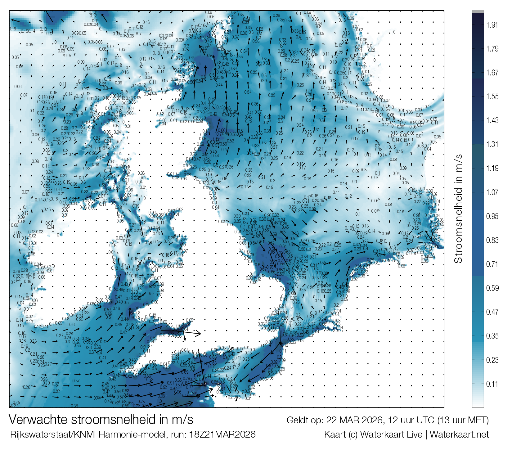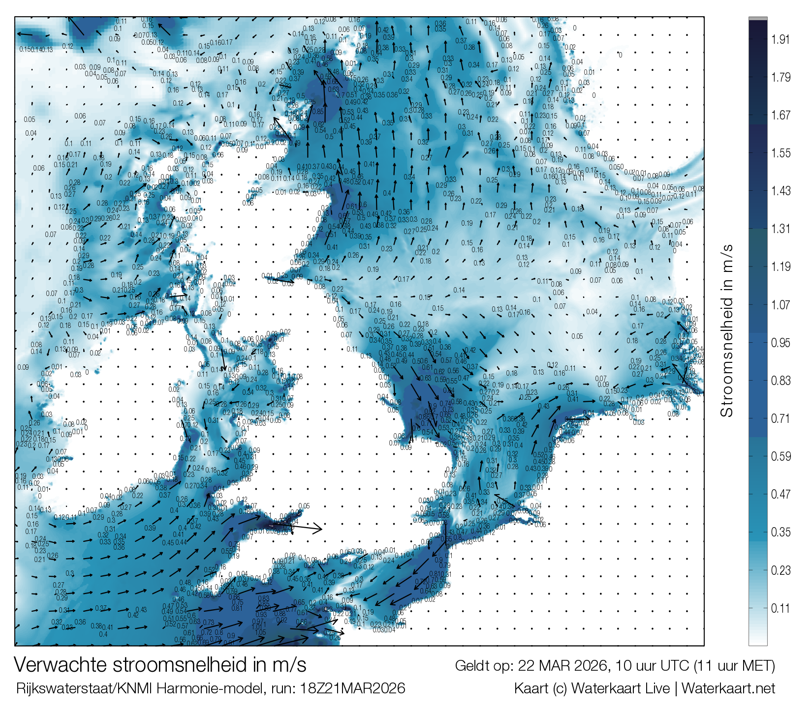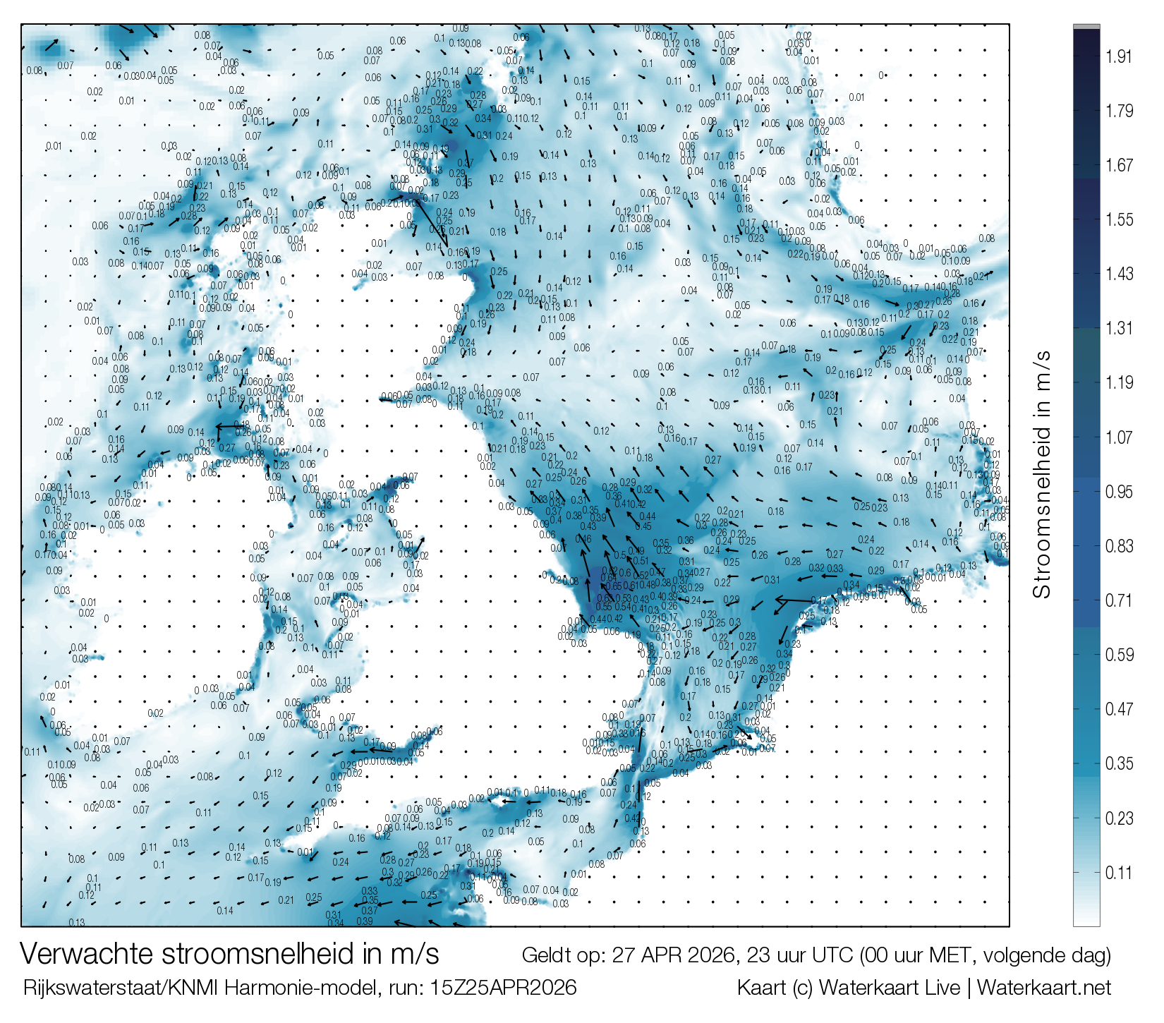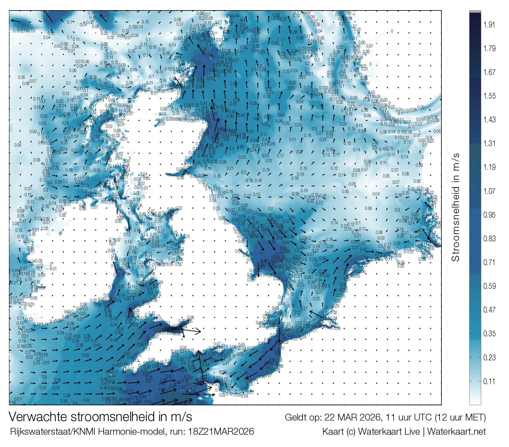 Stroomsnelheden in de Noordzee op basis van de Stroomatlas, verrekend met weersinvloeden. Deze worden iedere dag ververst met data uit het zeestromingen model van Rijkswaterstaat op basis van Harmonie weerdata, voor ieder uur een kaart, tot 48 uur in de toekomst. Lees hieronder meer over dit model