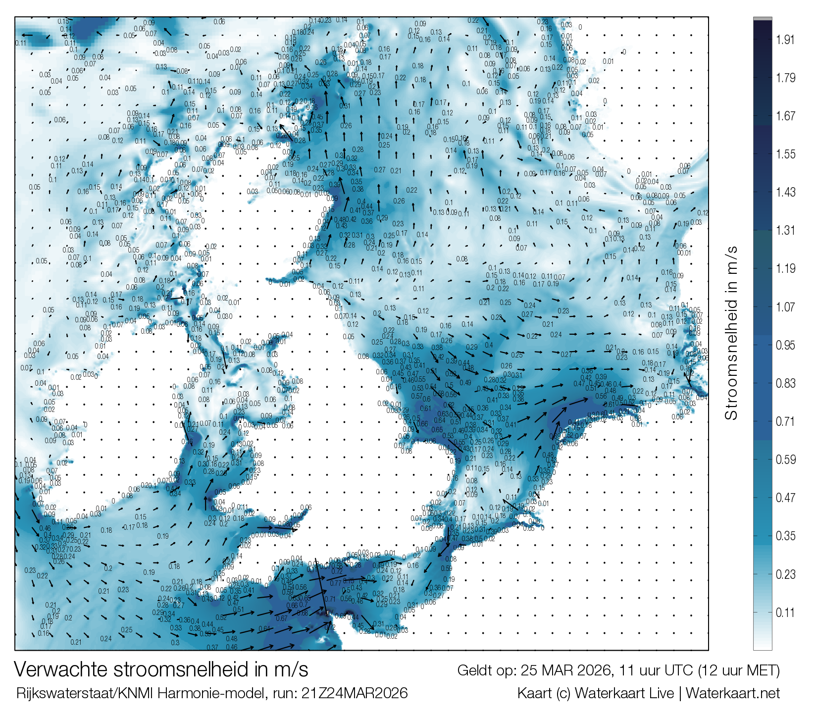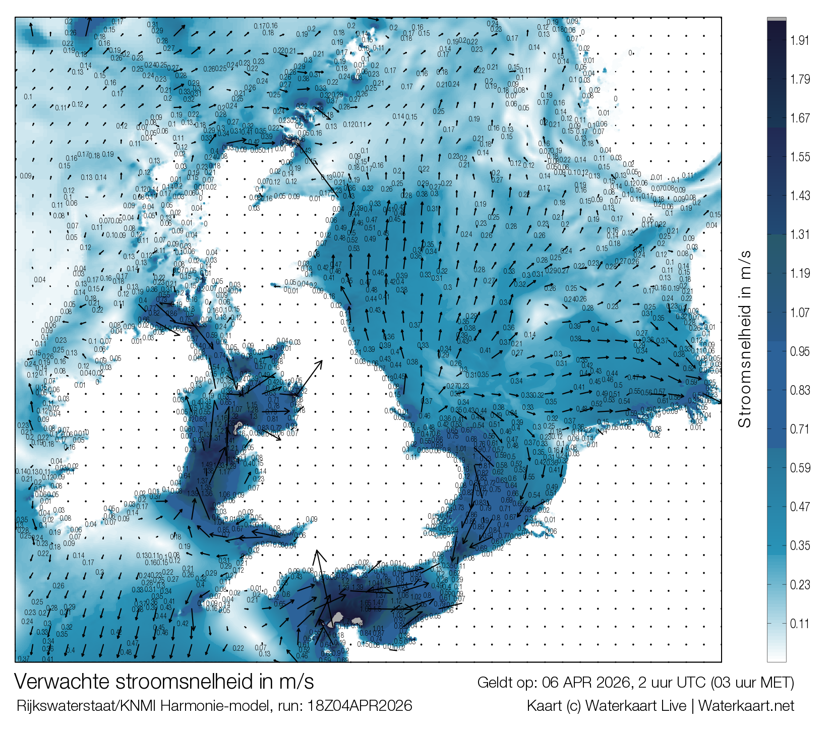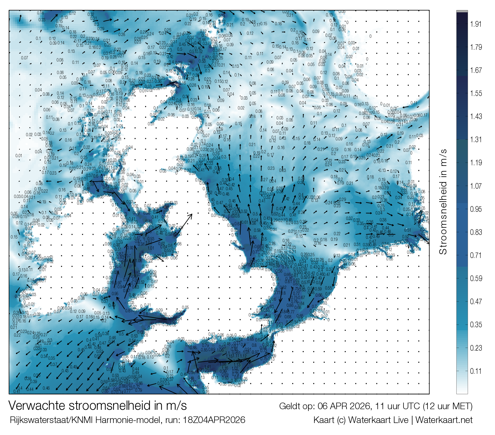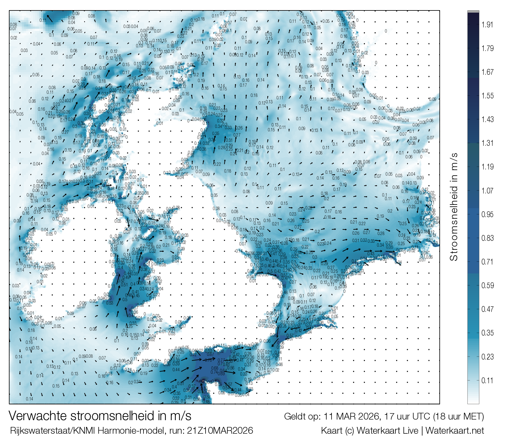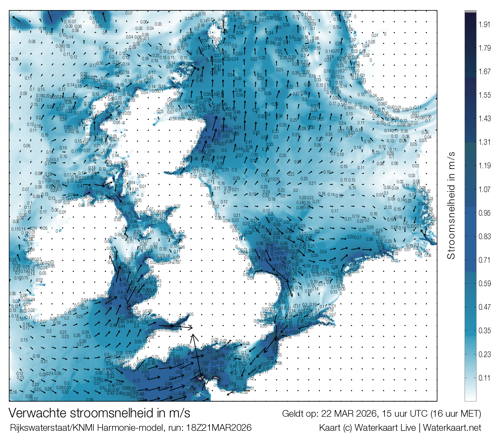 Stroomsnelheden in de Noordzee op basis van de Stroomatlas, verrekend met weersinvloeden. Deze worden iedere dag ververst met data uit het zeestromingen model van Rijkswaterstaat op basis van Harmonie weerdata, voor ieder uur een kaart, tot 48 uur in de toekomst. Lees hieronder meer over dit model