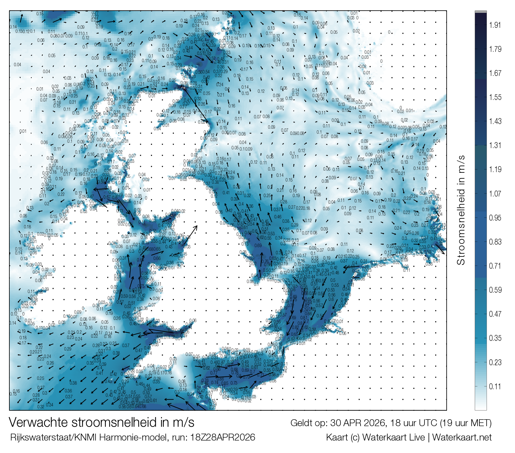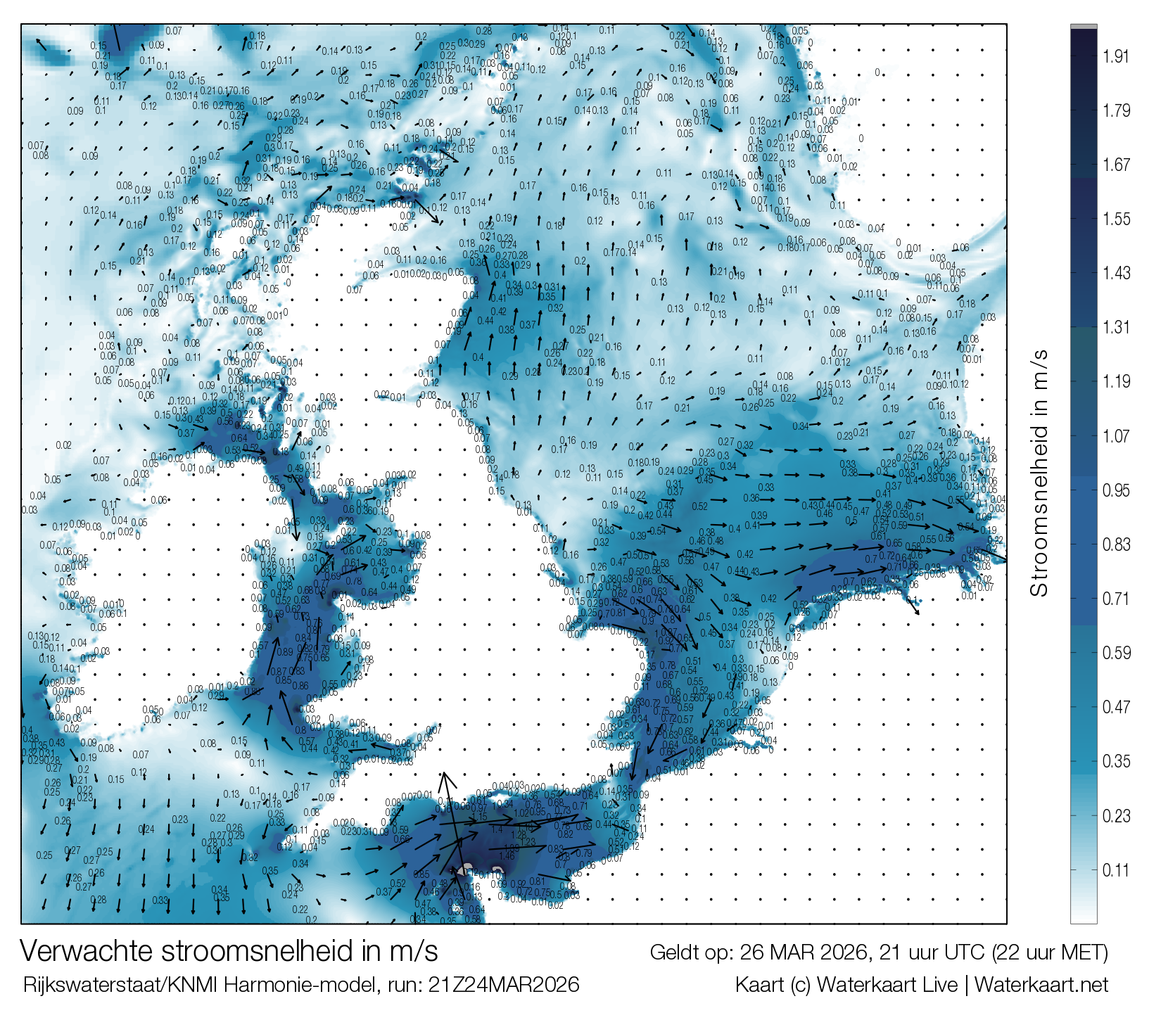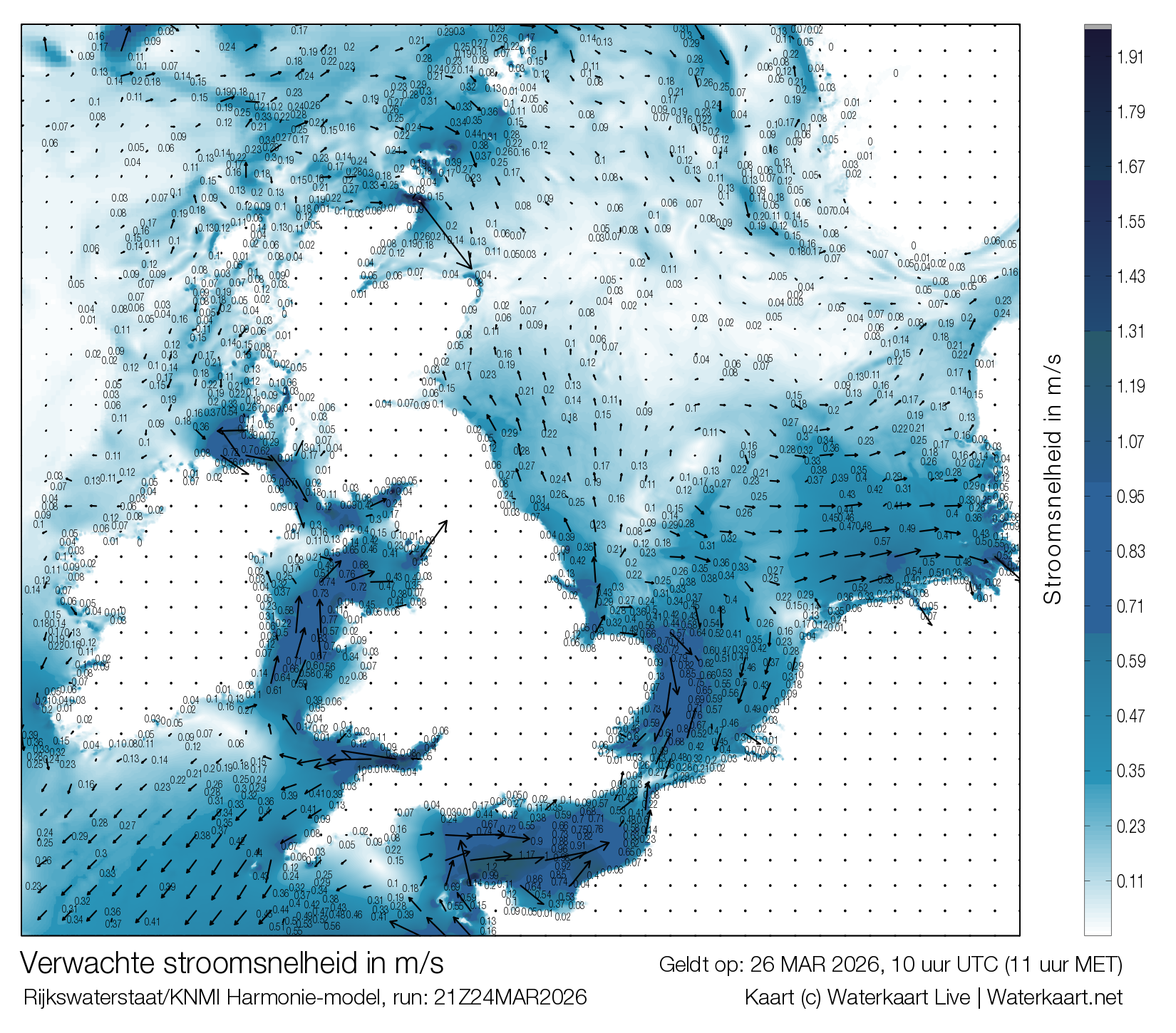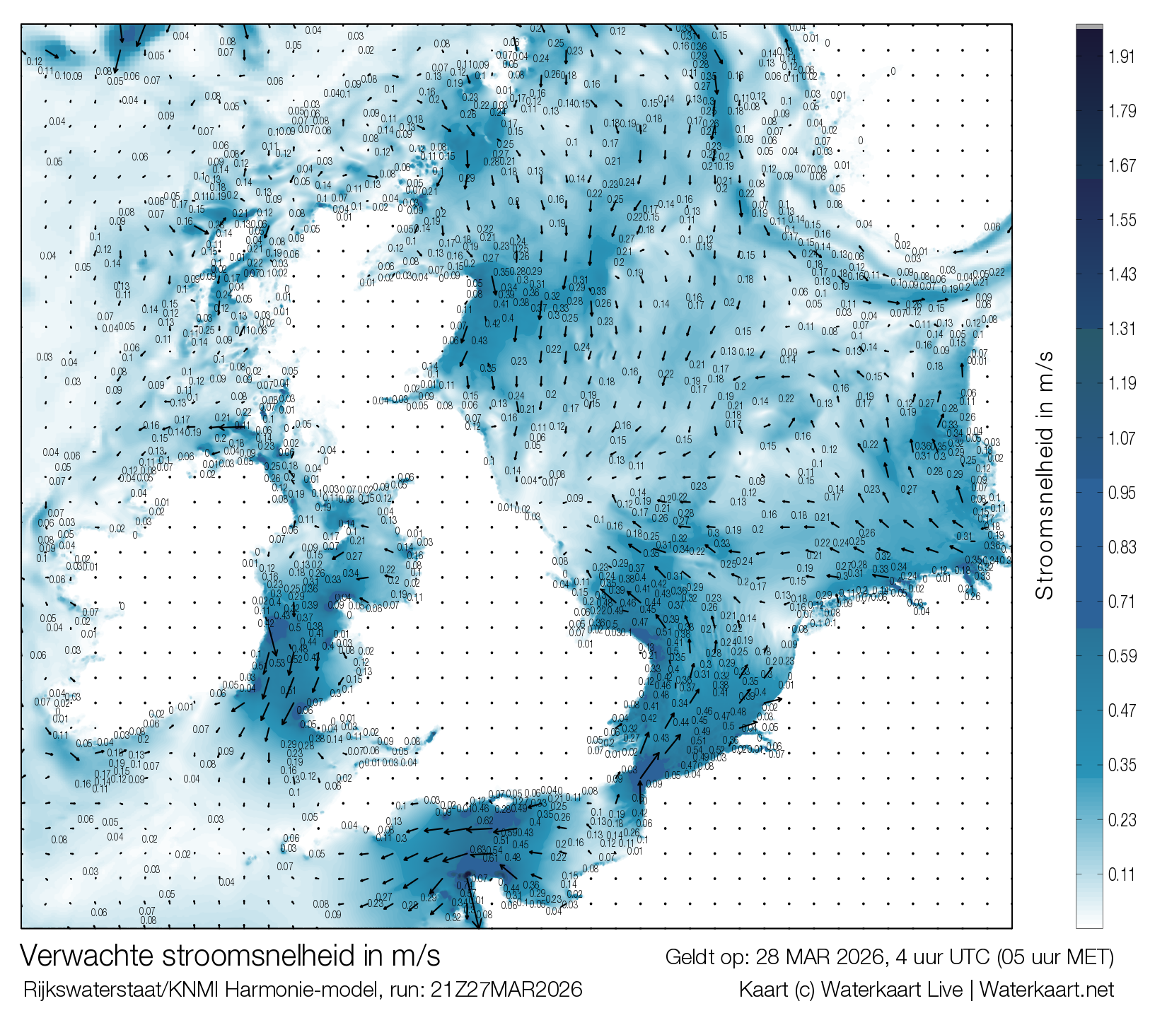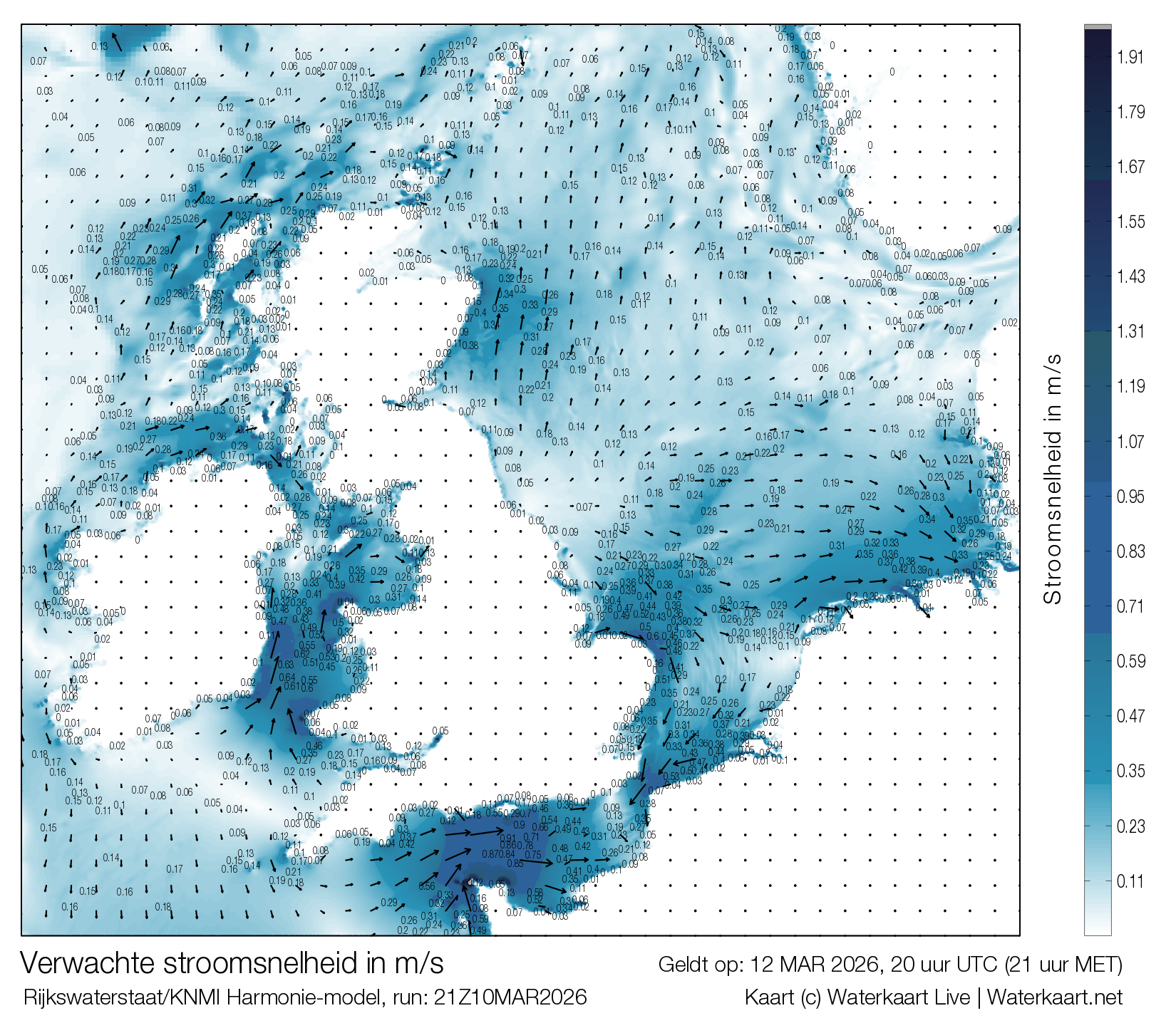 Stroomsnelheden in de Noordzee op basis van de Stroomatlas, verrekend met weersinvloeden. Deze worden iedere dag ververst met data uit het zeestromingen model van Rijkswaterstaat op basis van Harmonie weerdata, voor ieder uur een kaart, tot 48 uur in de toekomst. Lees hieronder meer over dit model
