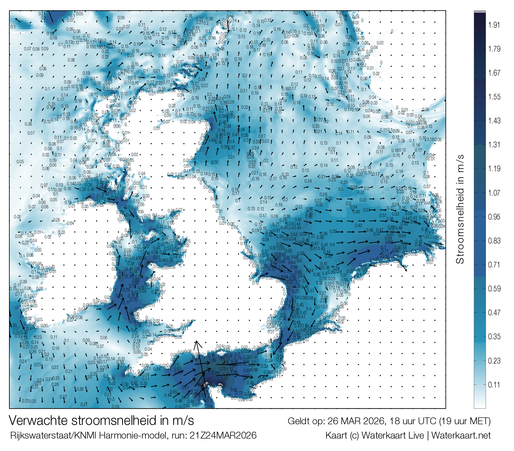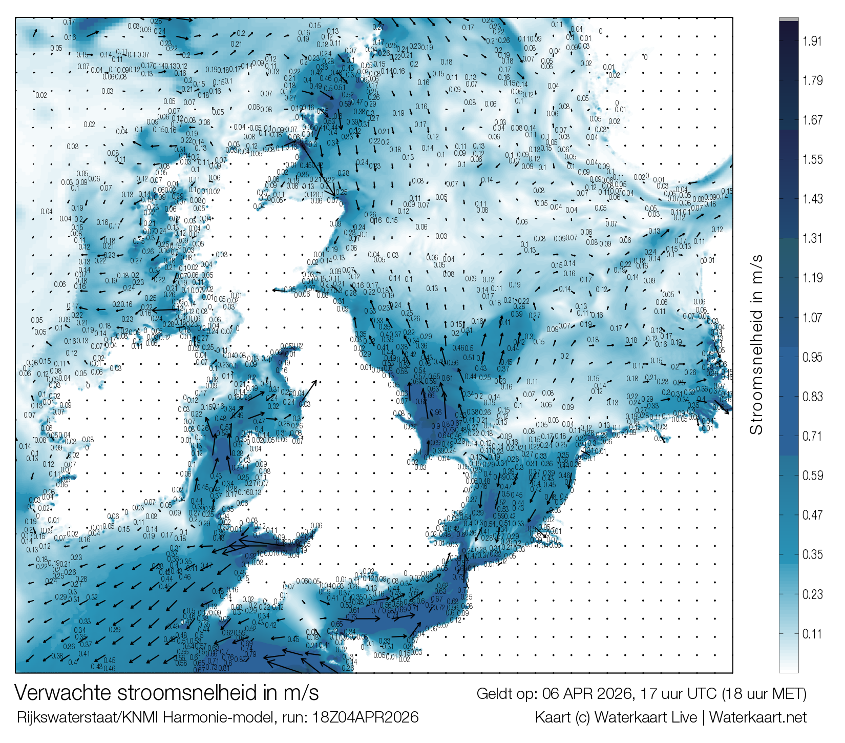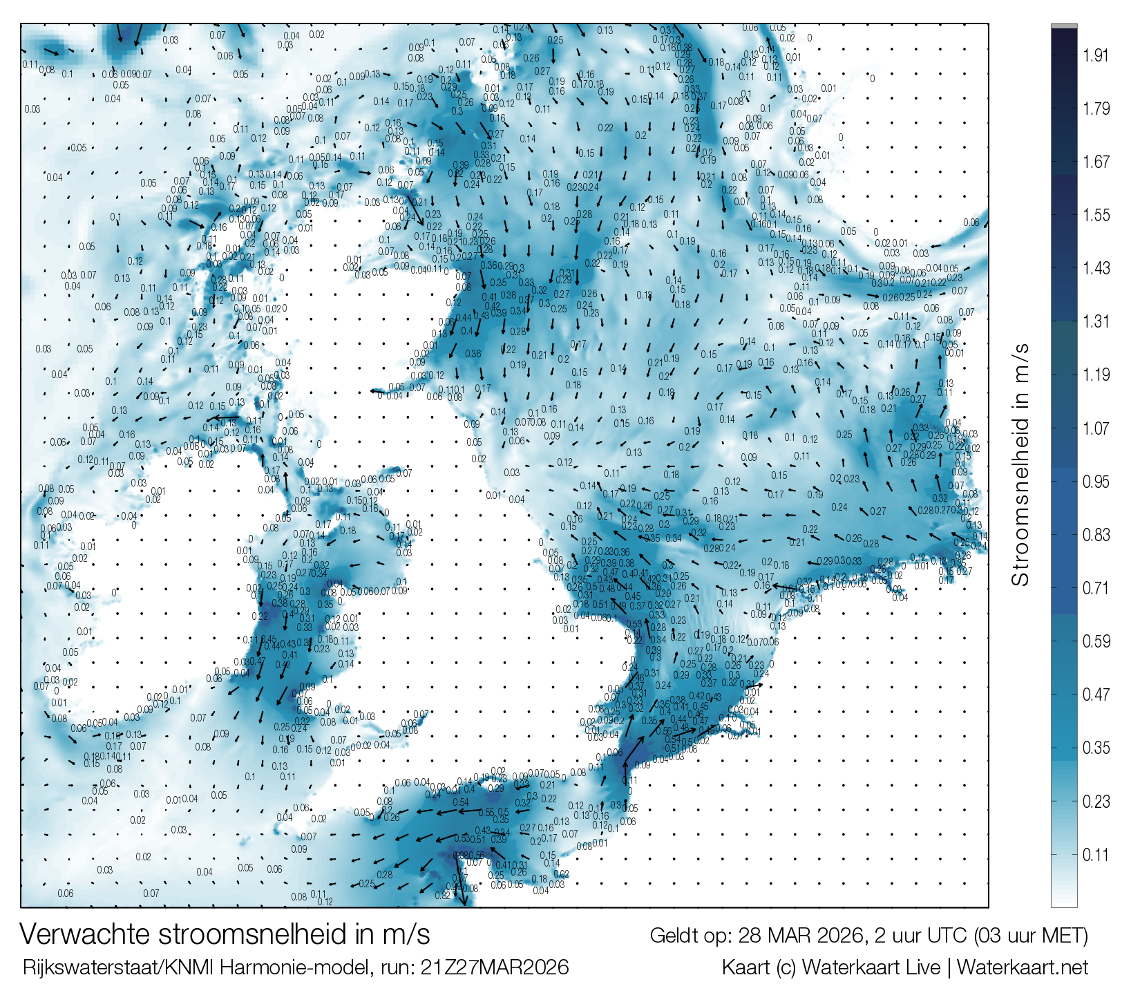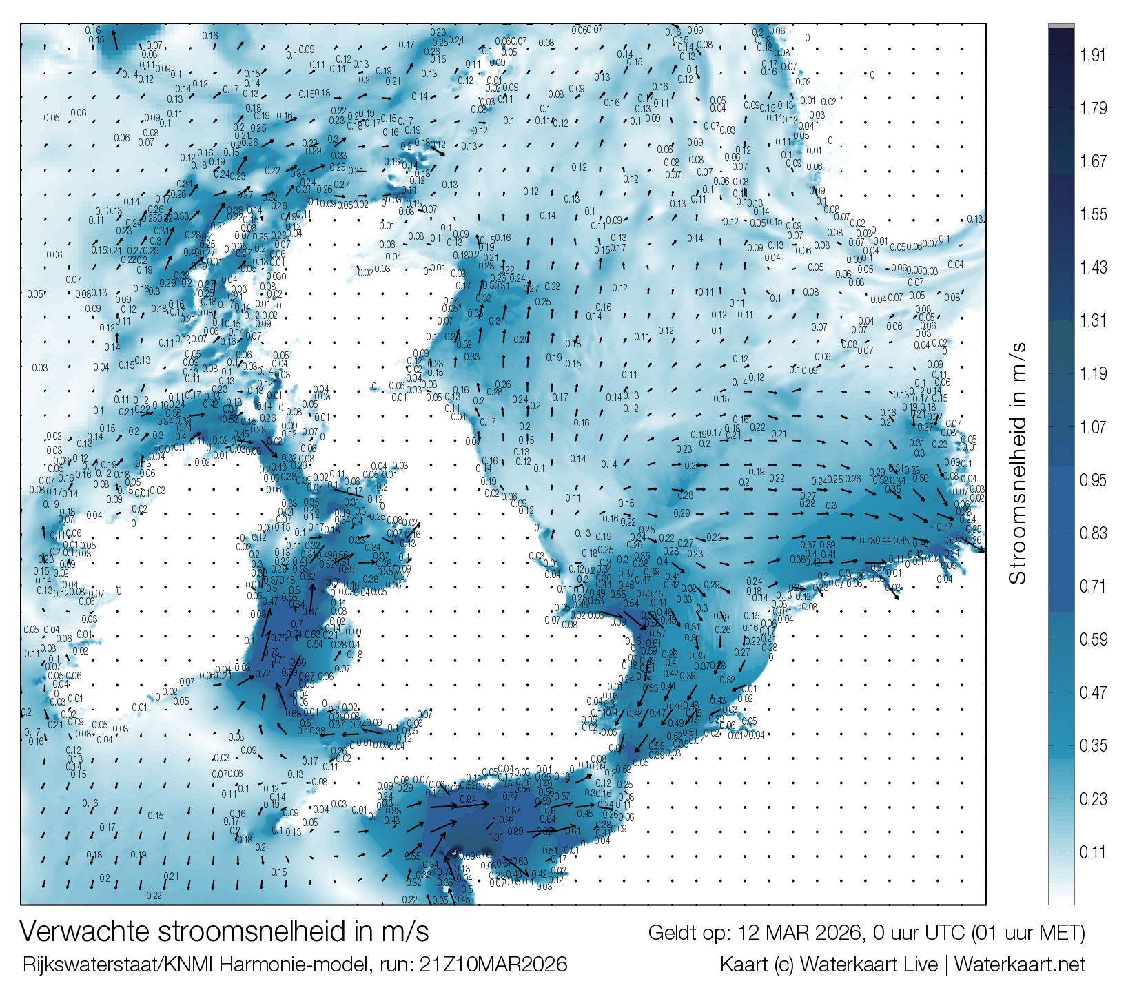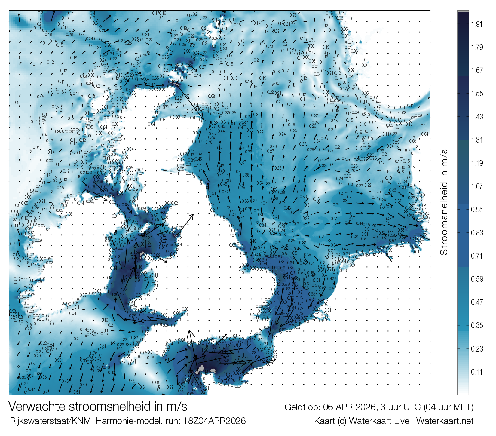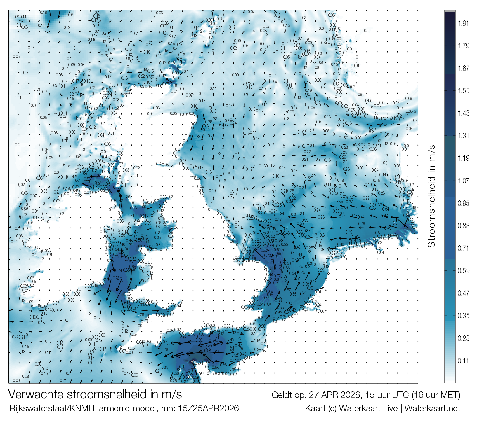 Stroomsnelheden in de Noordzee op basis van de Stroomatlas, verrekend met weersinvloeden. Deze worden iedere dag ververst met data uit het zeestromingen model van Rijkswaterstaat op basis van Harmonie weerdata, voor ieder uur een kaart, tot 48 uur in de toekomst. Lees hieronder meer over dit model