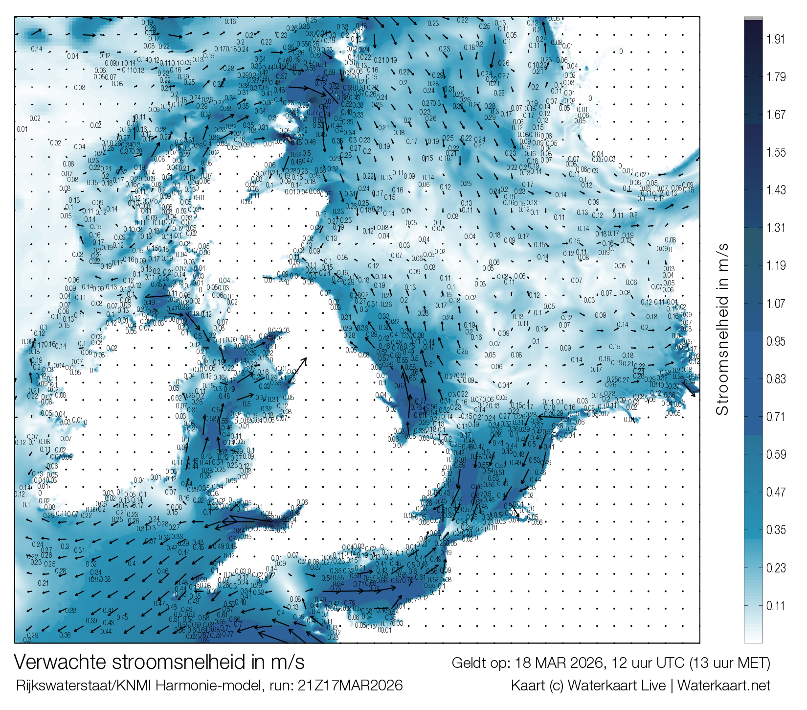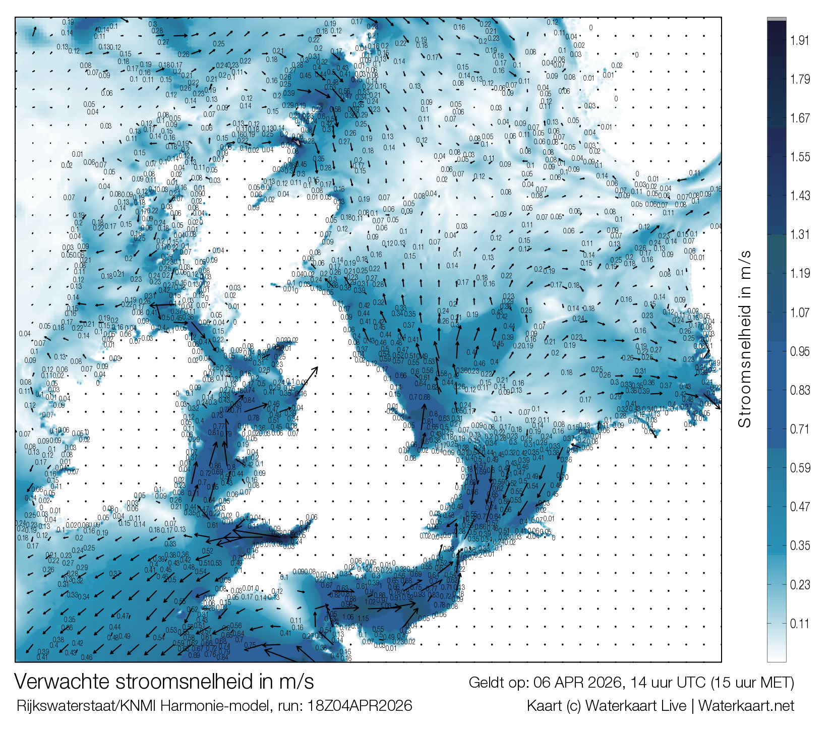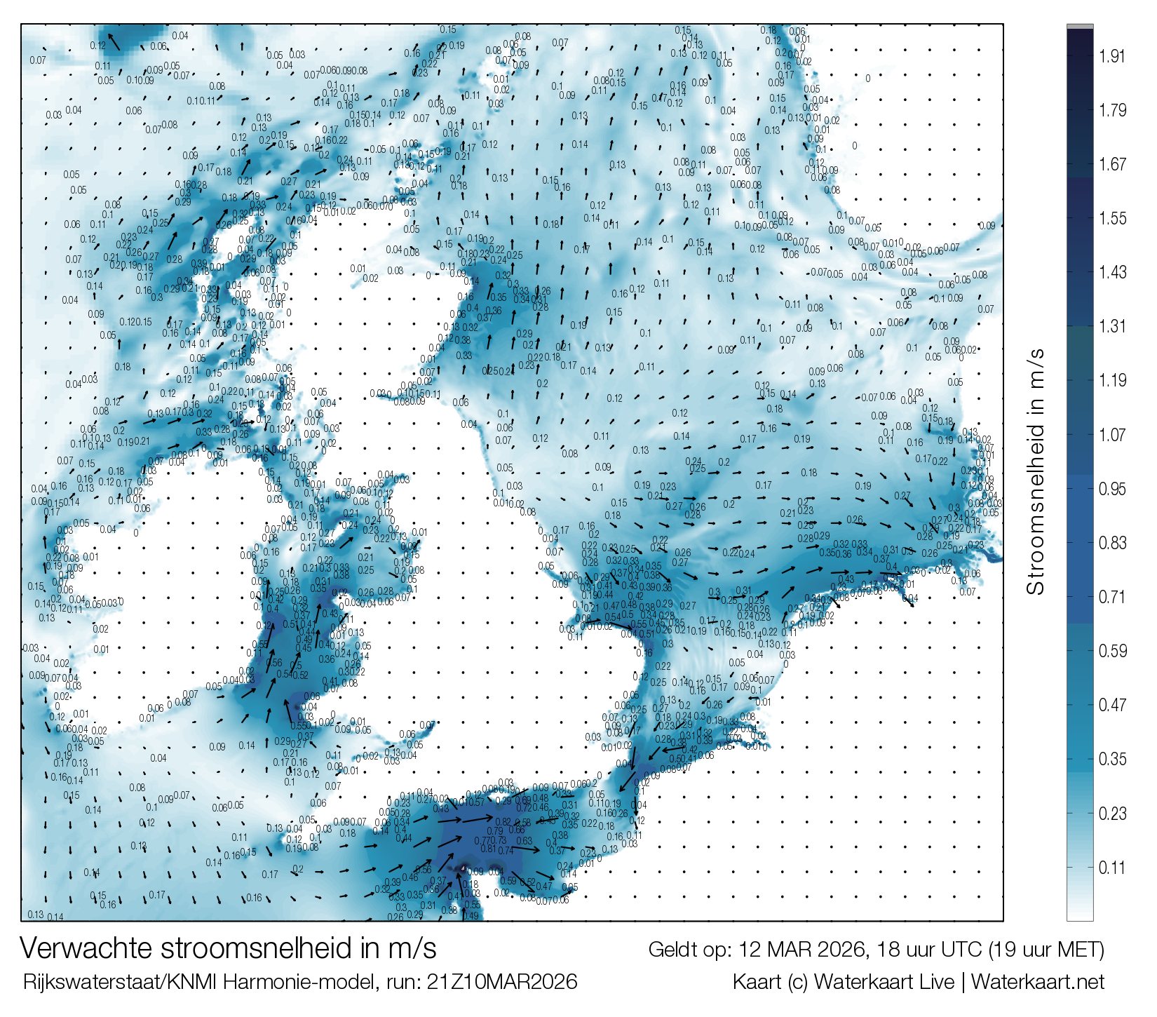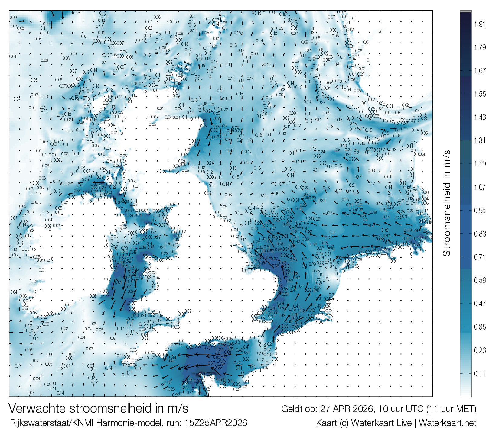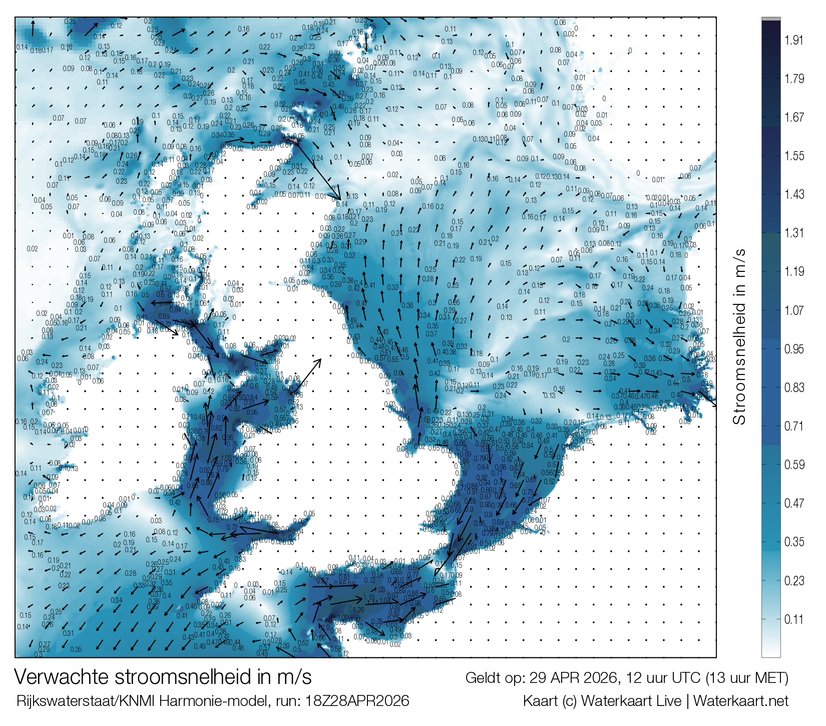 Stroomsnelheden in de Noordzee op basis van de Stroomatlas, verrekend met weersinvloeden. Deze worden iedere dag ververst met data uit het zeestromingen model van Rijkswaterstaat op basis van Harmonie weerdata, voor ieder uur een kaart, tot 48 uur in de toekomst. Lees hieronder meer over dit model