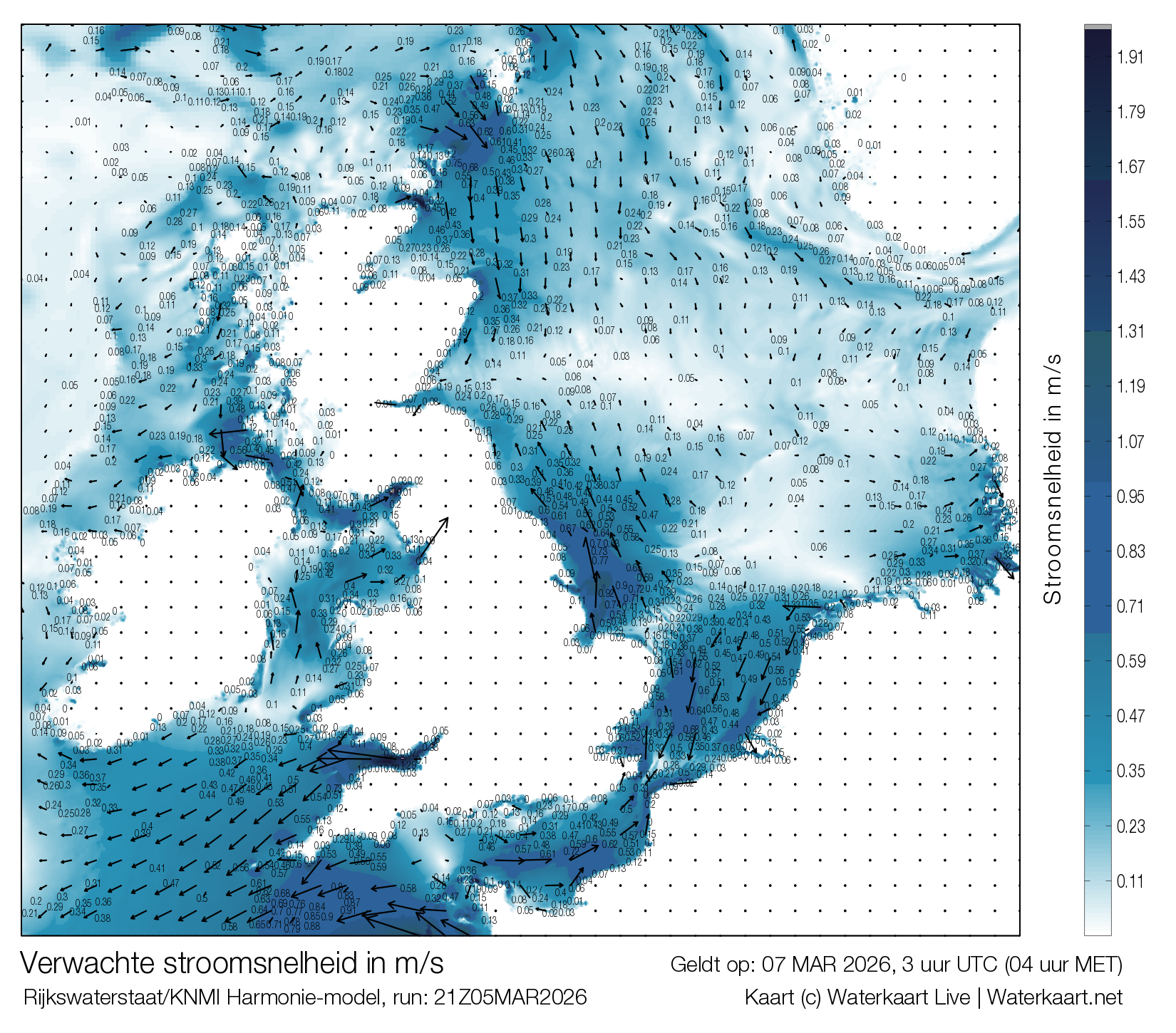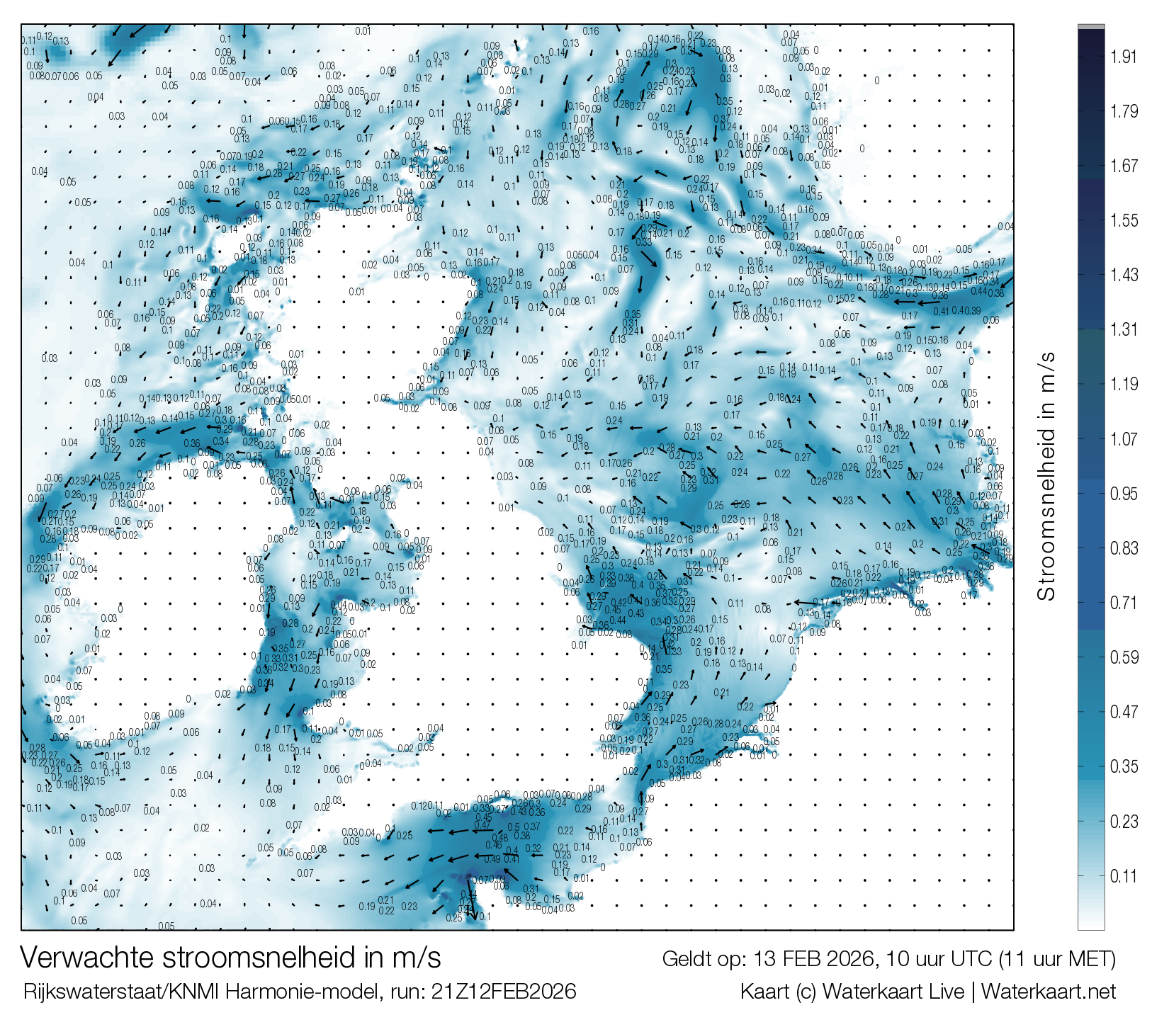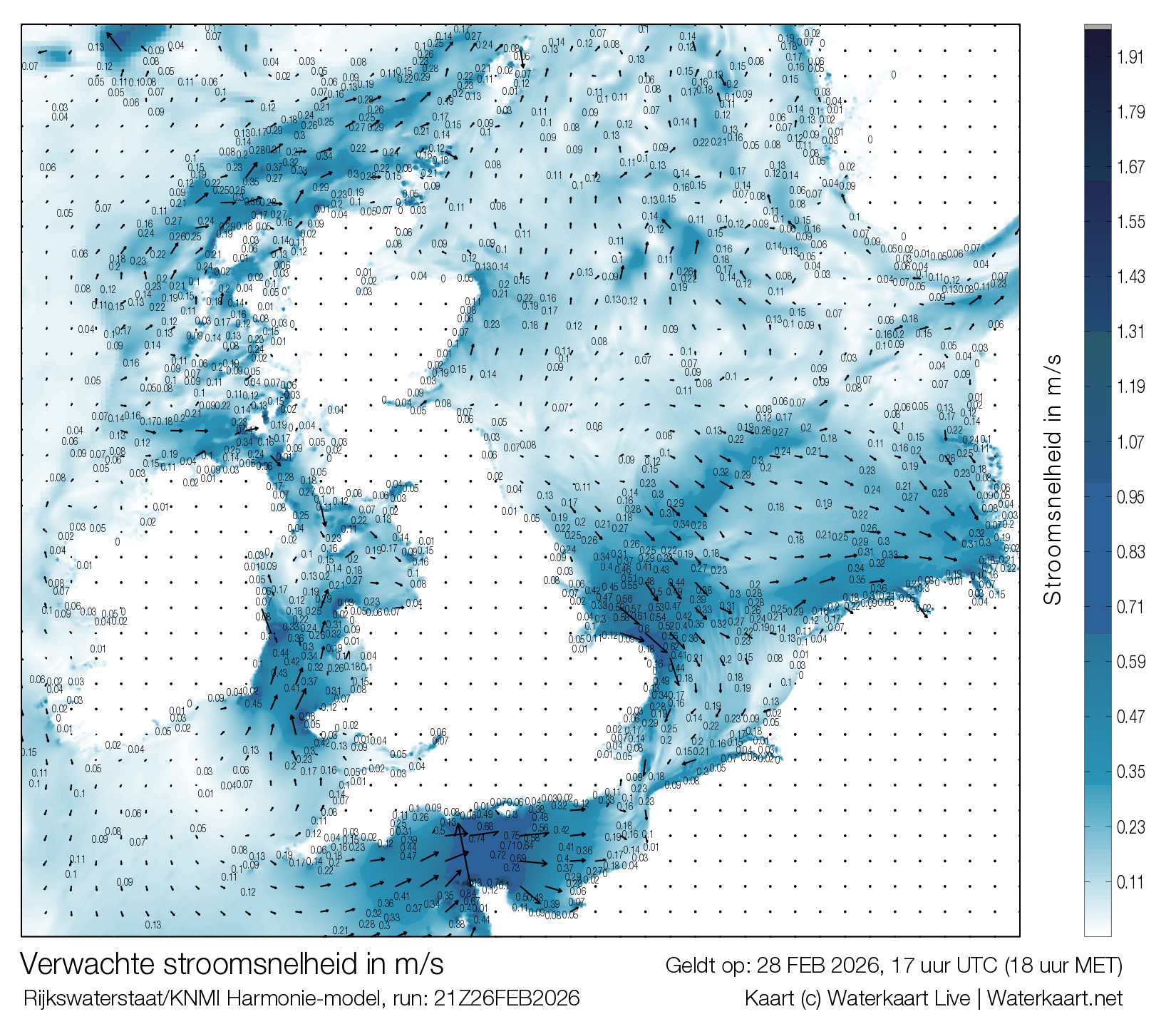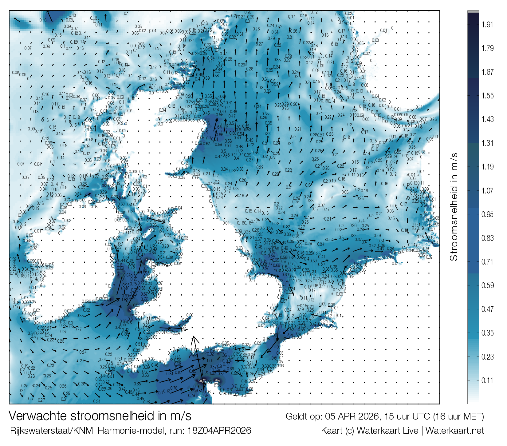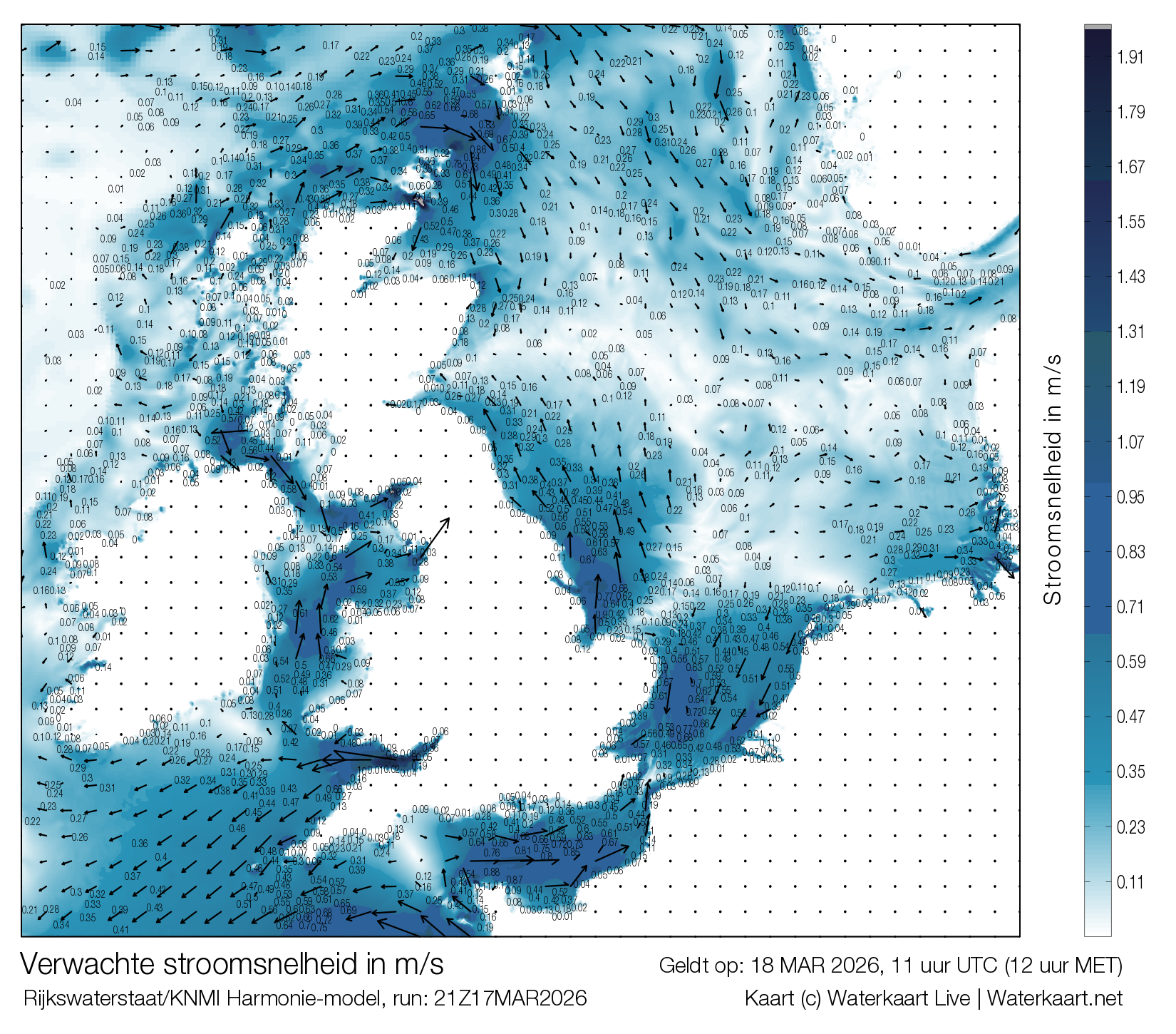 Stroomsnelheden in de Noordzee op basis van de Stroomatlas, verrekend met weersinvloeden. Deze worden iedere dag ververst met data uit het zeestromingen model van Rijkswaterstaat op basis van Harmonie weerdata, voor ieder uur een kaart, tot 48 uur in de toekomst. Lees hieronder meer over dit model