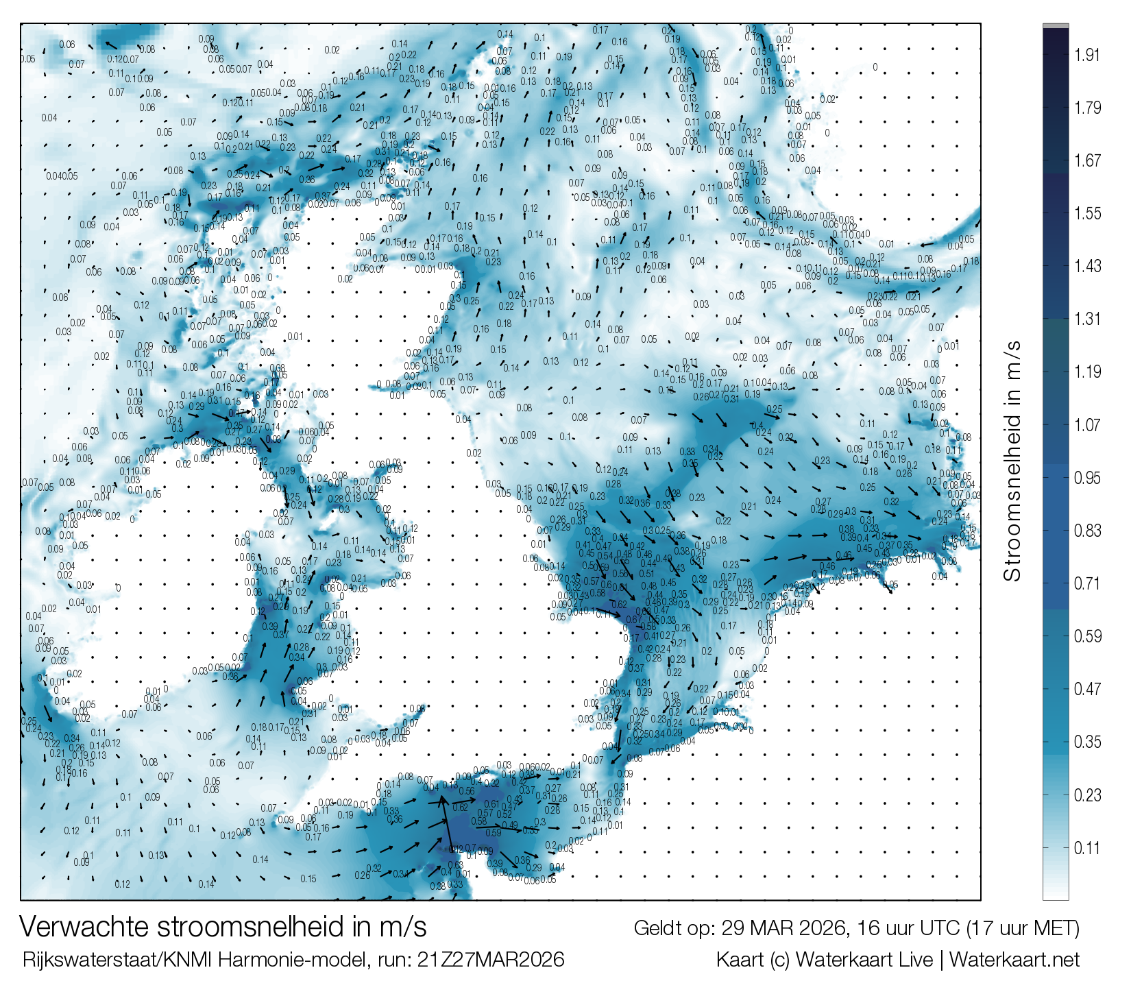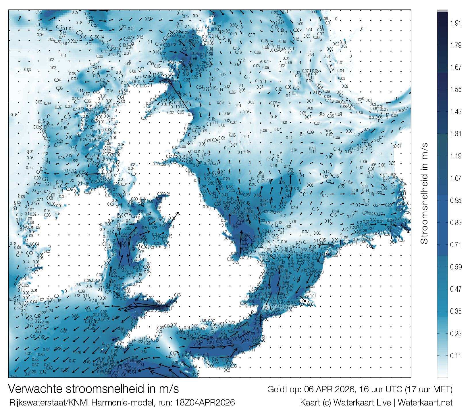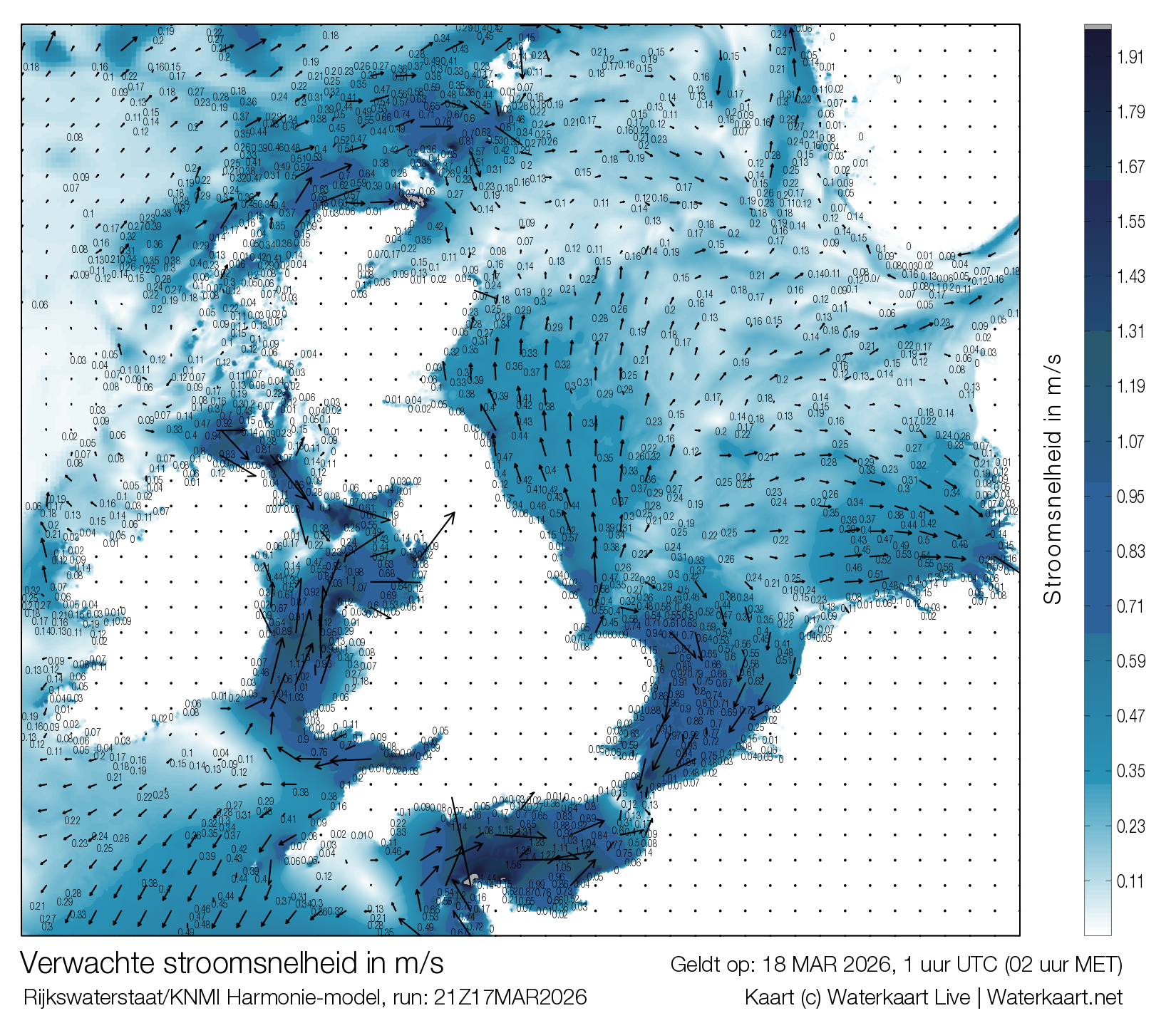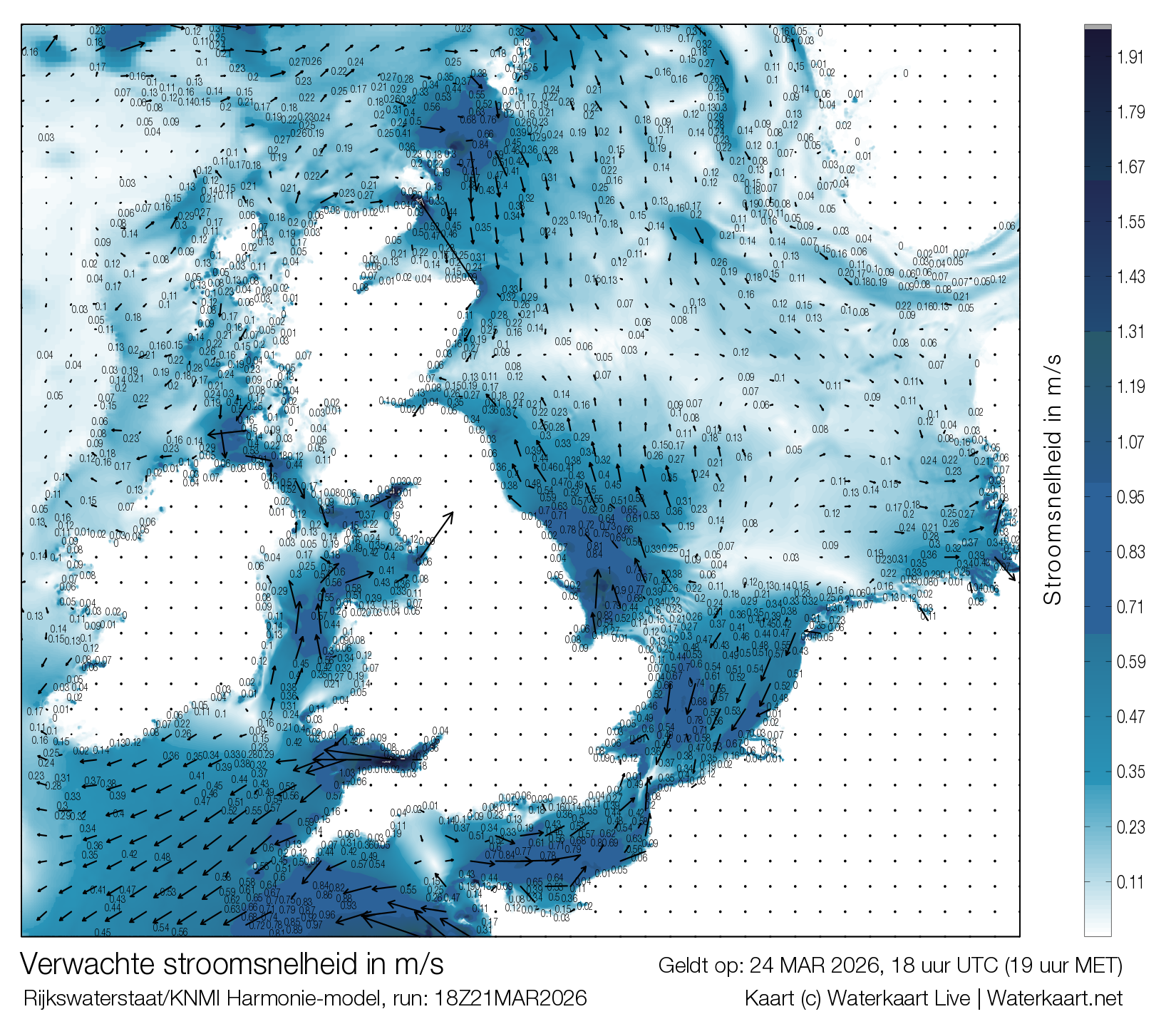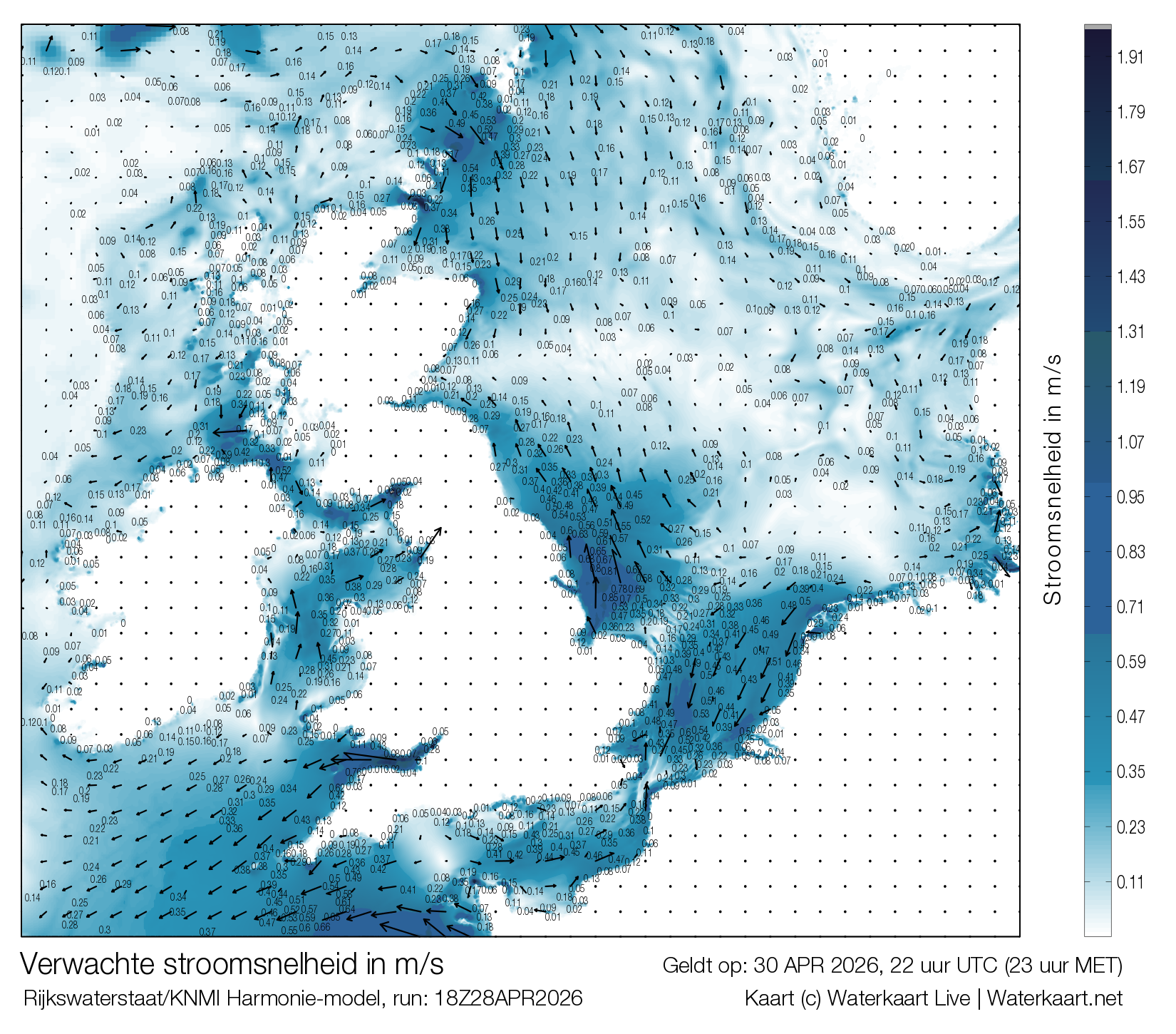 Stroomsnelheden in de Noordzee op basis van de Stroomatlas, verrekend met weersinvloeden. Deze worden iedere dag ververst met data uit het zeestromingen model van Rijkswaterstaat op basis van Harmonie weerdata, voor ieder uur een kaart, tot 48 uur in de toekomst. Lees hieronder meer over dit model