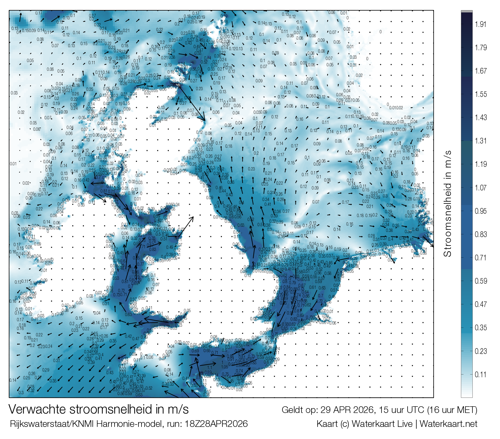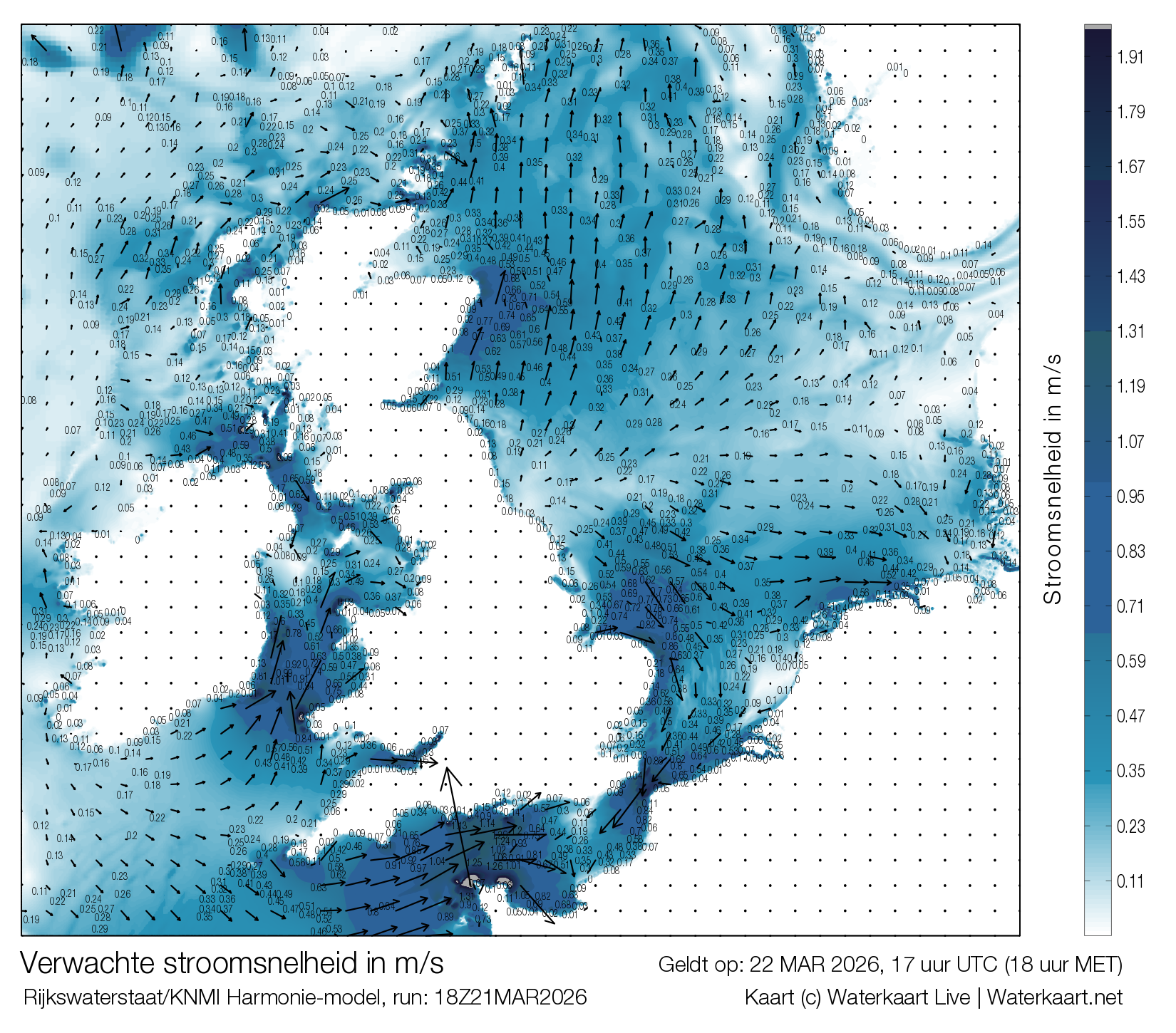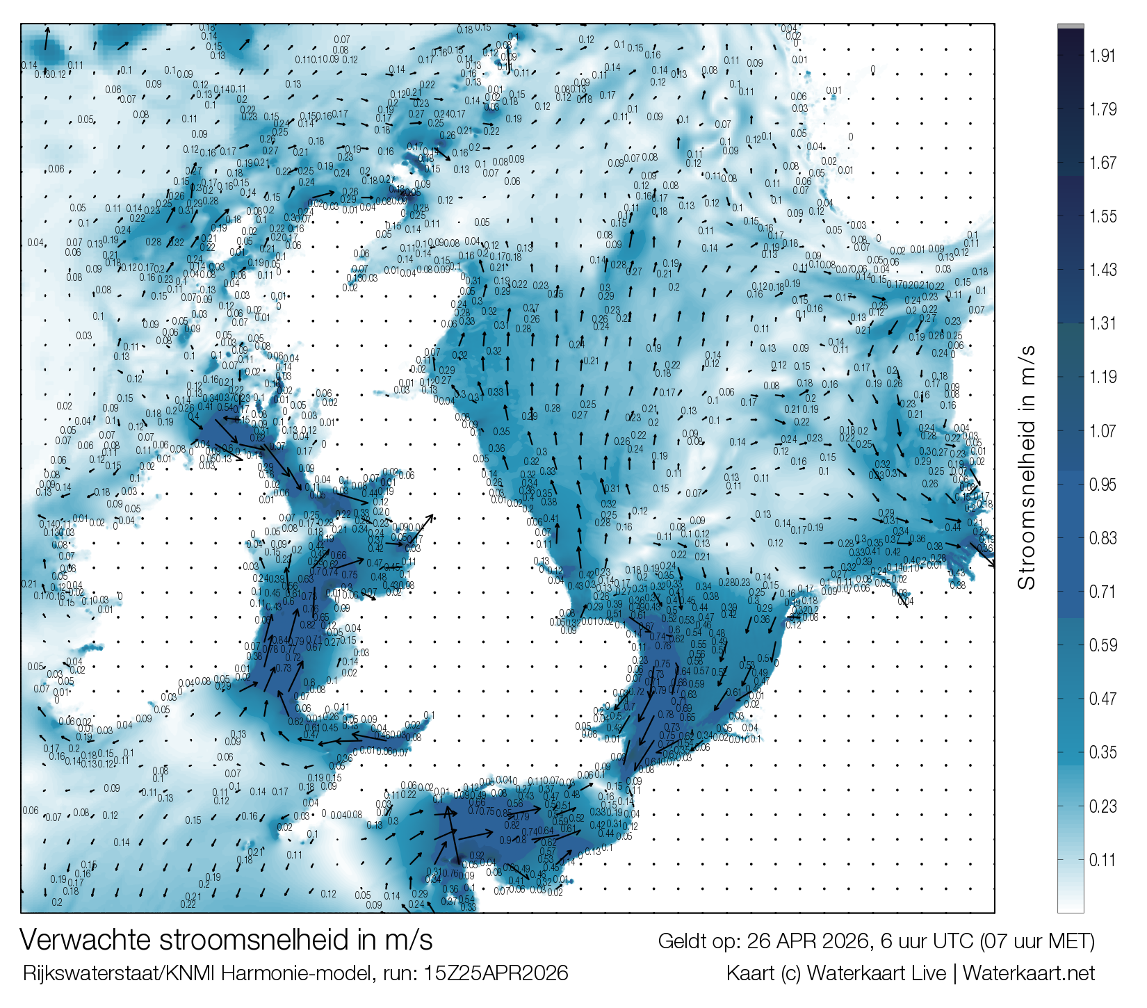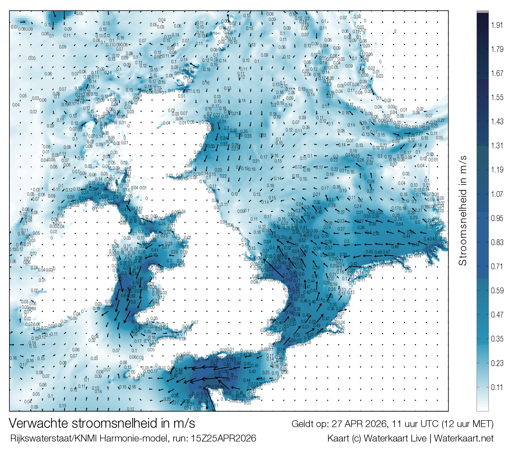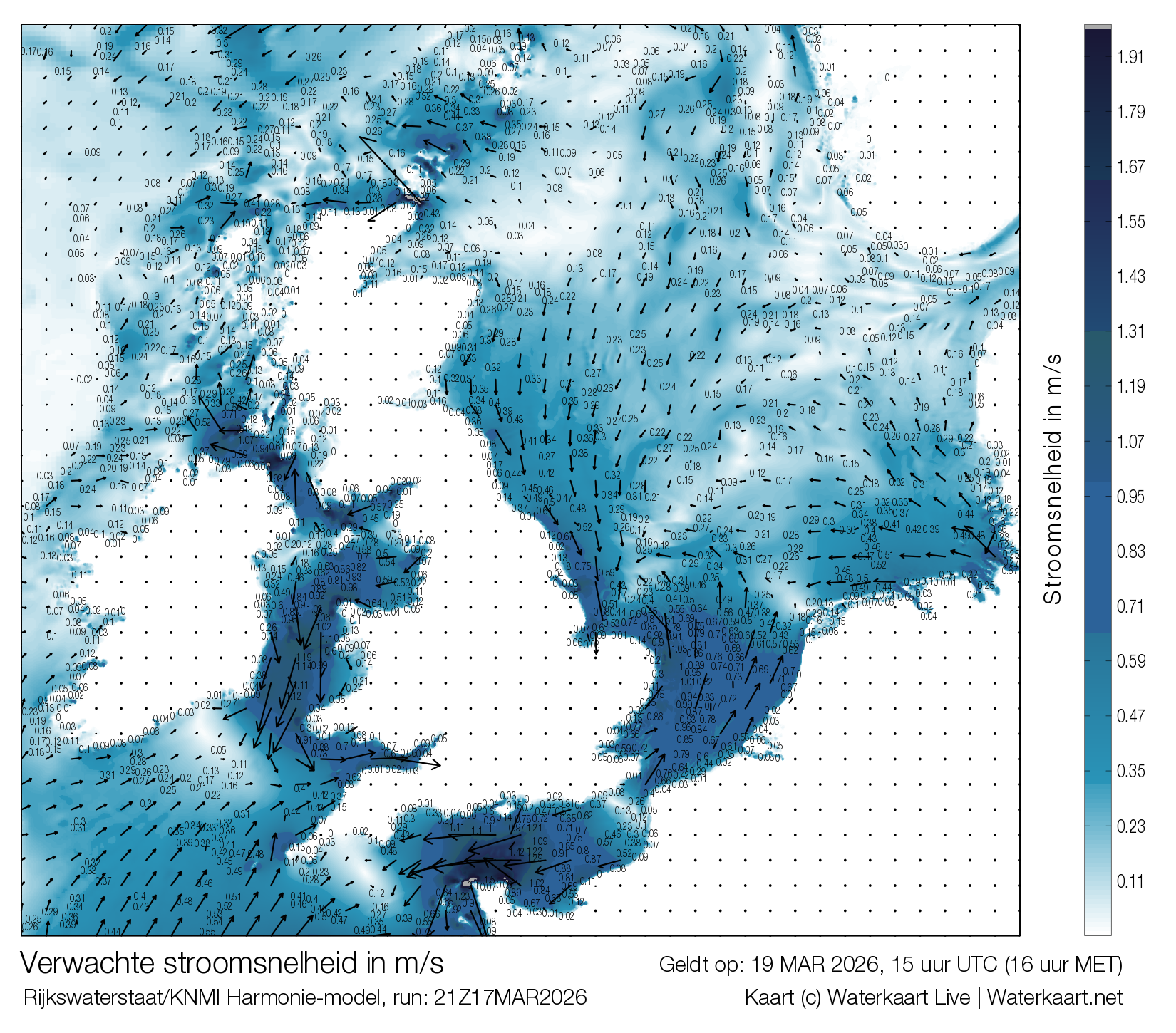 Stroomsnelheden in de Noordzee op basis van de Stroomatlas, verrekend met weersinvloeden. Deze worden iedere dag ververst met data uit het zeestromingen model van Rijkswaterstaat op basis van Harmonie weerdata, voor ieder uur een kaart, tot 48 uur in de toekomst. Lees hieronder meer over dit model
