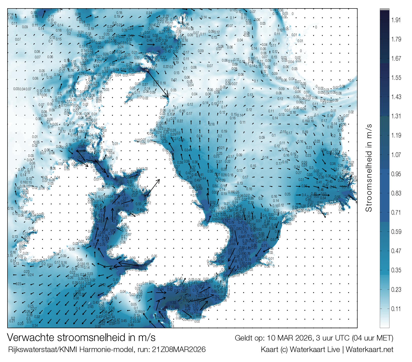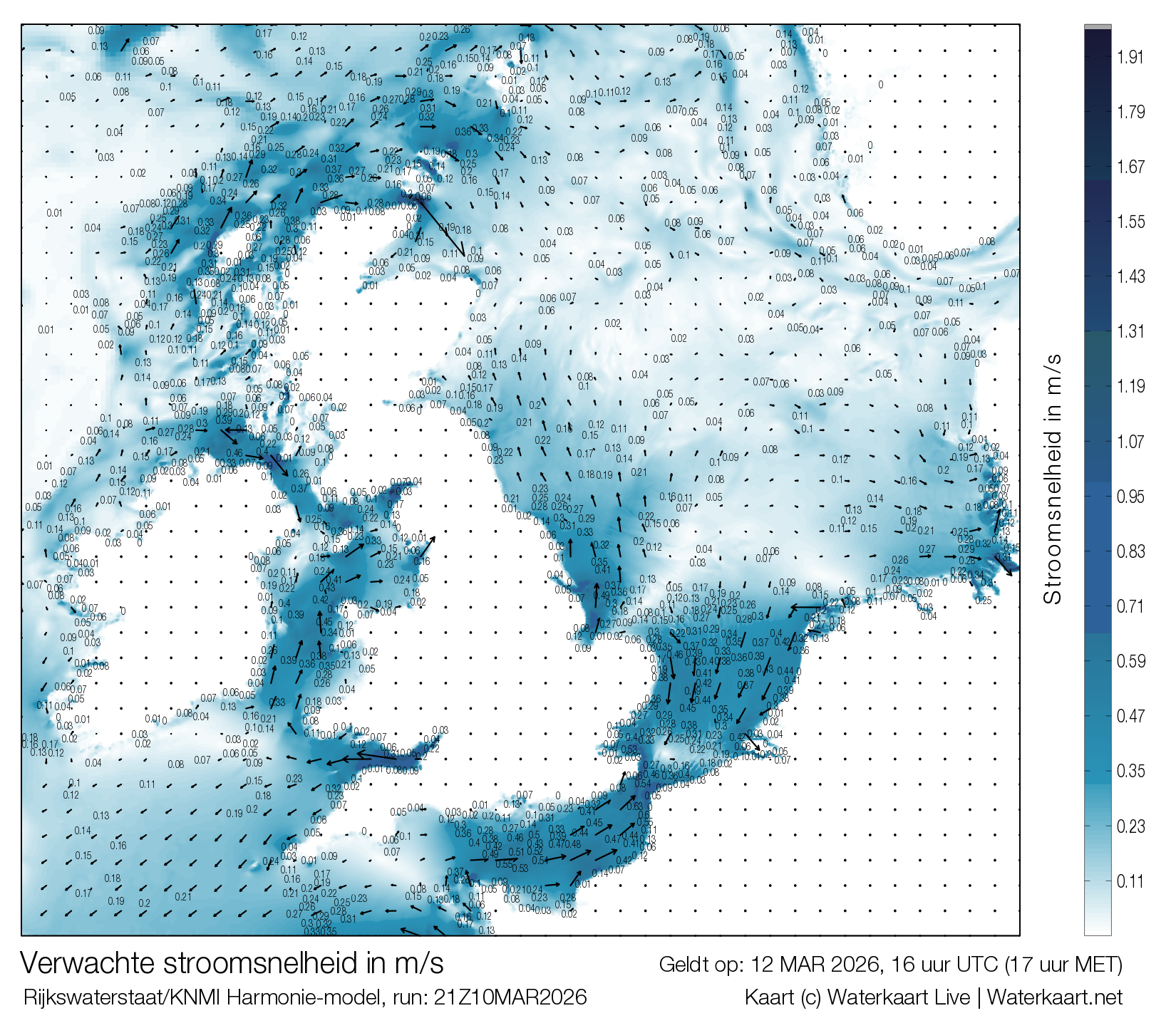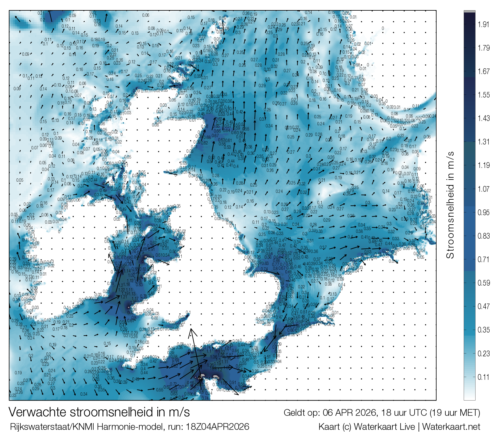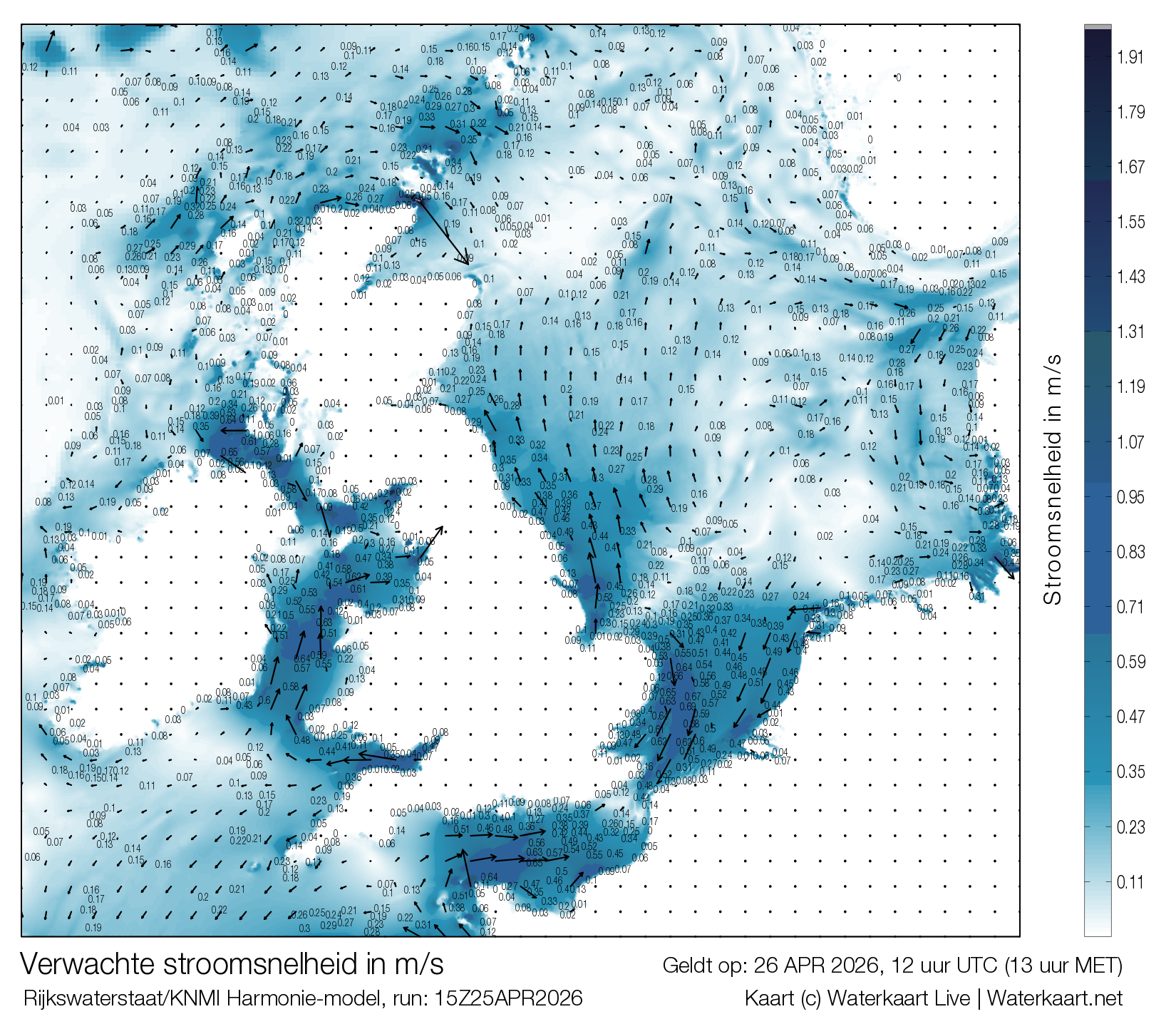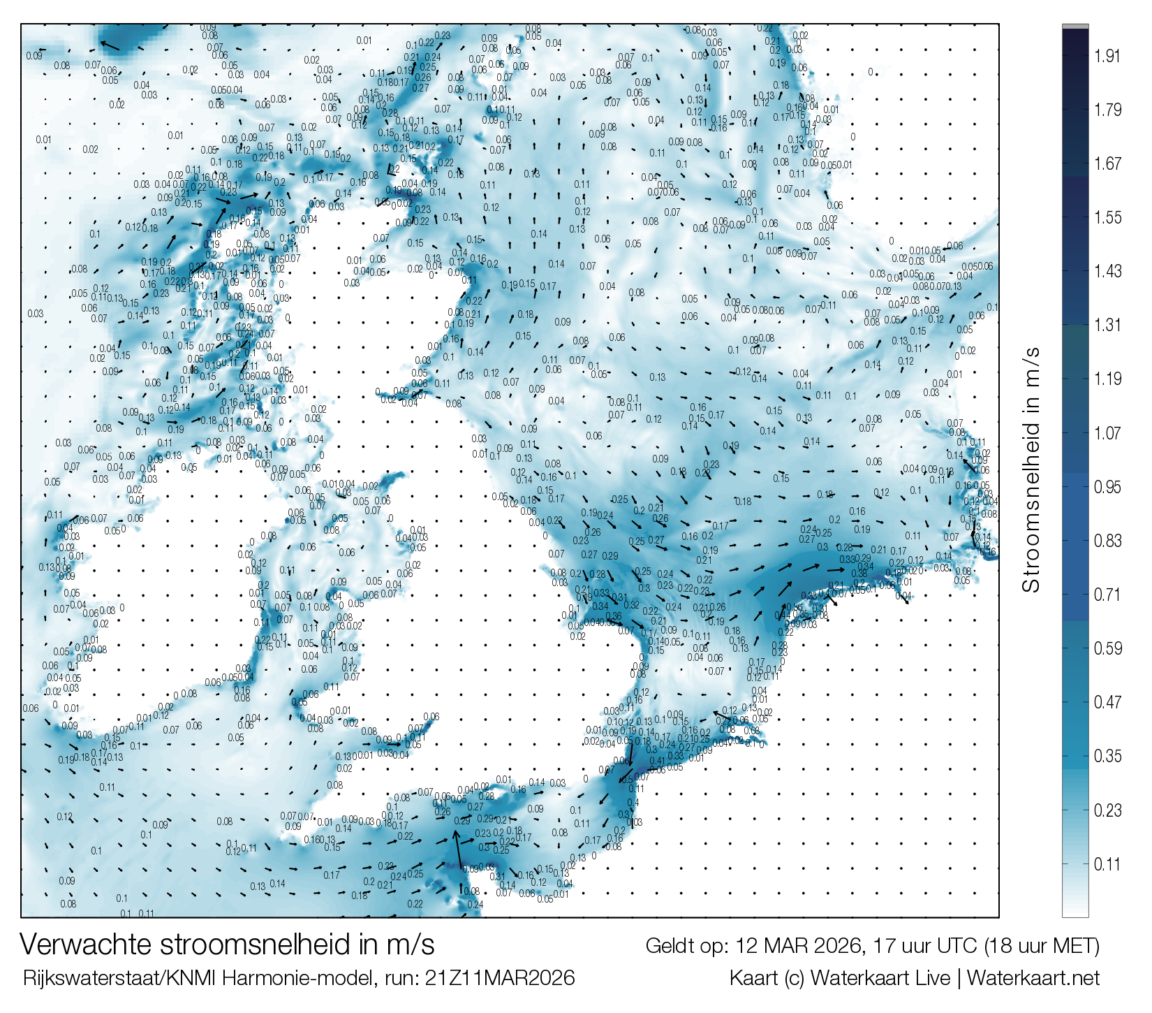 Stroomsnelheden in de Noordzee op basis van de Stroomatlas, verrekend met weersinvloeden. Deze worden iedere dag ververst met data uit het zeestromingen model van Rijkswaterstaat op basis van Harmonie weerdata, voor ieder uur een kaart, tot 48 uur in de toekomst. Lees hieronder meer over dit model