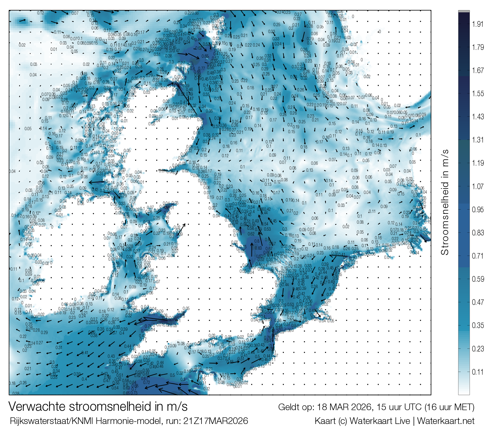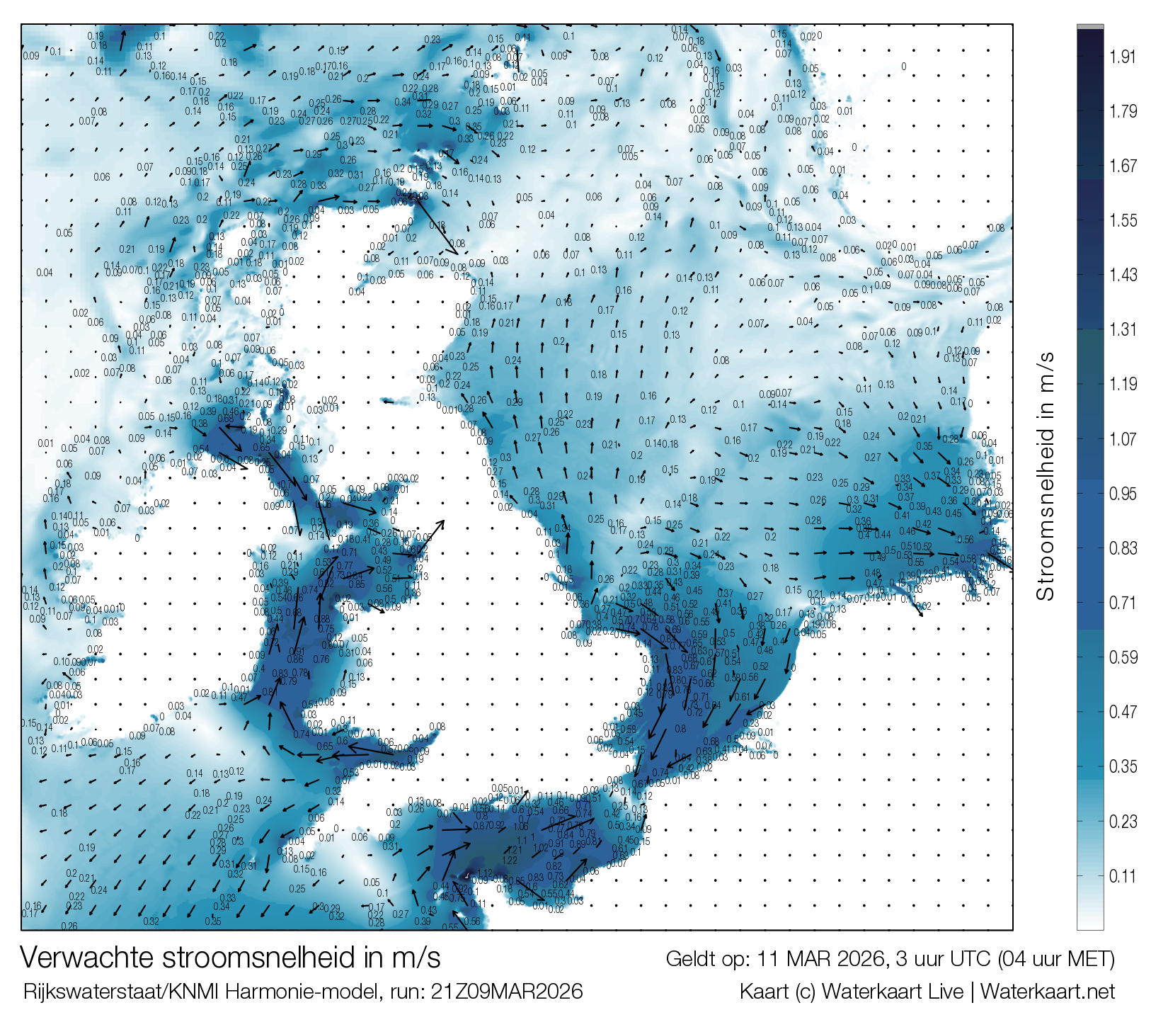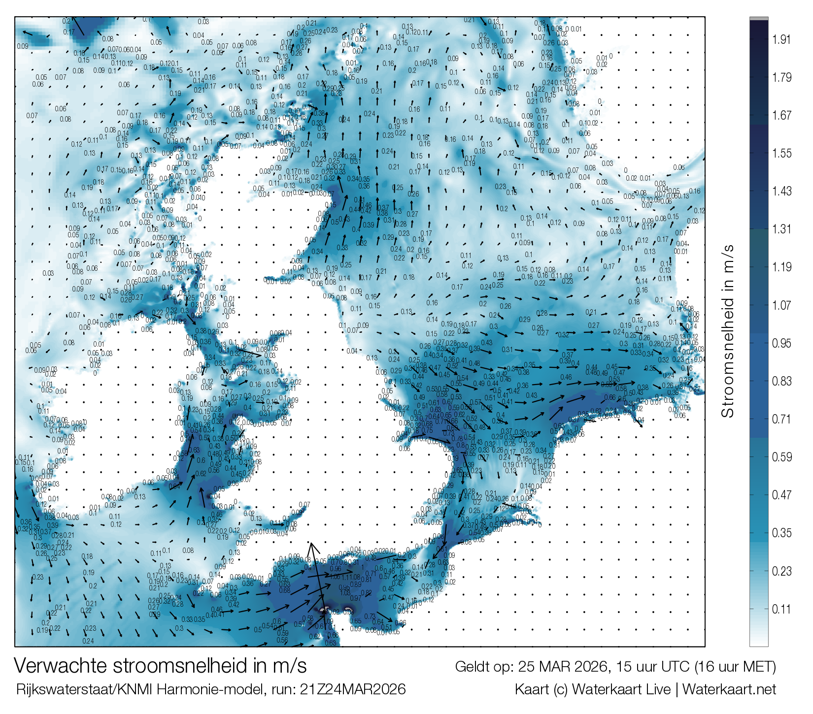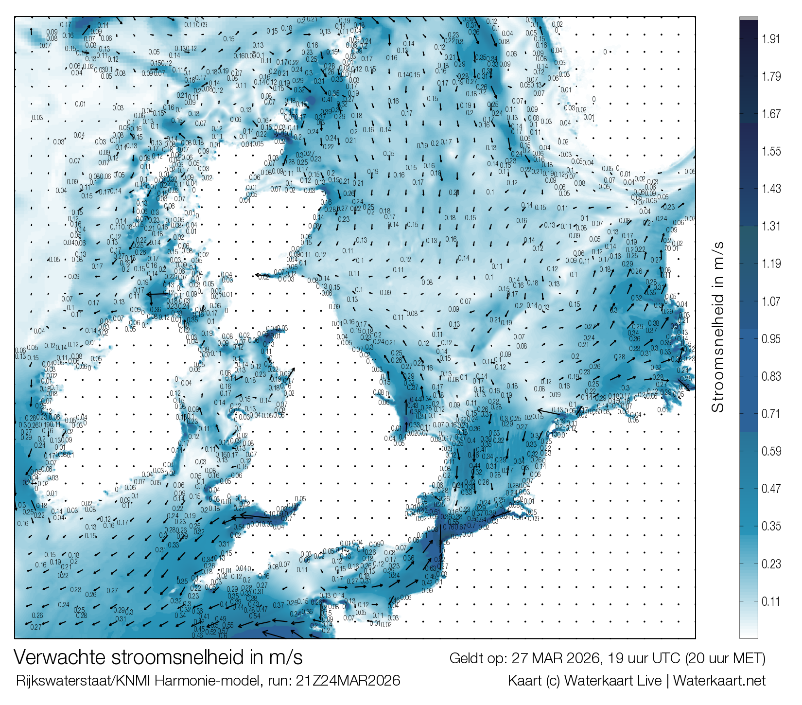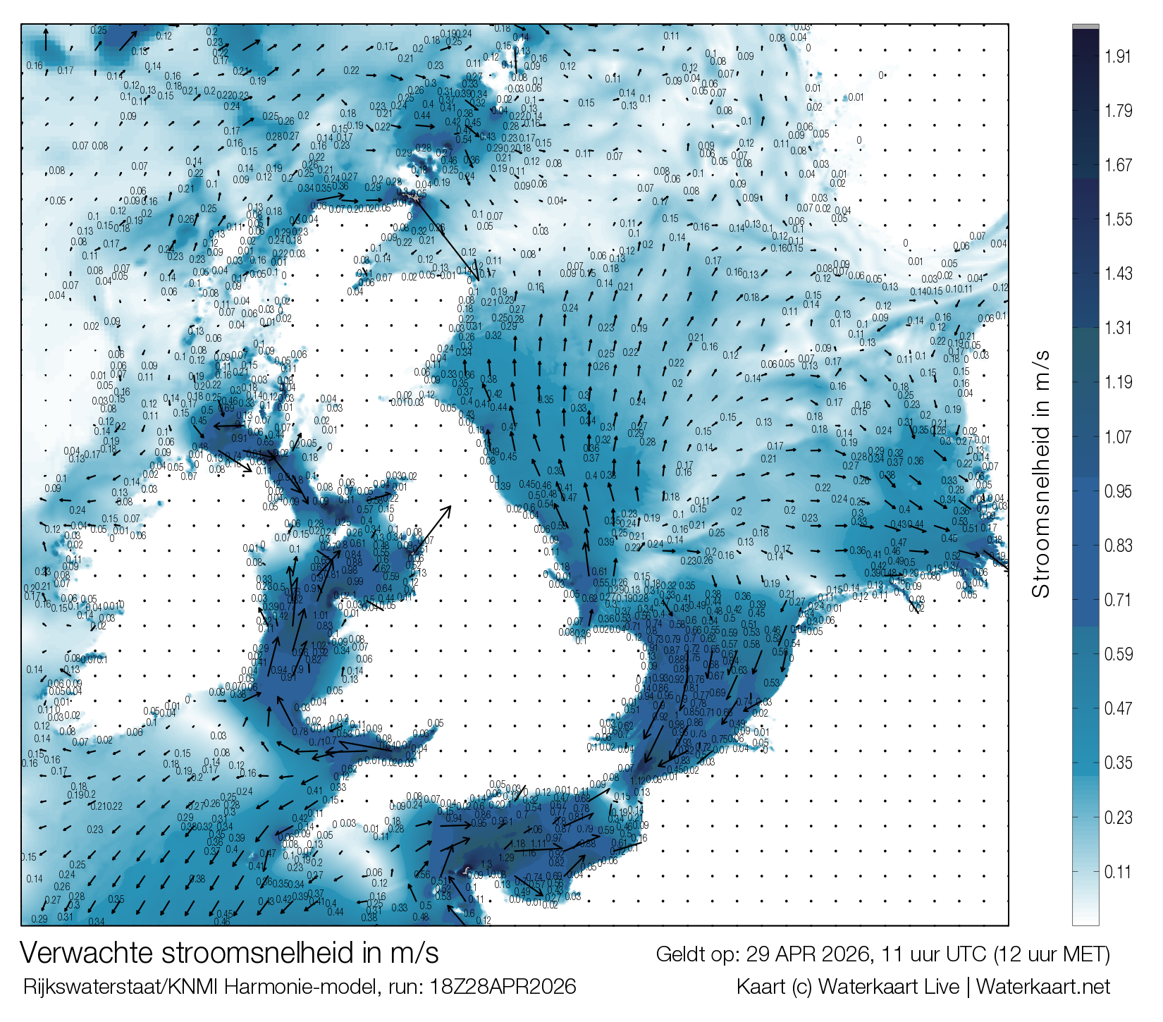 Stroomsnelheden in de Noordzee op basis van de Stroomatlas, verrekend met weersinvloeden. Deze worden iedere dag ververst met data uit het zeestromingen model van Rijkswaterstaat op basis van Harmonie weerdata, voor ieder uur een kaart, tot 48 uur in de toekomst. Lees hieronder meer over dit model