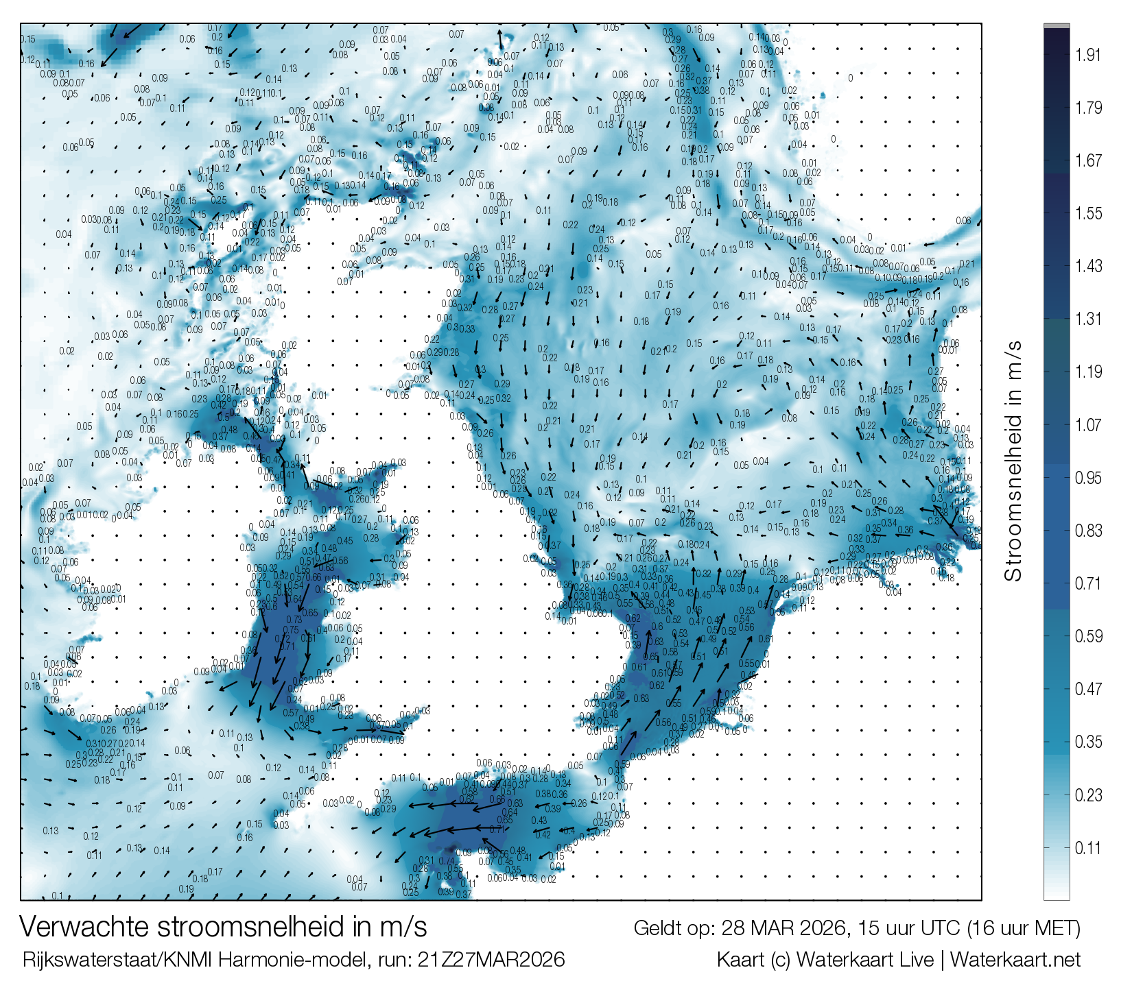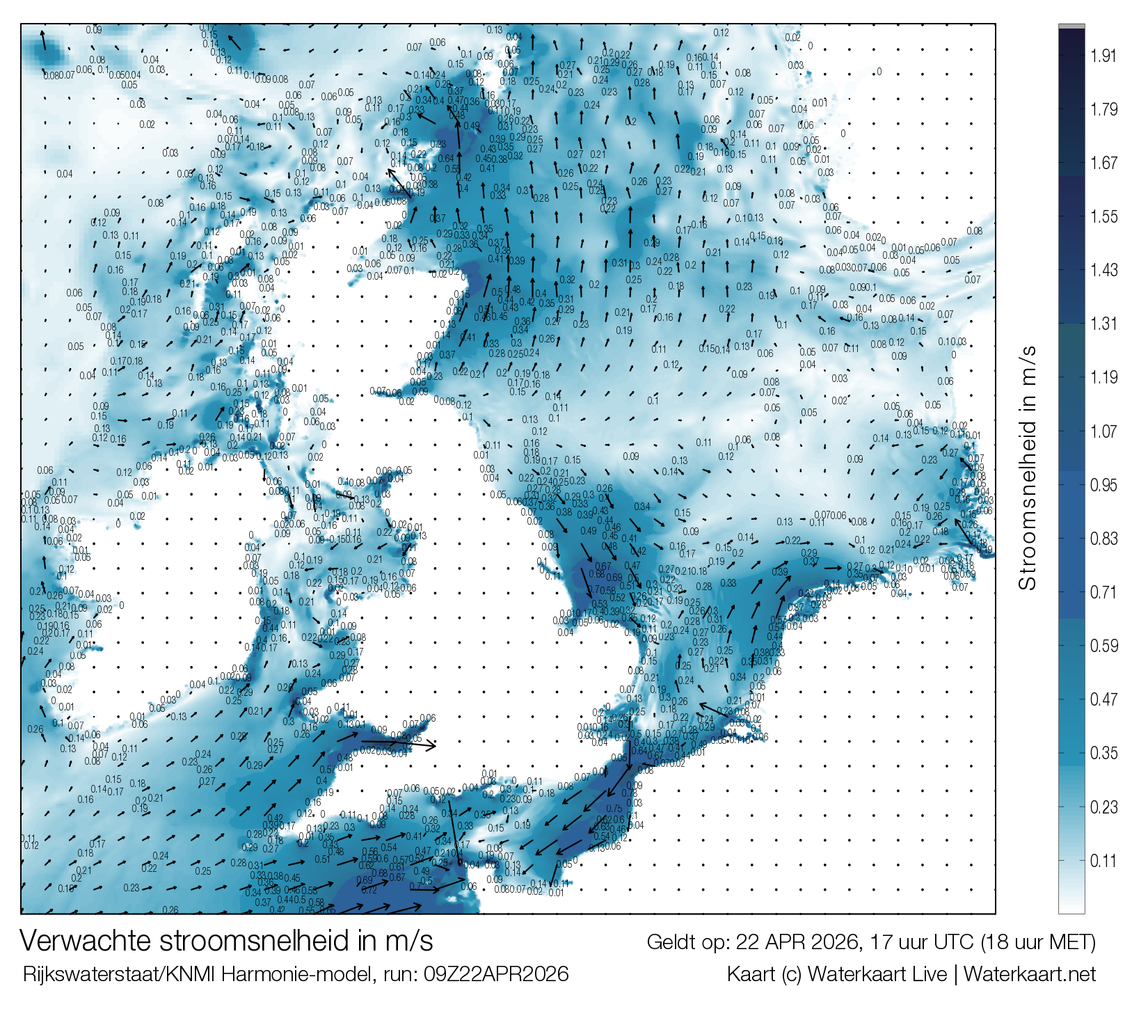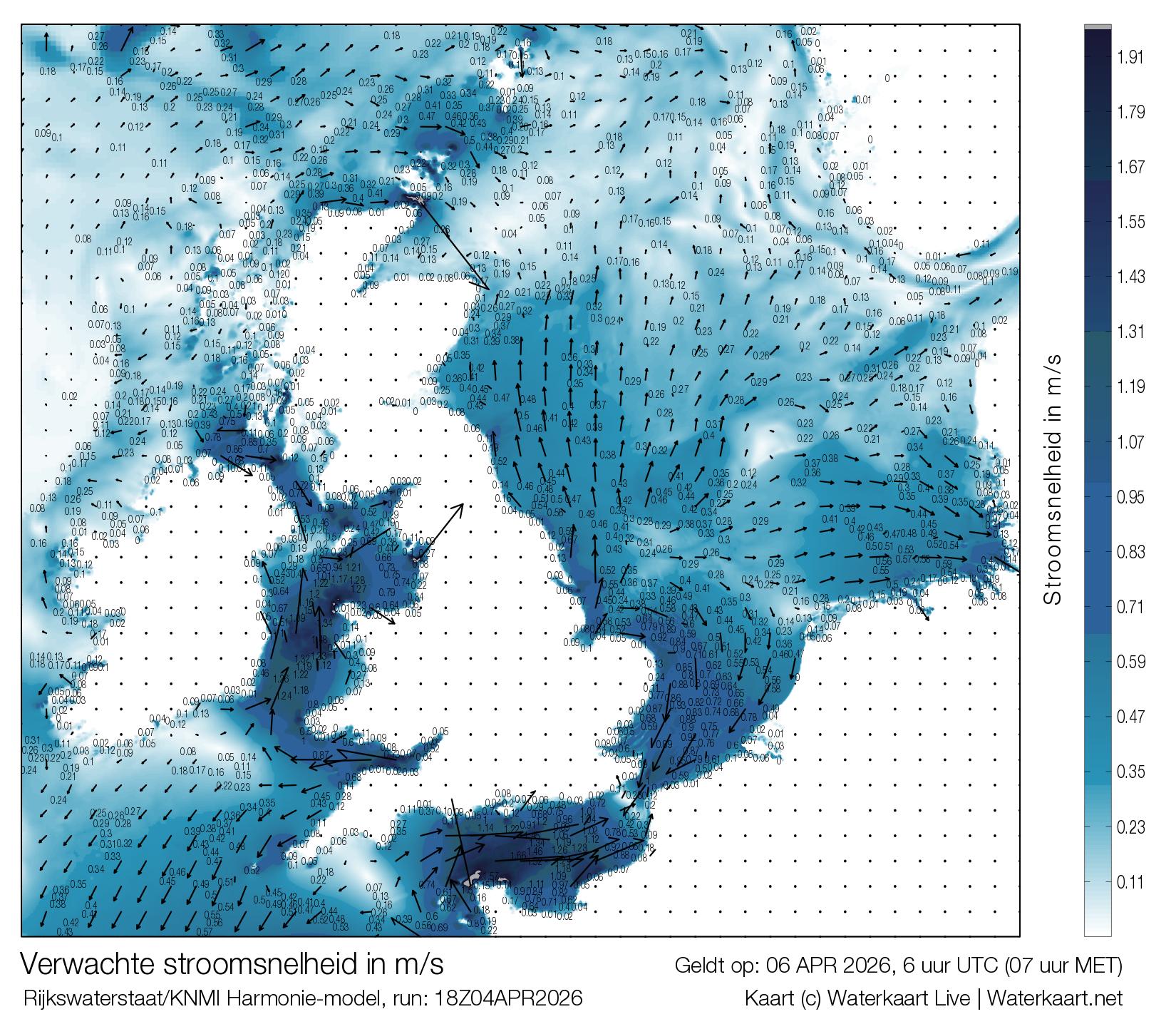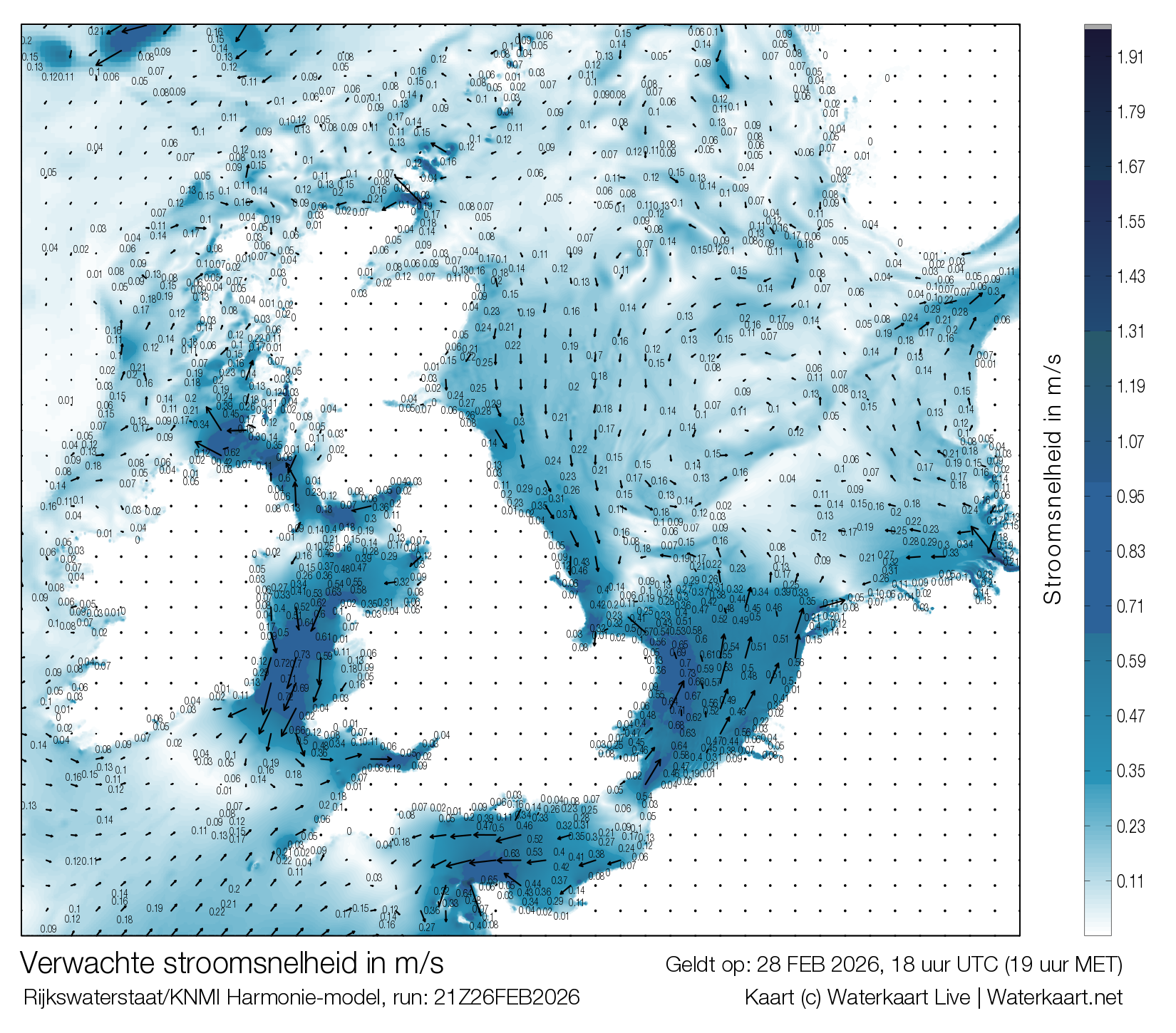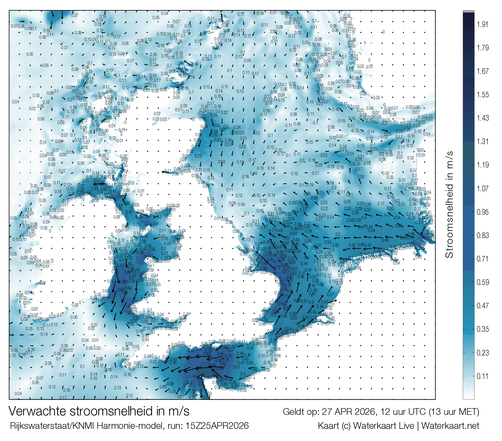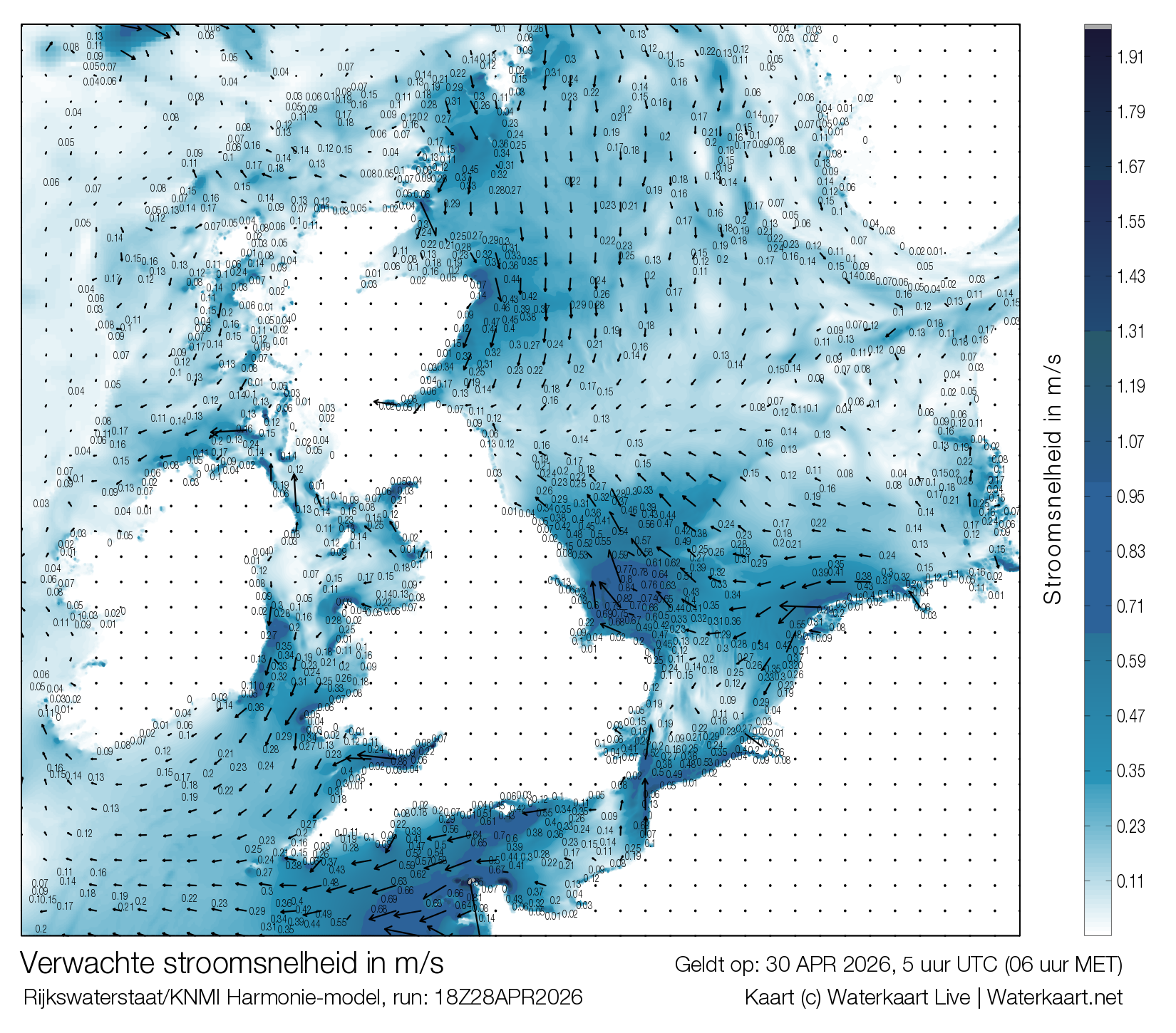 Stroomsnelheden in de Noordzee op basis van de Stroomatlas, verrekend met weersinvloeden. Deze worden iedere dag ververst met data uit het zeestromingen model van Rijkswaterstaat op basis van Harmonie weerdata, voor ieder uur een kaart, tot 48 uur in de toekomst. Lees hieronder meer over dit model