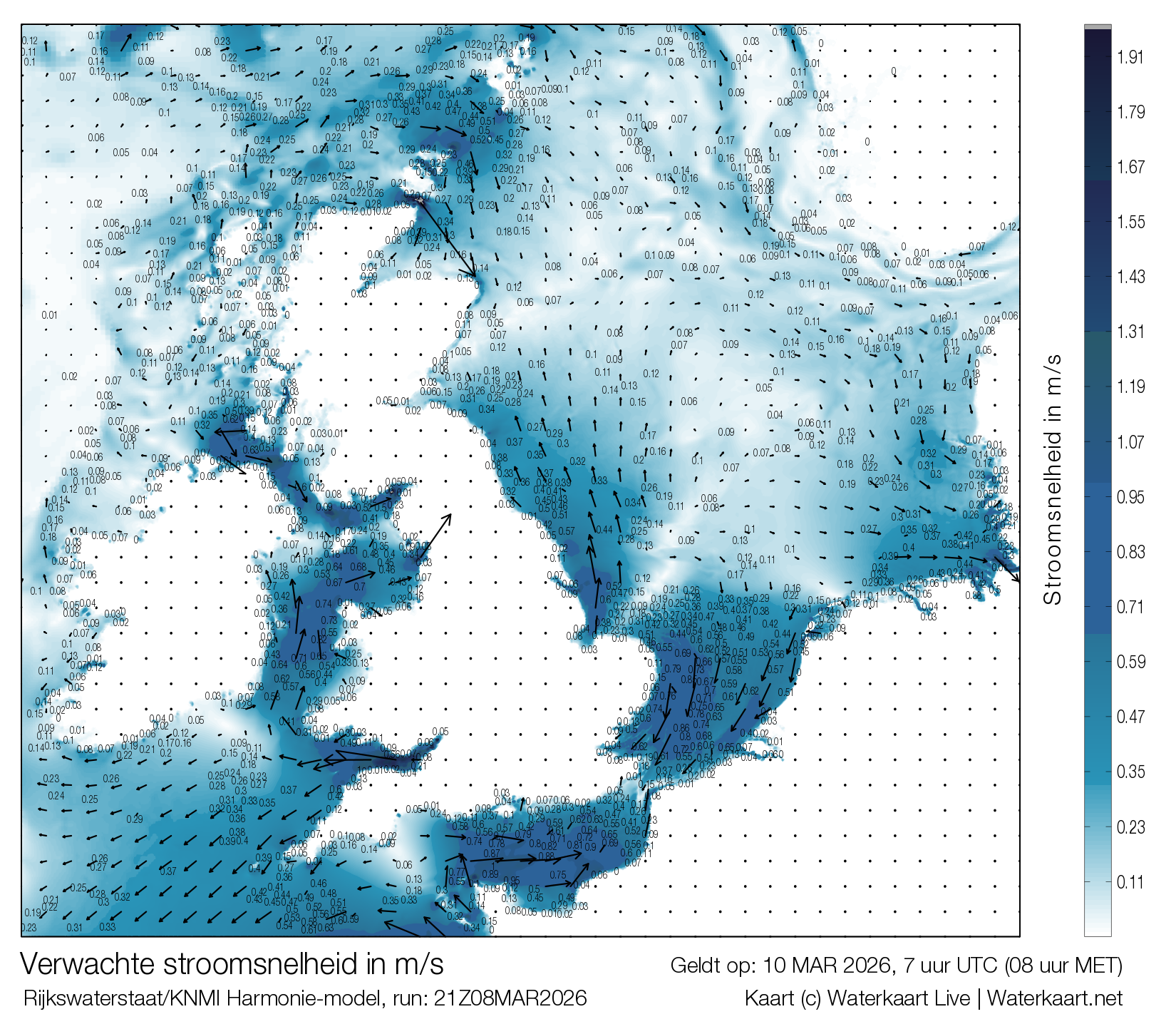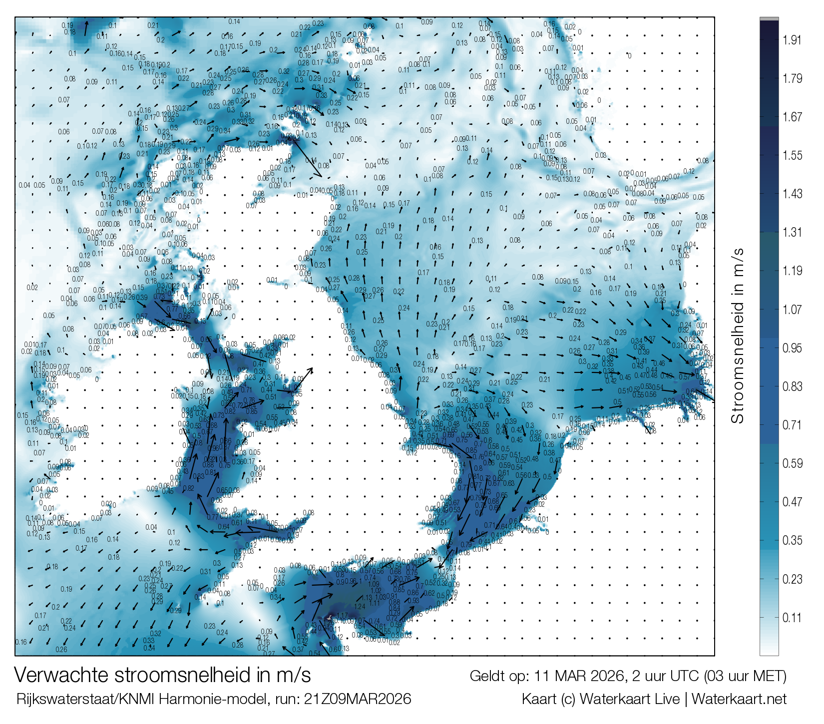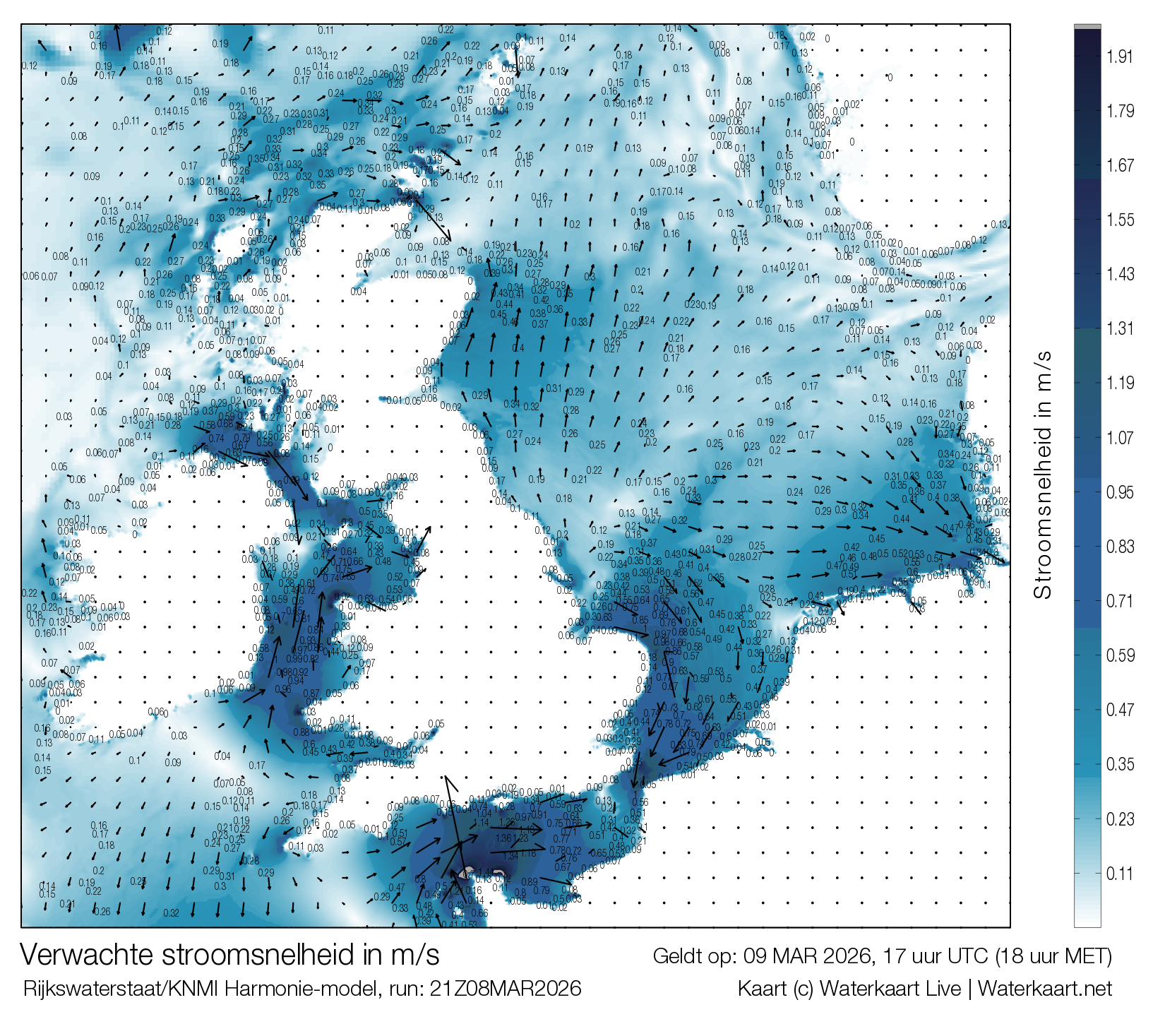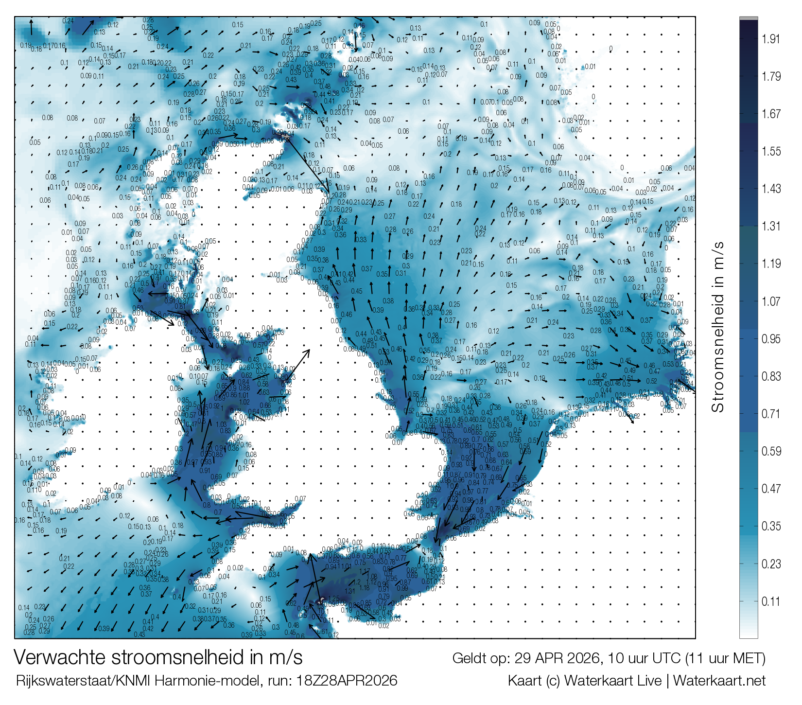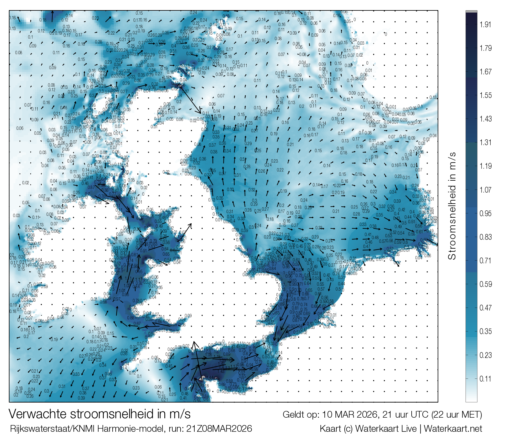 Stroomsnelheden in de Noordzee op basis van de Stroomatlas, verrekend met weersinvloeden. Deze worden iedere dag ververst met data uit het zeestromingen model van Rijkswaterstaat op basis van Harmonie weerdata, voor ieder uur een kaart, tot 48 uur in de toekomst. Lees hieronder meer over dit model