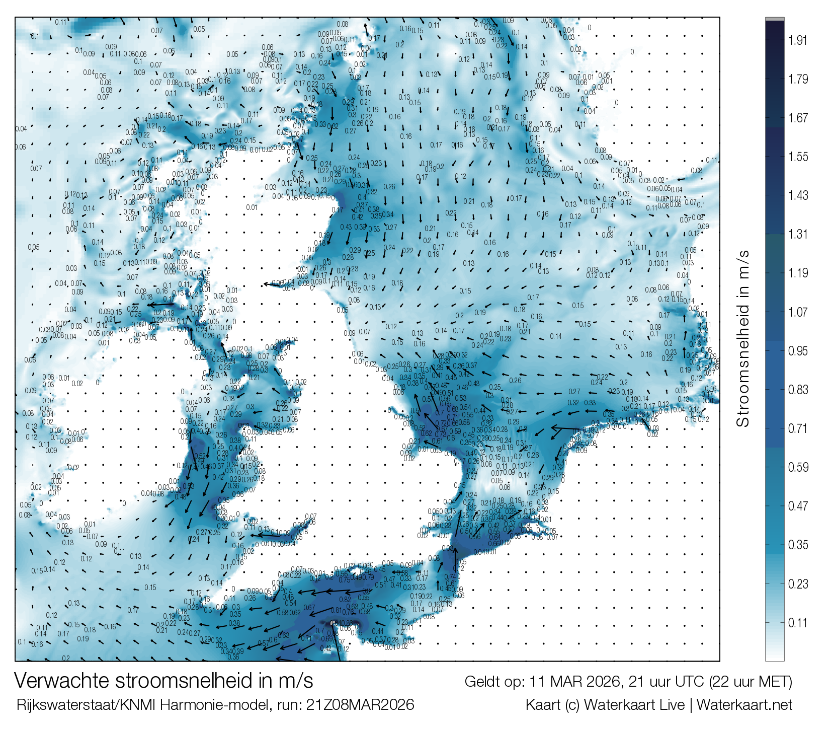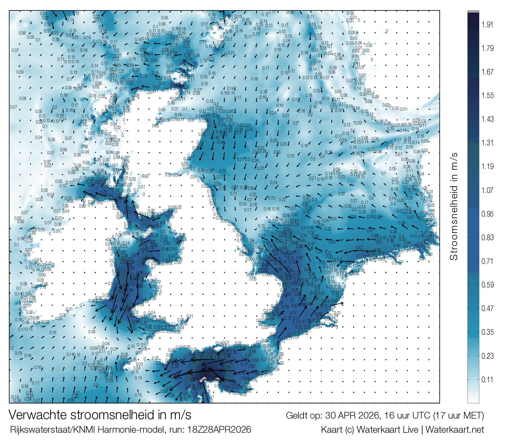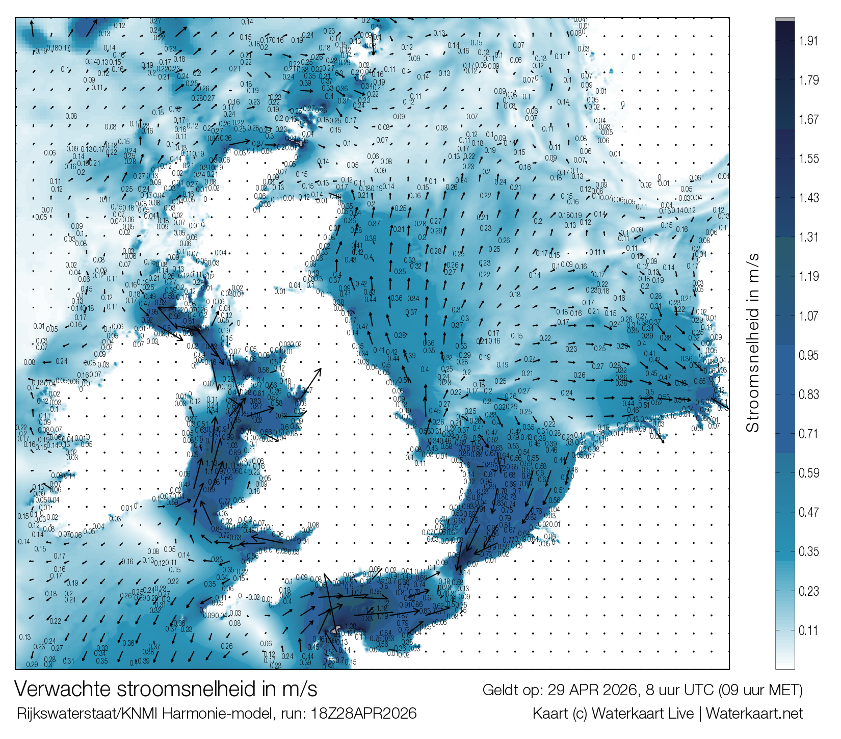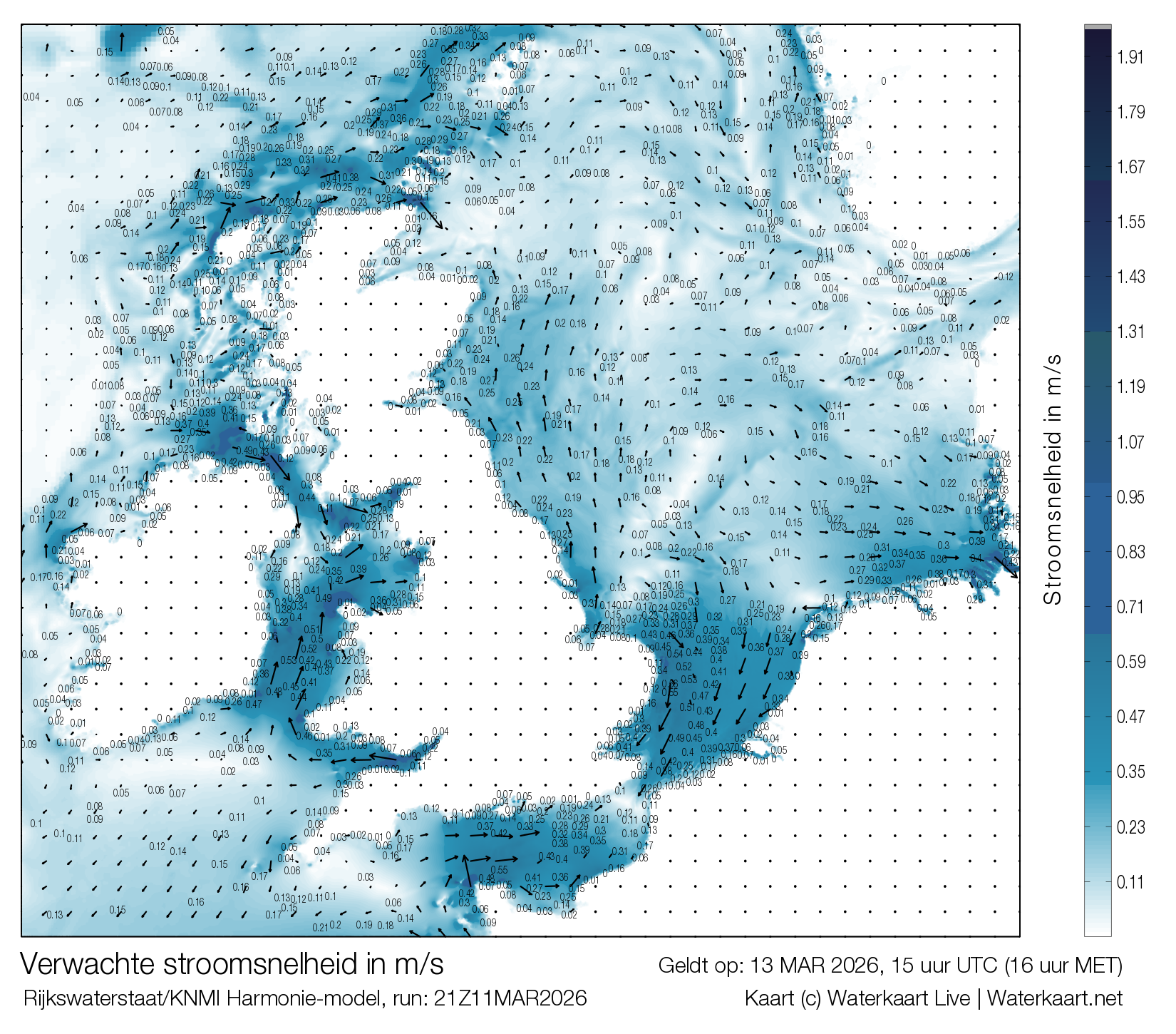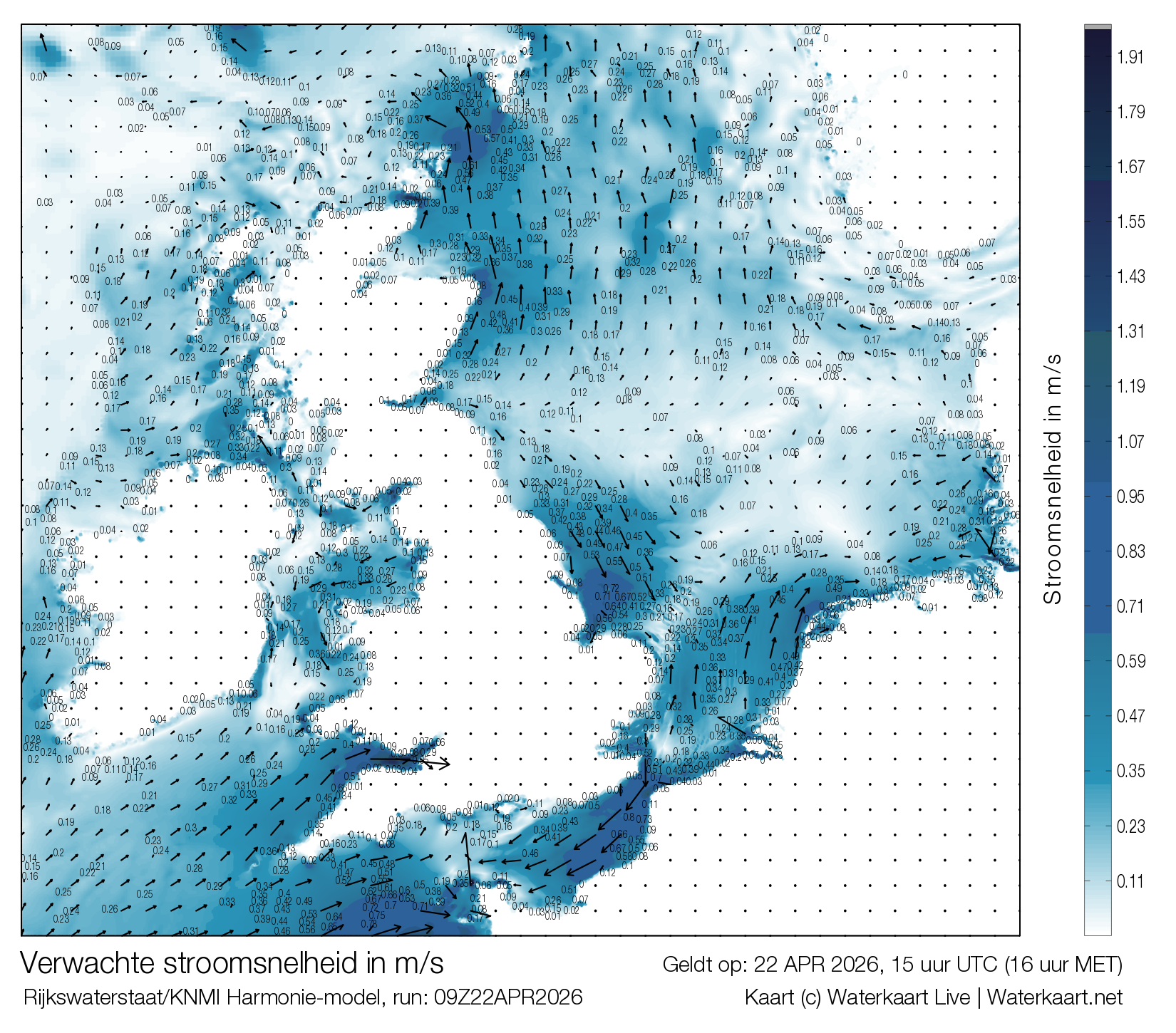Stroomsnelheden in de Noordzee op basis van de Stroomatlas, verrekend met weersinvloeden. Deze worden iedere dag ververst met data uit het zeestromingen model van Rijkswaterstaat op basis van Harmonie weerdata, voor ieder uur een kaart, tot 48 uur in de toekomst. Lees hieronder meer over dit model