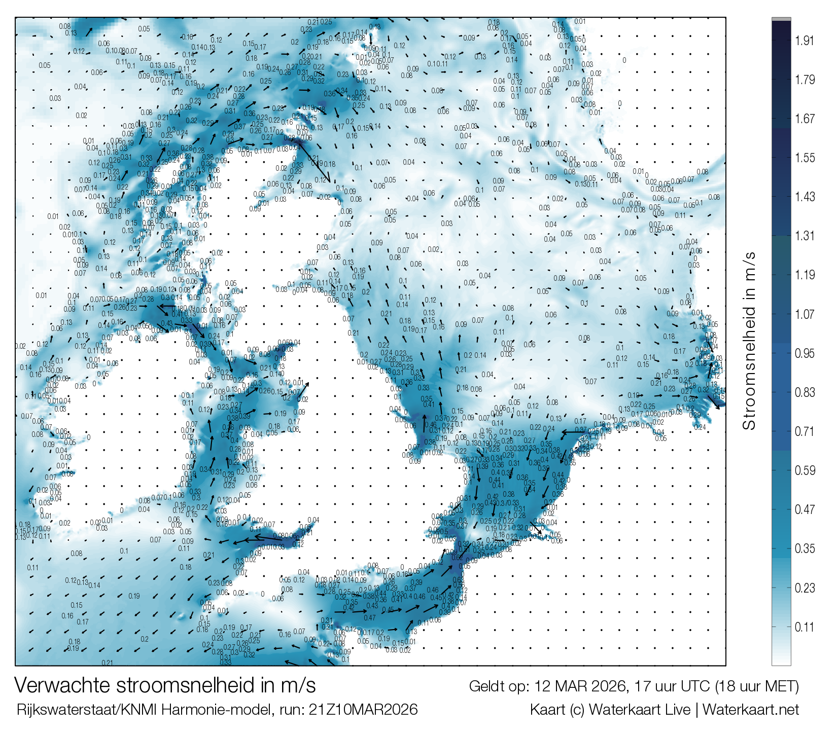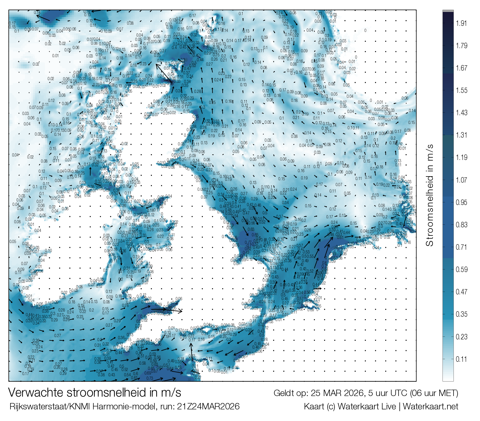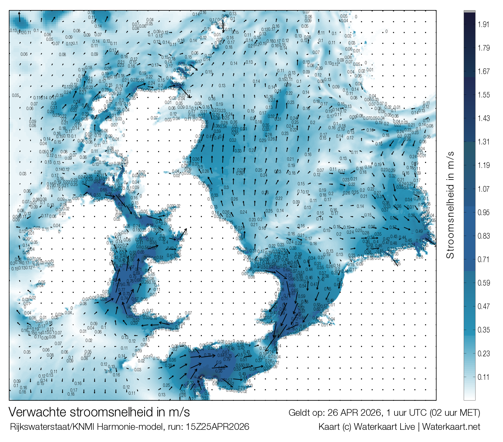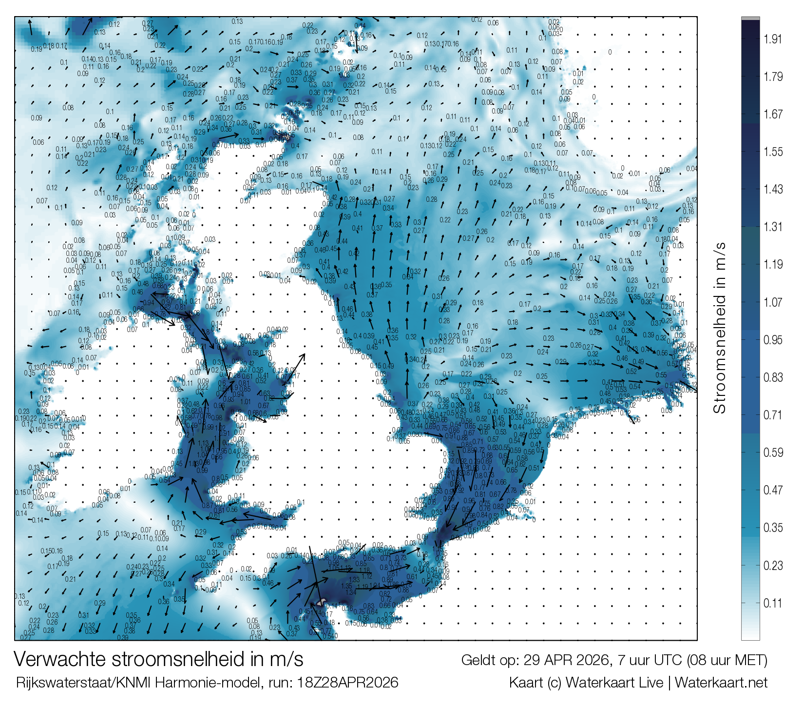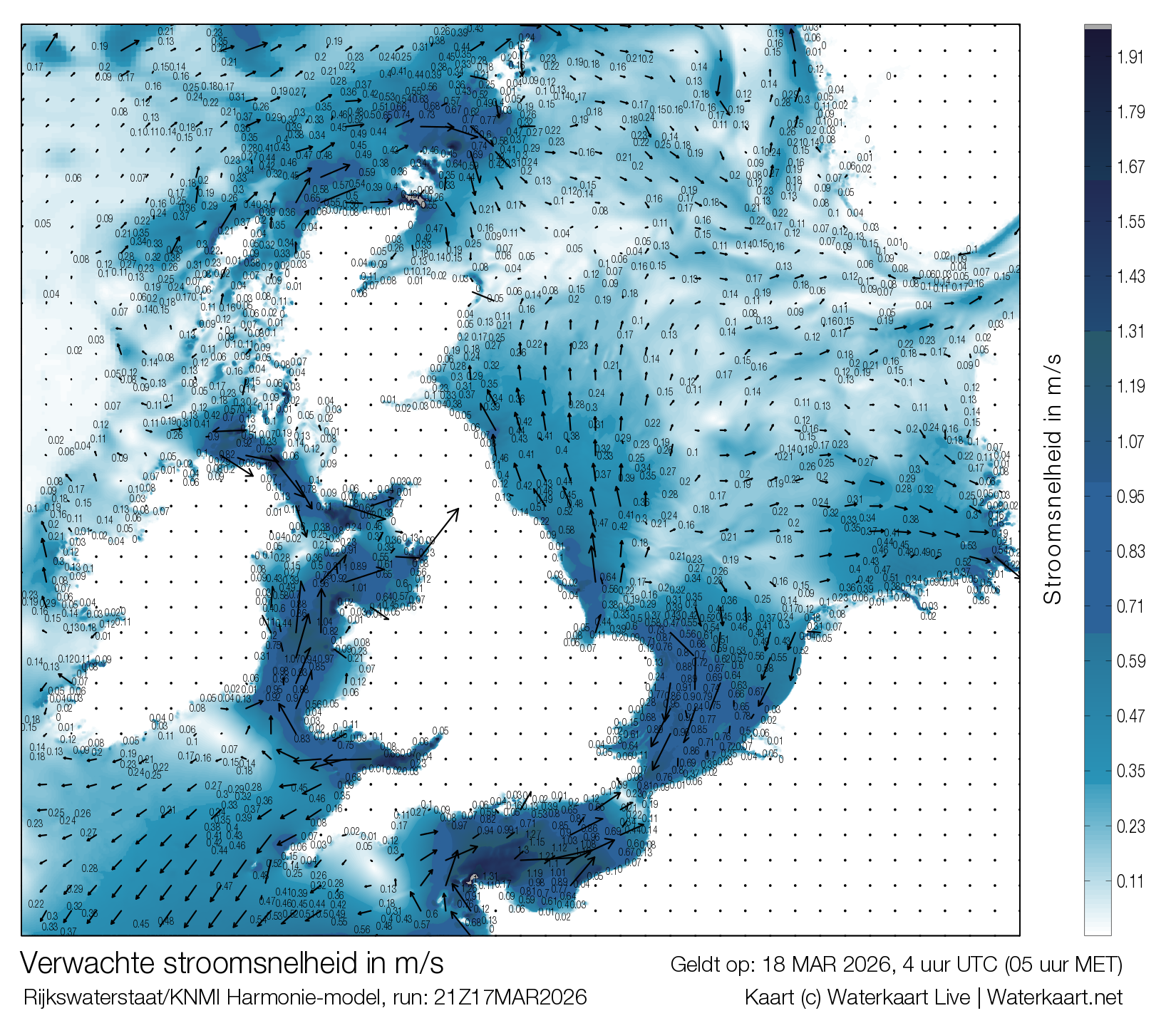 Stroomsnelheden in de Noordzee op basis van de Stroomatlas, verrekend met weersinvloeden. Deze worden iedere dag ververst met data uit het zeestromingen model van Rijkswaterstaat op basis van Harmonie weerdata, voor ieder uur een kaart, tot 48 uur in de toekomst. Lees hieronder meer over dit model