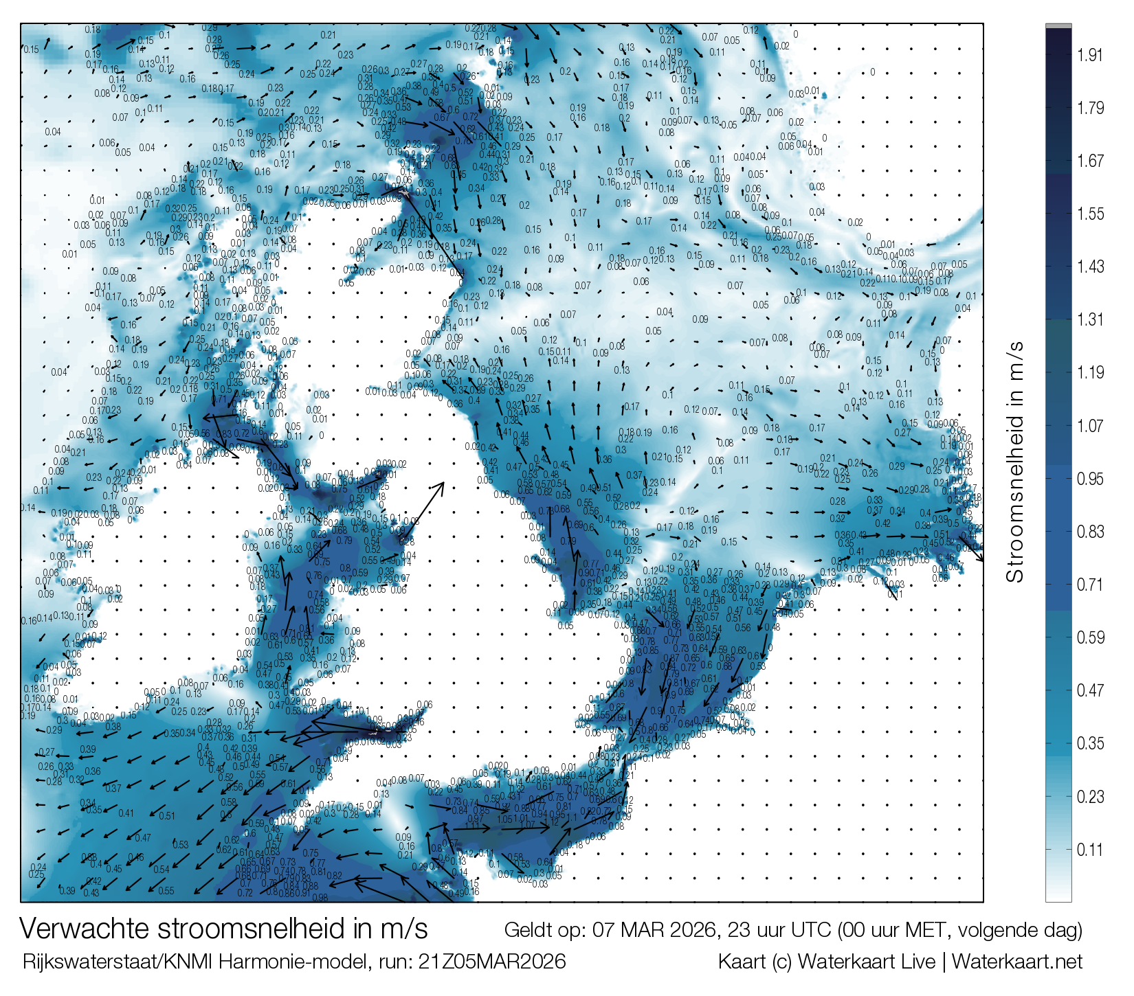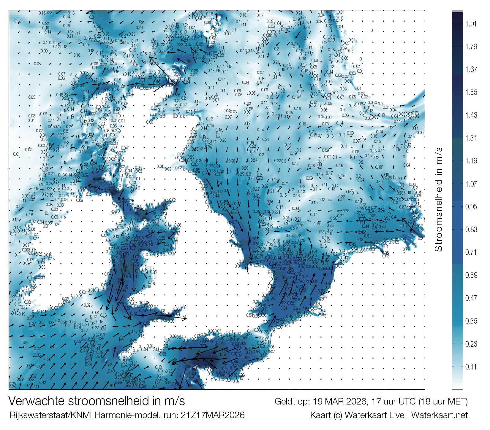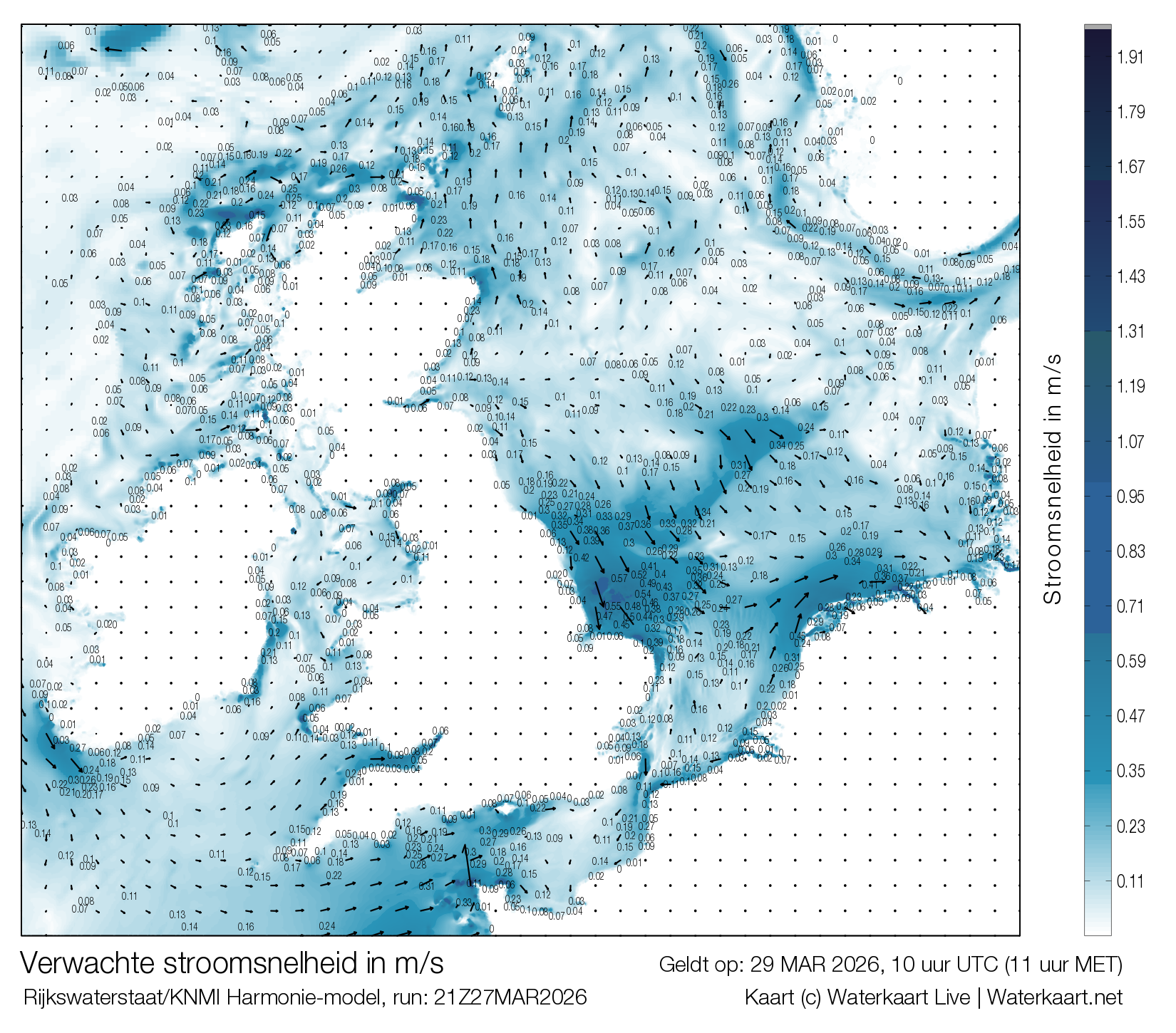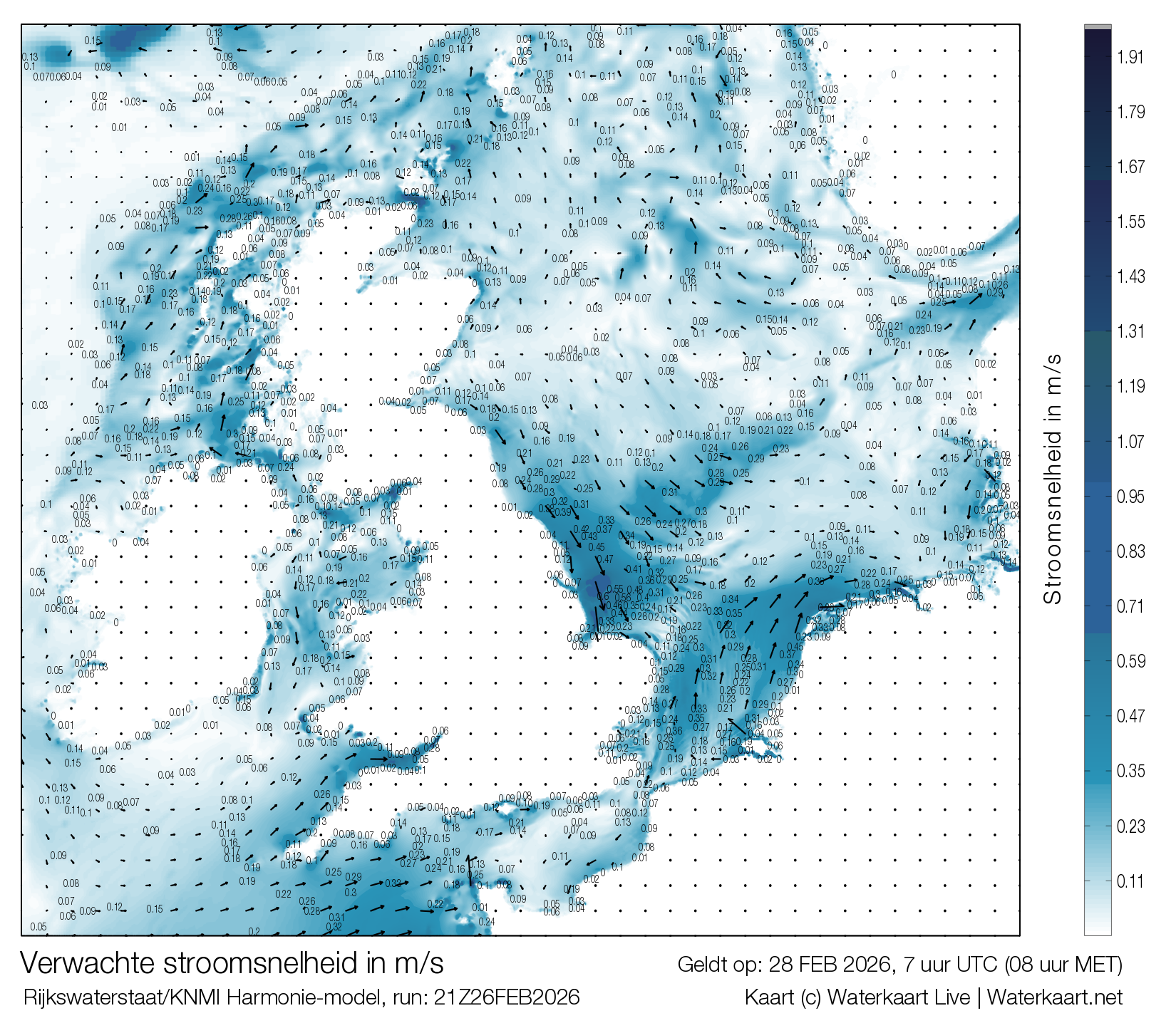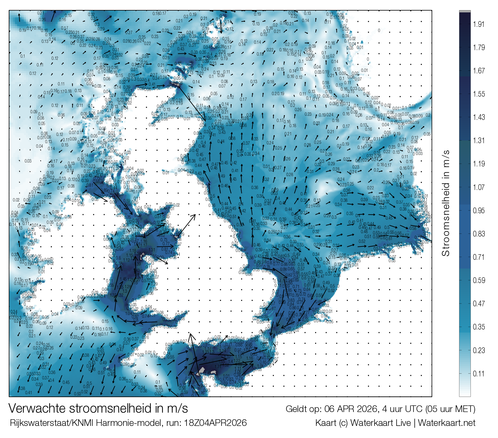 Stroomsnelheden in de Noordzee op basis van de Stroomatlas, verrekend met weersinvloeden. Deze worden iedere dag ververst met data uit het zeestromingen model van Rijkswaterstaat op basis van Harmonie weerdata, voor ieder uur een kaart, tot 48 uur in de toekomst. Lees hieronder meer over dit model