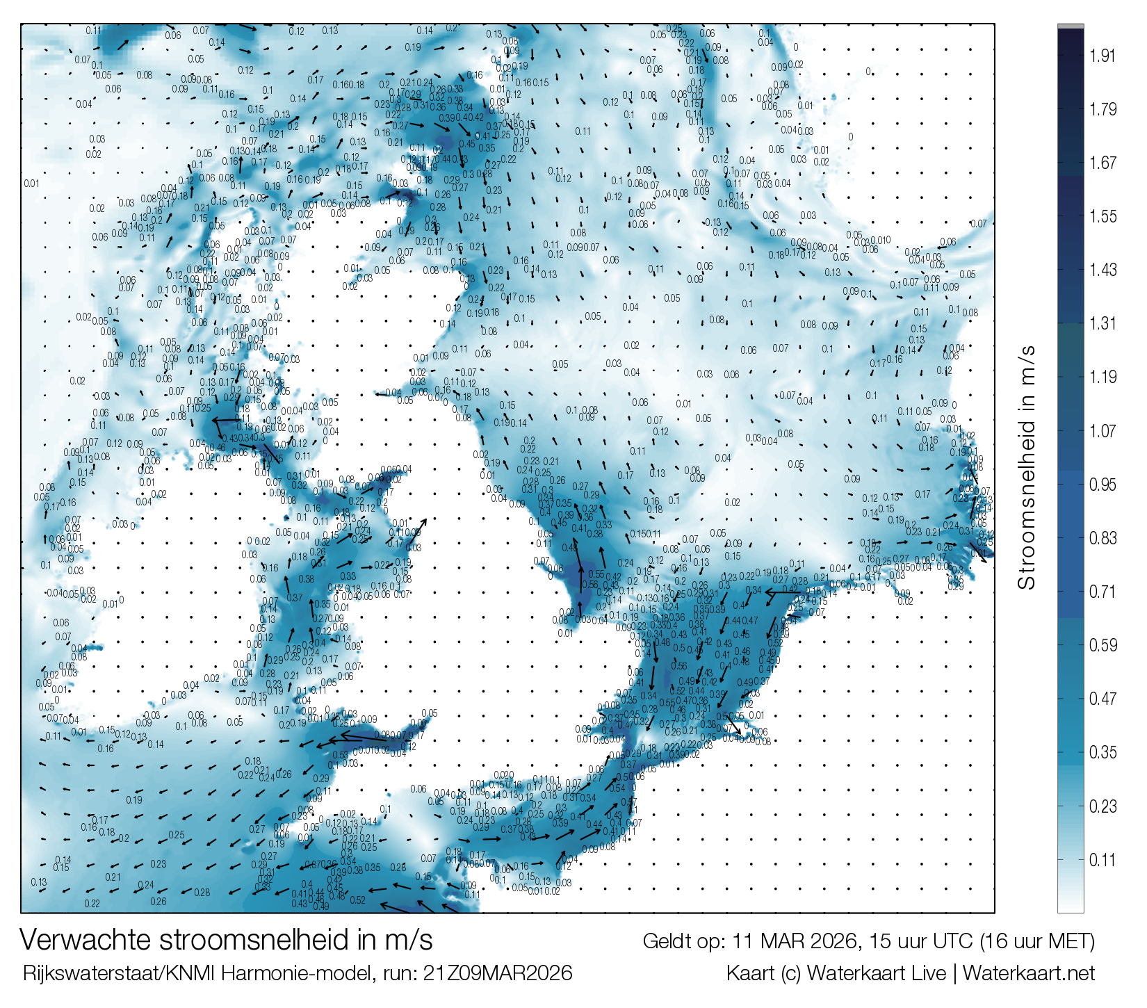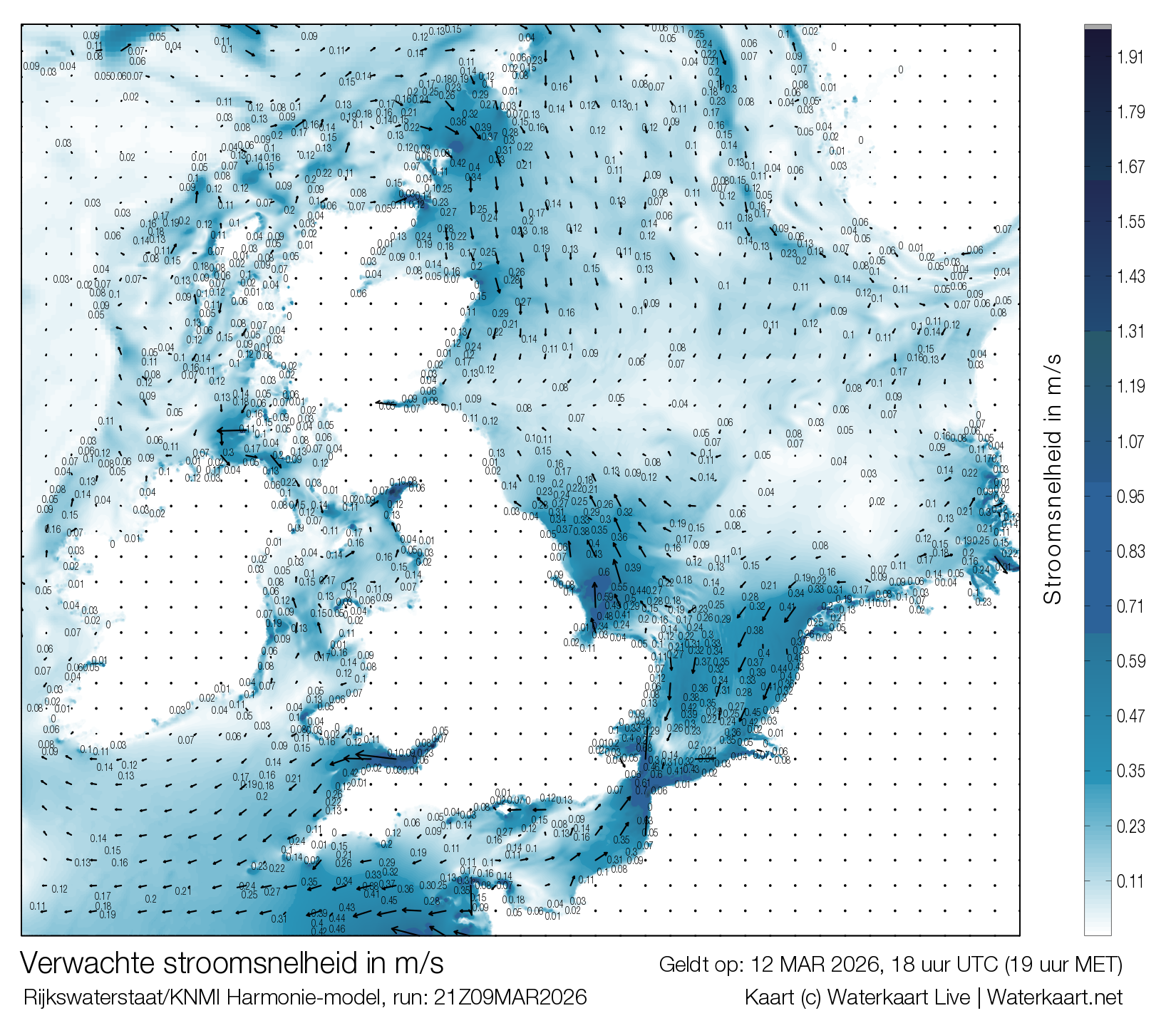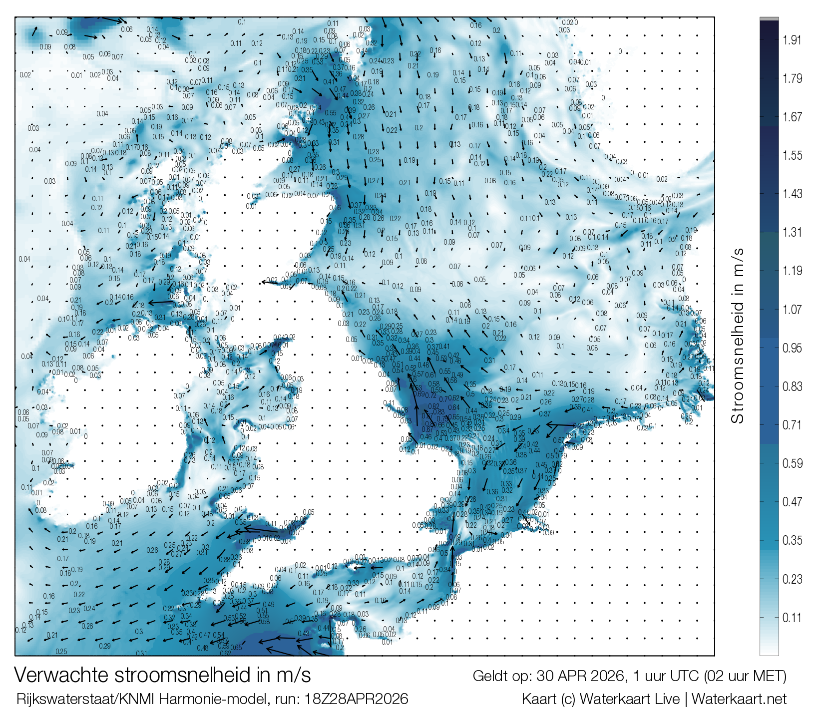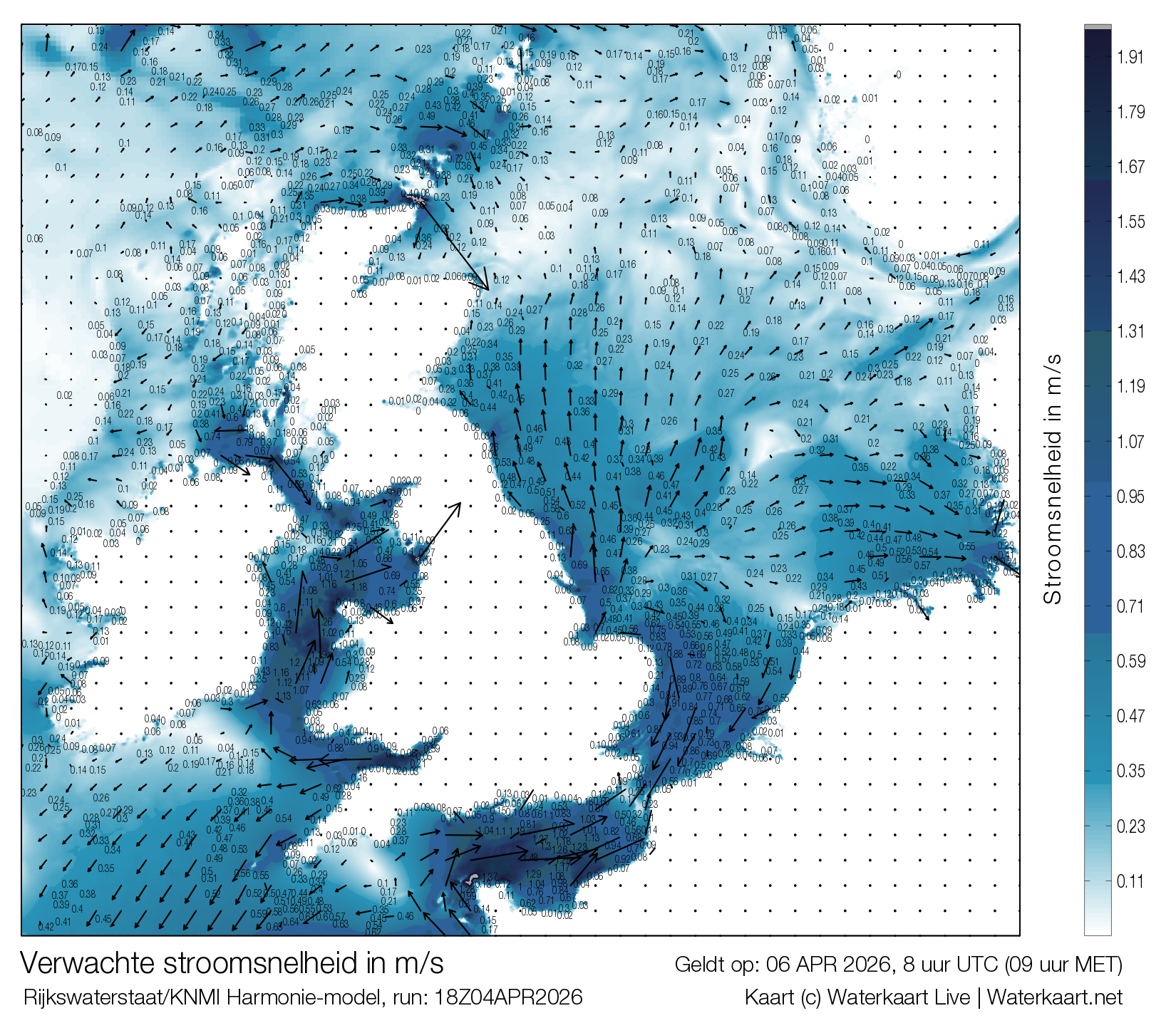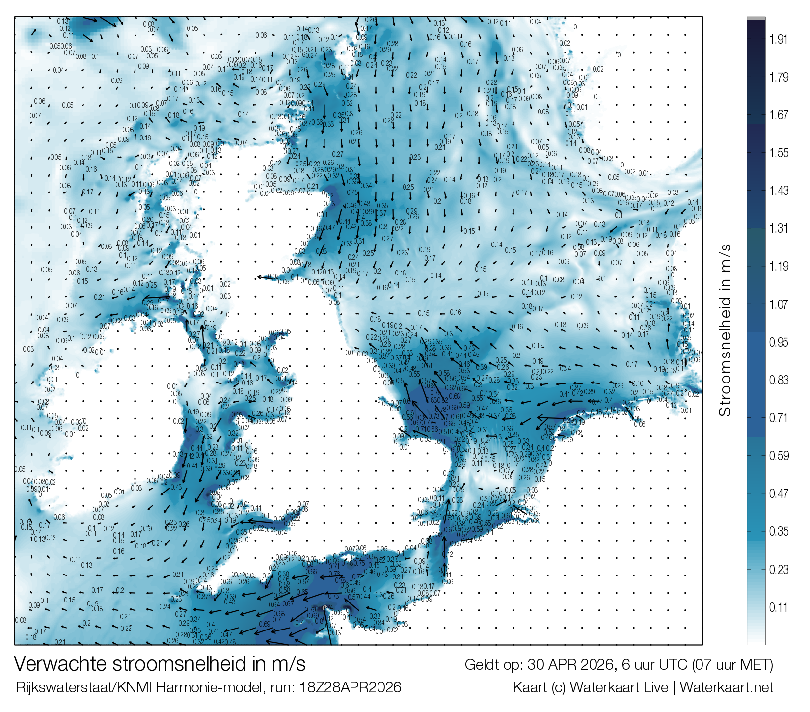 Stroomsnelheden in de Noordzee op basis van de Stroomatlas, verrekend met weersinvloeden. Deze worden iedere dag ververst met data uit het zeestromingen model van Rijkswaterstaat op basis van Harmonie weerdata, voor ieder uur een kaart, tot 48 uur in de toekomst. Lees hieronder meer over dit model