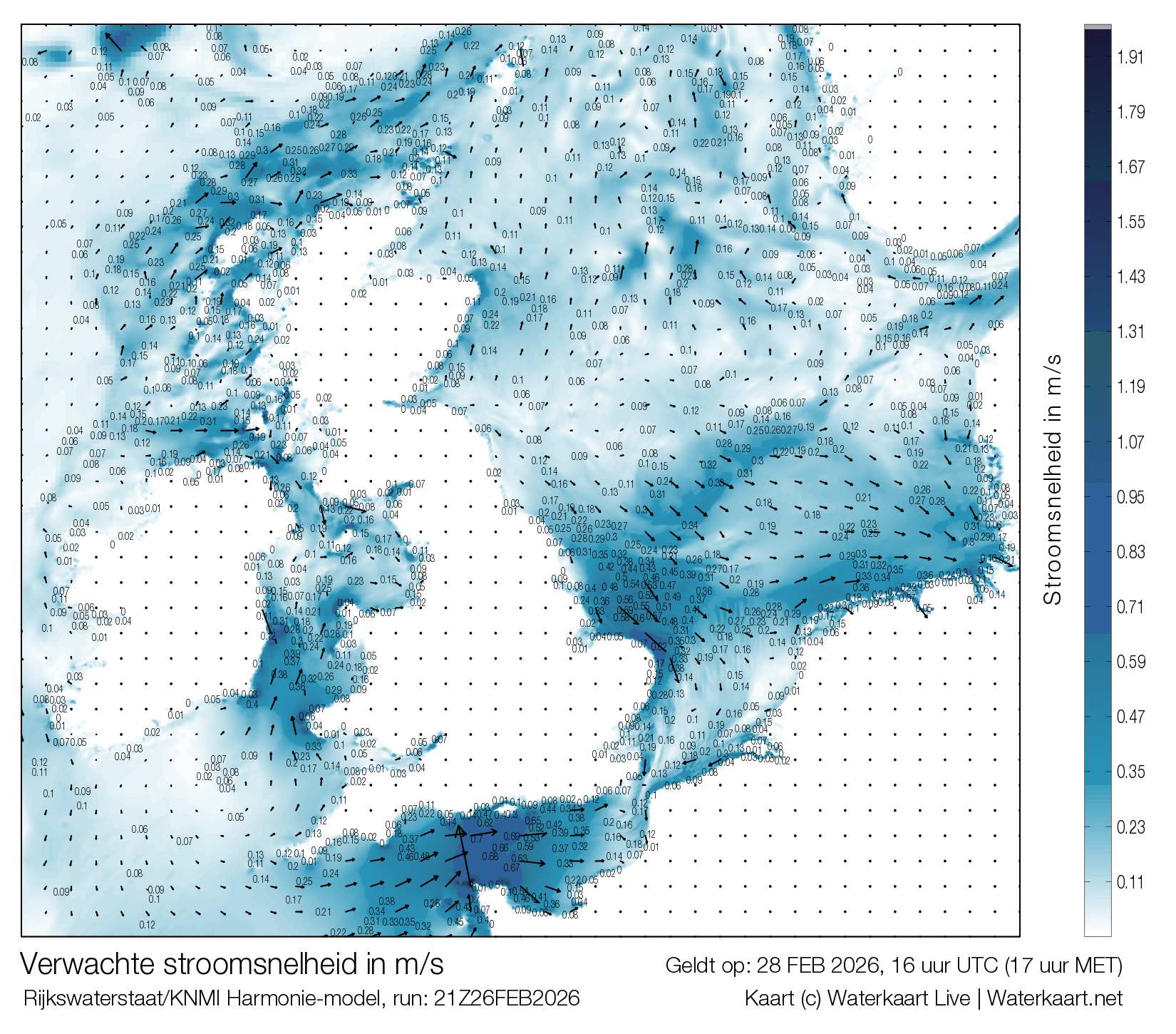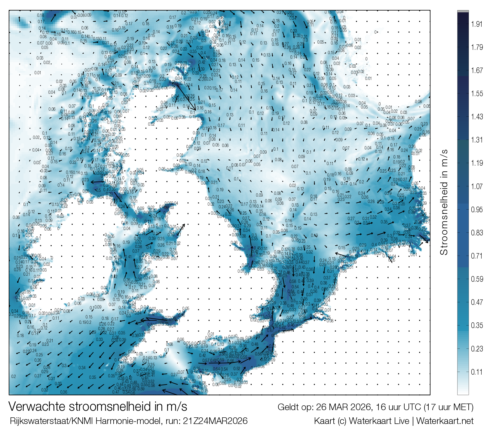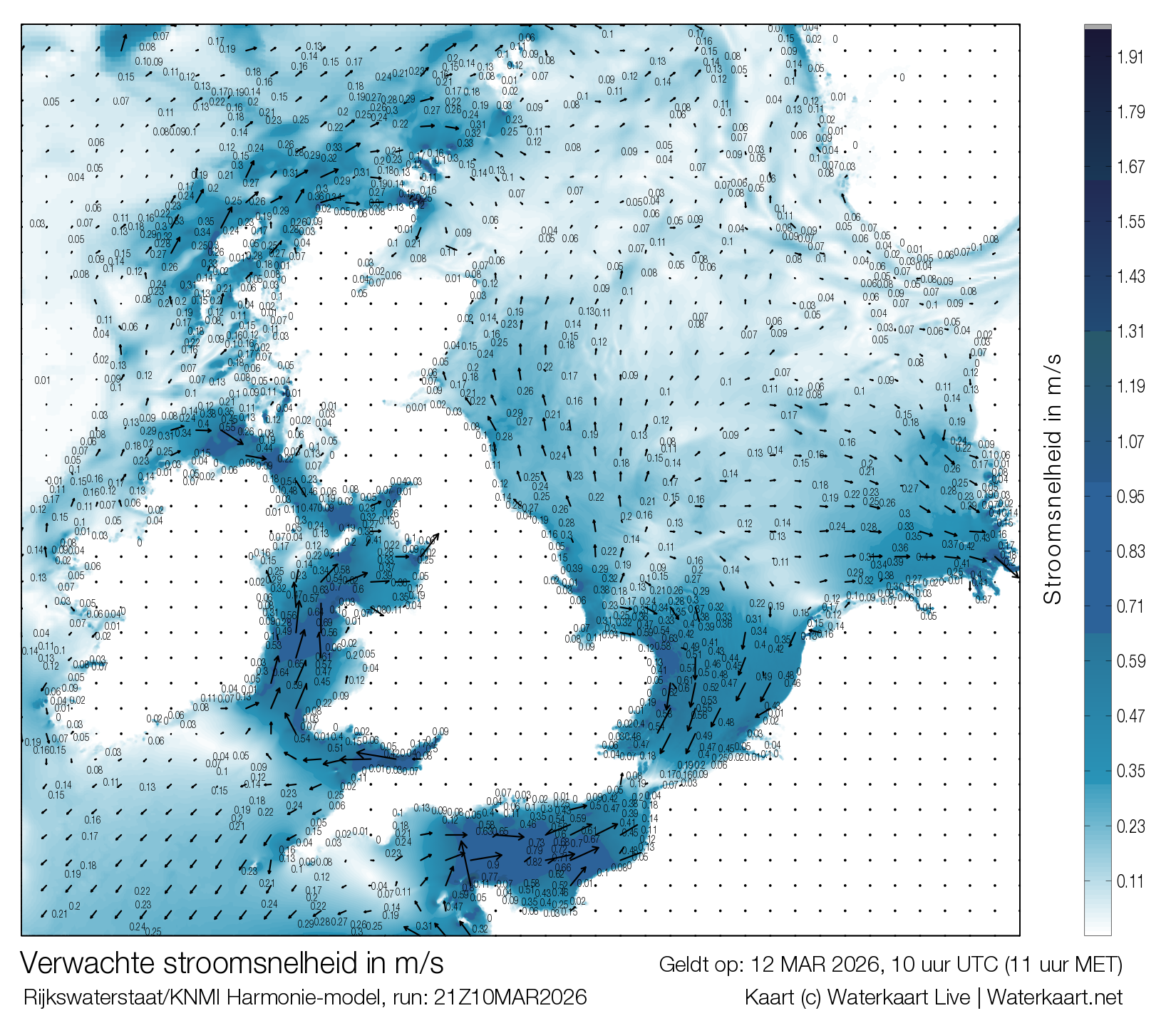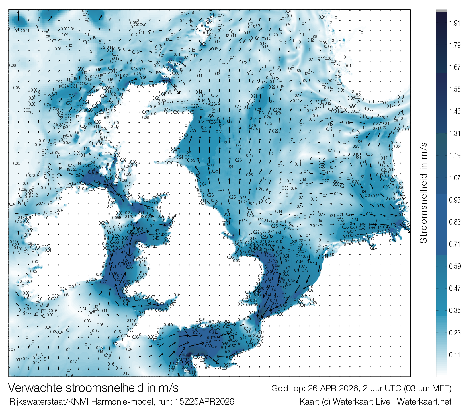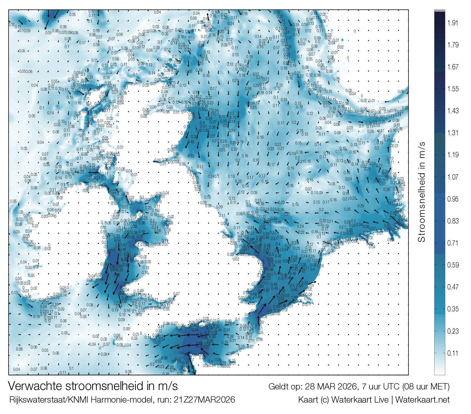 Stroomsnelheden in de Noordzee op basis van de Stroomatlas, verrekend met weersinvloeden. Deze worden iedere dag ververst met data uit het zeestromingen model van Rijkswaterstaat op basis van Harmonie weerdata, voor ieder uur een kaart, tot 48 uur in de toekomst. Lees hieronder meer over dit model