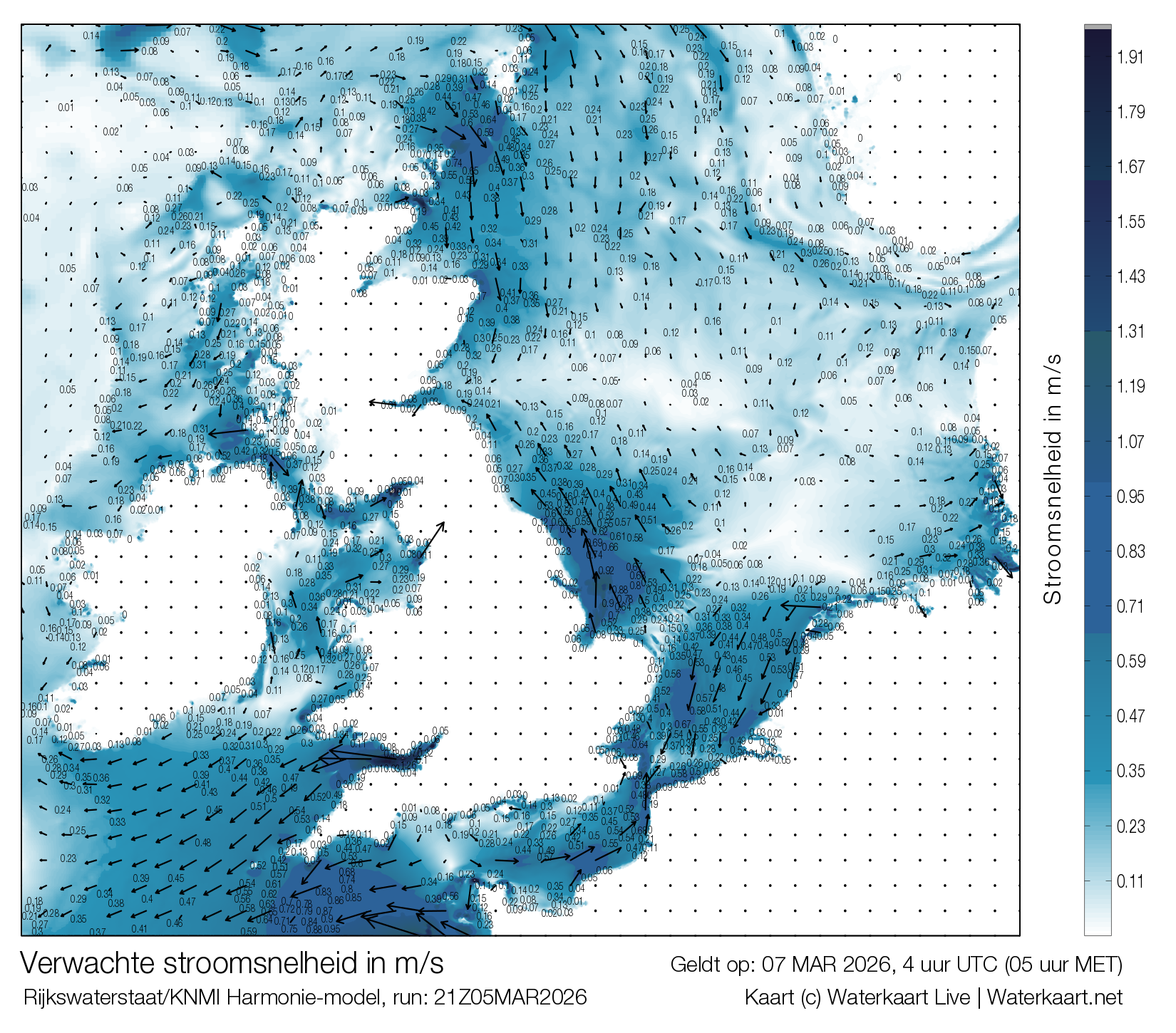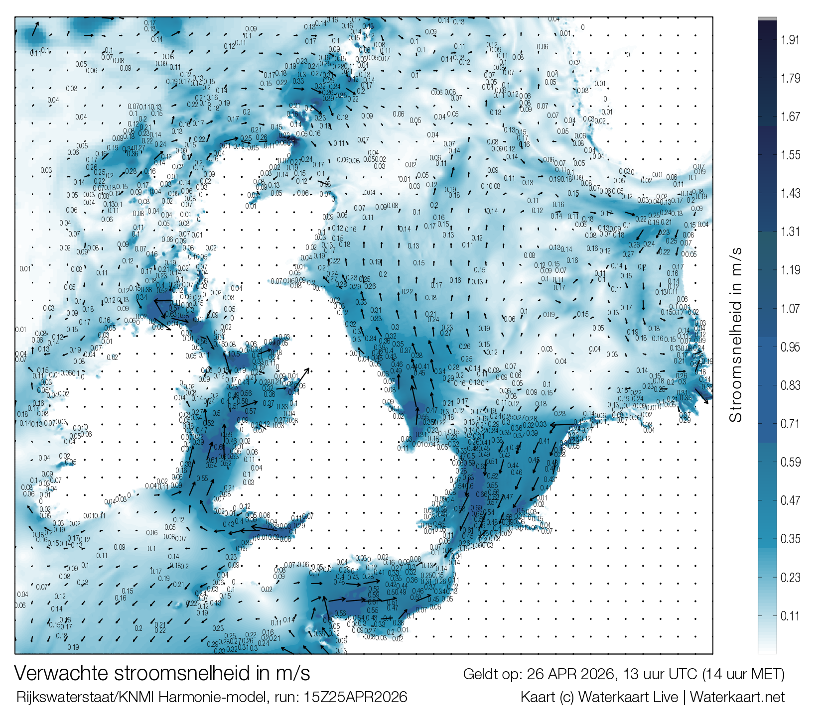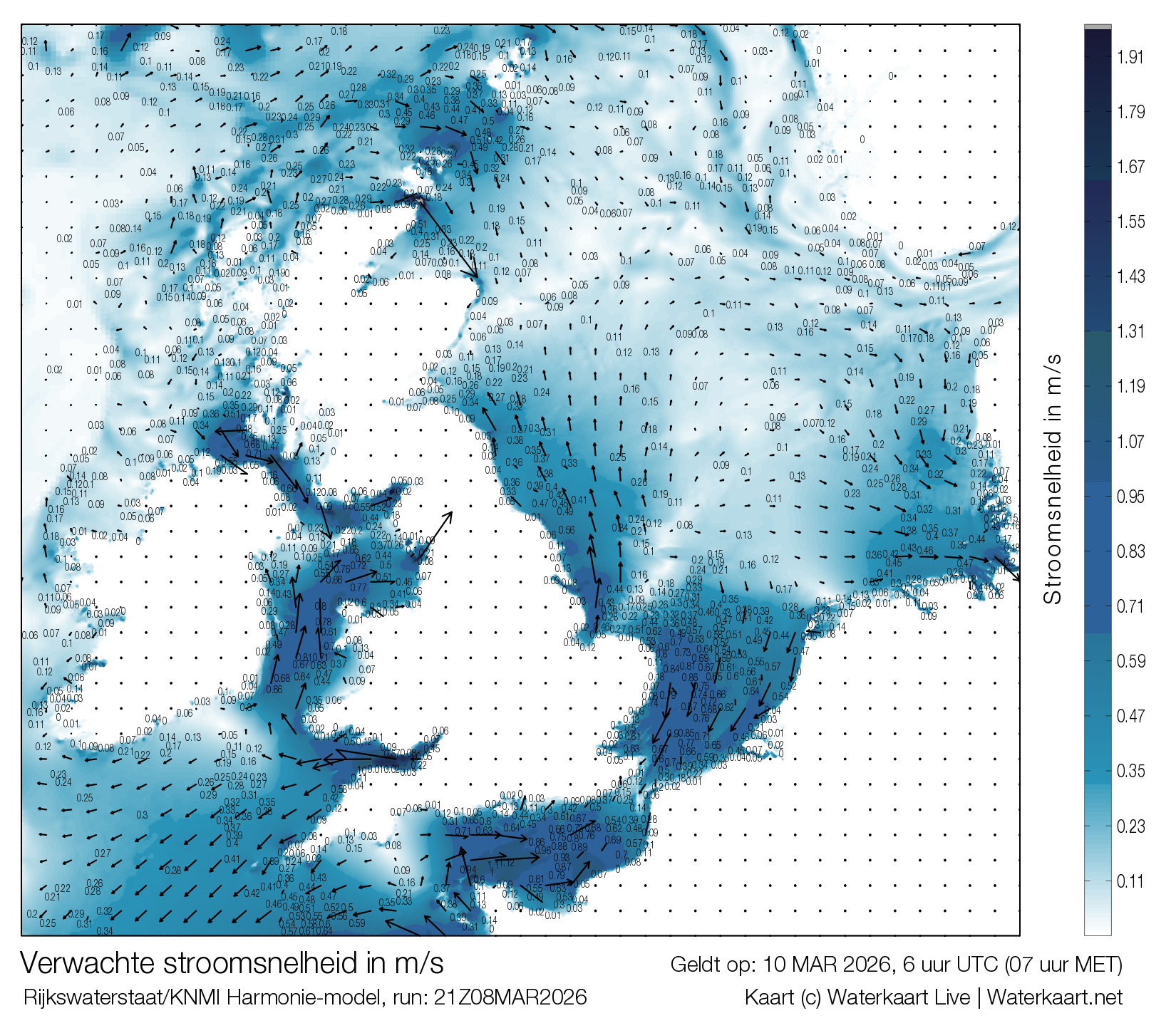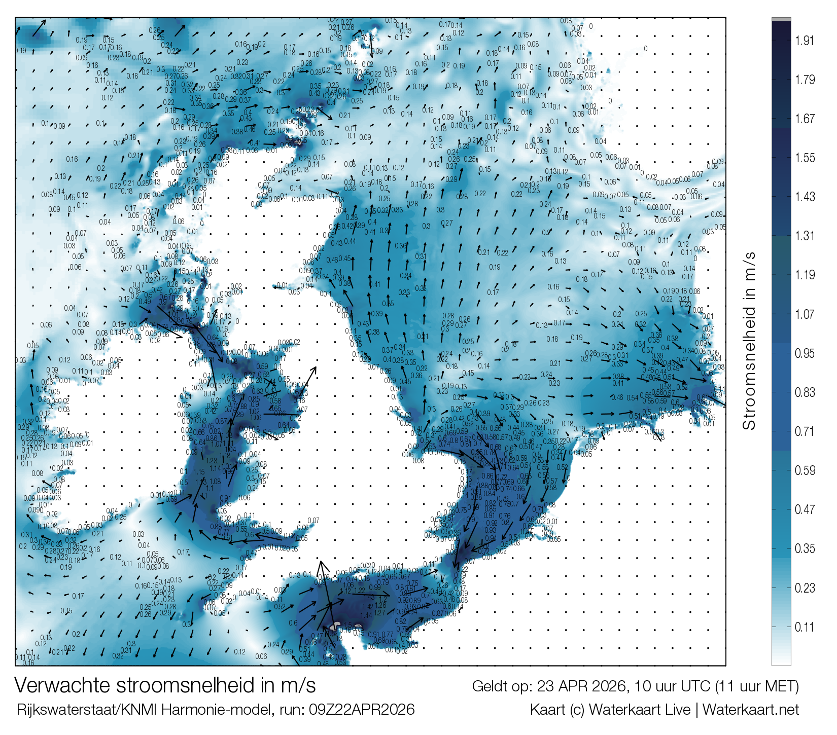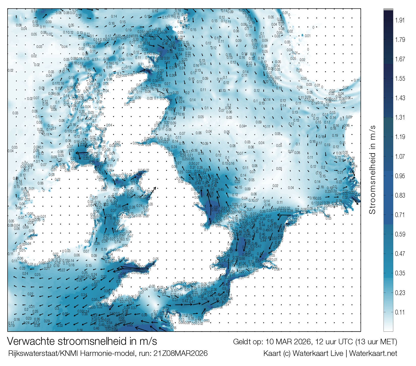 Stroomsnelheden in de Noordzee op basis van de Stroomatlas, verrekend met weersinvloeden. Deze worden iedere dag ververst met data uit het zeestromingen model van Rijkswaterstaat op basis van Harmonie weerdata, voor ieder uur een kaart, tot 48 uur in de toekomst. Lees hieronder meer over dit model
