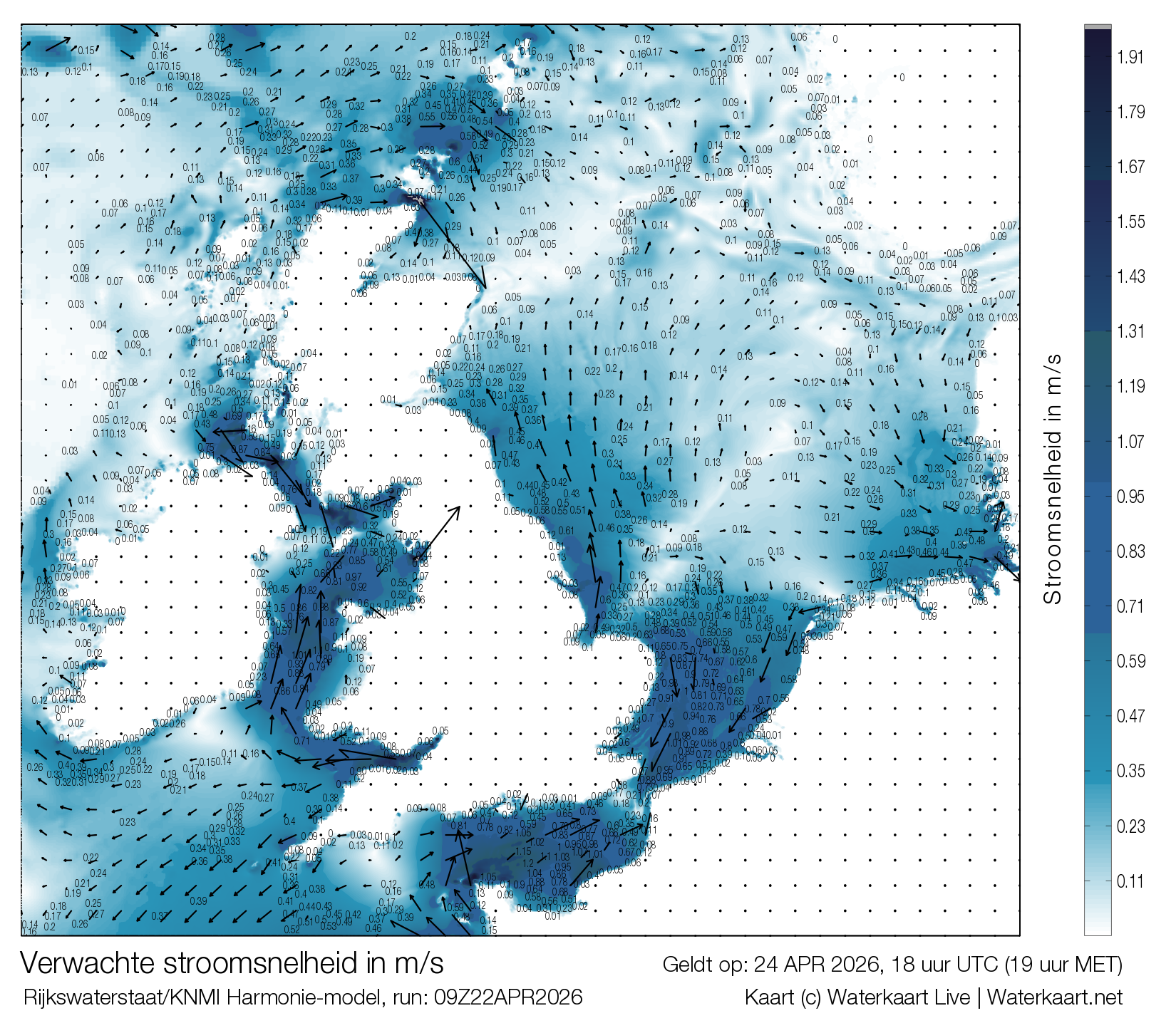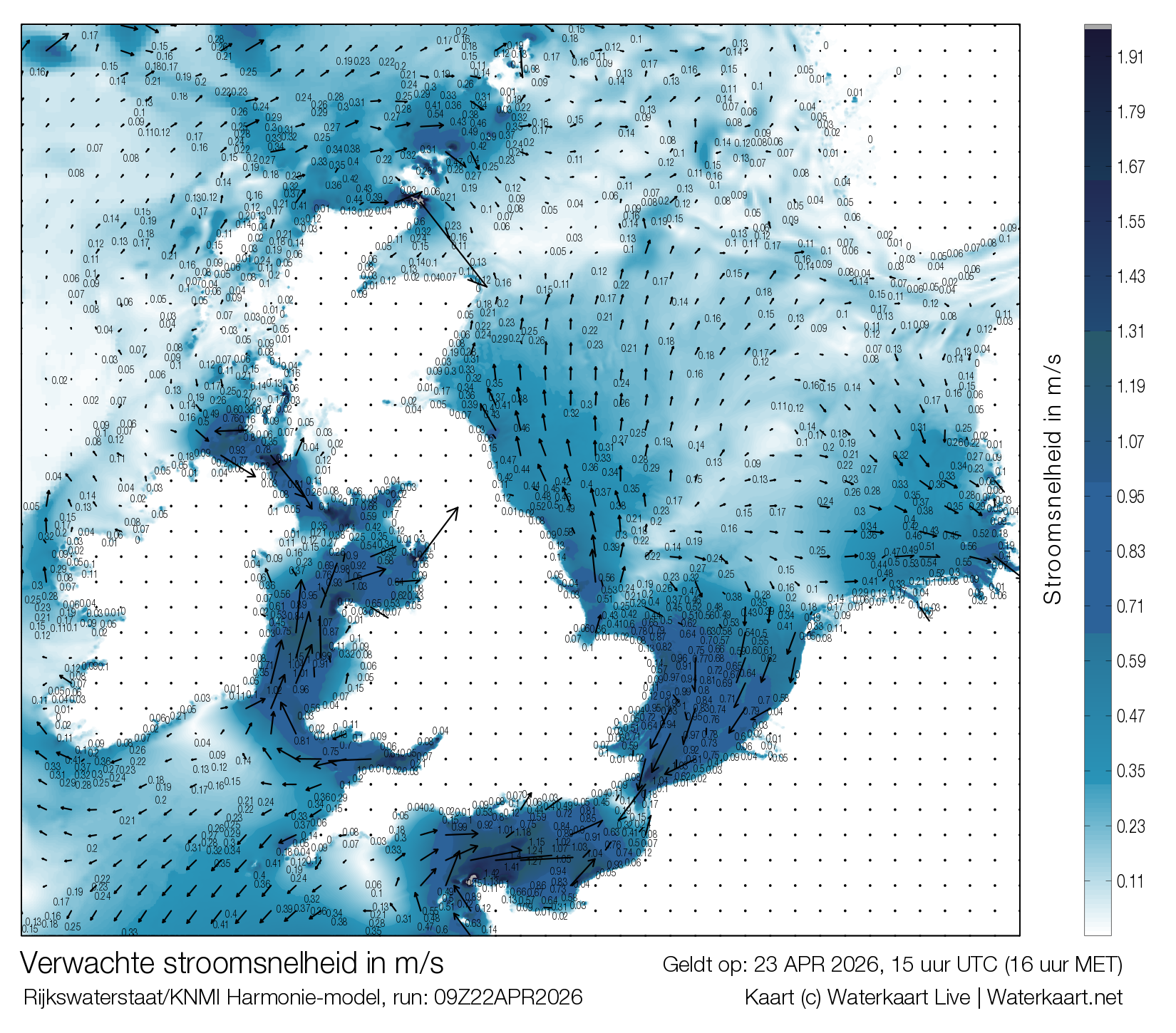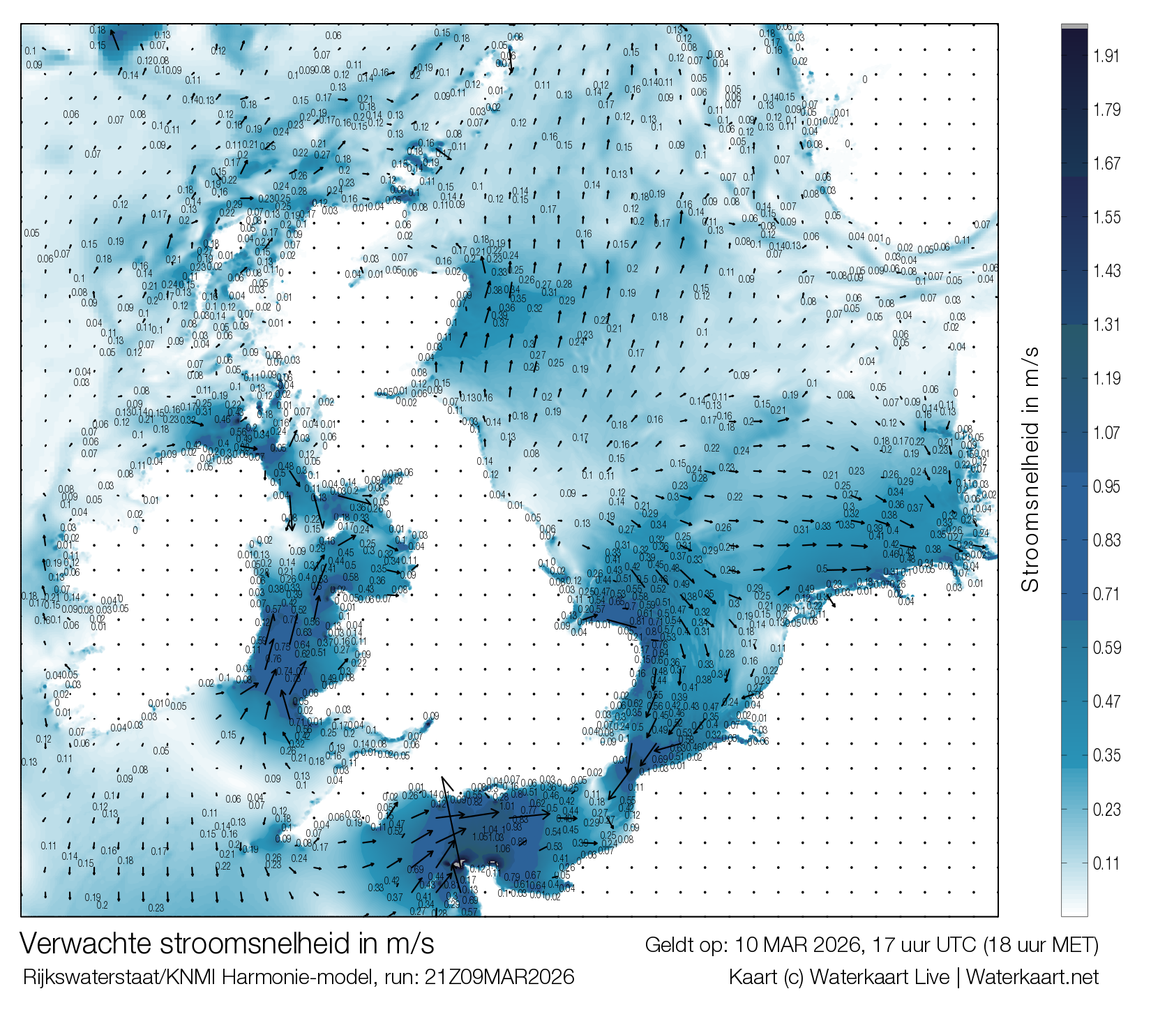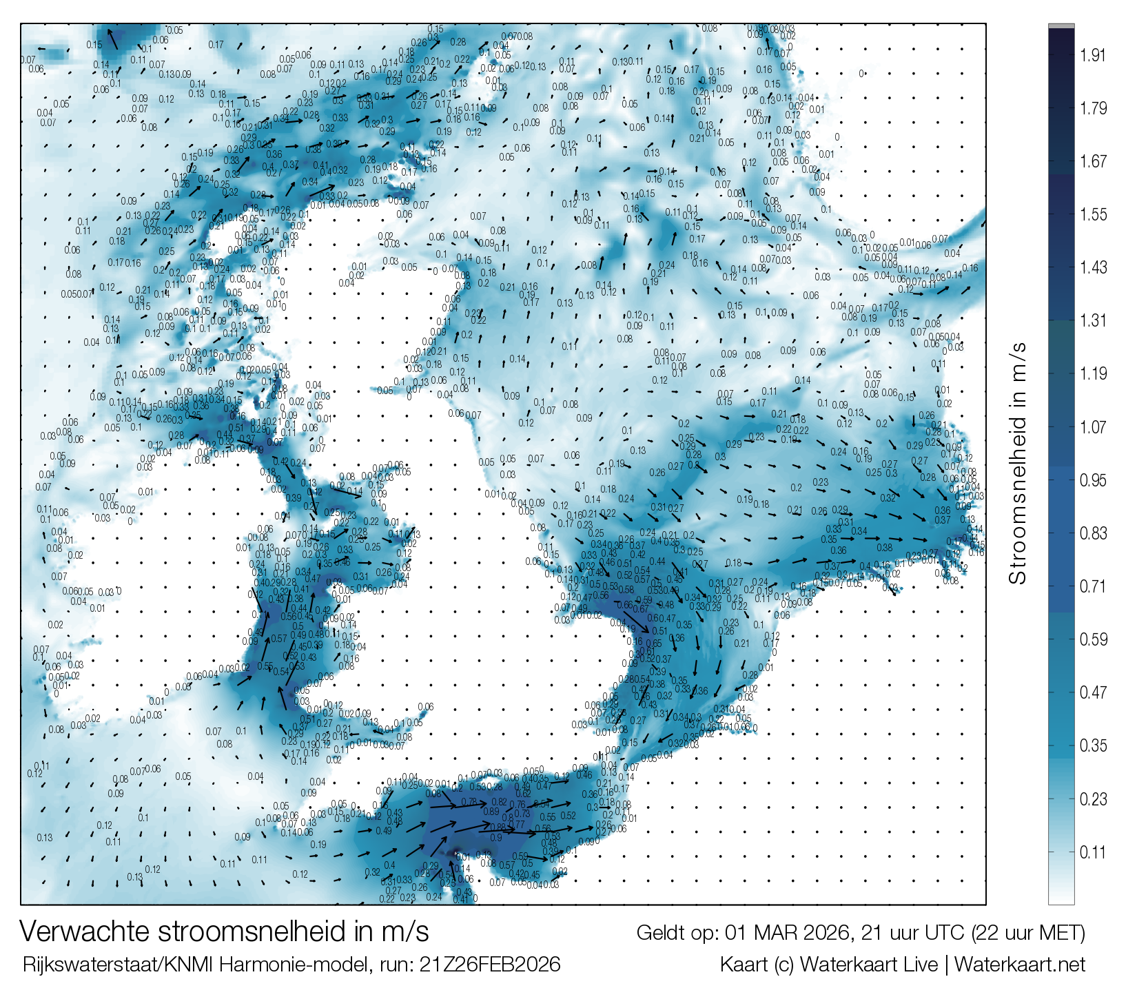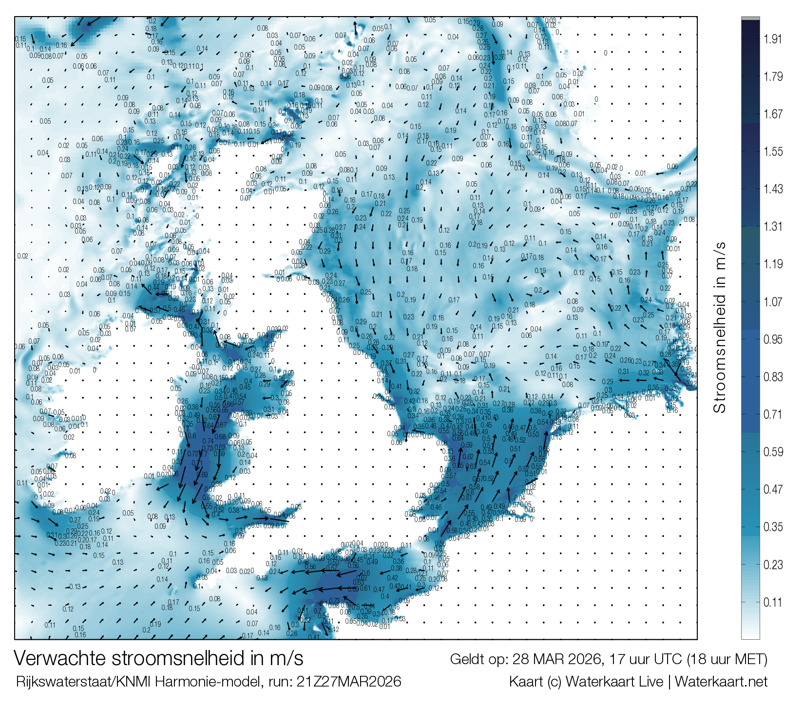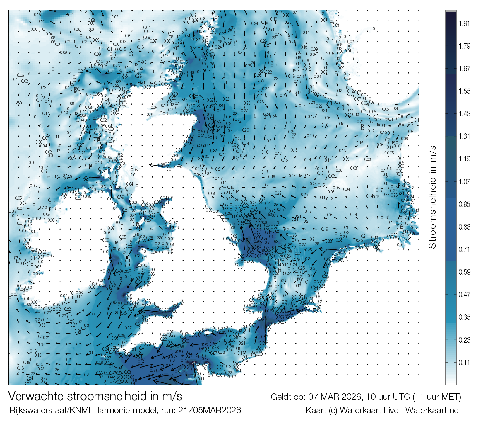 Stroomsnelheden in de Noordzee op basis van de Stroomatlas, verrekend met weersinvloeden. Deze worden iedere dag ververst met data uit het zeestromingen model van Rijkswaterstaat op basis van Harmonie weerdata, voor ieder uur een kaart, tot 48 uur in de toekomst. Lees hieronder meer over dit model