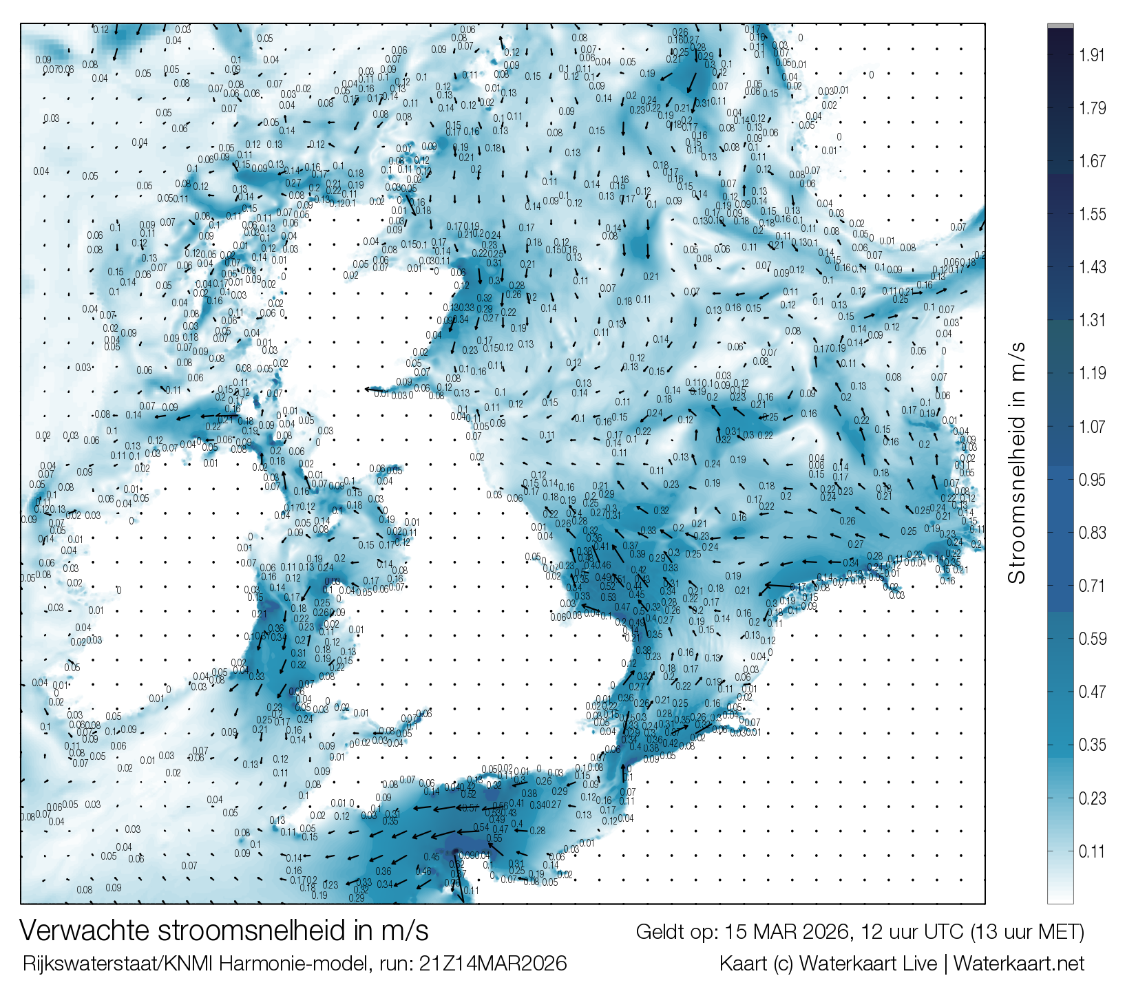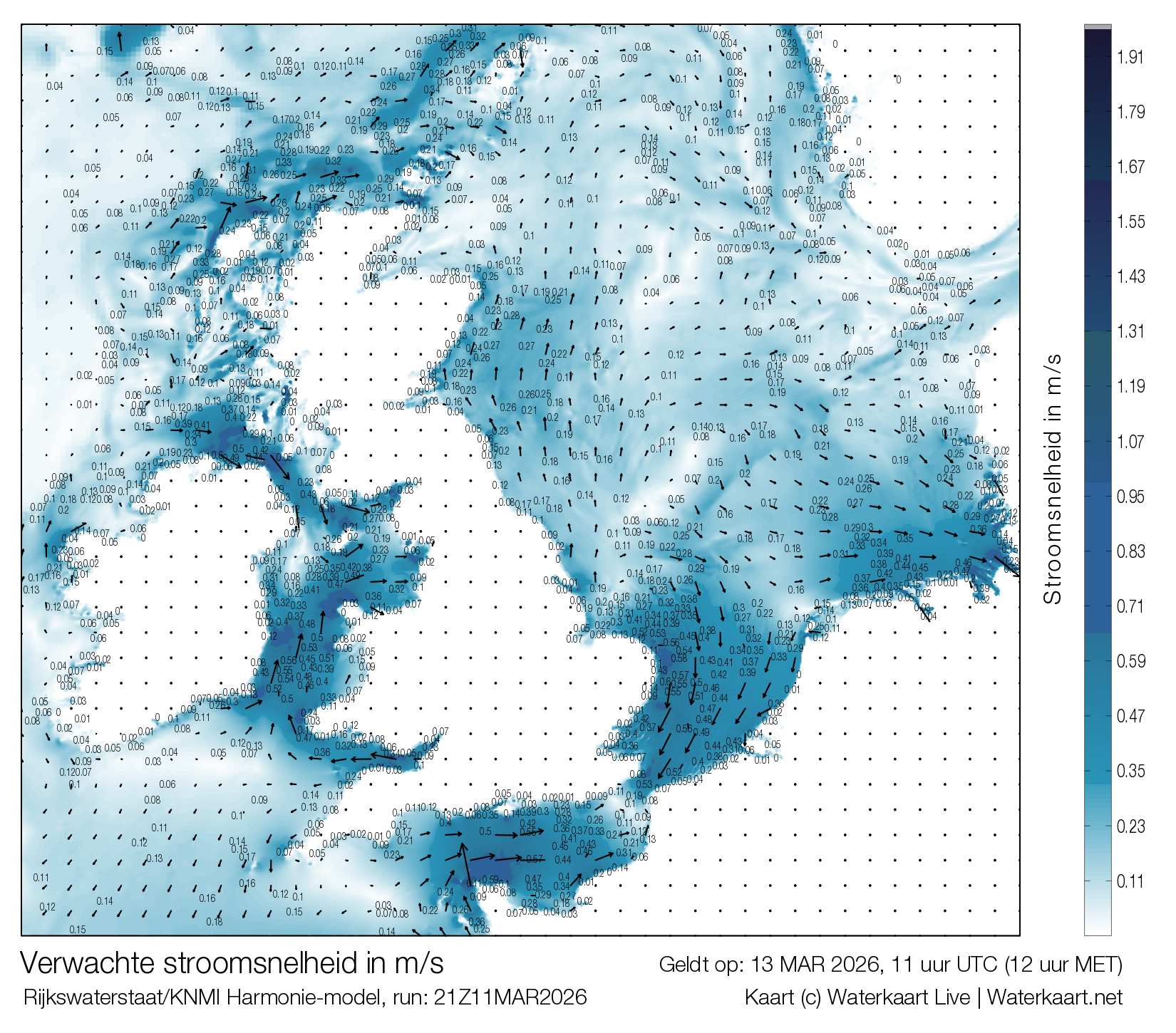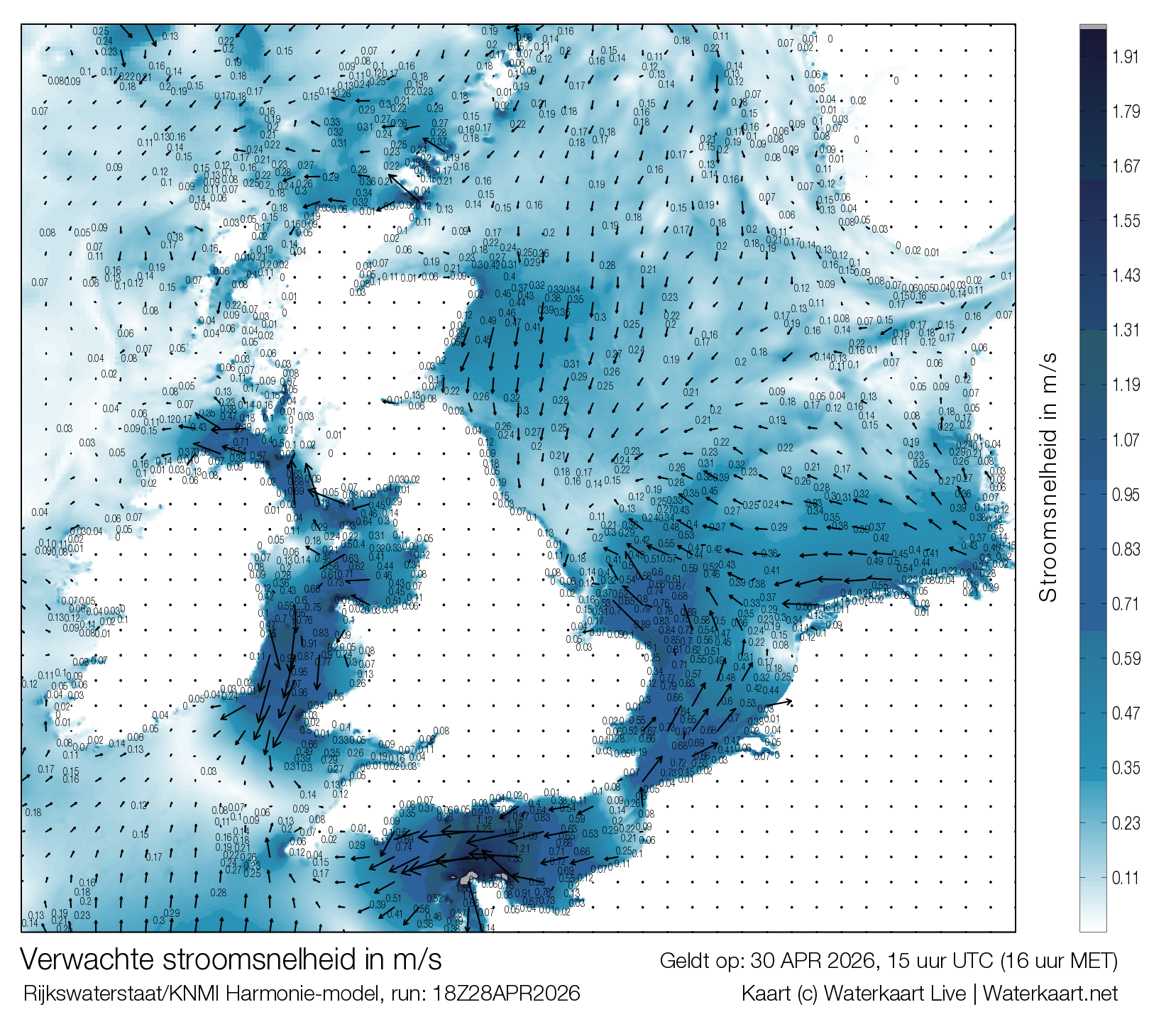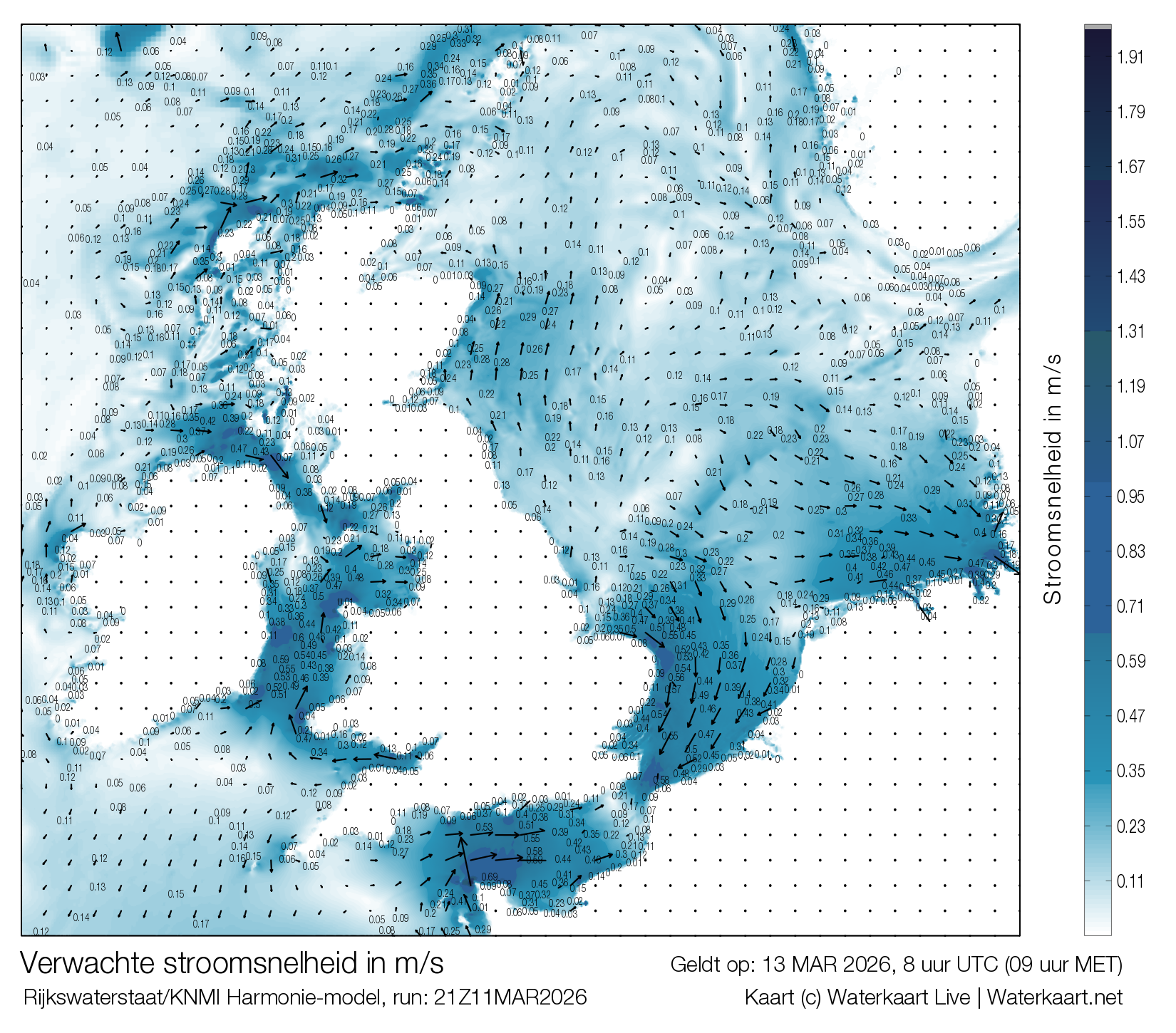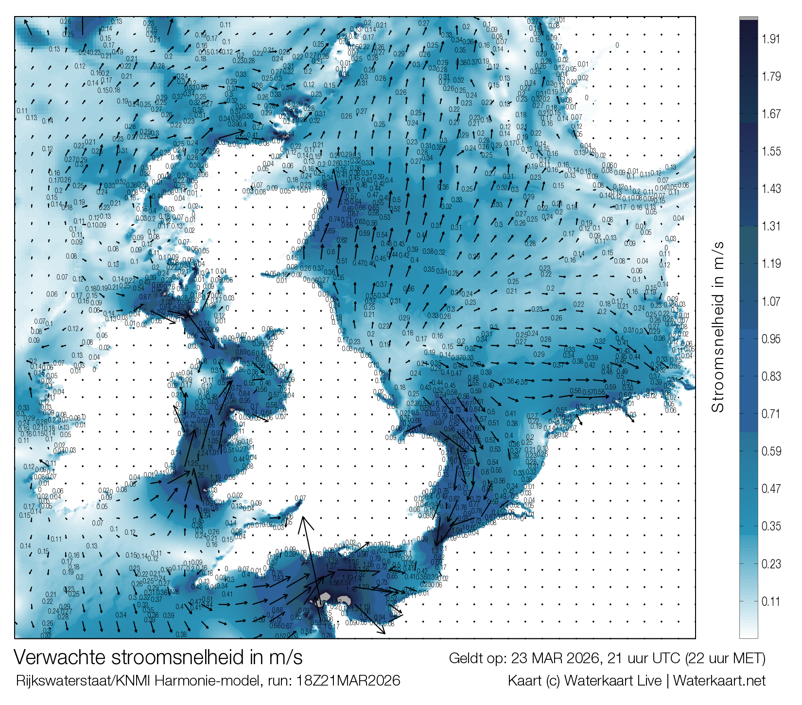 Stroomsnelheden in de Noordzee op basis van de Stroomatlas, verrekend met weersinvloeden. Deze worden iedere dag ververst met data uit het zeestromingen model van Rijkswaterstaat op basis van Harmonie weerdata, voor ieder uur een kaart, tot 48 uur in de toekomst. Lees hieronder meer over dit model