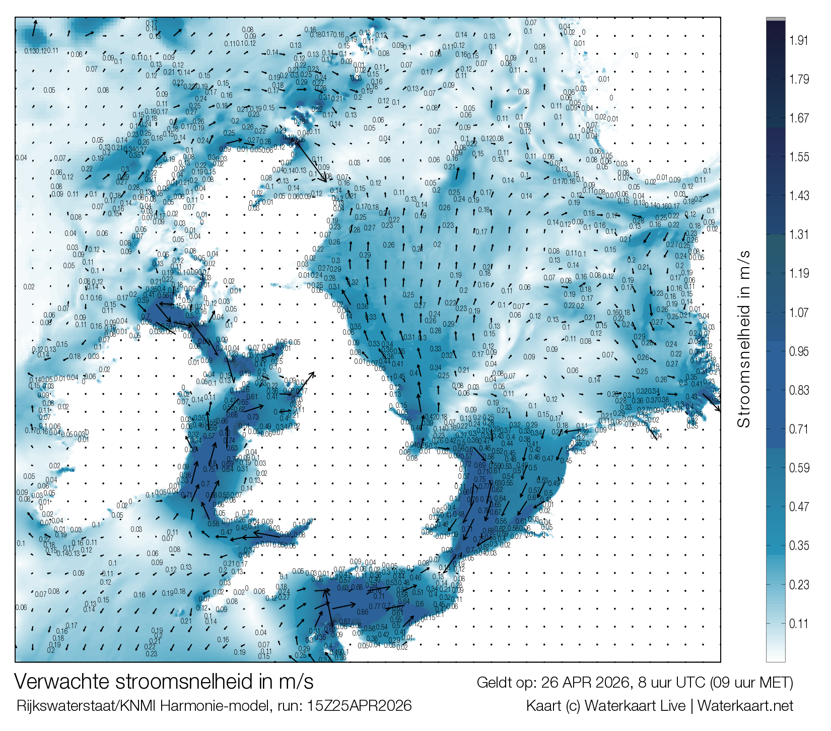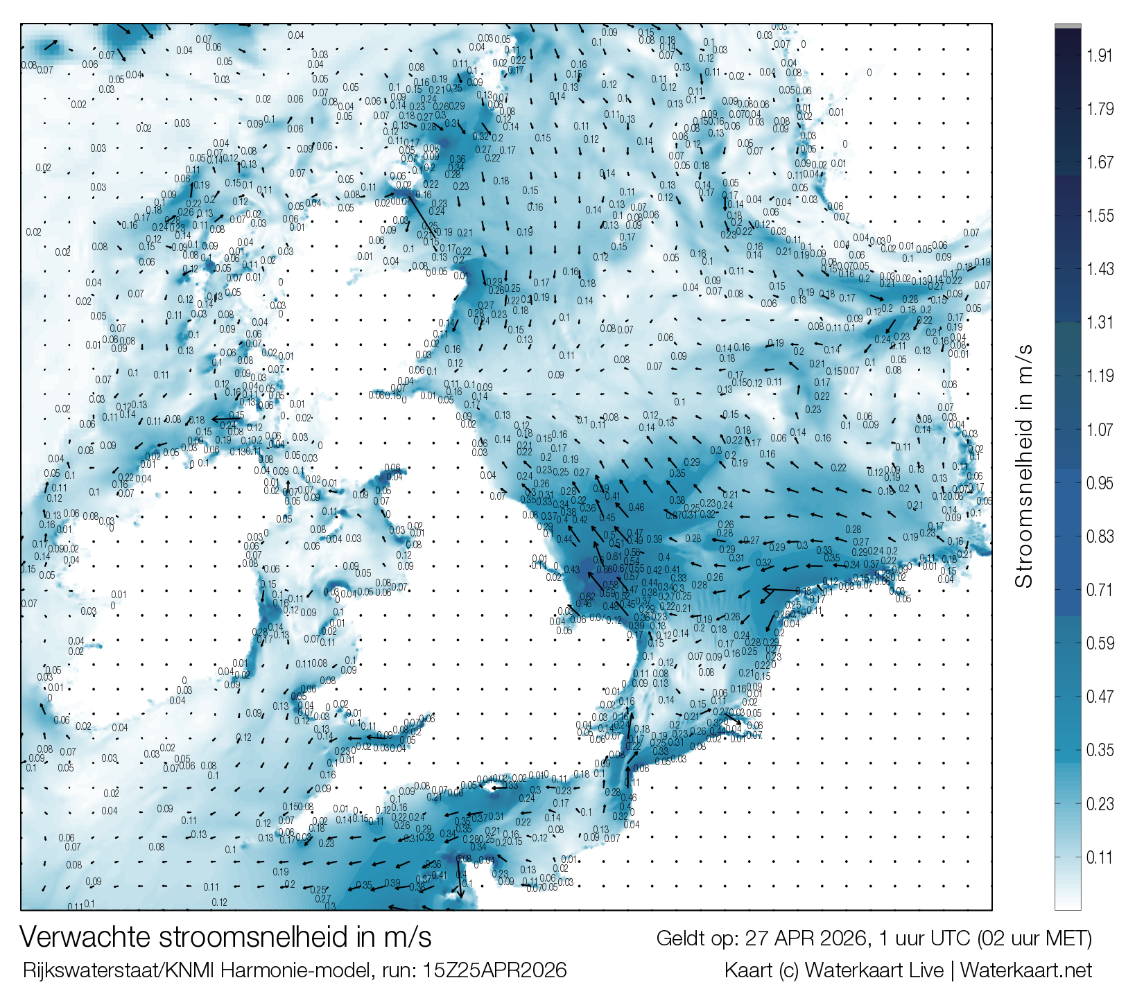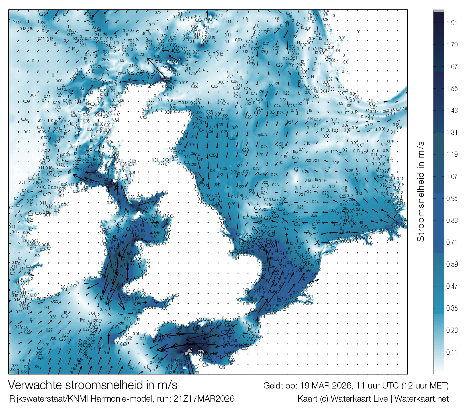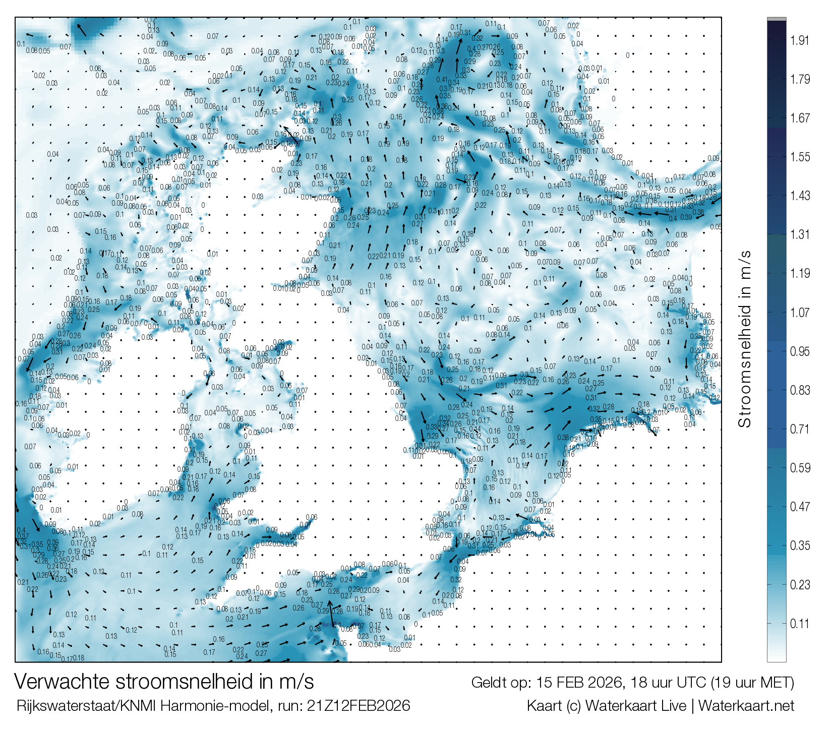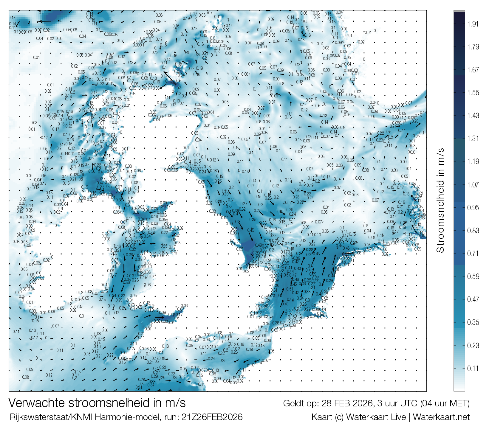 Stroomsnelheden in de Noordzee op basis van de Stroomatlas, verrekend met weersinvloeden. Deze worden iedere dag ververst met data uit het zeestromingen model van Rijkswaterstaat op basis van Harmonie weerdata, voor ieder uur een kaart, tot 48 uur in de toekomst. Lees hieronder meer over dit model