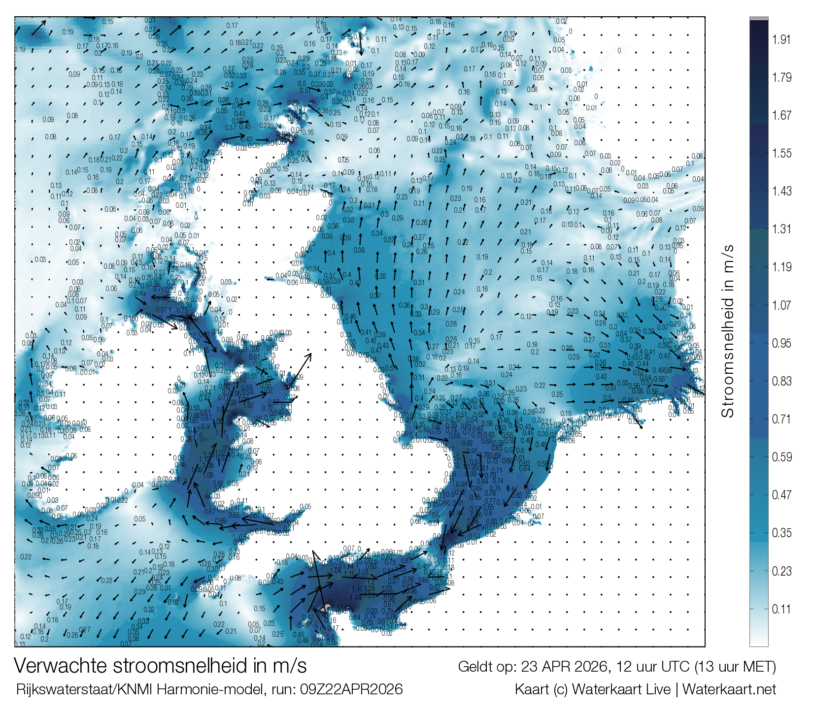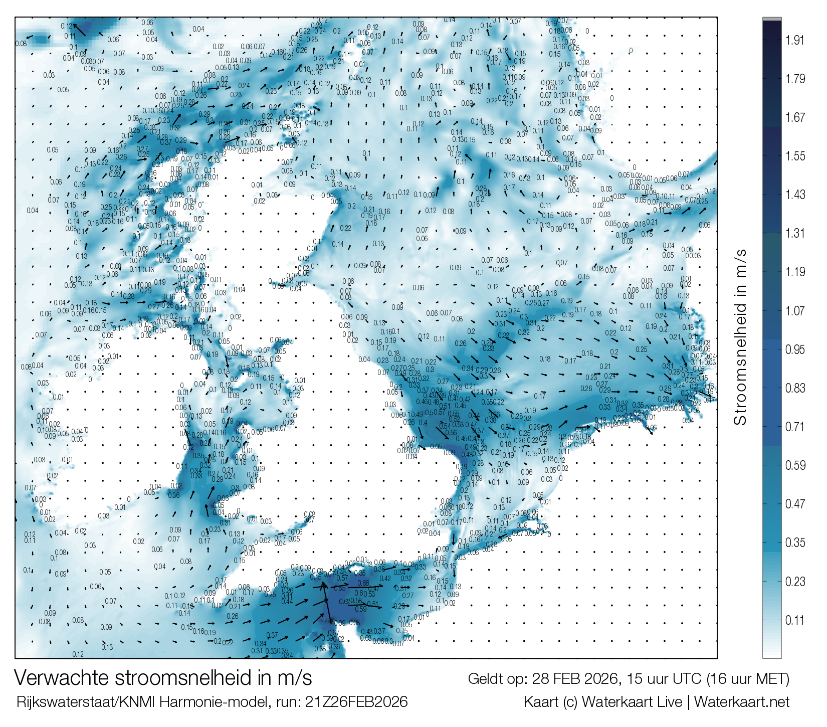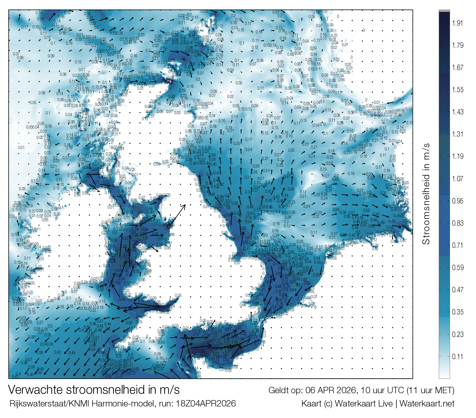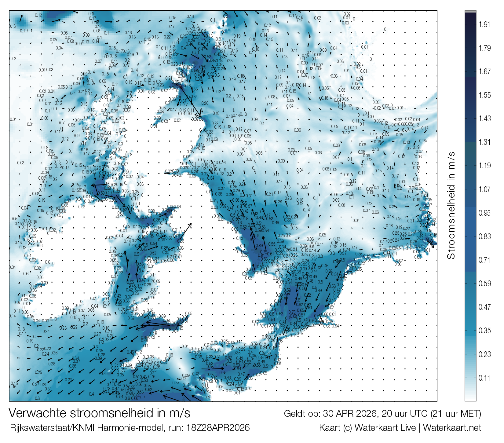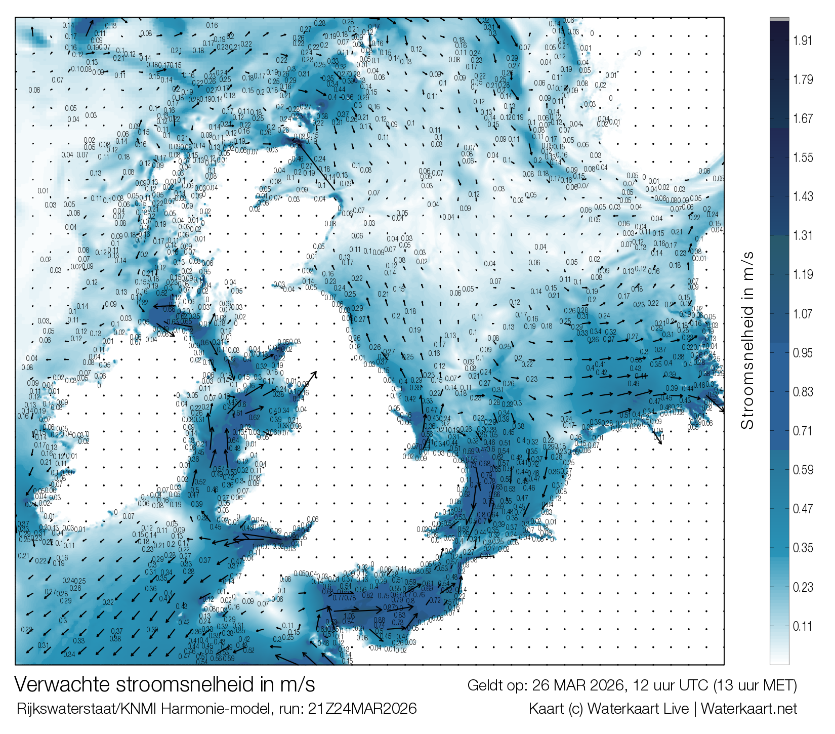Stroomsnelheden in de Noordzee op basis van de Stroomatlas, verrekend met weersinvloeden. Deze worden iedere dag ververst met data uit het zeestromingen model van Rijkswaterstaat op basis van Harmonie weerdata, voor ieder uur een kaart, tot 48 uur in de toekomst. Lees hieronder meer over dit model