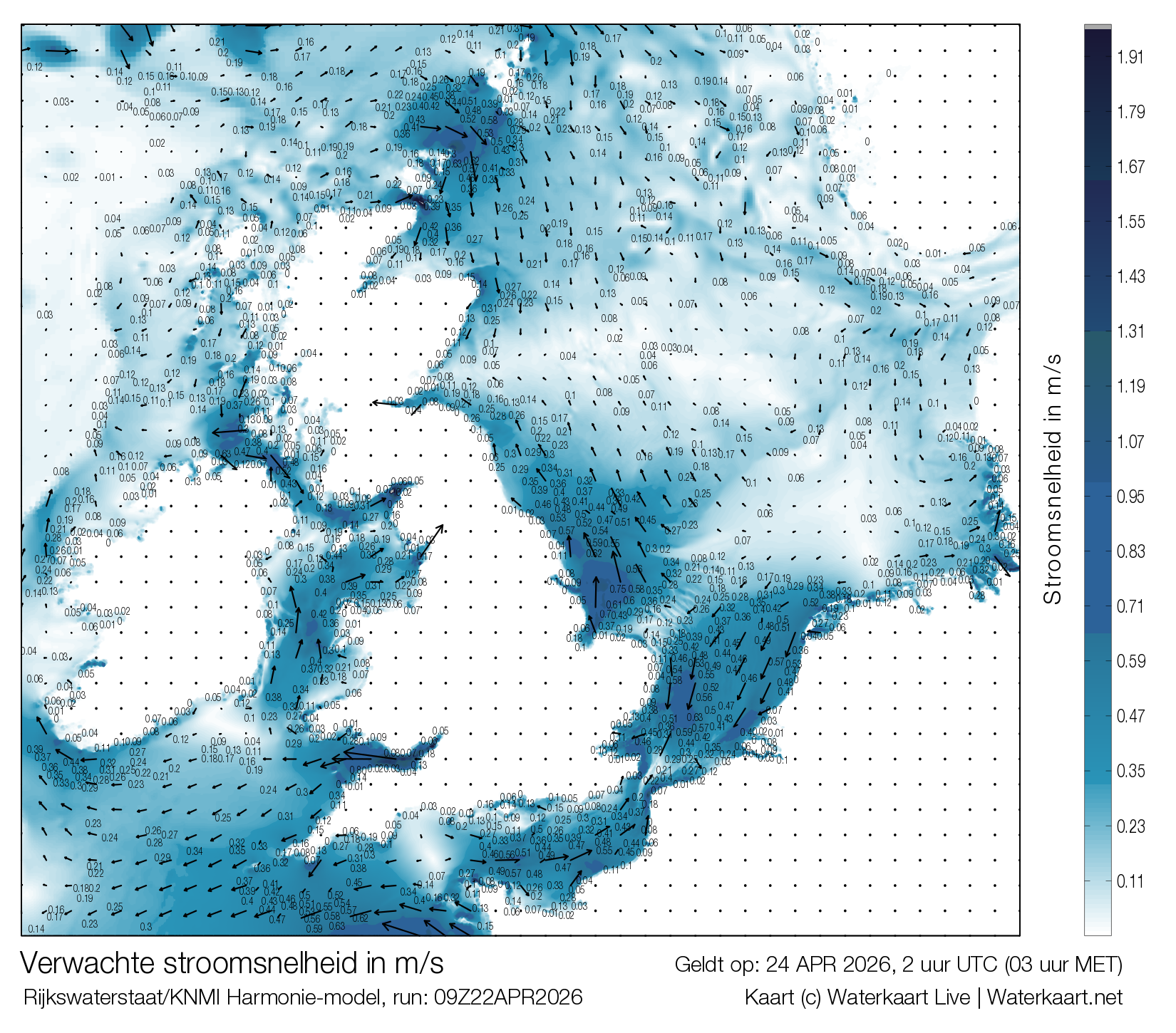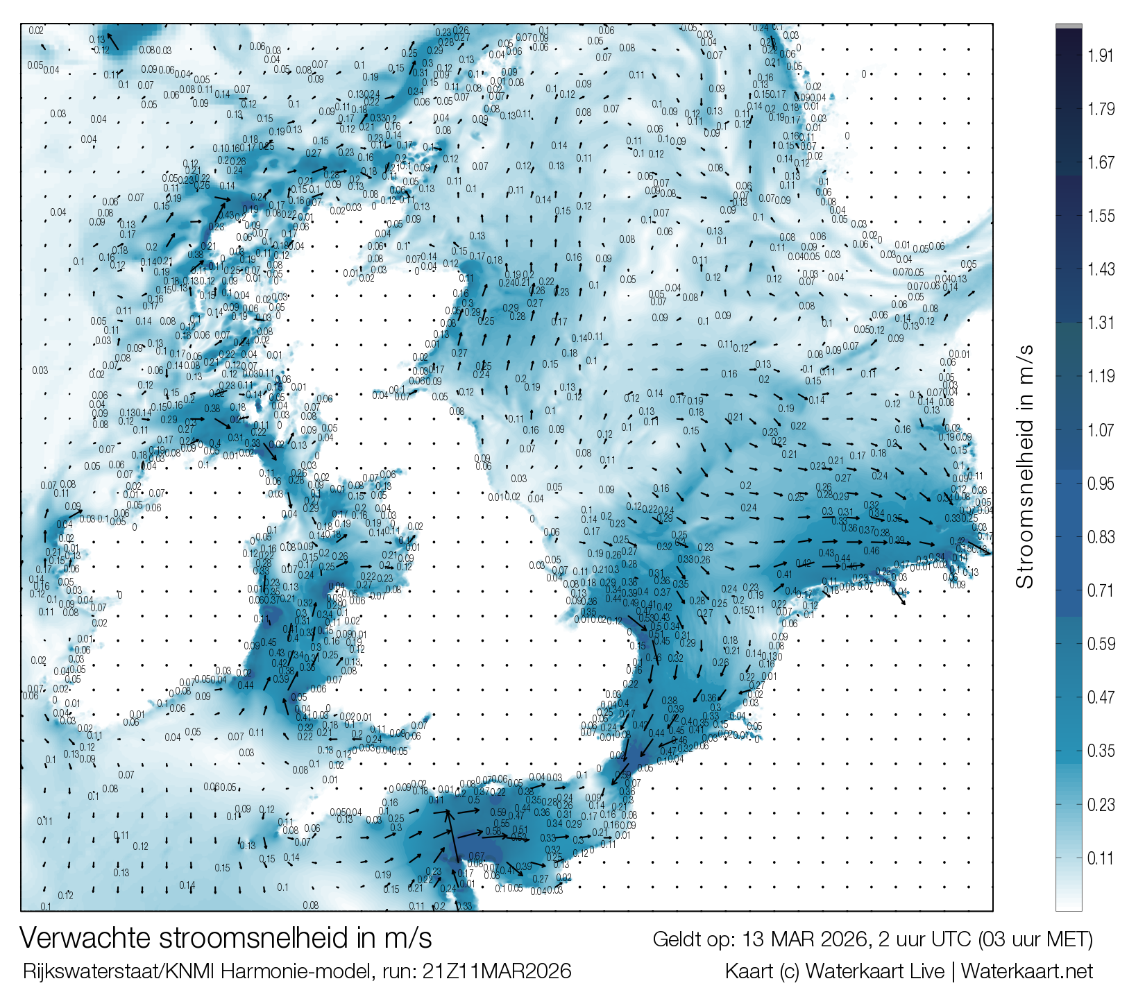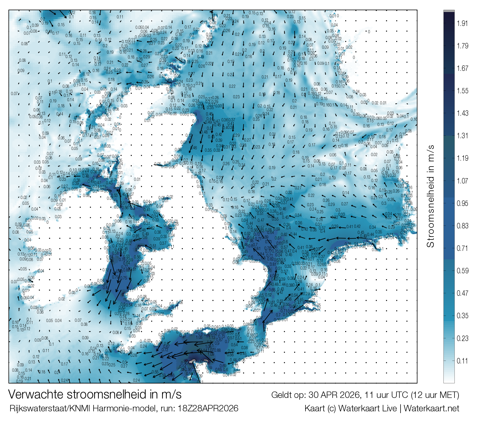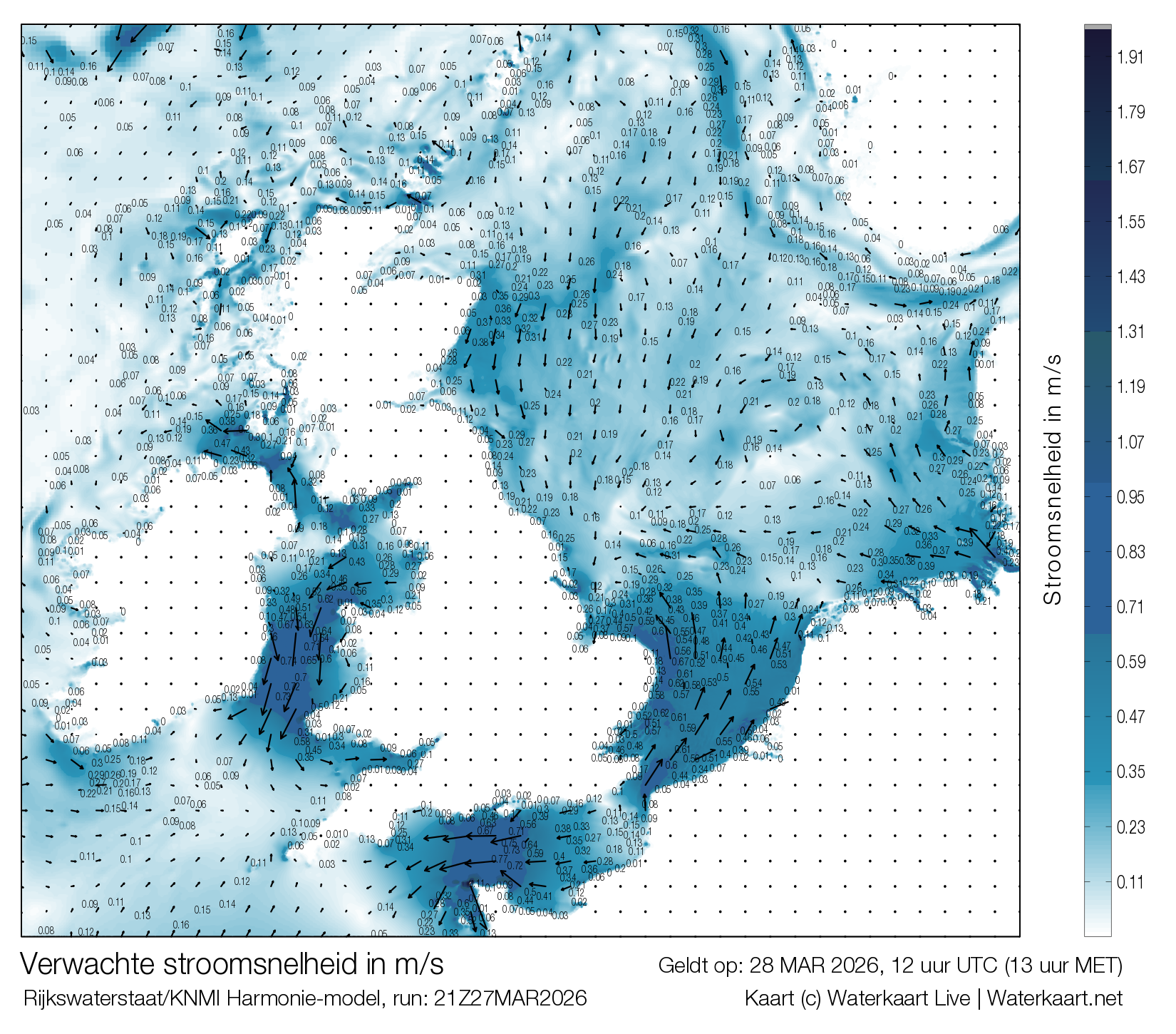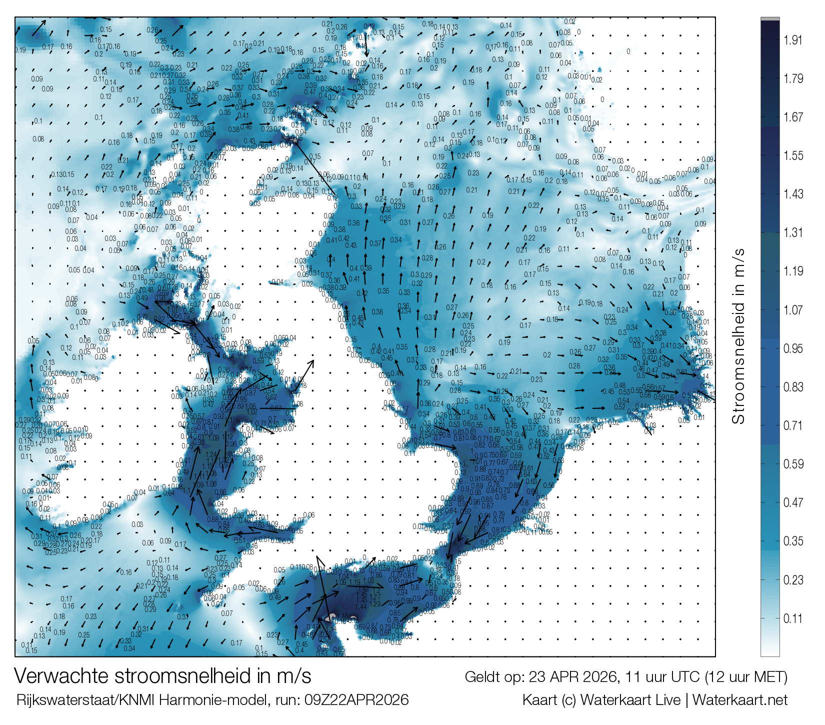Stroomsnelheden in de Noordzee op basis van de Stroomatlas, verrekend met weersinvloeden. Deze worden iedere dag ververst met data uit het zeestromingen model van Rijkswaterstaat op basis van Harmonie weerdata, voor ieder uur een kaart, tot 48 uur in de toekomst. Lees hieronder meer over dit model
