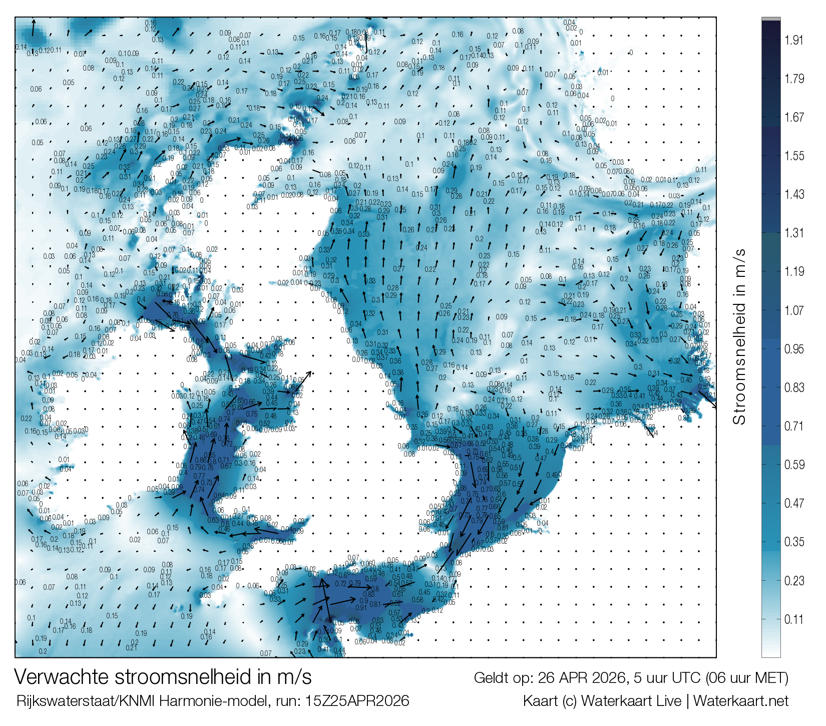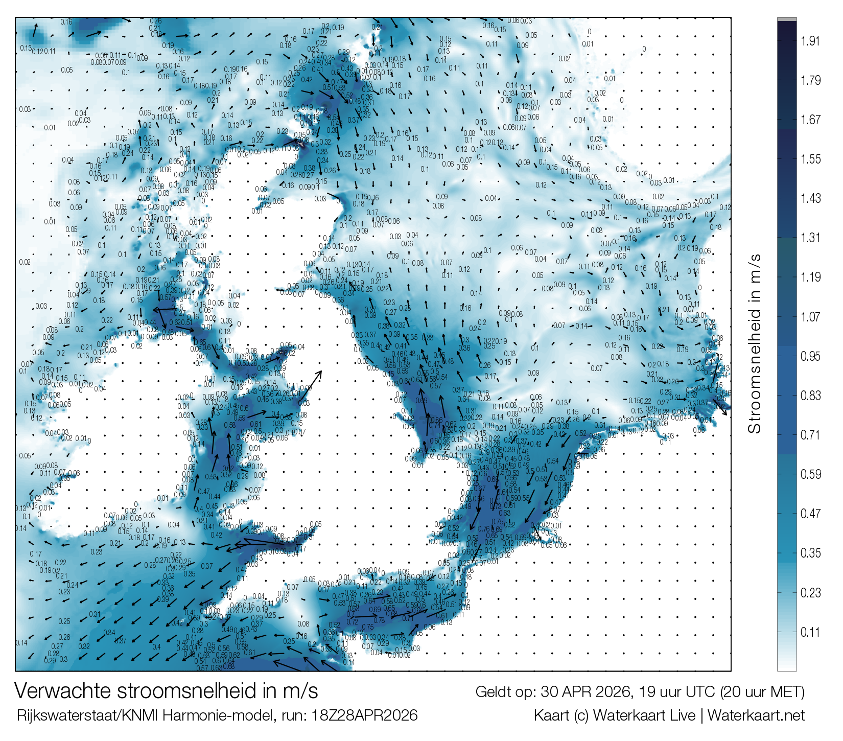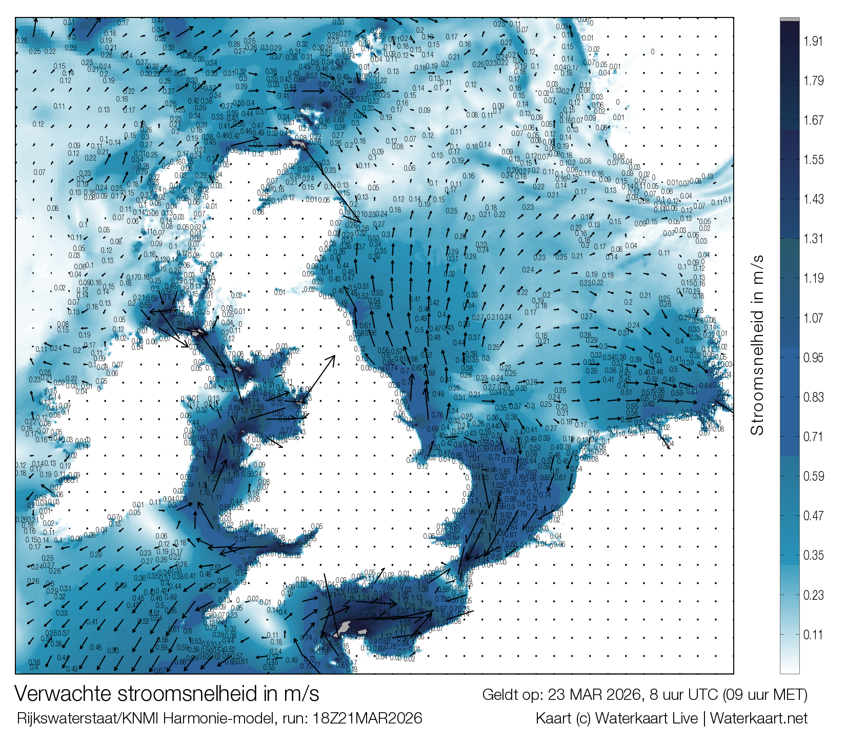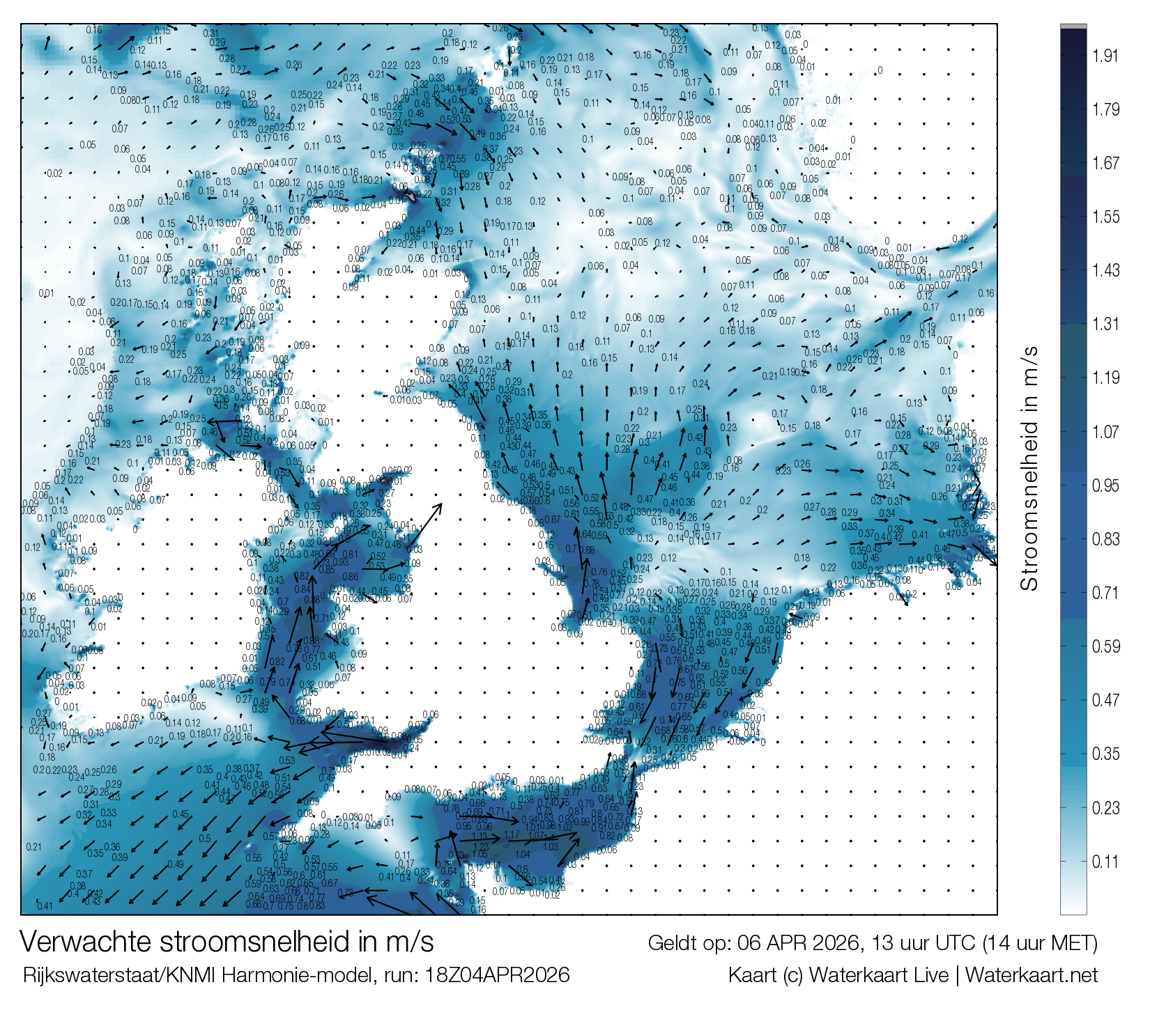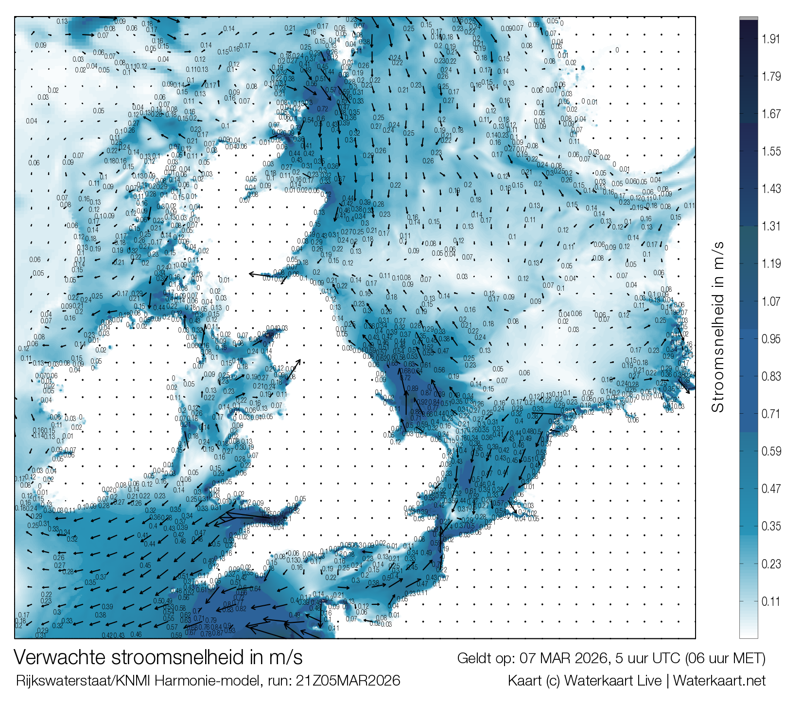 Stroomsnelheden in de Noordzee op basis van de Stroomatlas, verrekend met weersinvloeden. Deze worden iedere dag ververst met data uit het zeestromingen model van Rijkswaterstaat op basis van Harmonie weerdata, voor ieder uur een kaart, tot 48 uur in de toekomst. Lees hieronder meer over dit model