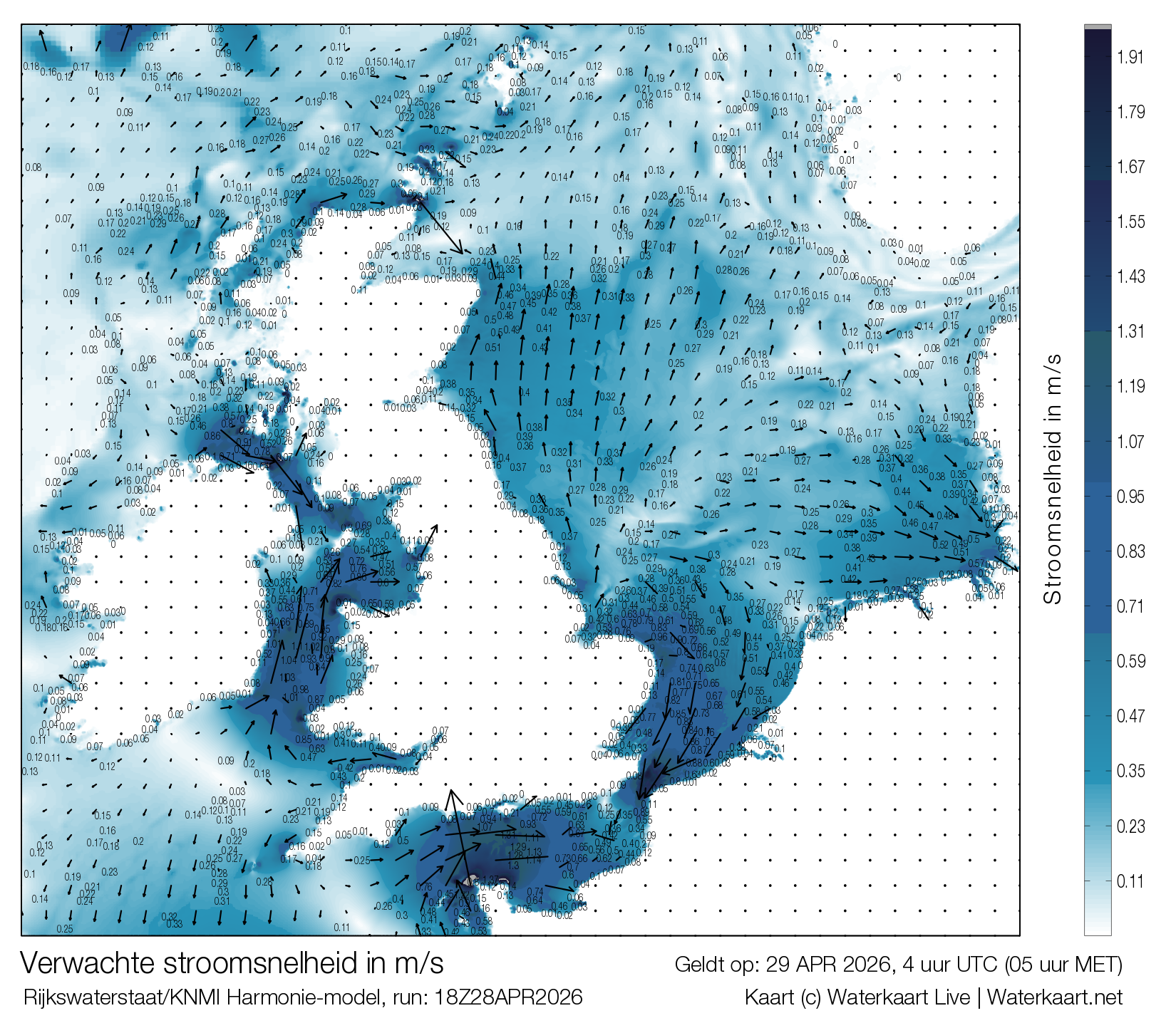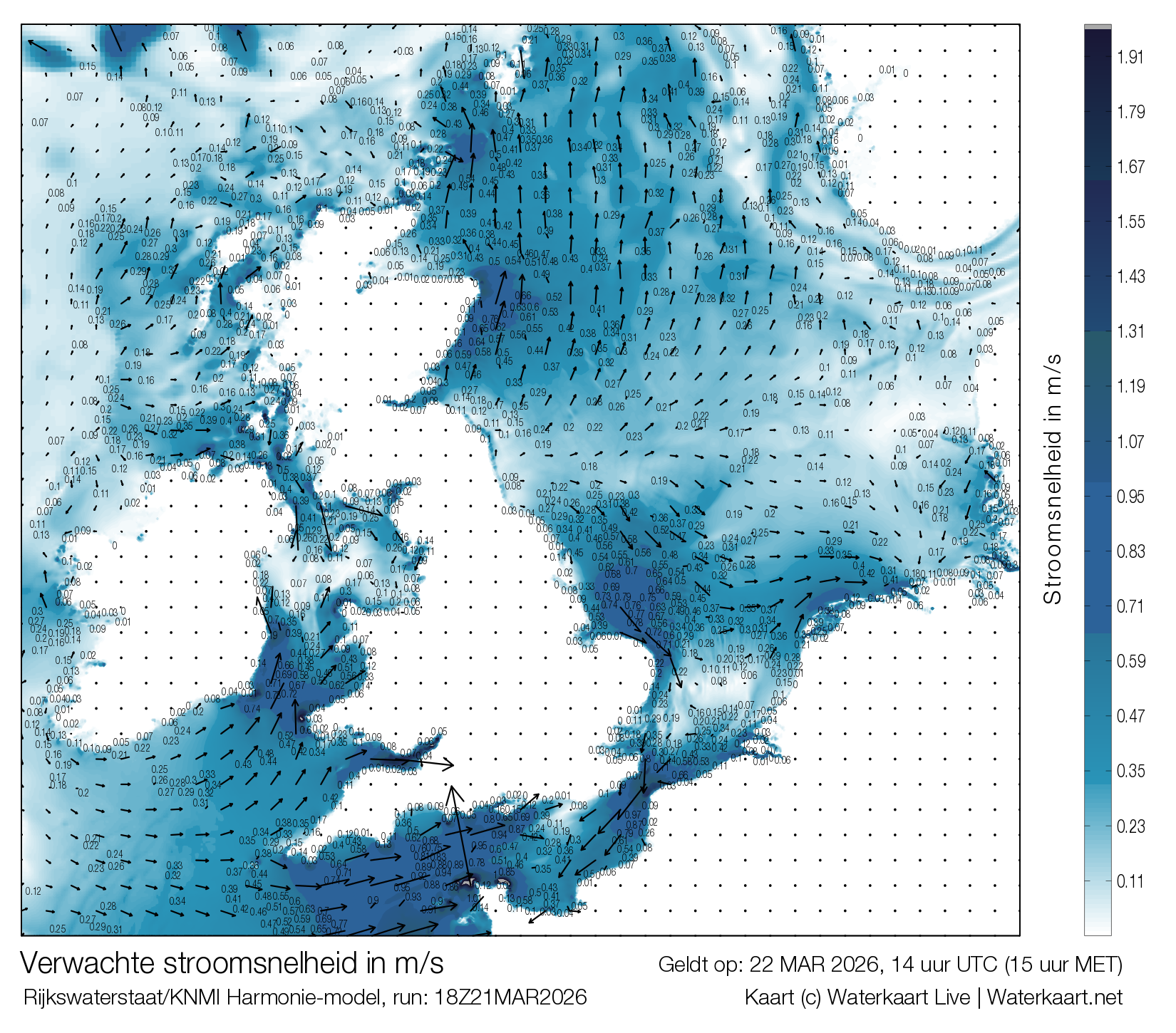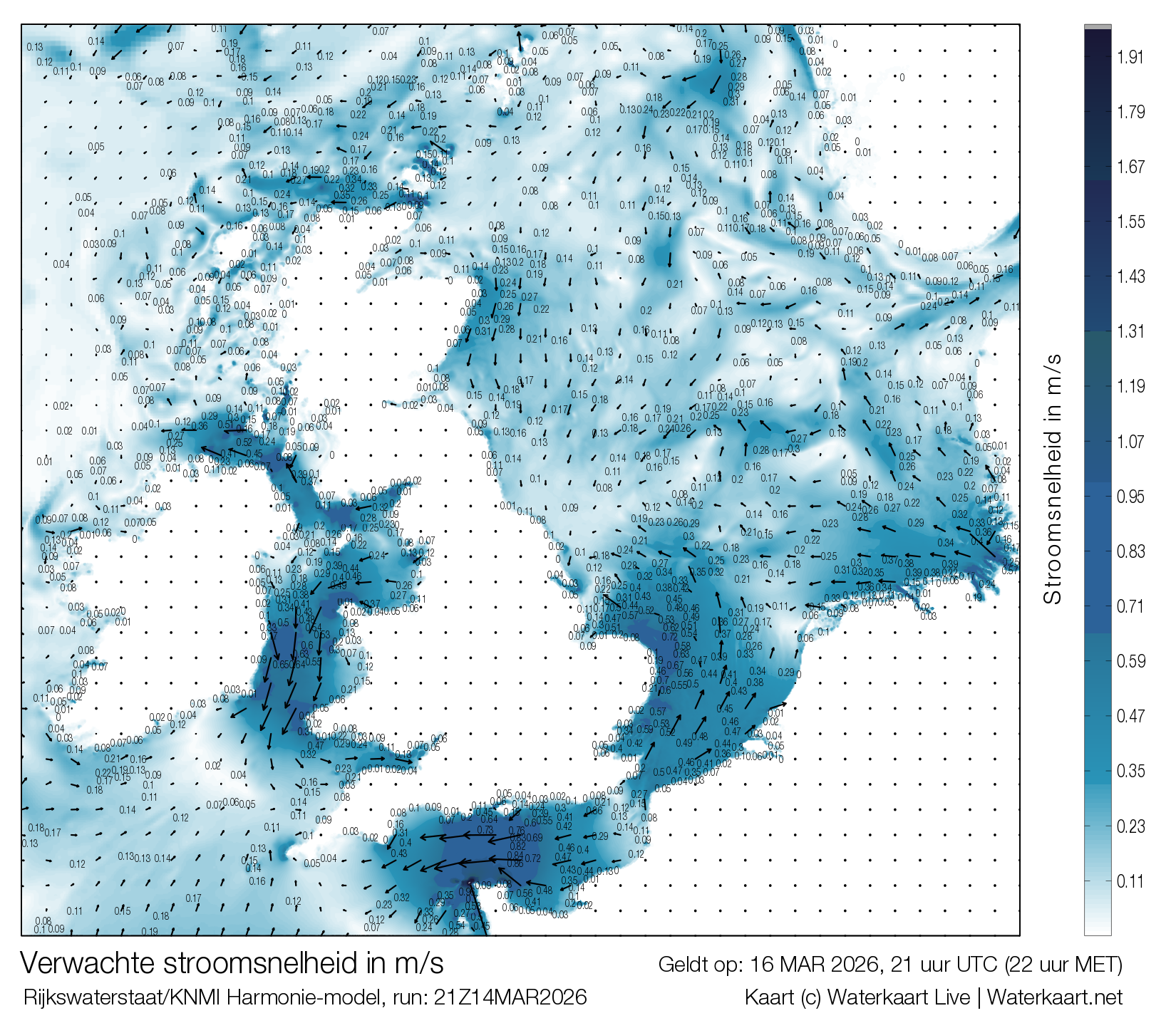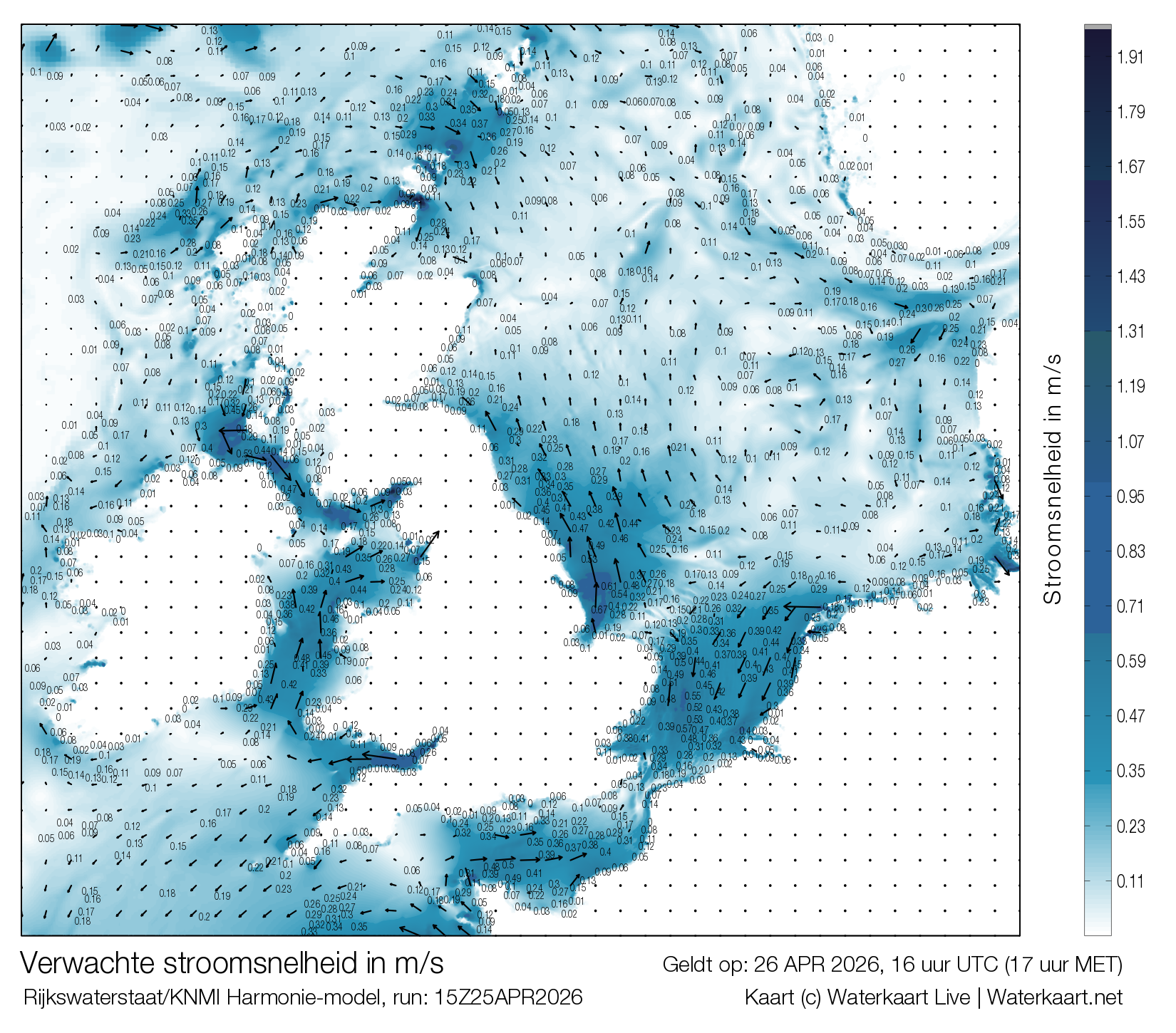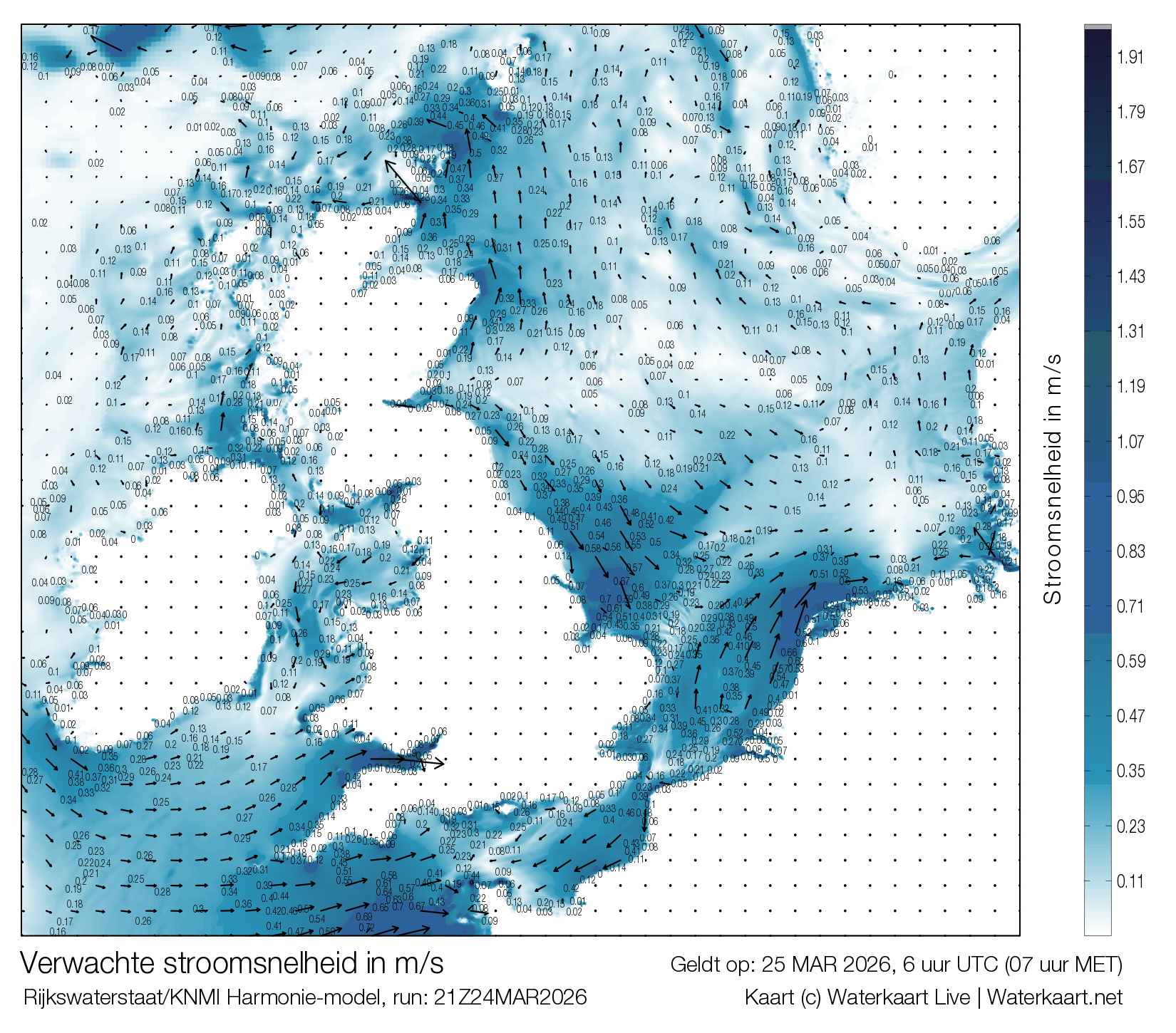 Stroomsnelheden in de Noordzee op basis van de Stroomatlas, verrekend met weersinvloeden. Deze worden iedere dag ververst met data uit het zeestromingen model van Rijkswaterstaat op basis van Harmonie weerdata, voor ieder uur een kaart, tot 48 uur in de toekomst. Lees hieronder meer over dit model