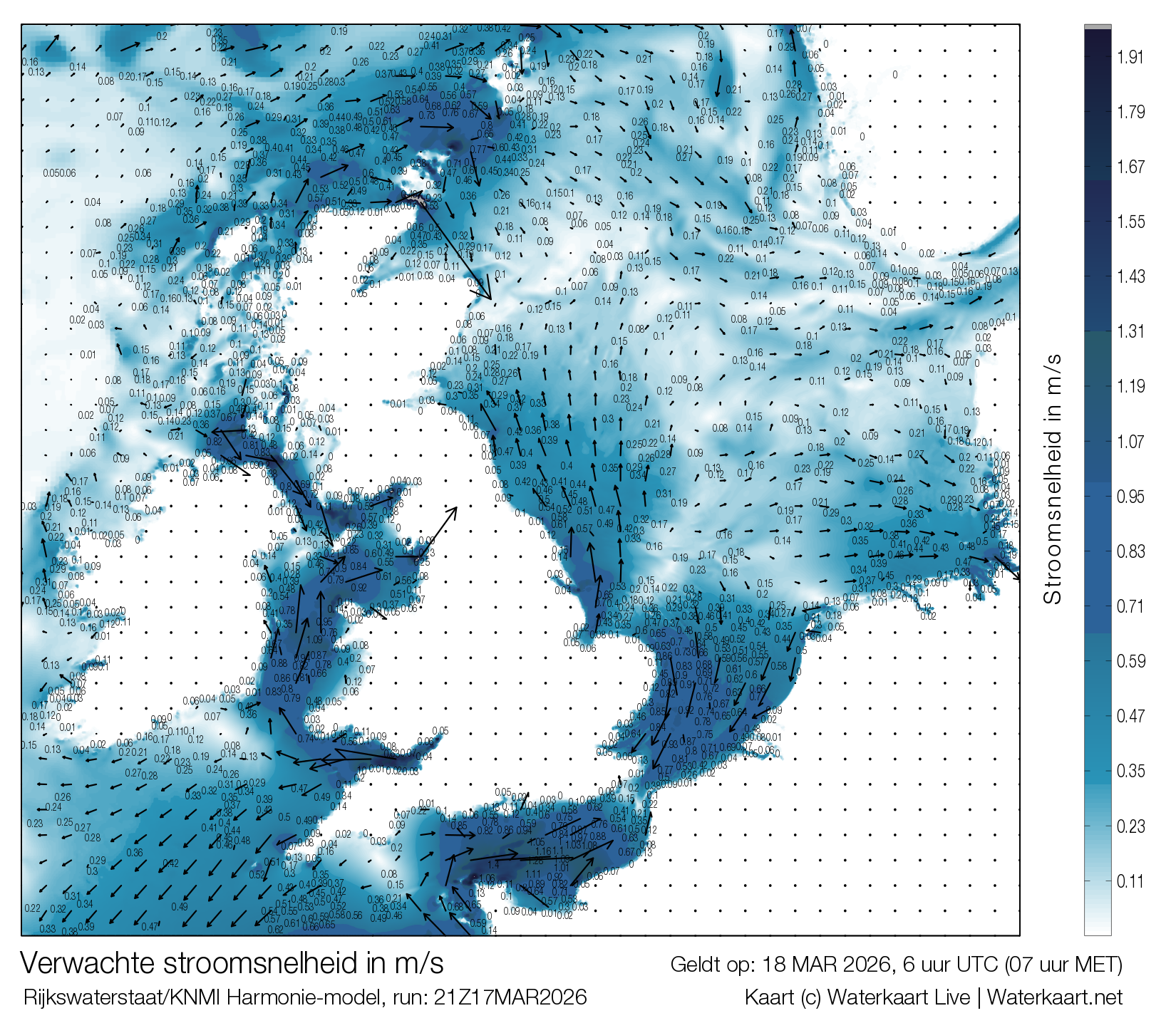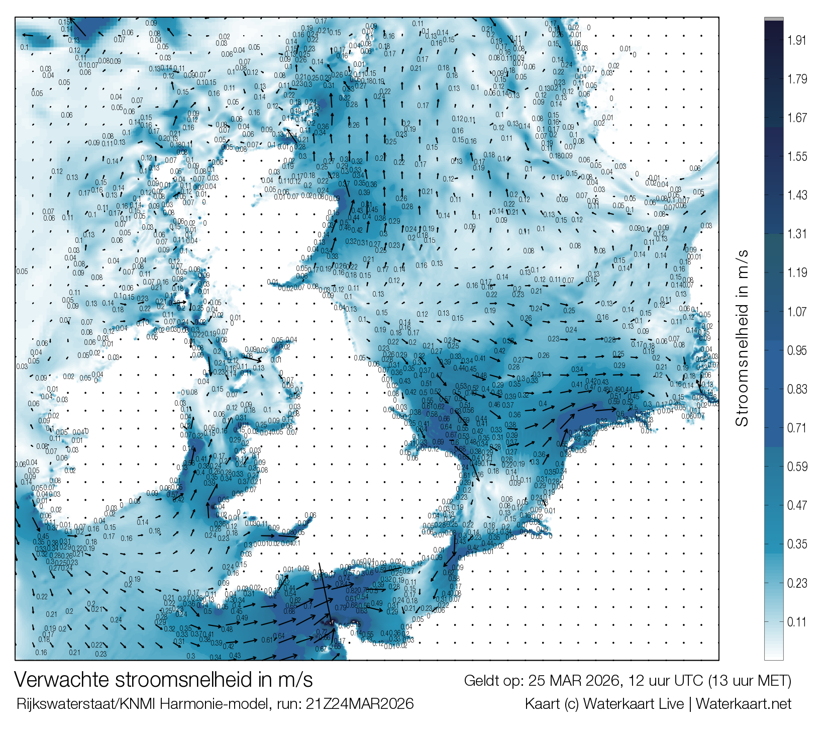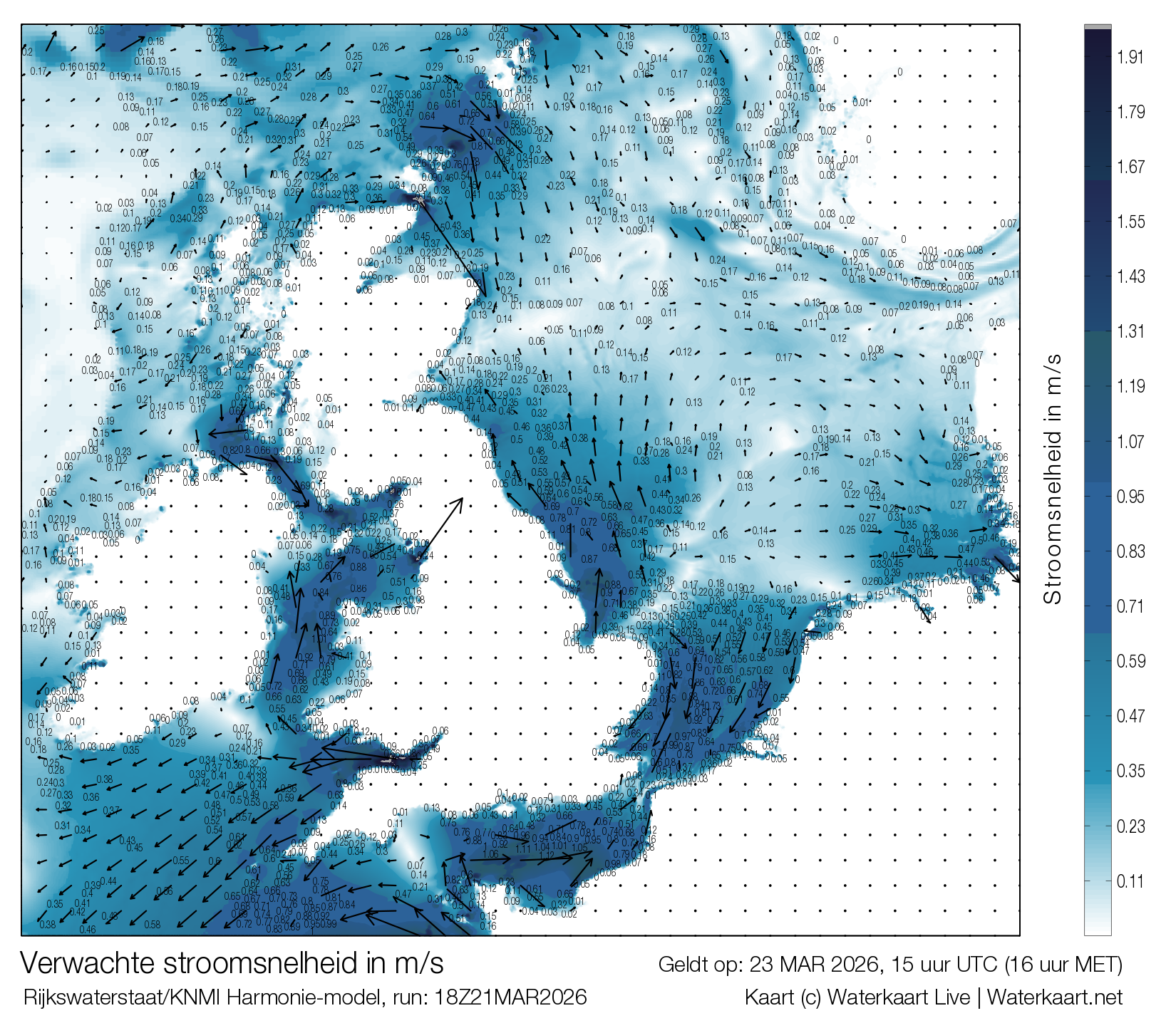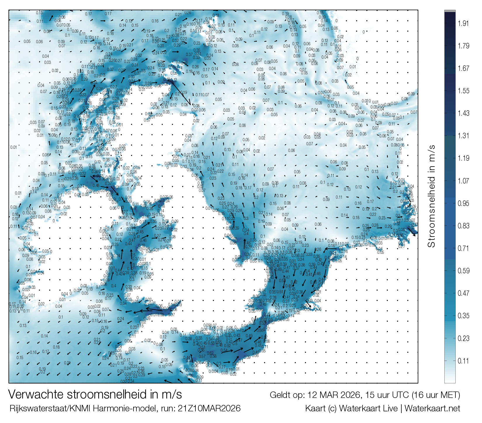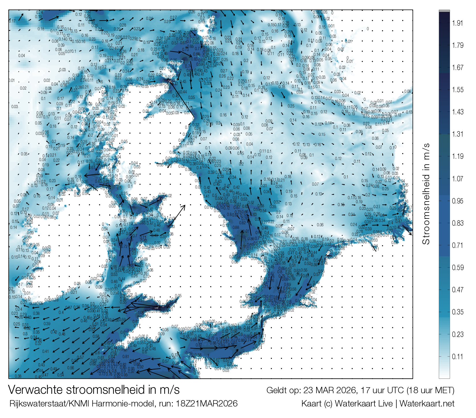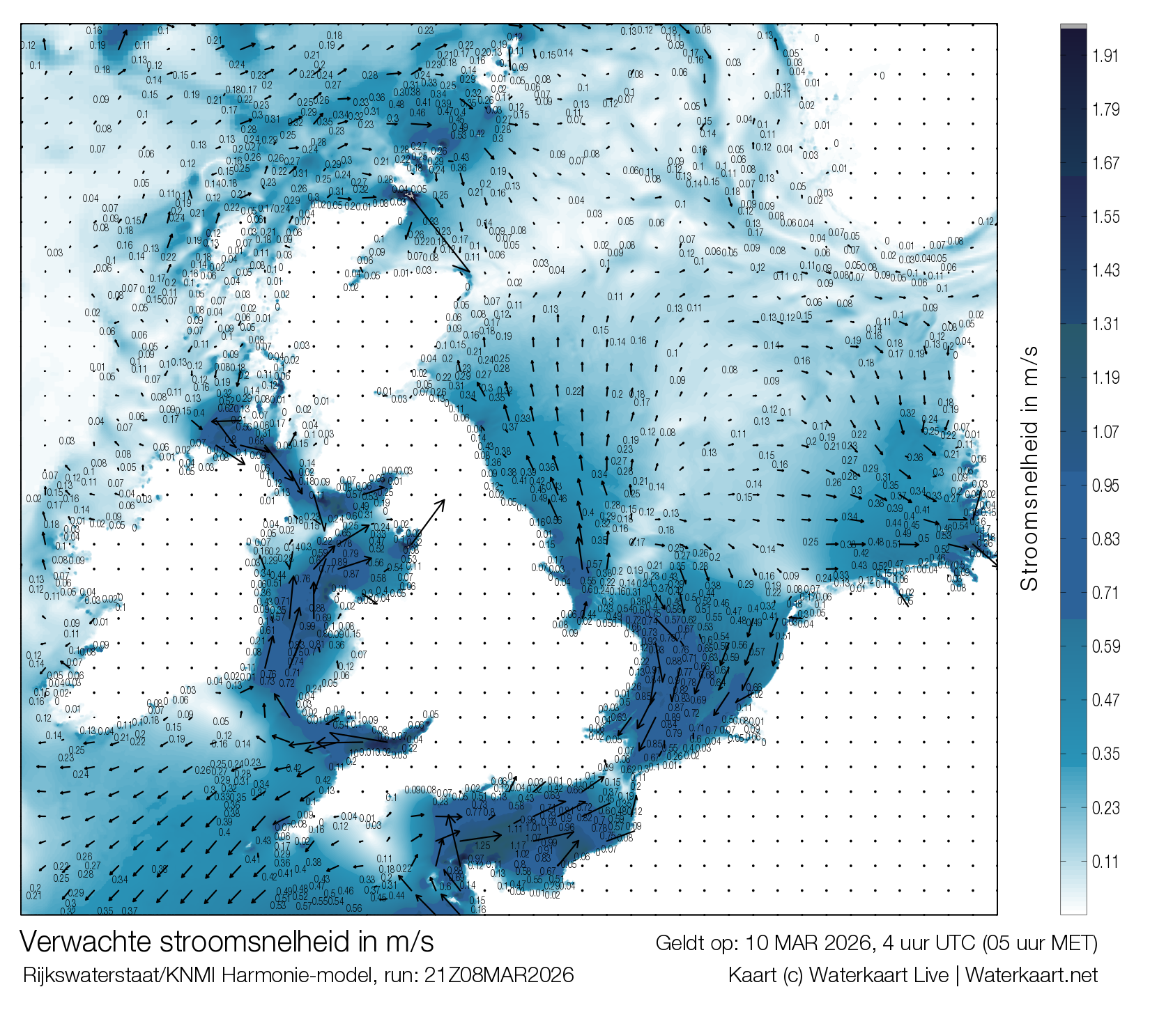 Stroomsnelheden in de Noordzee op basis van de Stroomatlas, verrekend met weersinvloeden. Deze worden iedere dag ververst met data uit het zeestromingen model van Rijkswaterstaat op basis van Harmonie weerdata, voor ieder uur een kaart, tot 48 uur in de toekomst. Lees hieronder meer over dit model