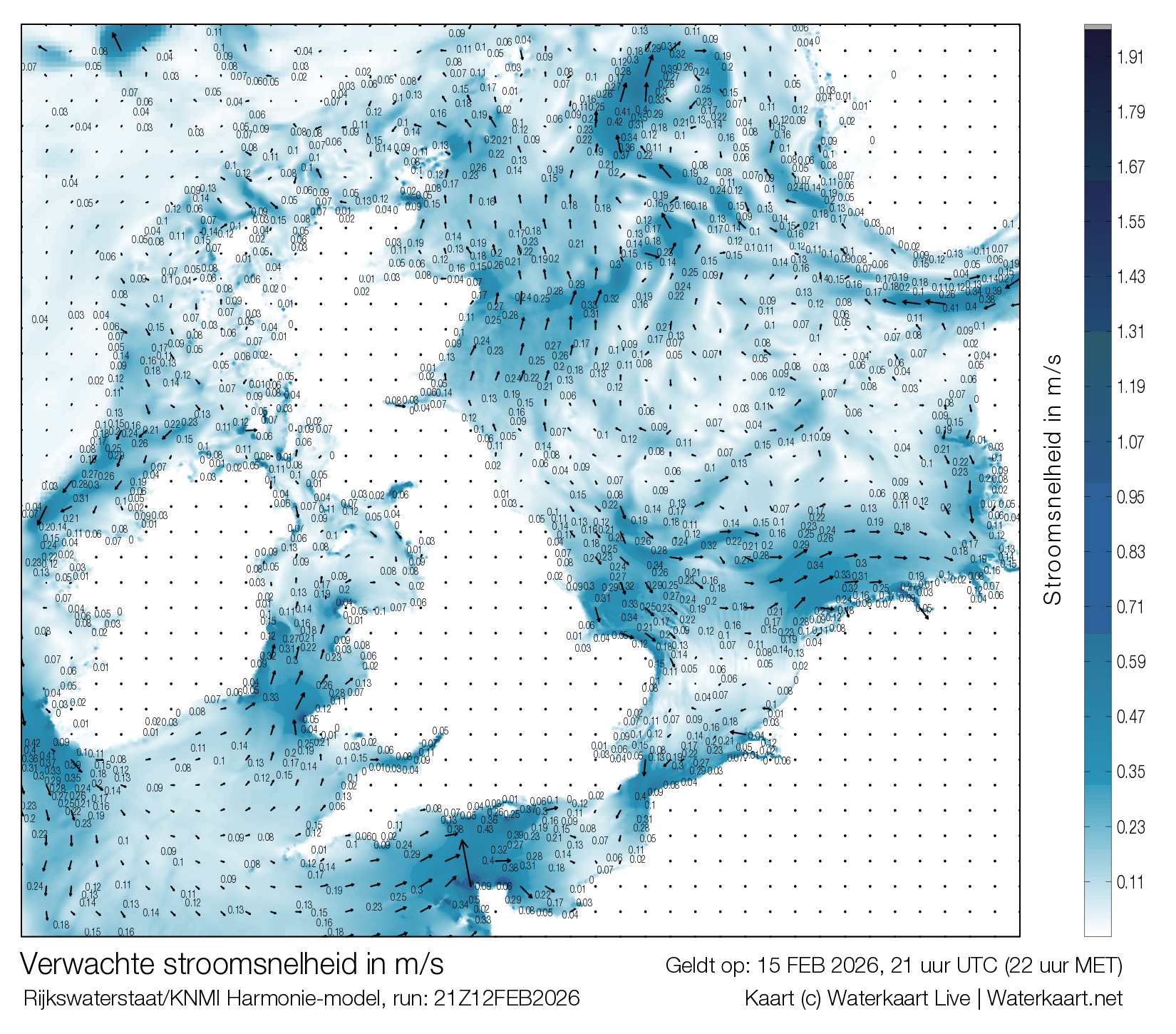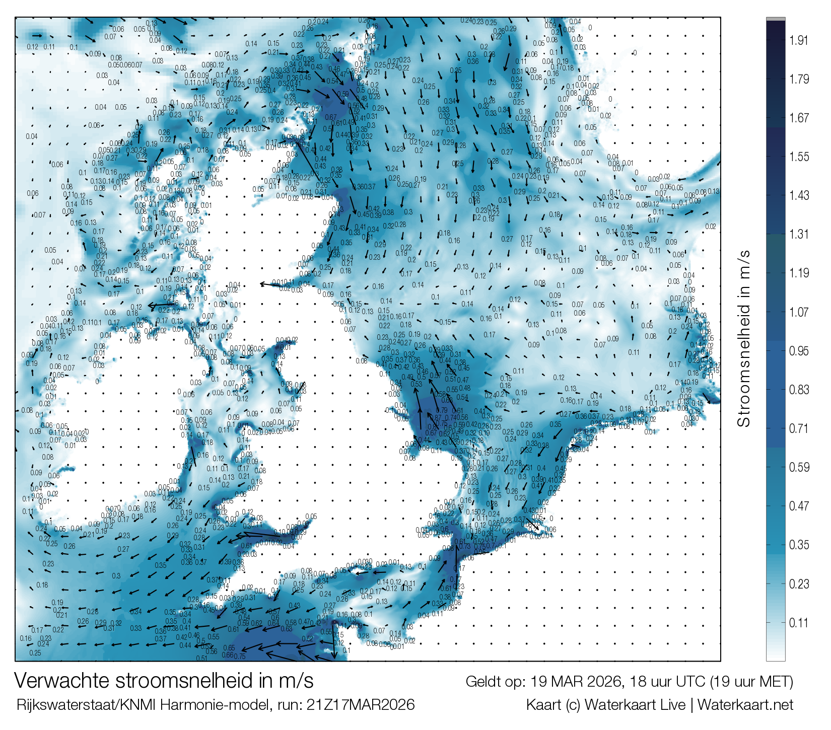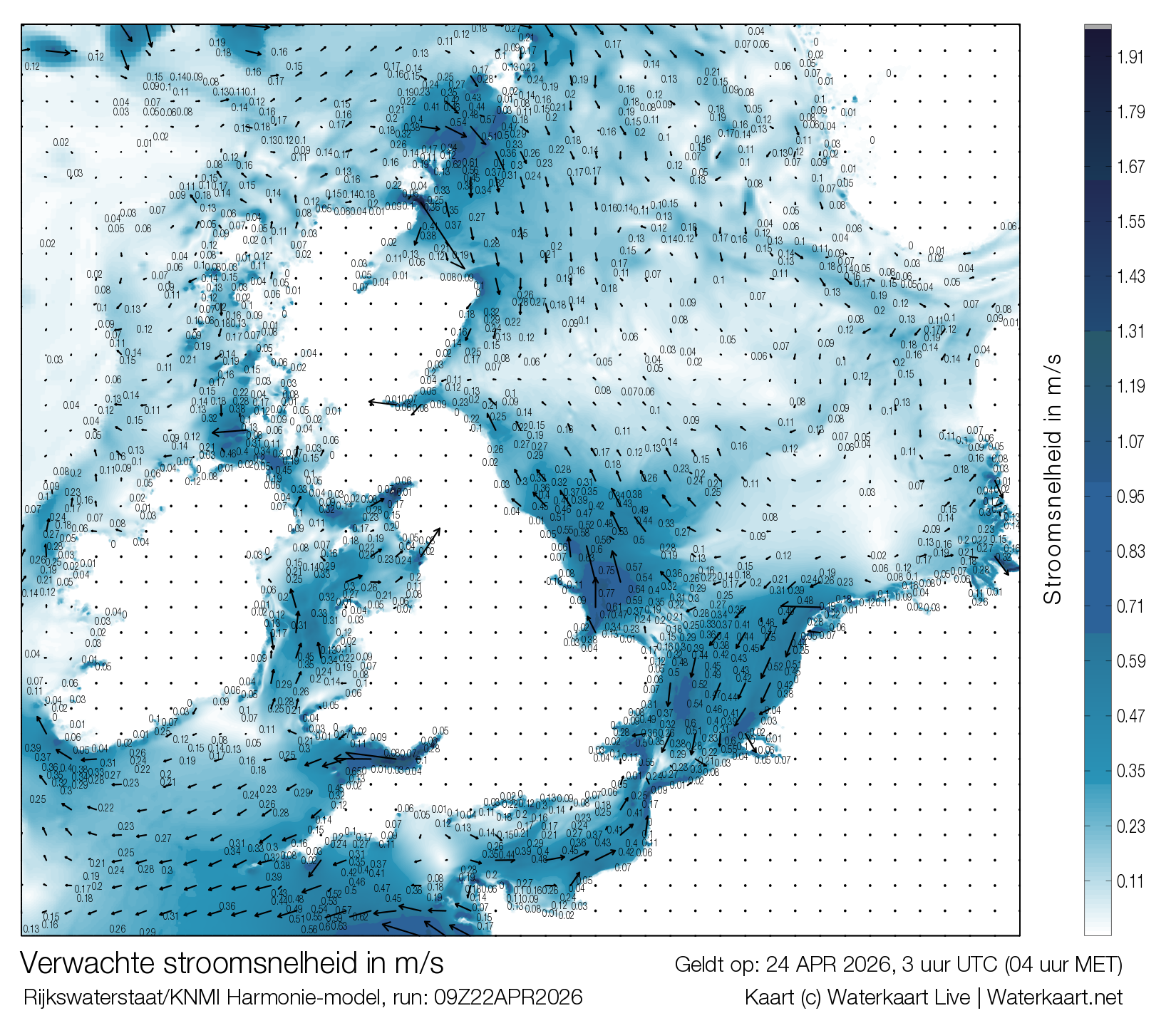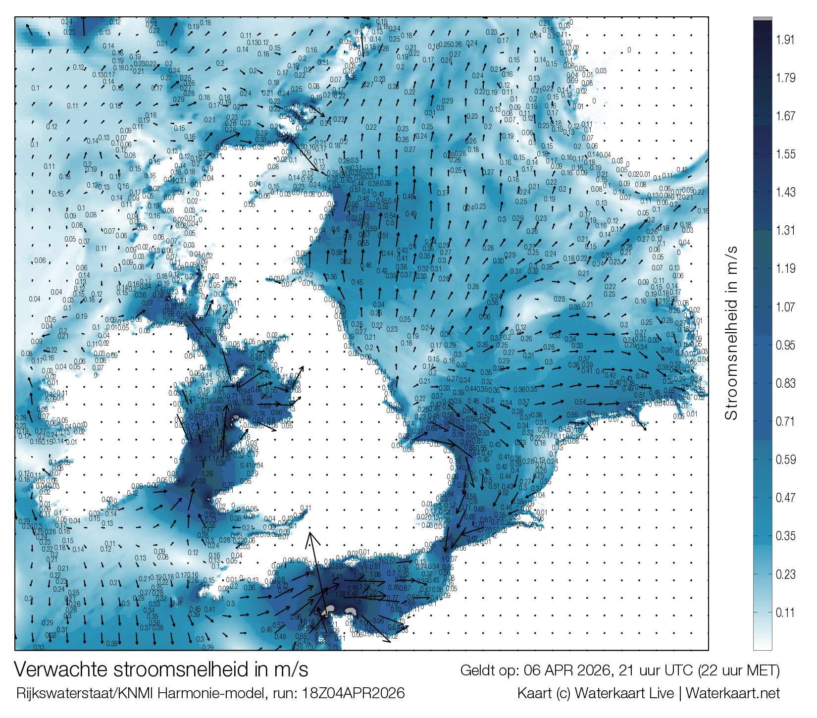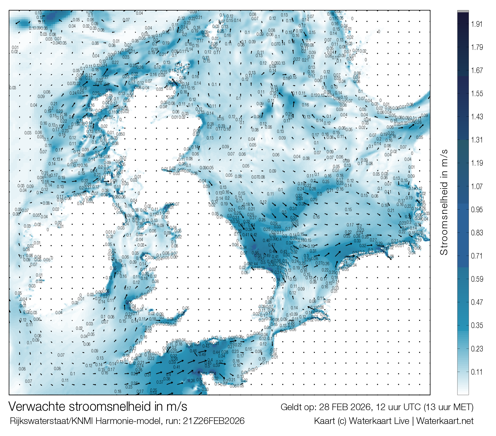 Stroomsnelheden in de Noordzee op basis van de Stroomatlas, verrekend met weersinvloeden. Deze worden iedere dag ververst met data uit het zeestromingen model van Rijkswaterstaat op basis van Harmonie weerdata, voor ieder uur een kaart, tot 48 uur in de toekomst. Lees hieronder meer over dit model