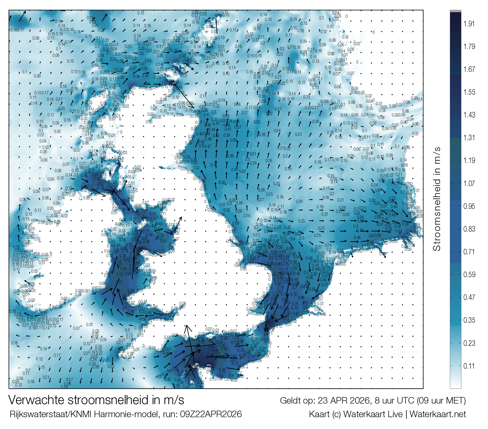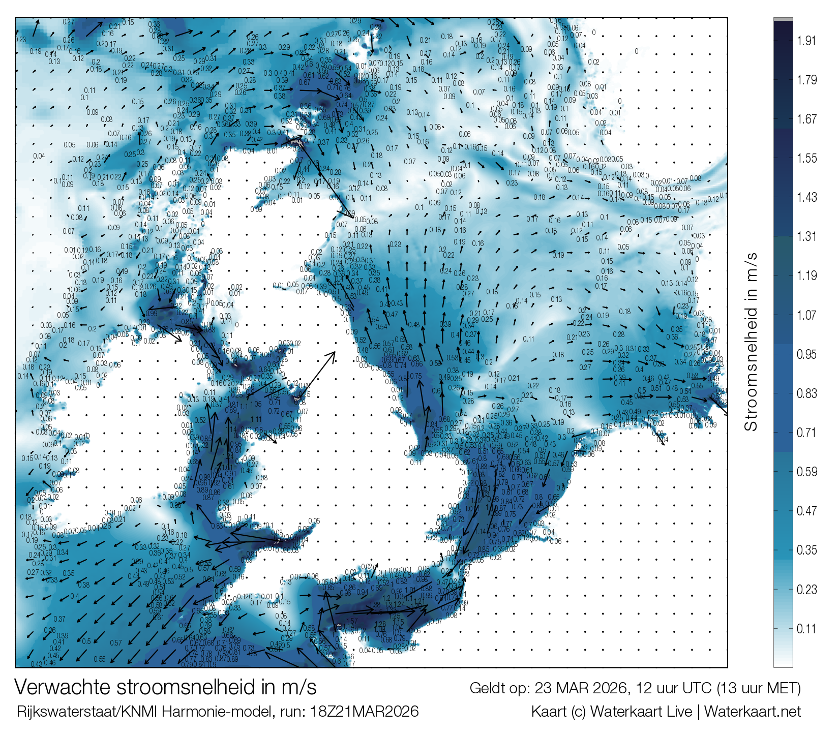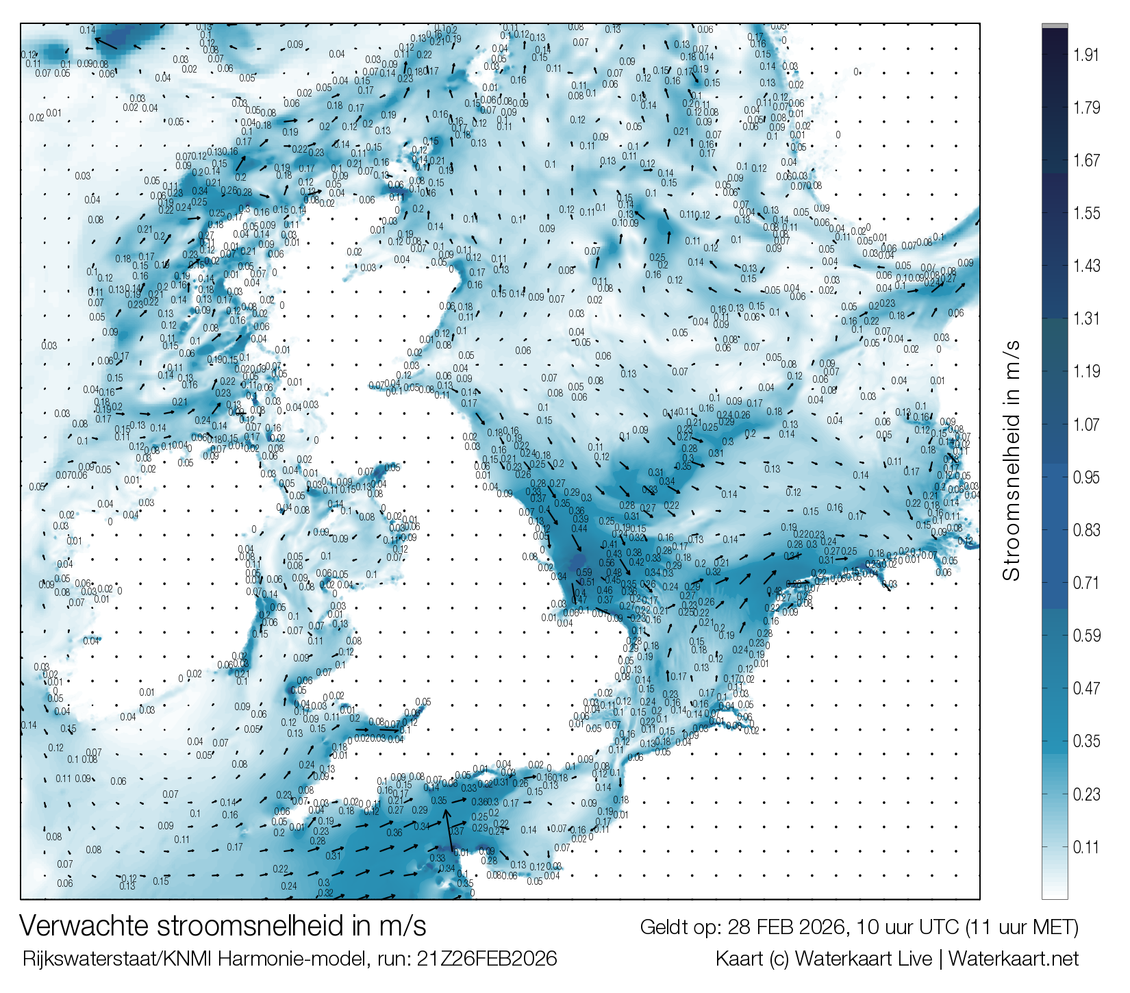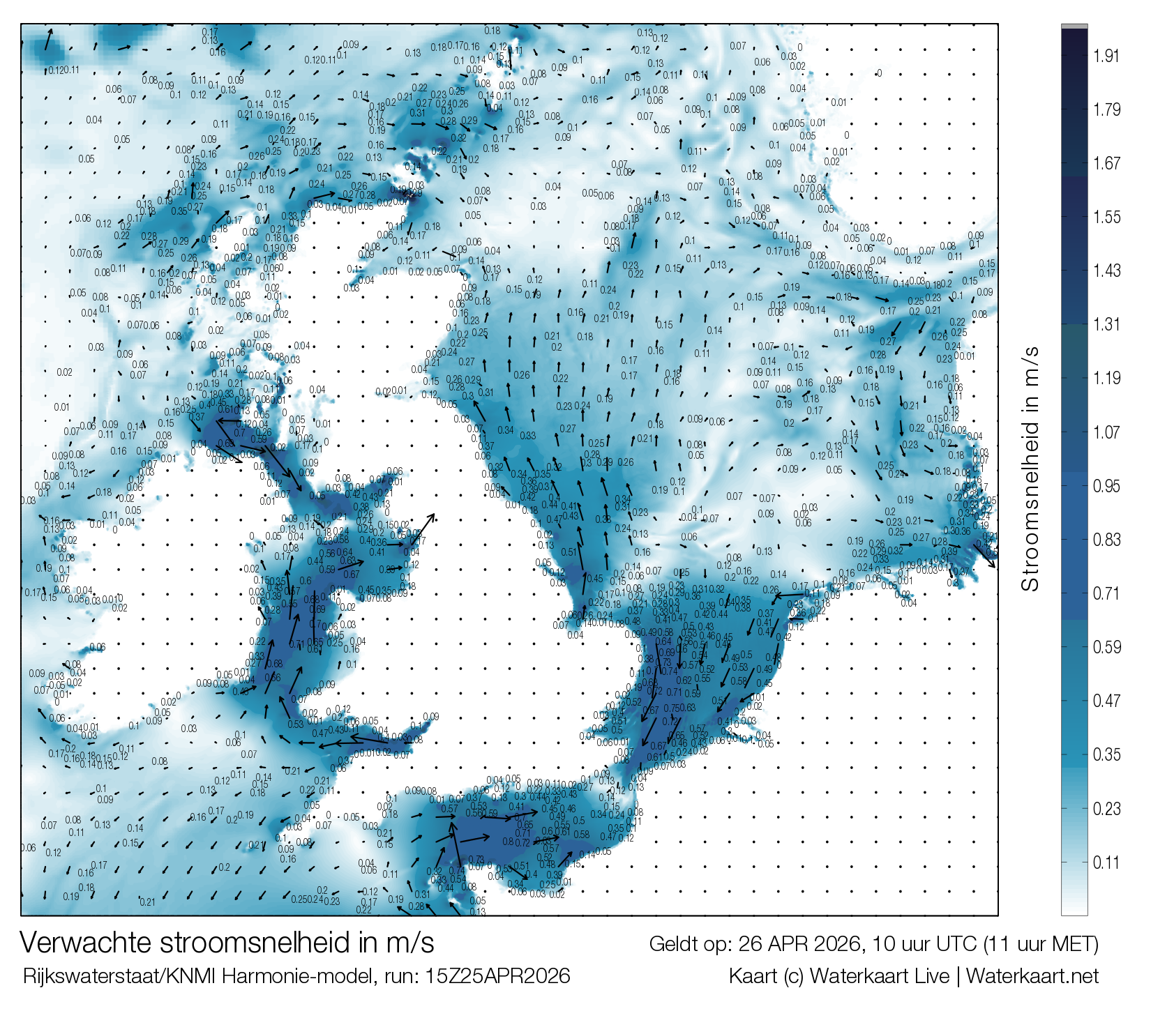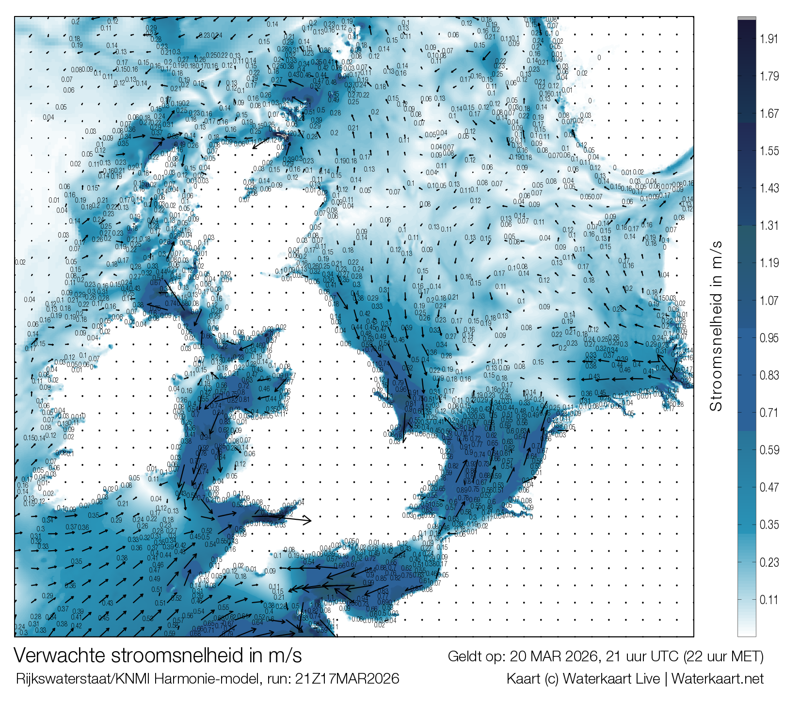 Stroomsnelheden in de Noordzee op basis van de Stroomatlas, verrekend met weersinvloeden. Deze worden iedere dag ververst met data uit het zeestromingen model van Rijkswaterstaat op basis van Harmonie weerdata, voor ieder uur een kaart, tot 48 uur in de toekomst. Lees hieronder meer over dit model