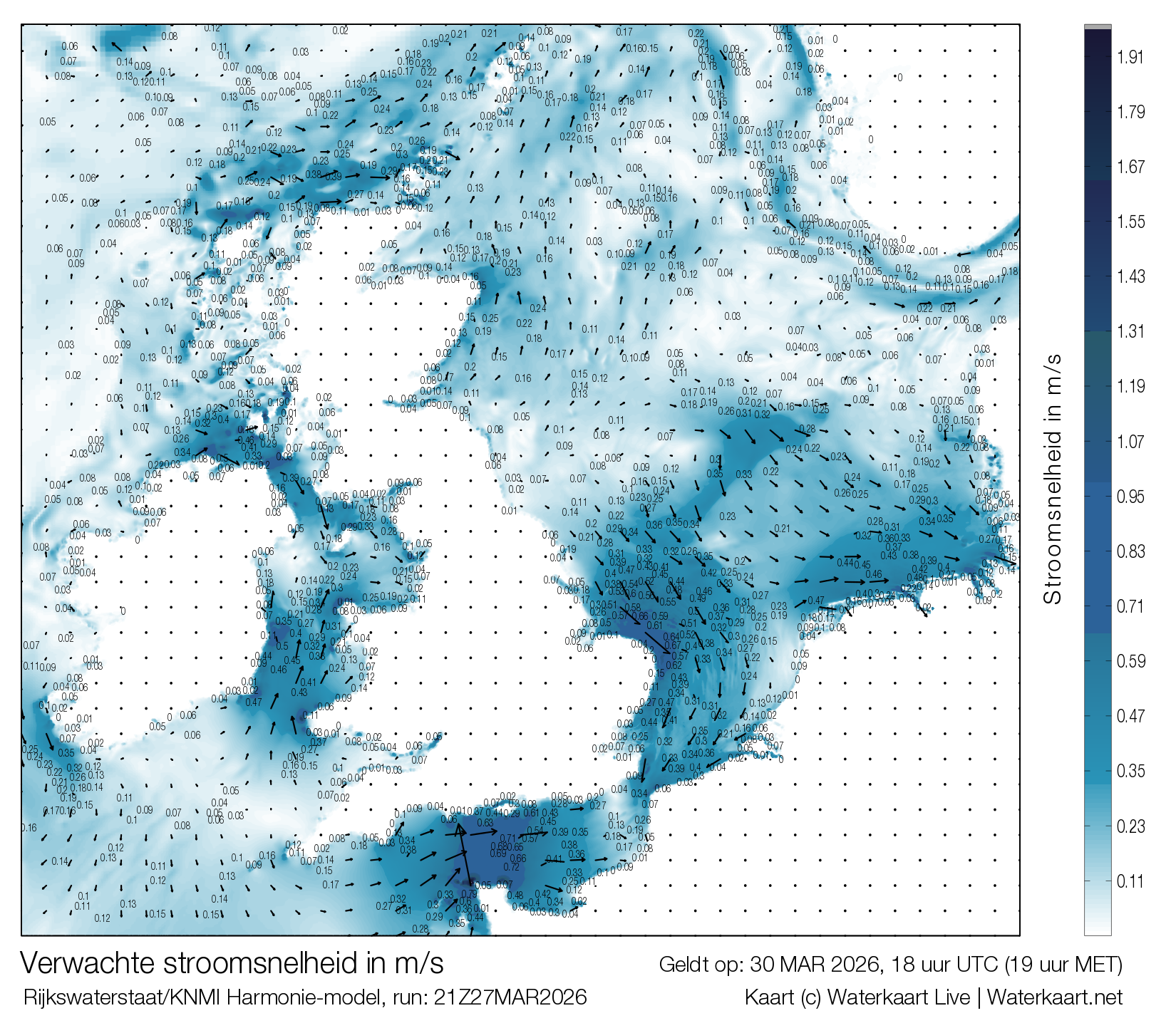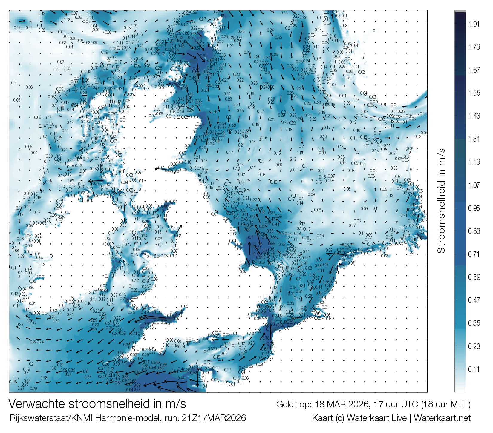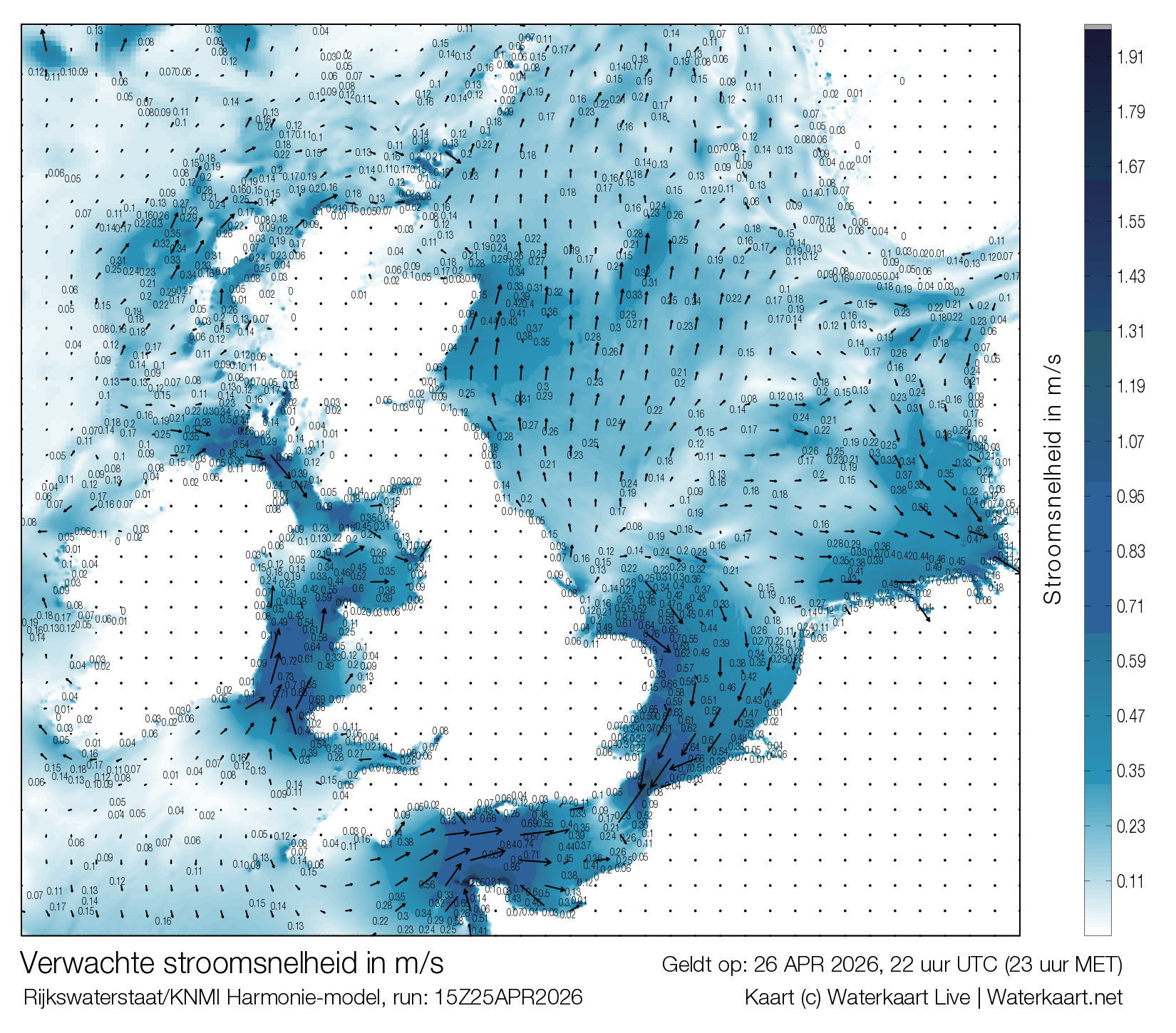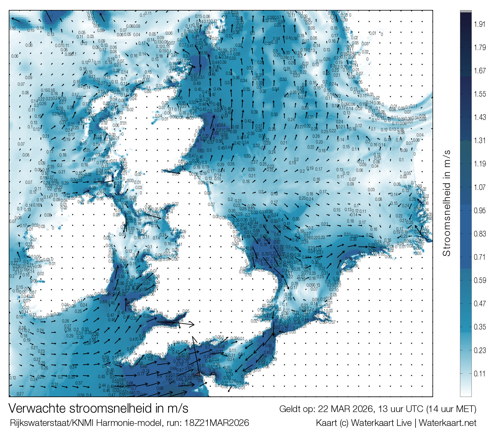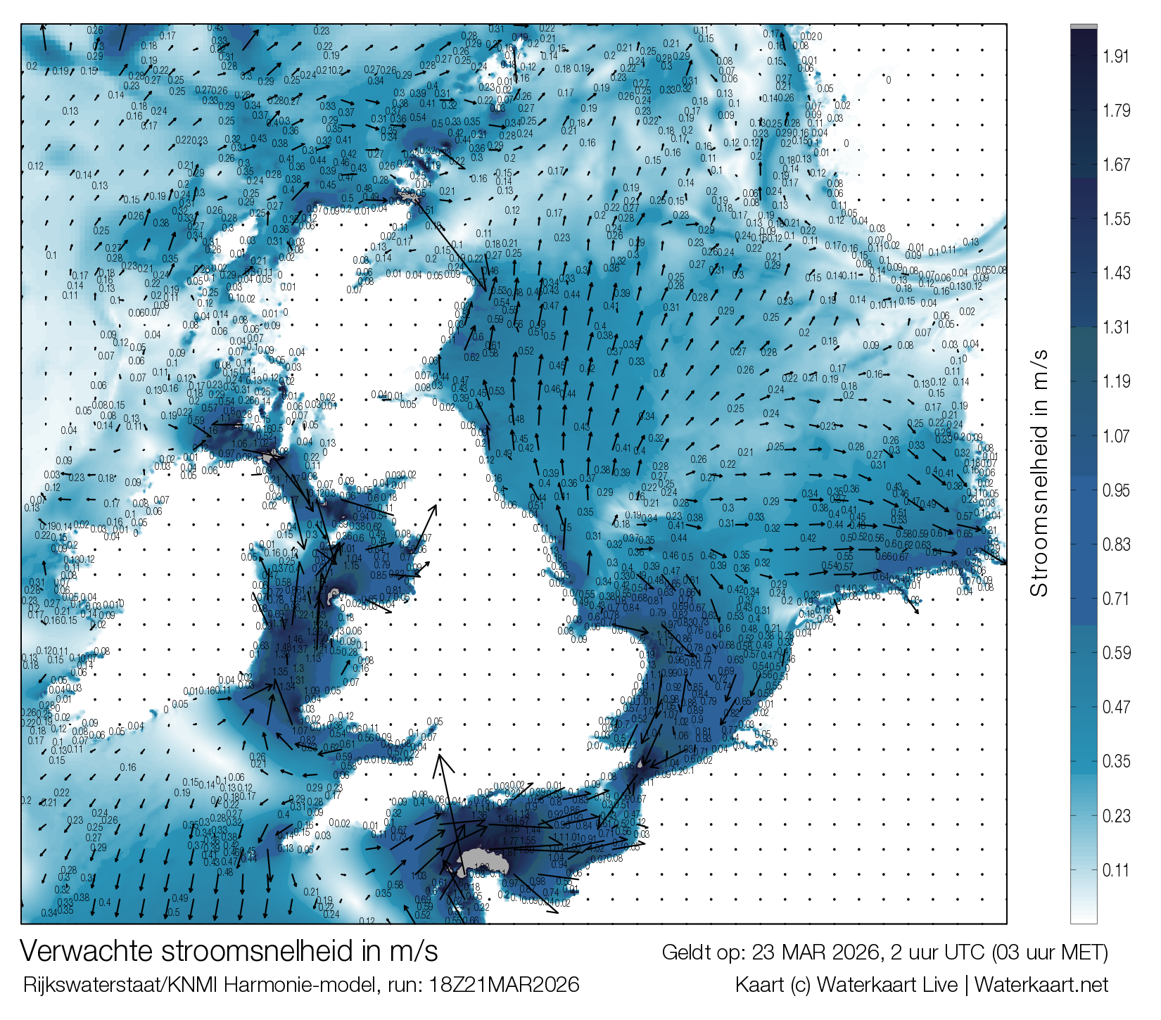 Stroomsnelheden in de Noordzee op basis van de Stroomatlas, verrekend met weersinvloeden. Deze worden iedere dag ververst met data uit het zeestromingen model van Rijkswaterstaat op basis van Harmonie weerdata, voor ieder uur een kaart, tot 48 uur in de toekomst. Lees hieronder meer over dit model