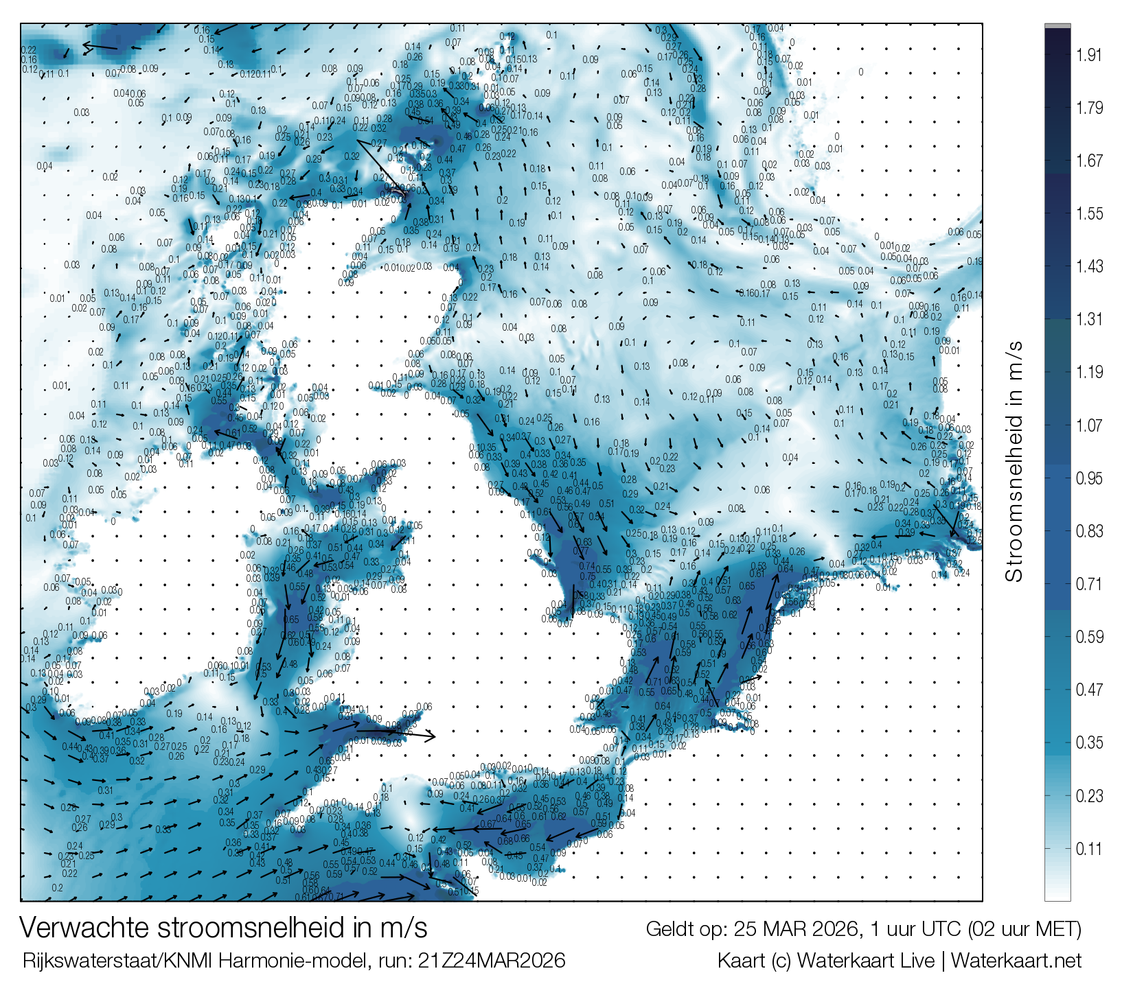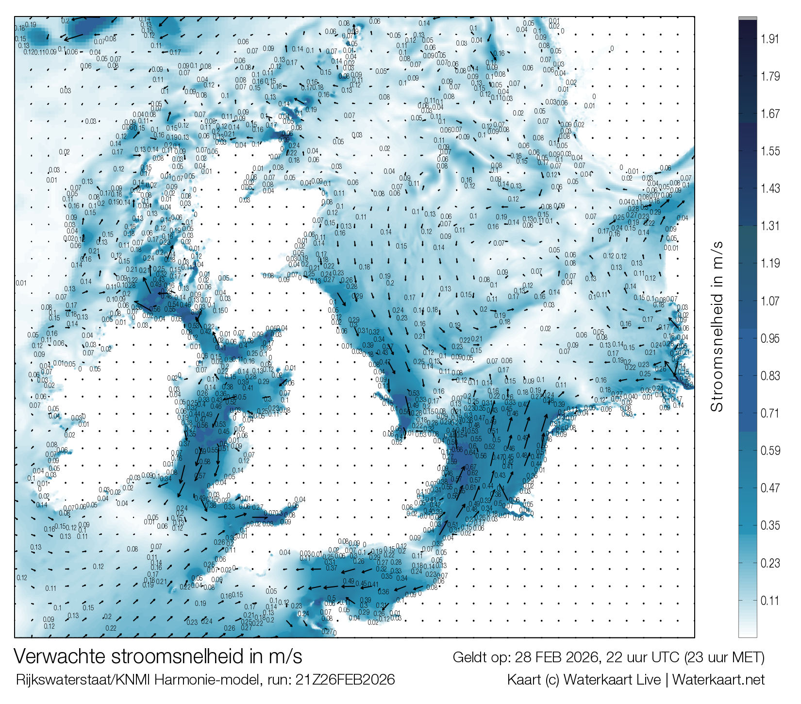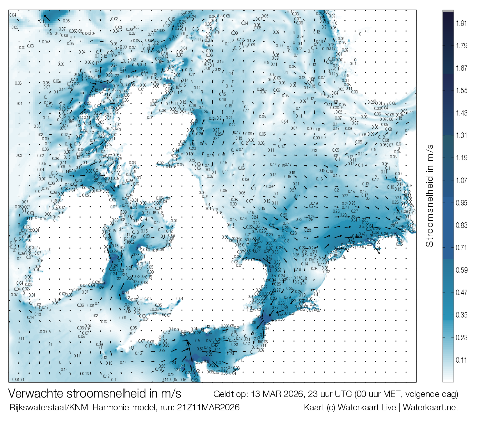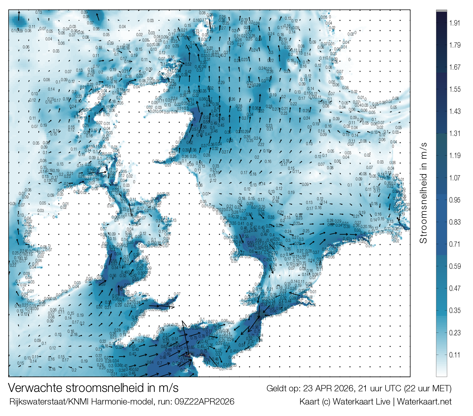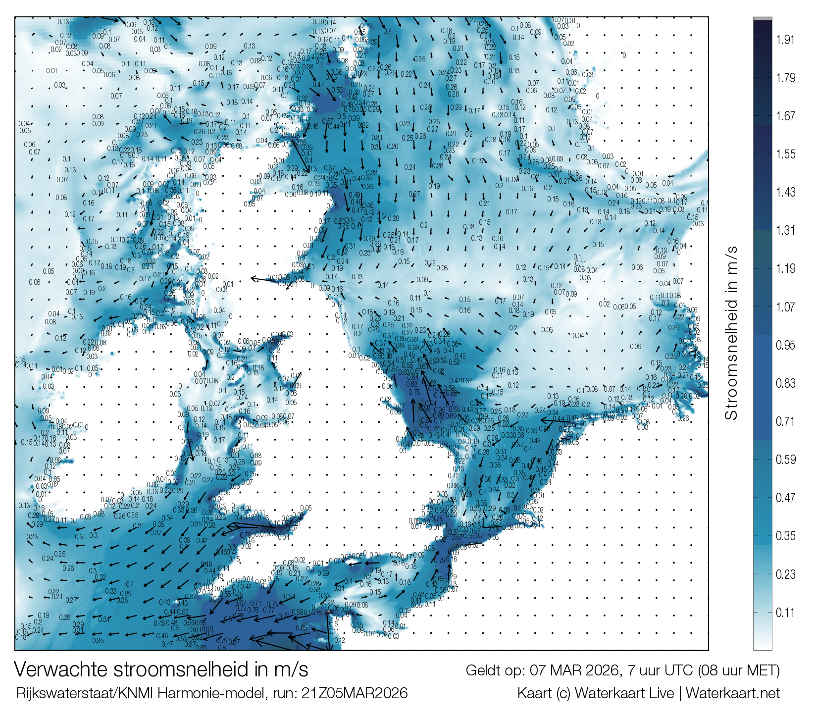 Stroomsnelheden in de Noordzee op basis van de Stroomatlas, verrekend met weersinvloeden. Deze worden iedere dag ververst met data uit het zeestromingen model van Rijkswaterstaat op basis van Harmonie weerdata, voor ieder uur een kaart, tot 48 uur in de toekomst. Lees hieronder meer over dit model