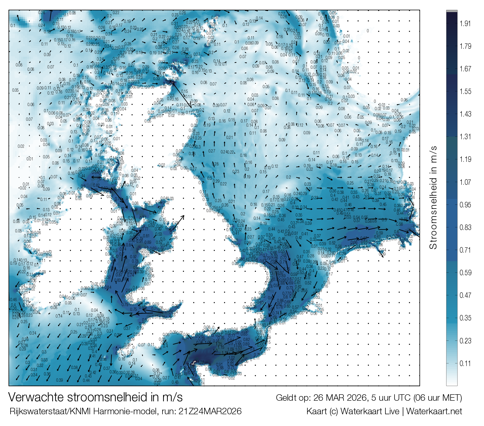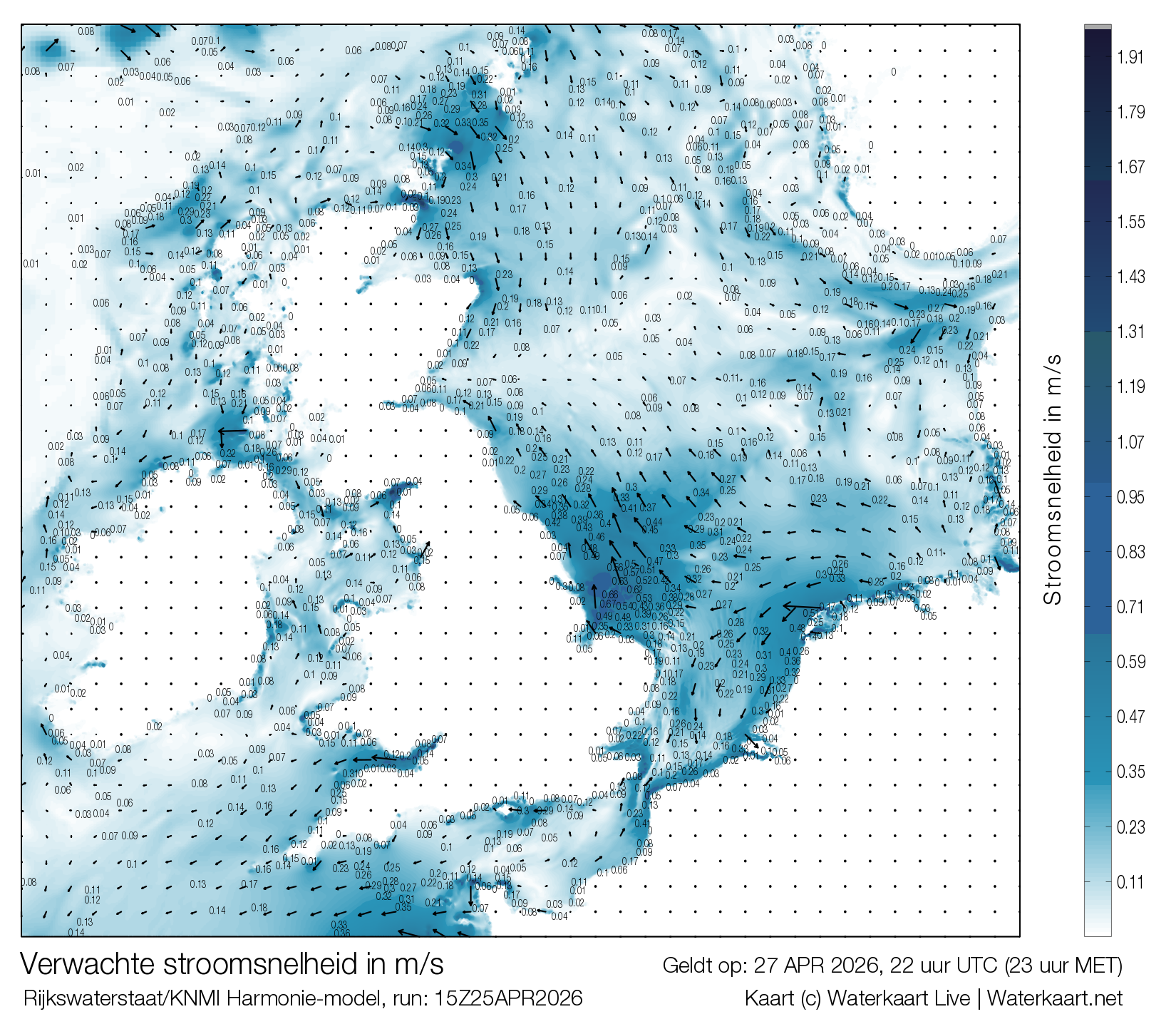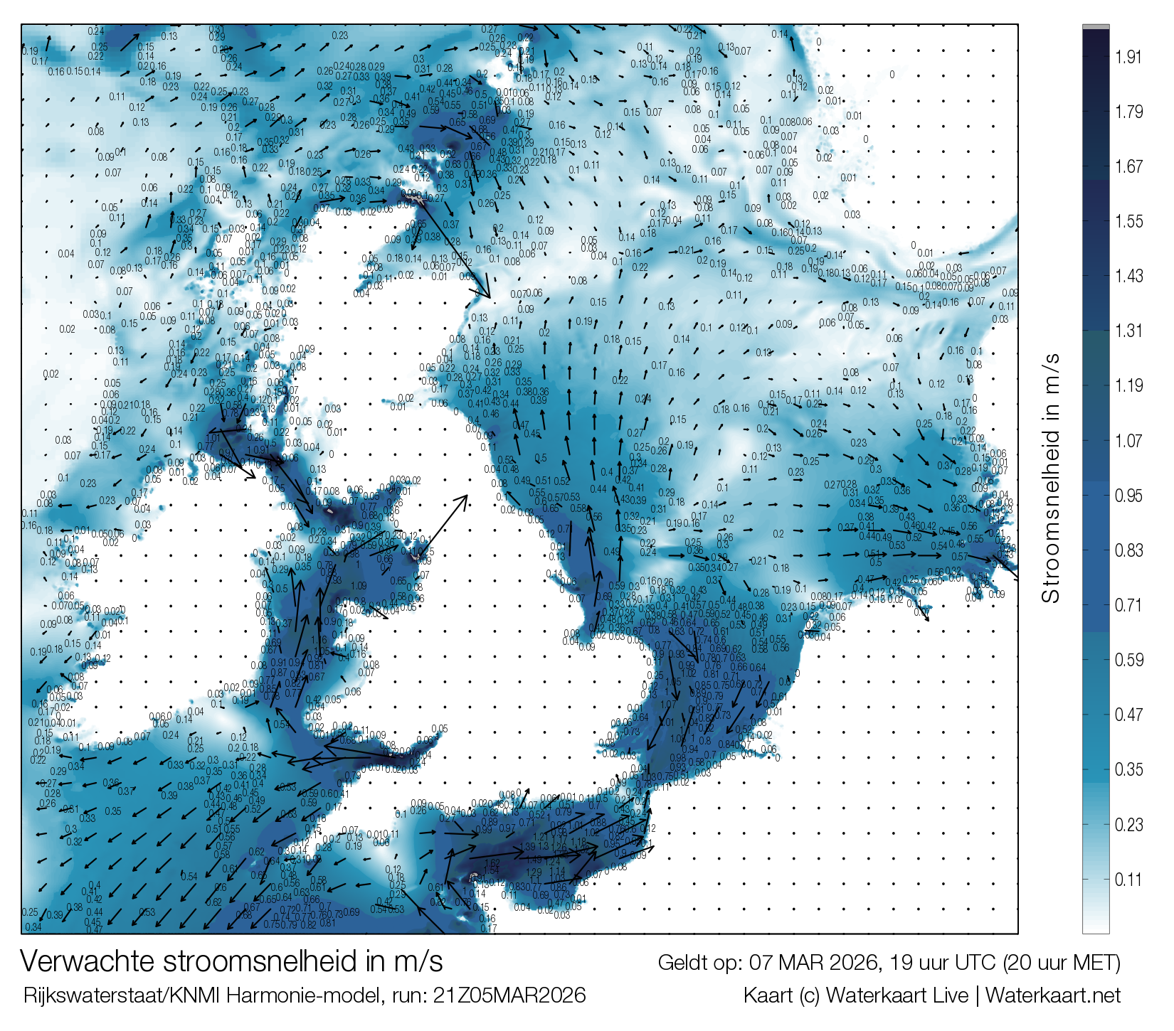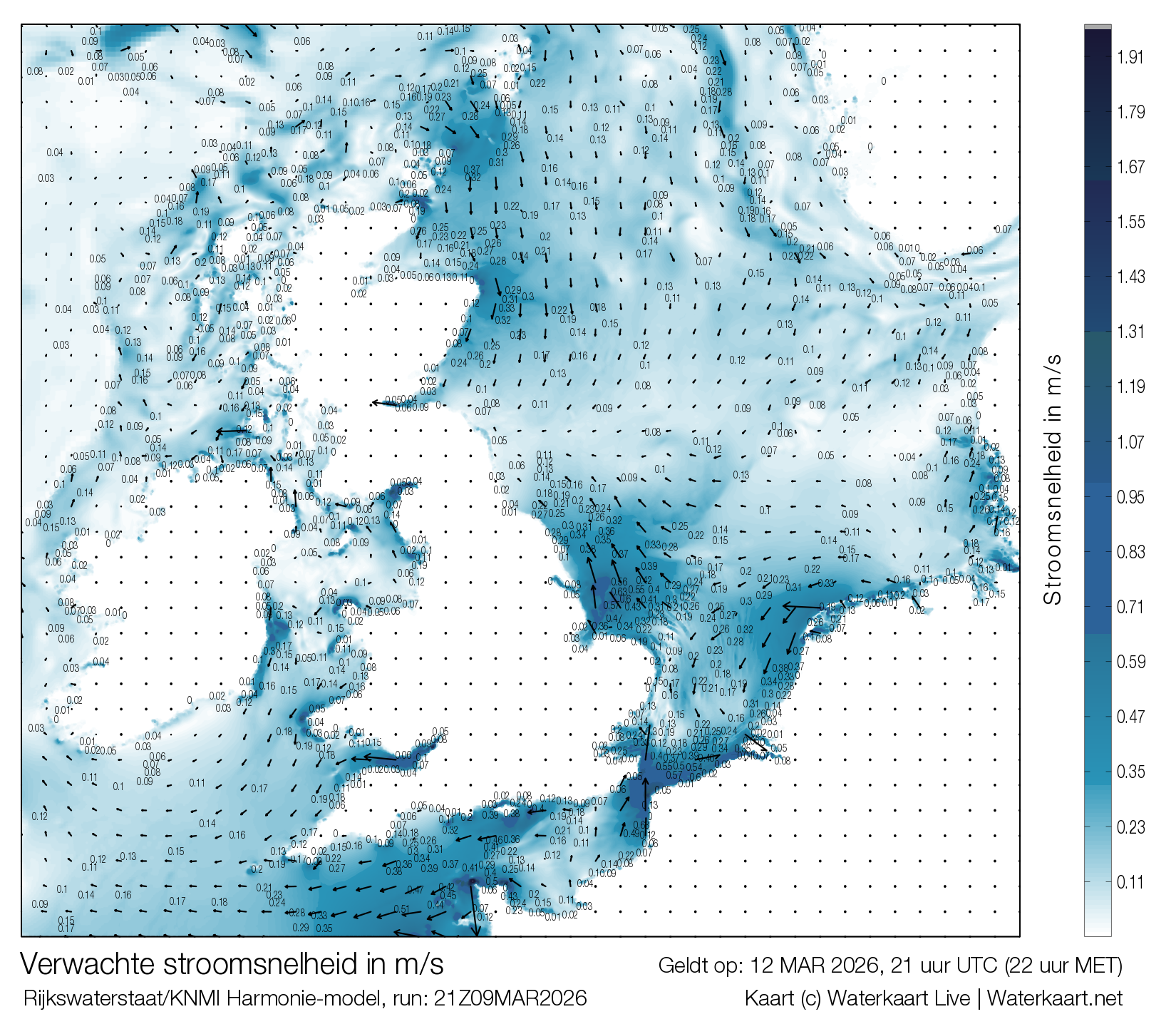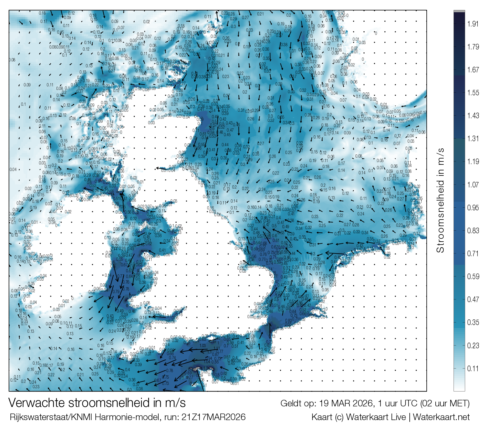 Stroomsnelheden in de Noordzee op basis van de Stroomatlas, verrekend met weersinvloeden. Deze worden iedere dag ververst met data uit het zeestromingen model van Rijkswaterstaat op basis van Harmonie weerdata, voor ieder uur een kaart, tot 48 uur in de toekomst. Lees hieronder meer over dit model
