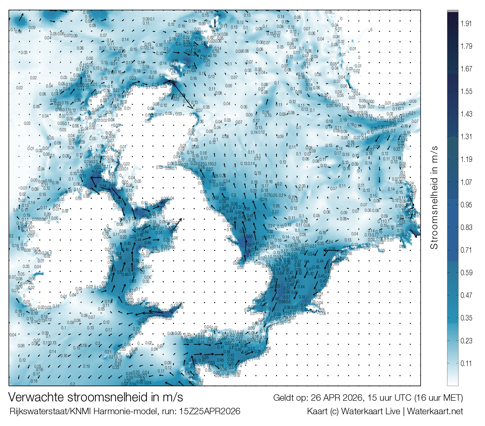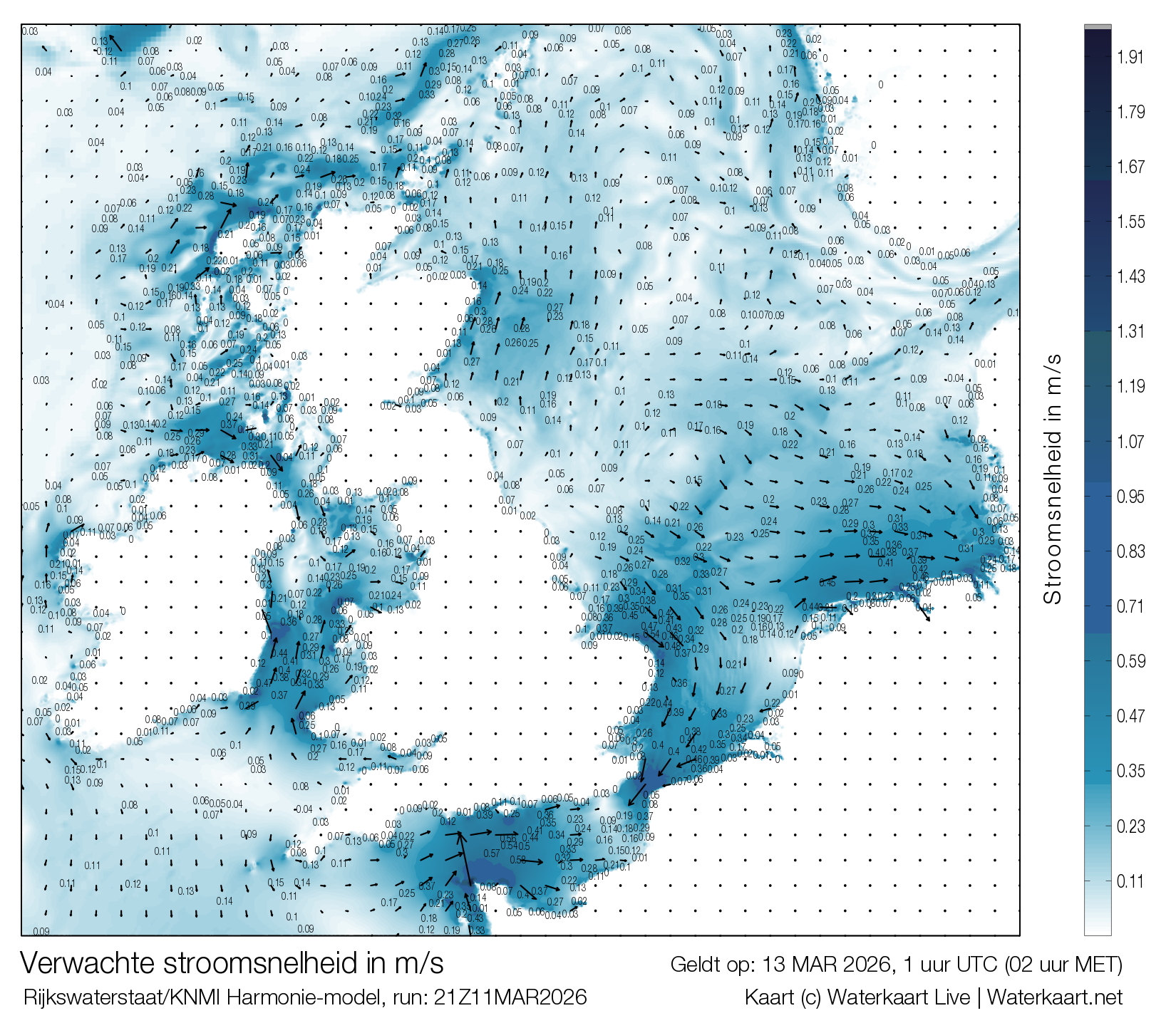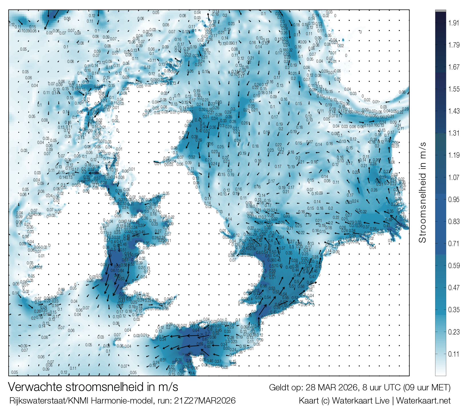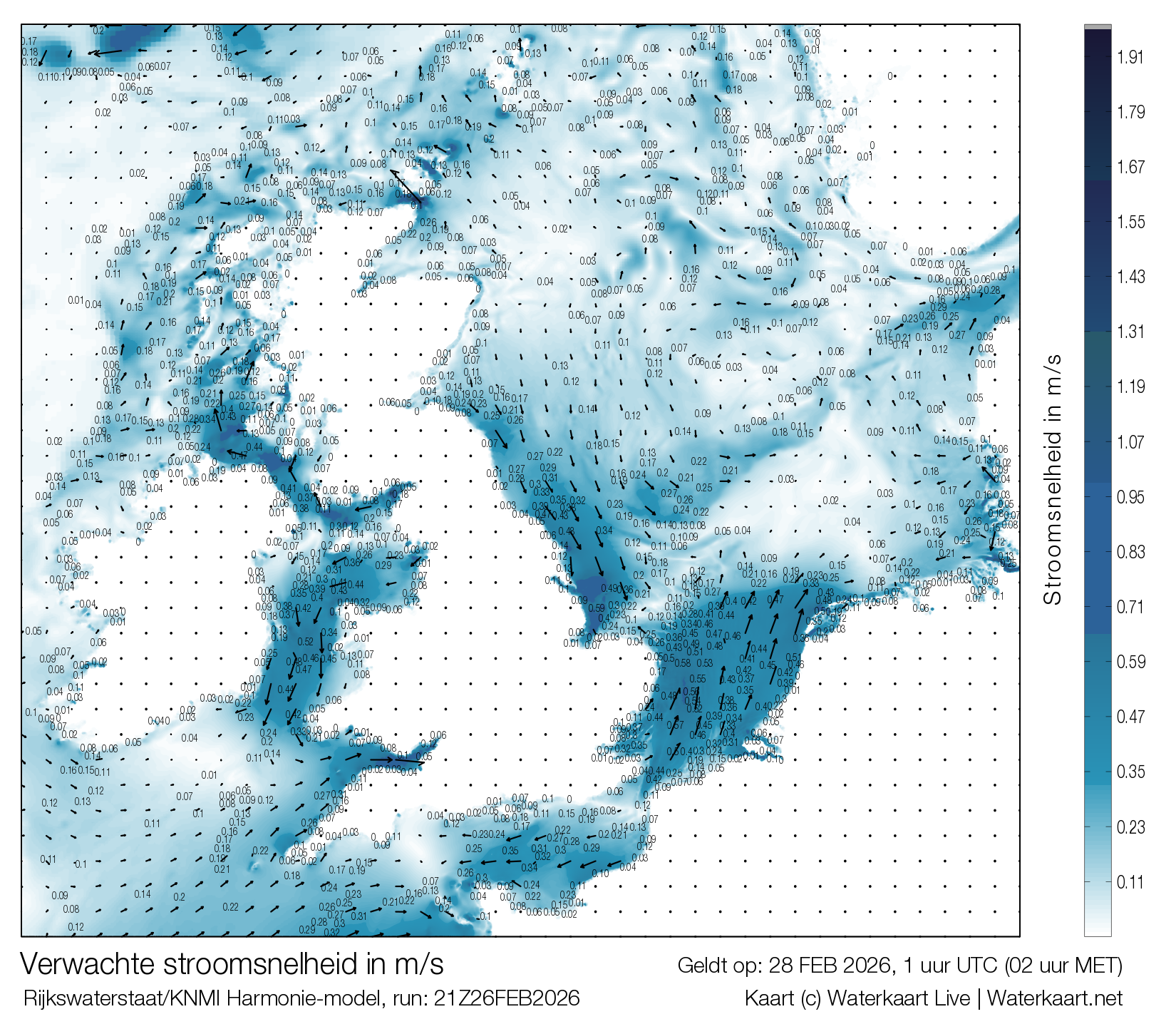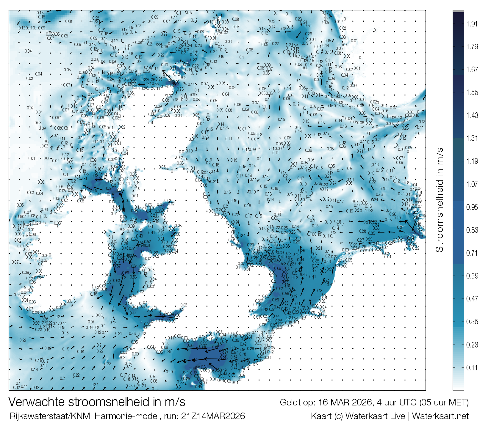 Stroomsnelheden in de Noordzee op basis van de Stroomatlas, verrekend met weersinvloeden. Deze worden iedere dag ververst met data uit het zeestromingen model van Rijkswaterstaat op basis van Harmonie weerdata, voor ieder uur een kaart, tot 48 uur in de toekomst. Lees hieronder meer over dit model