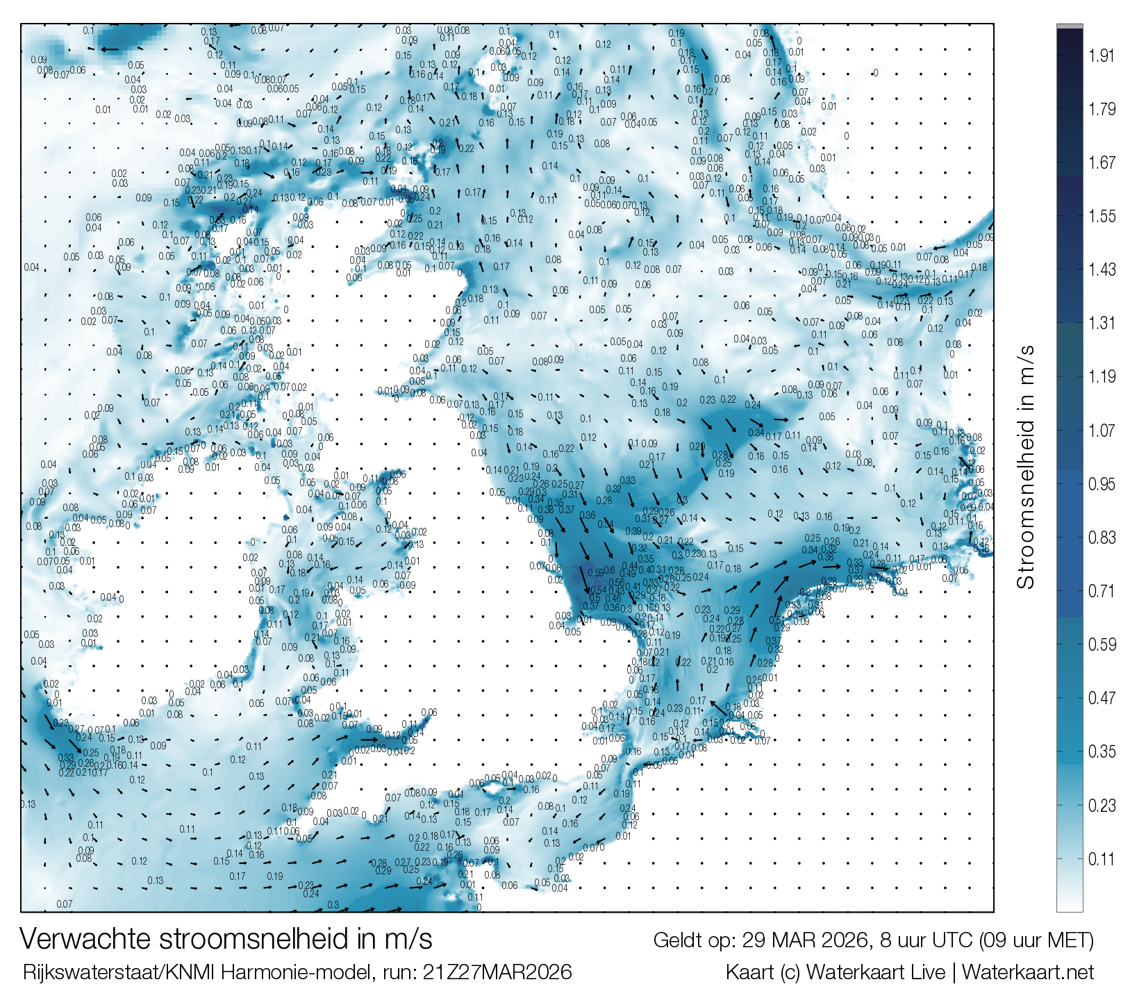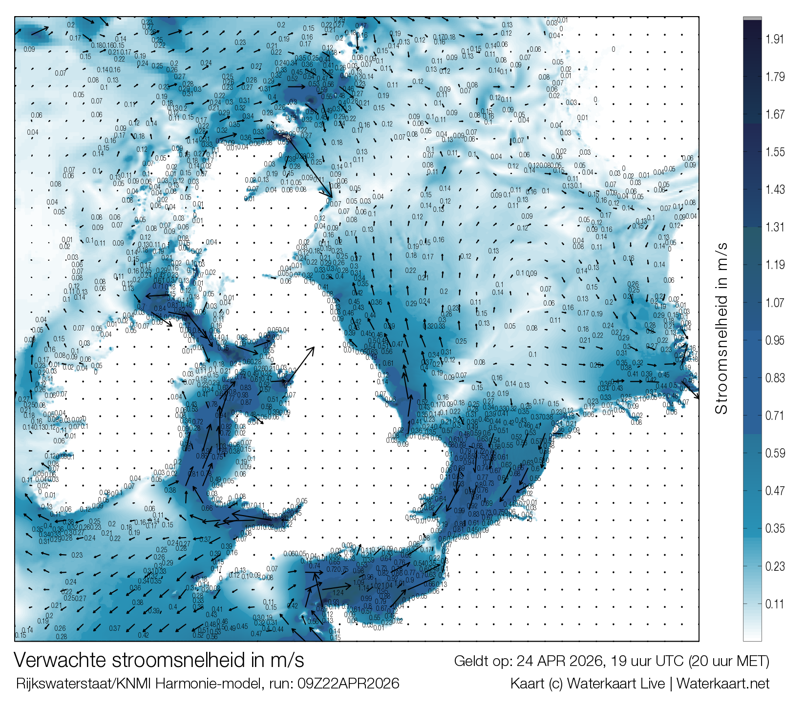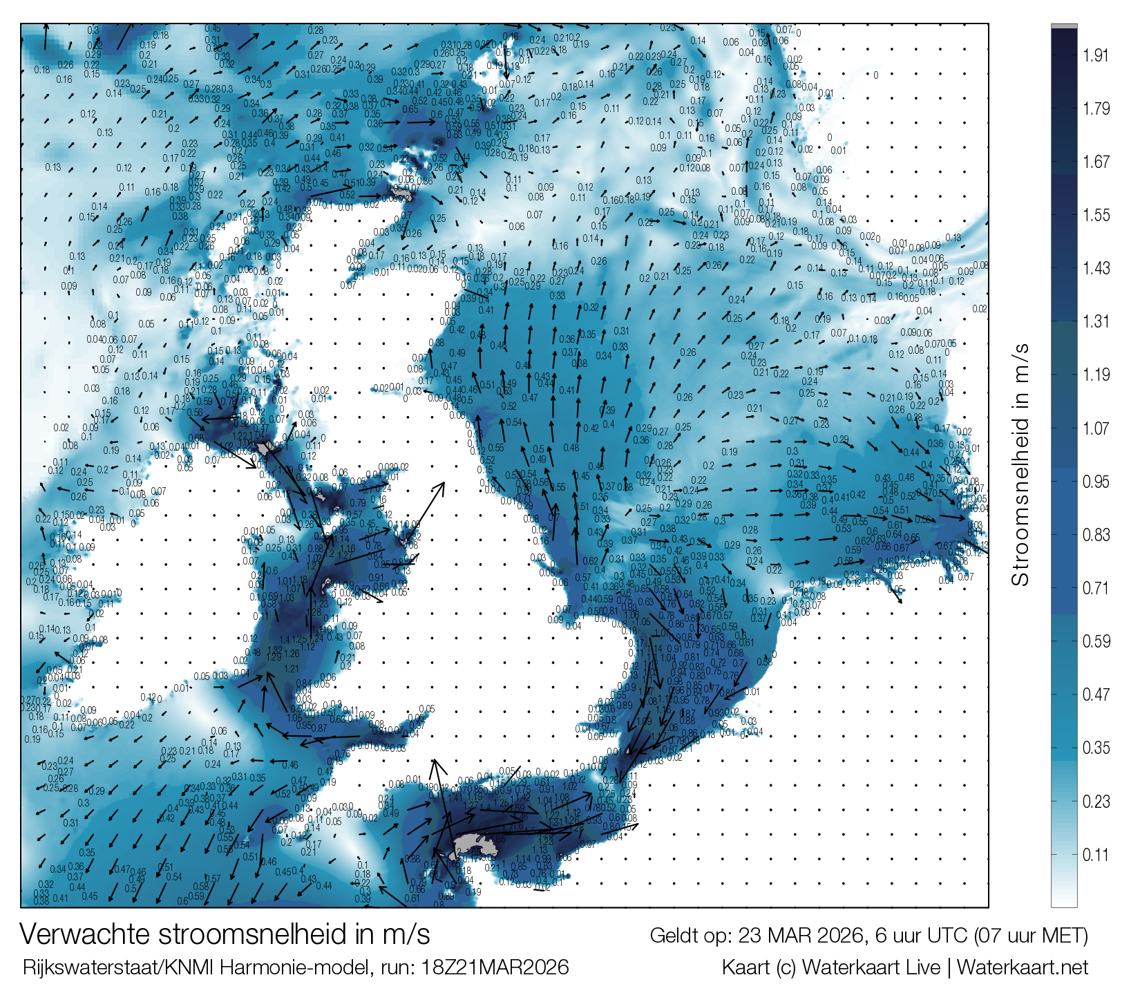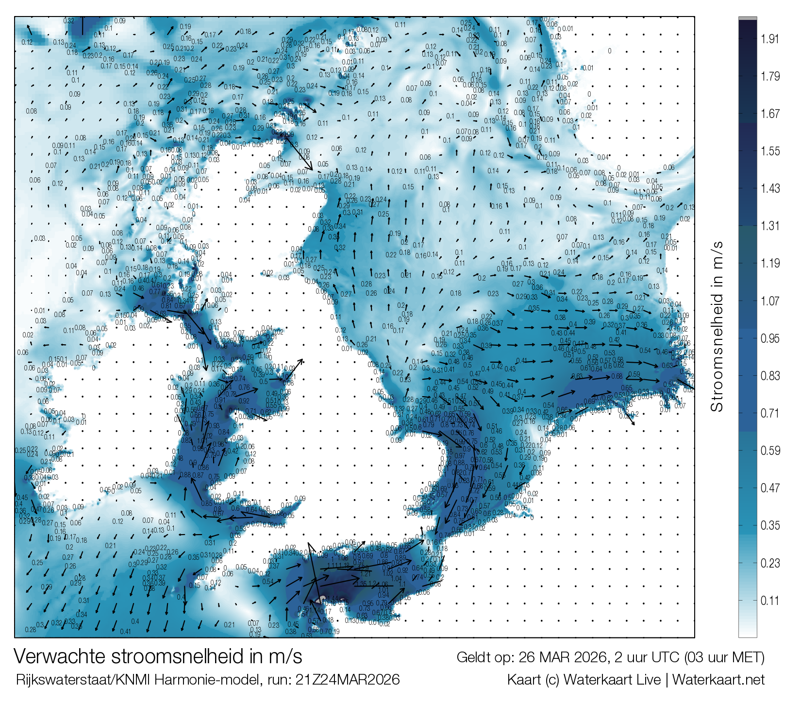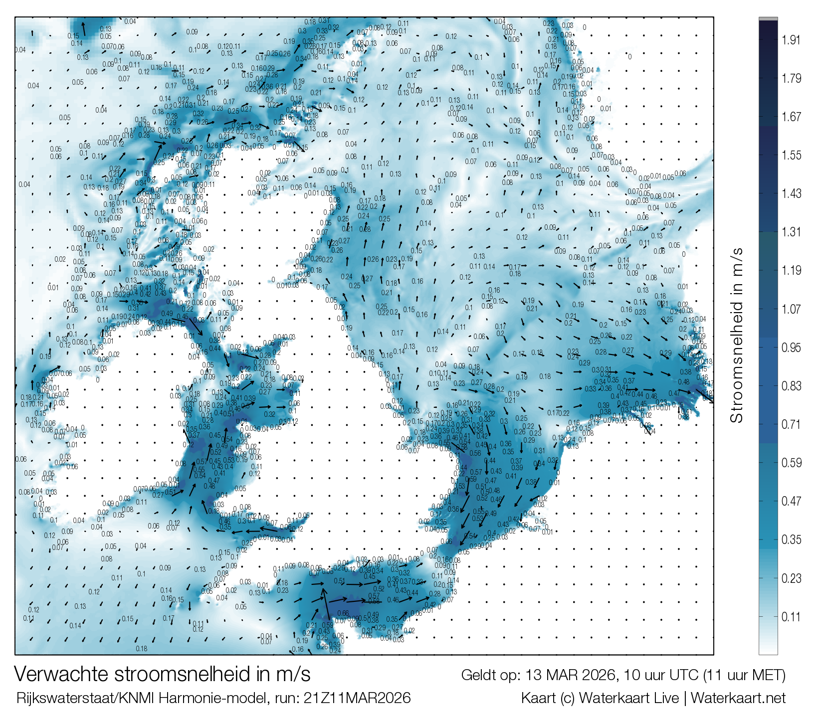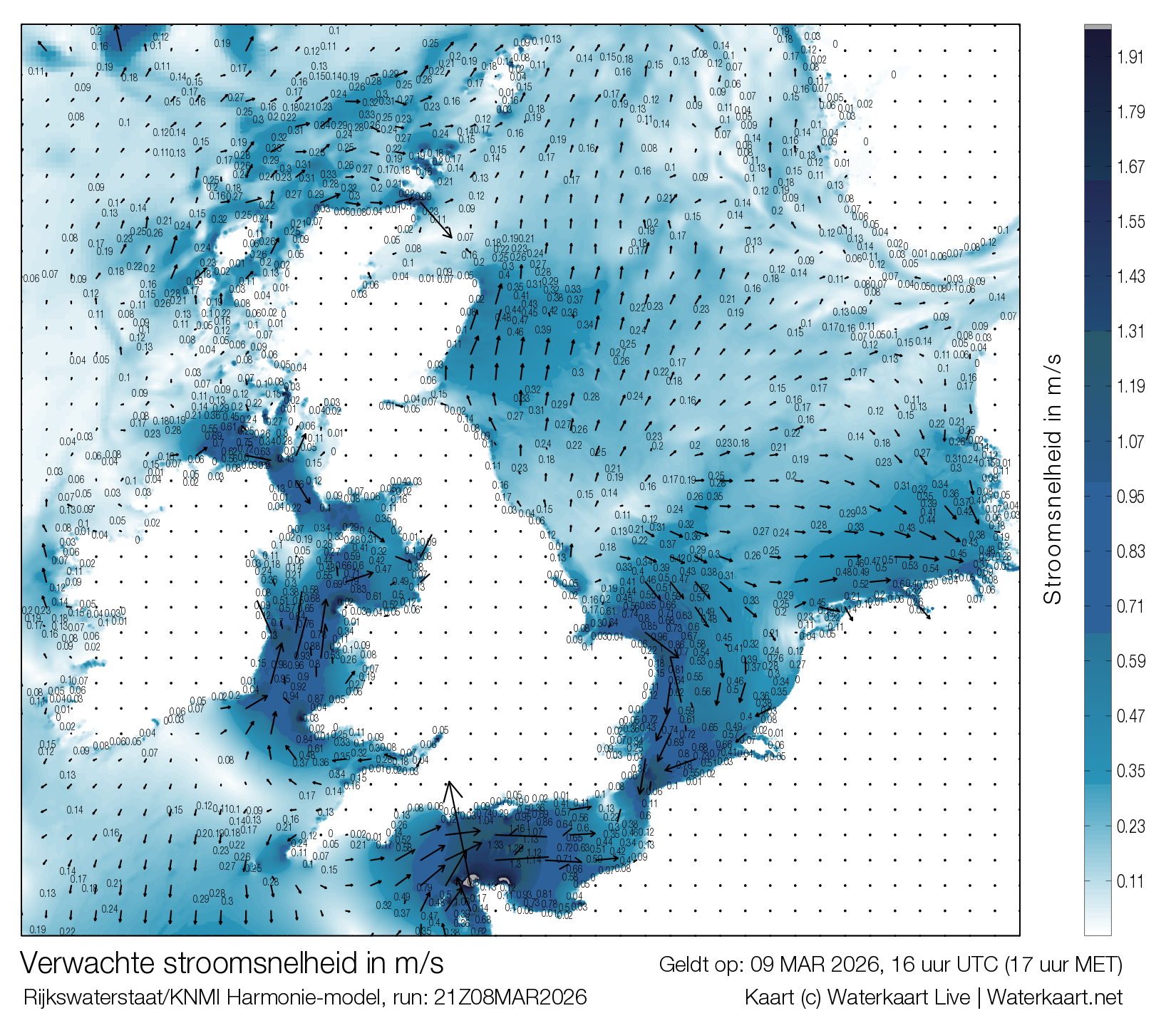 Stroomsnelheden in de Noordzee op basis van de Stroomatlas, verrekend met weersinvloeden. Deze worden iedere dag ververst met data uit het zeestromingen model van Rijkswaterstaat op basis van Harmonie weerdata, voor ieder uur een kaart, tot 48 uur in de toekomst. Lees hieronder meer over dit model