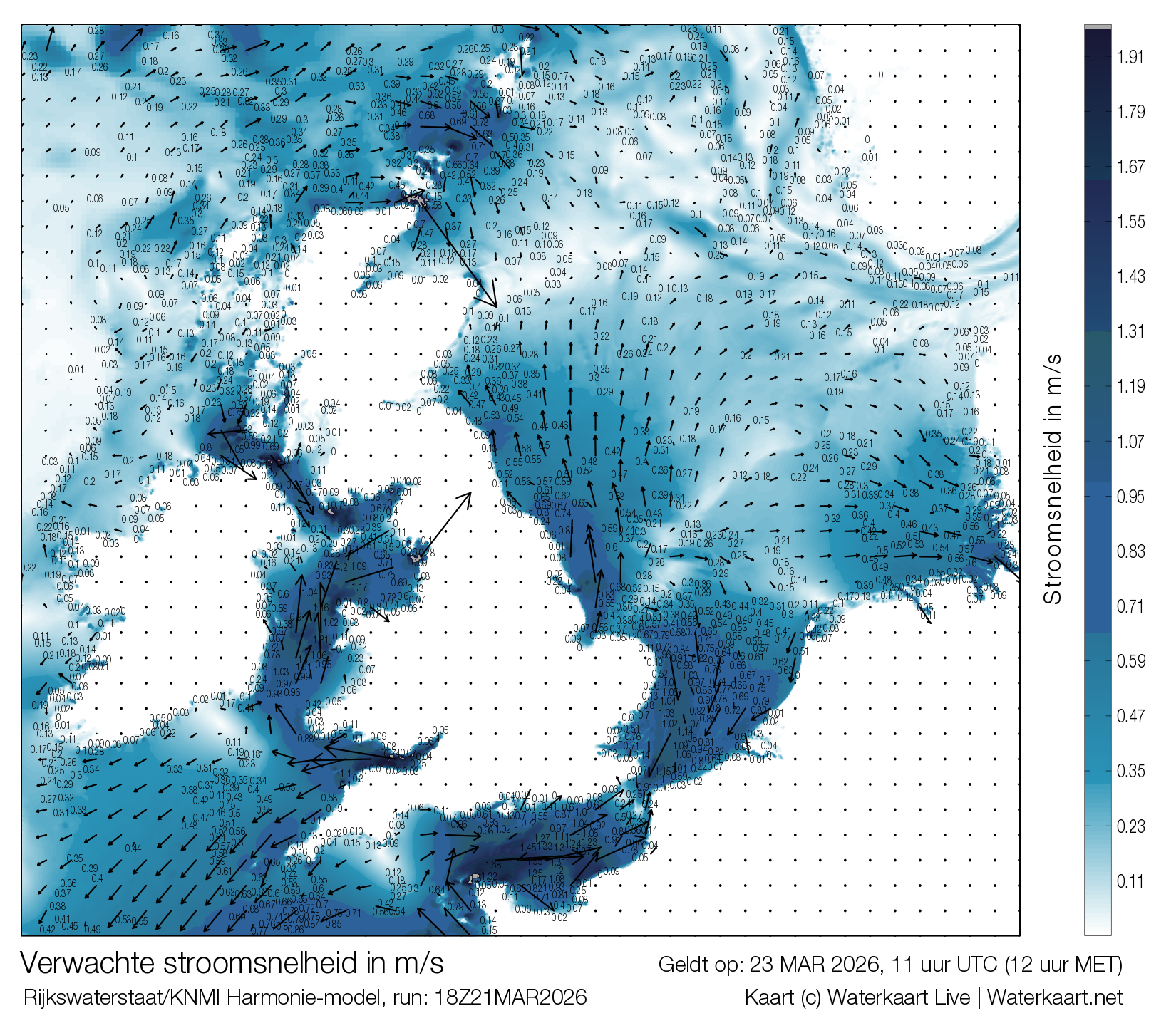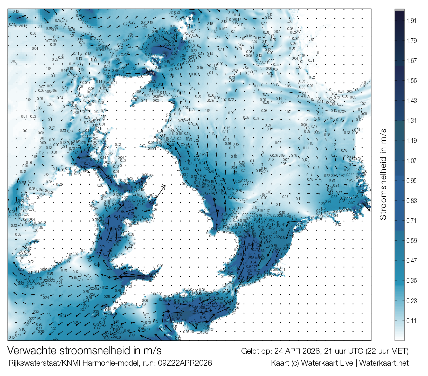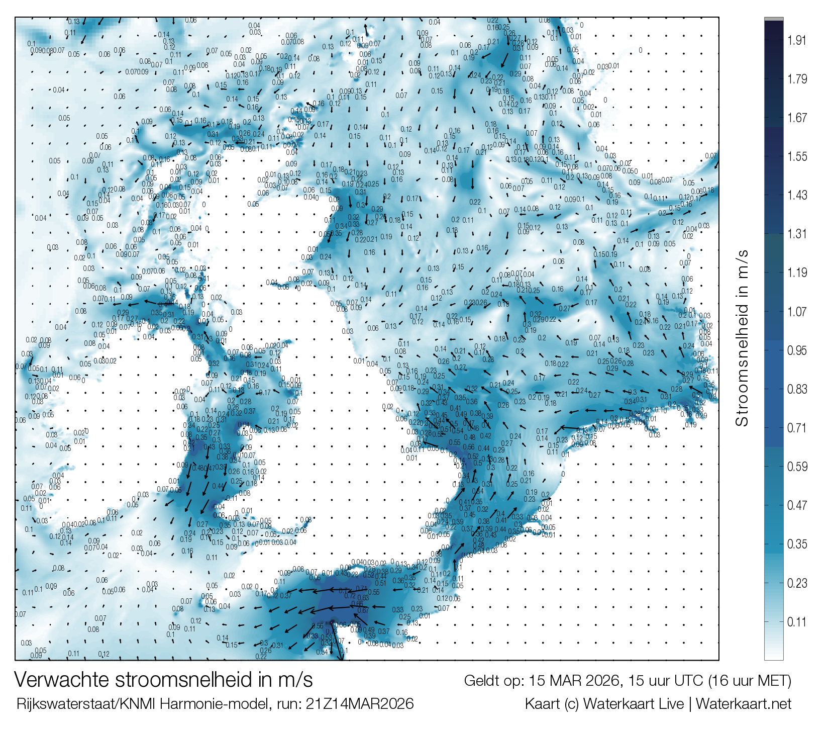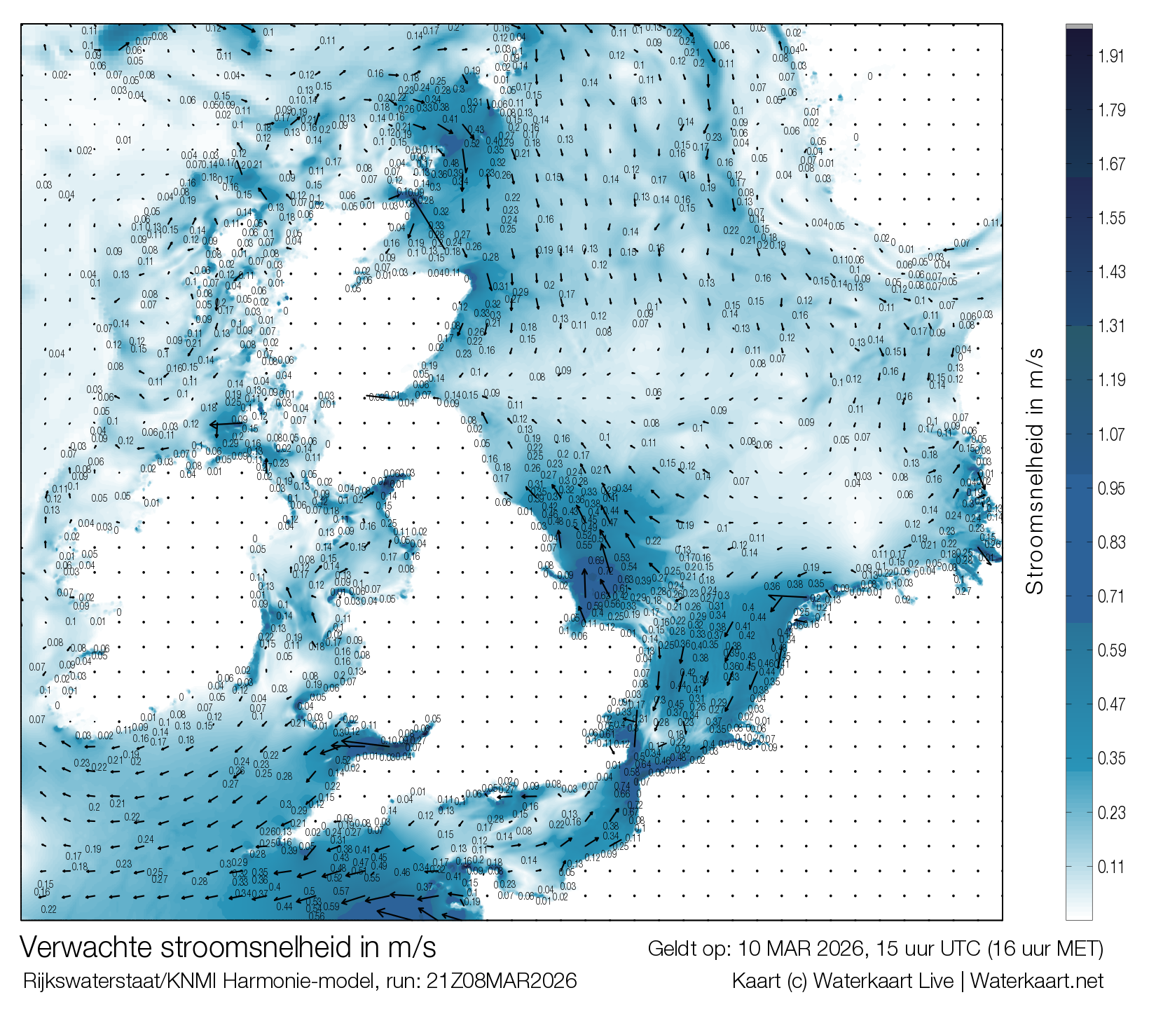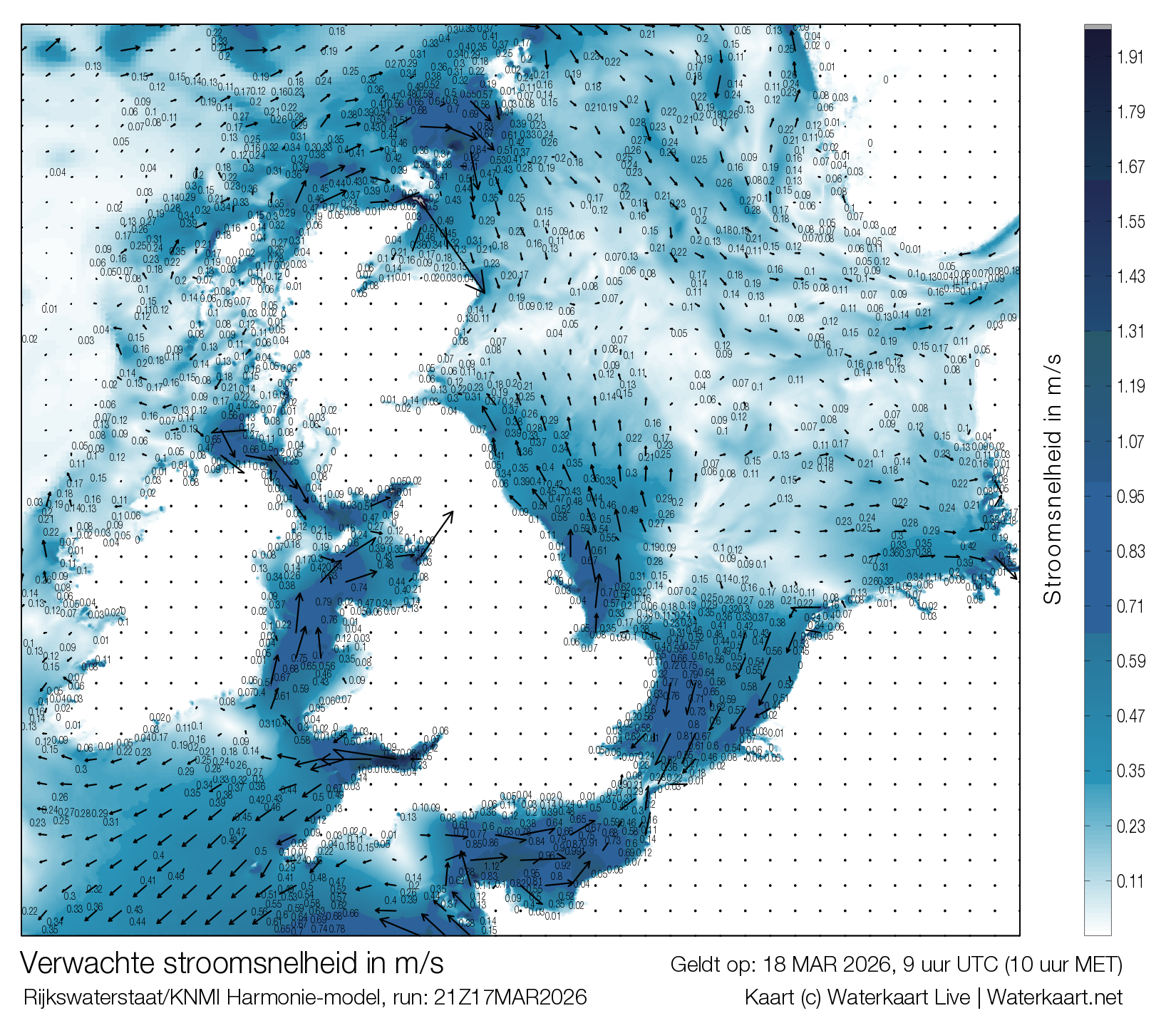 Stroomsnelheden in de Noordzee op basis van de Stroomatlas, verrekend met weersinvloeden. Deze worden iedere dag ververst met data uit het zeestromingen model van Rijkswaterstaat op basis van Harmonie weerdata, voor ieder uur een kaart, tot 48 uur in de toekomst. Lees hieronder meer over dit model