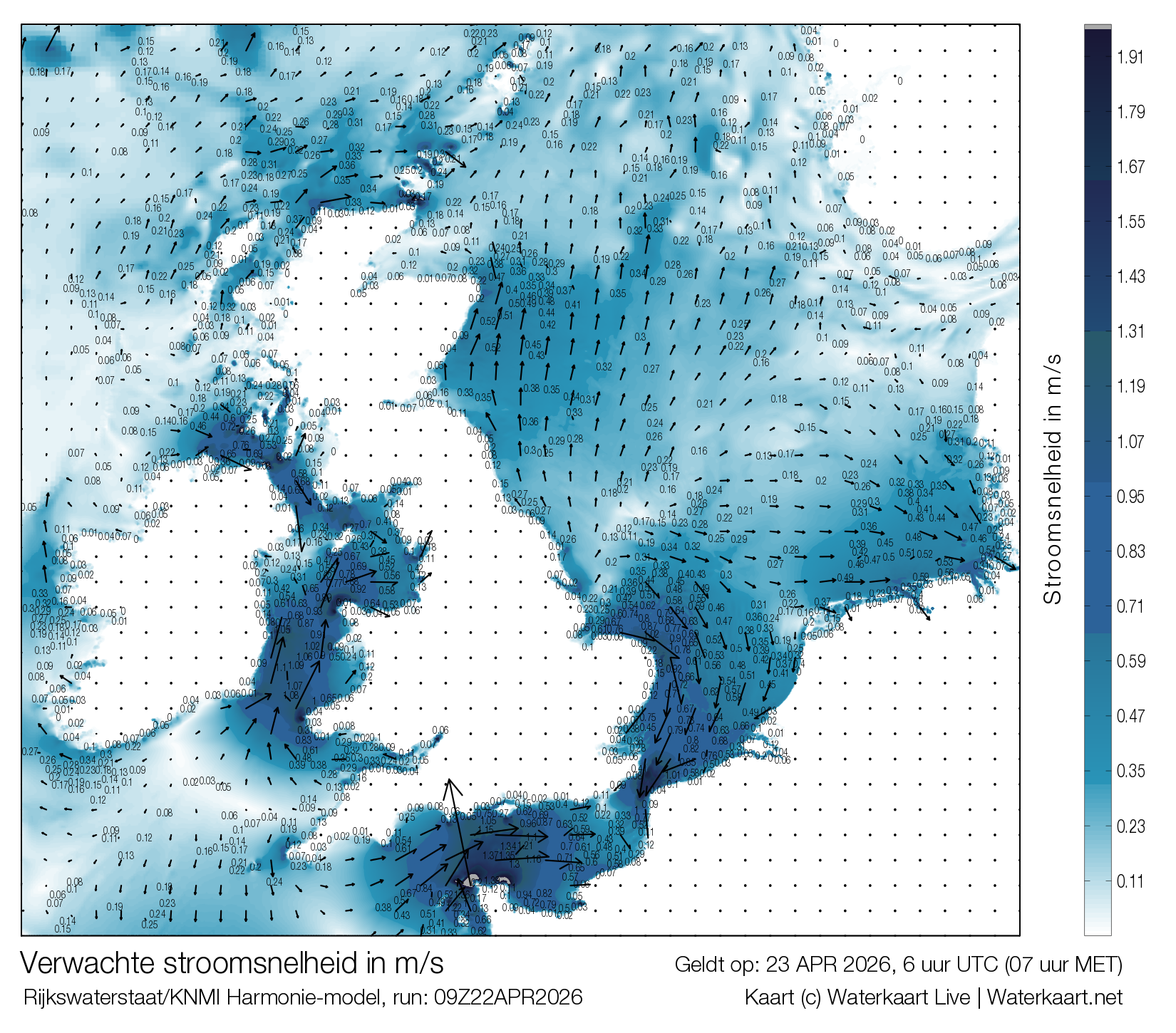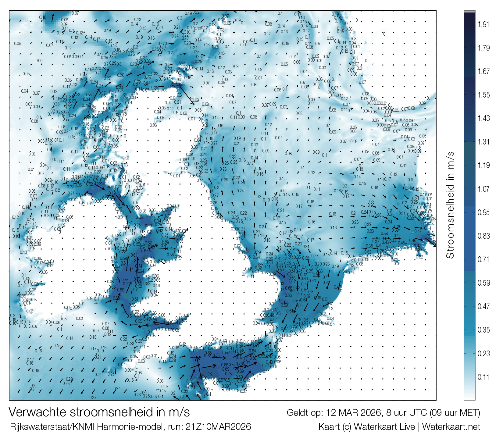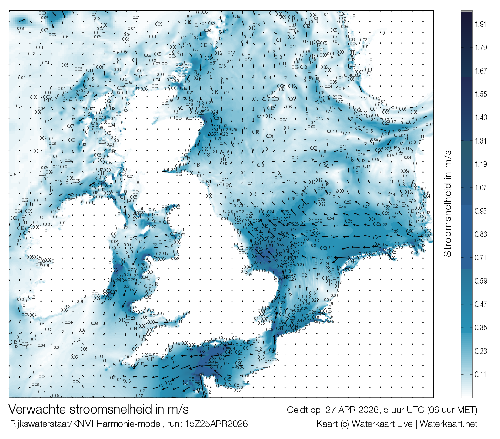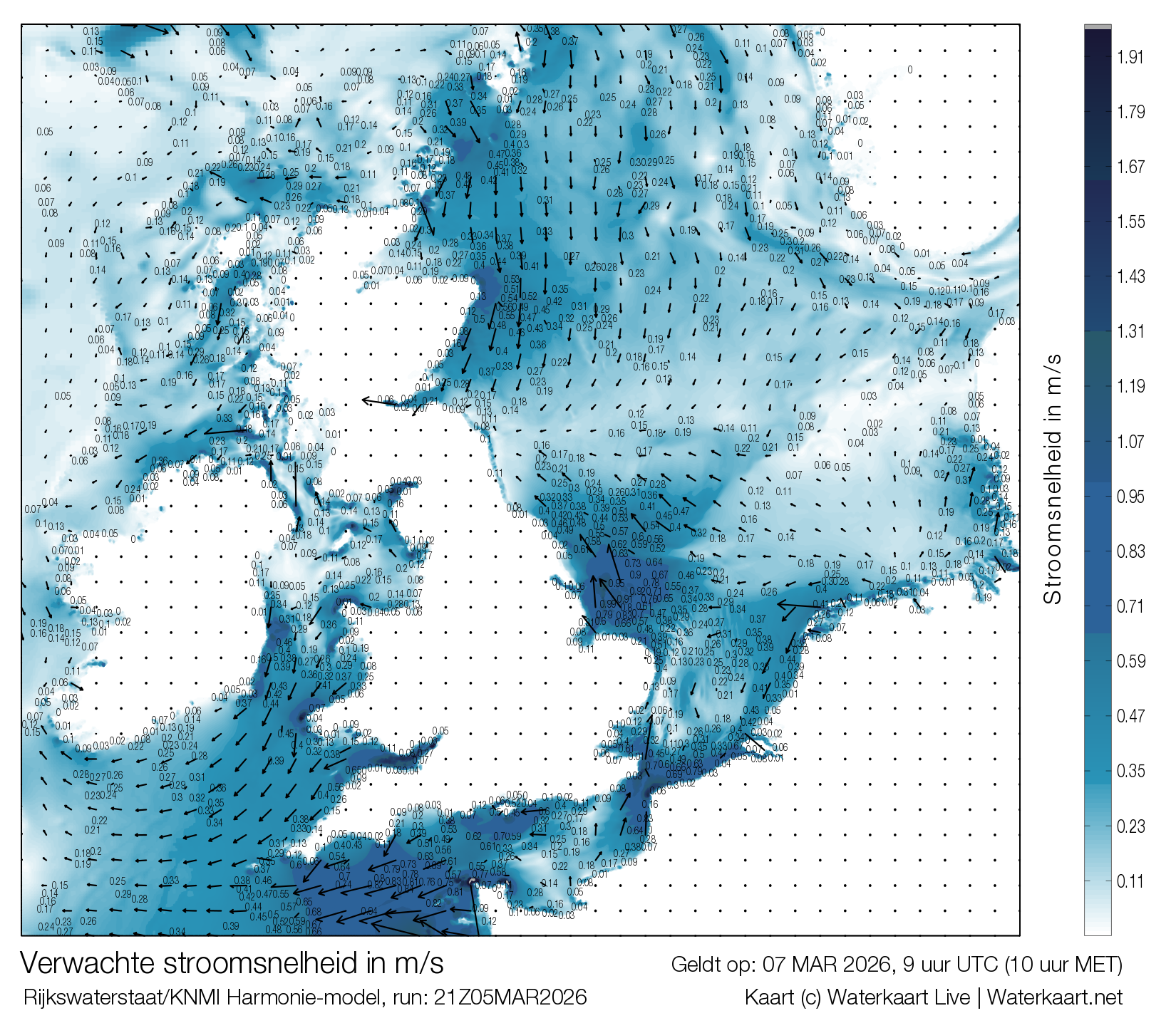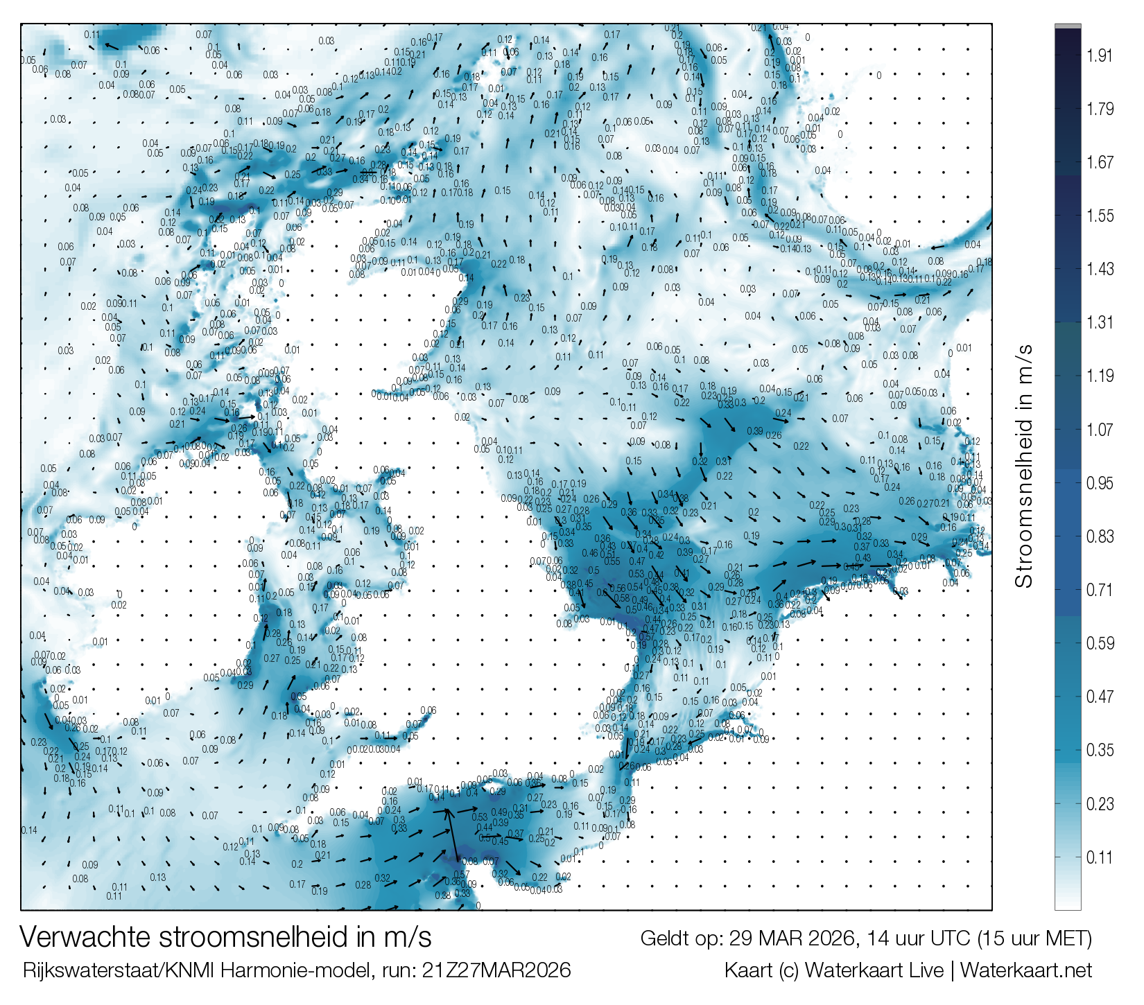 Stroomsnelheden in de Noordzee op basis van de Stroomatlas, verrekend met weersinvloeden. Deze worden iedere dag ververst met data uit het zeestromingen model van Rijkswaterstaat op basis van Harmonie weerdata, voor ieder uur een kaart, tot 48 uur in de toekomst. Lees hieronder meer over dit model
