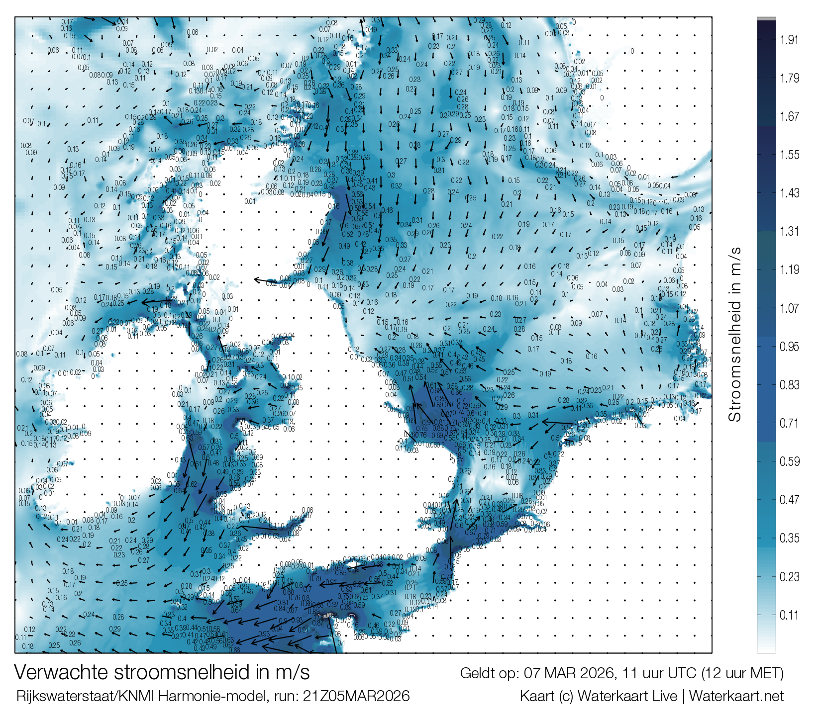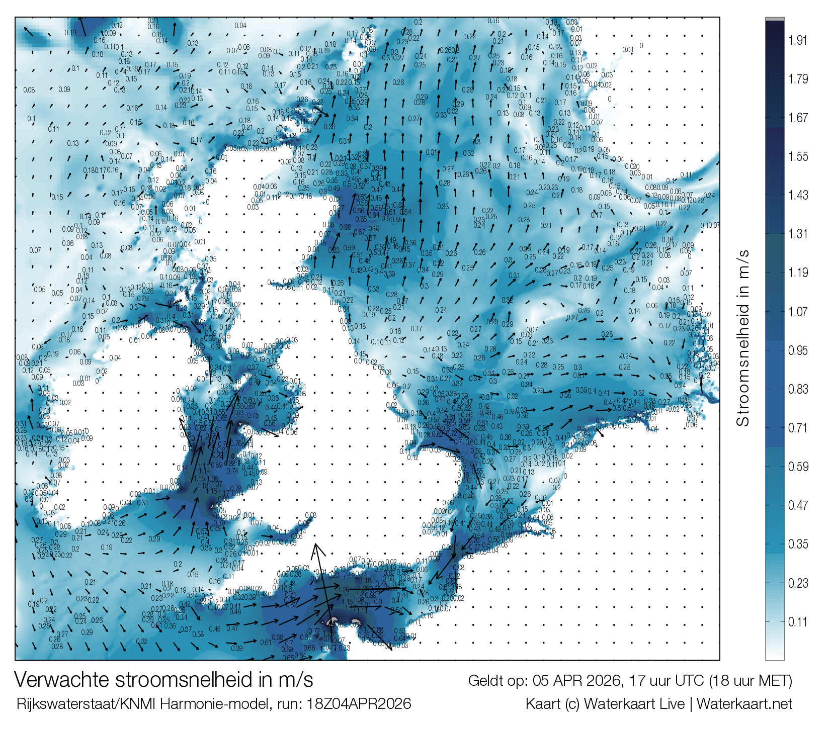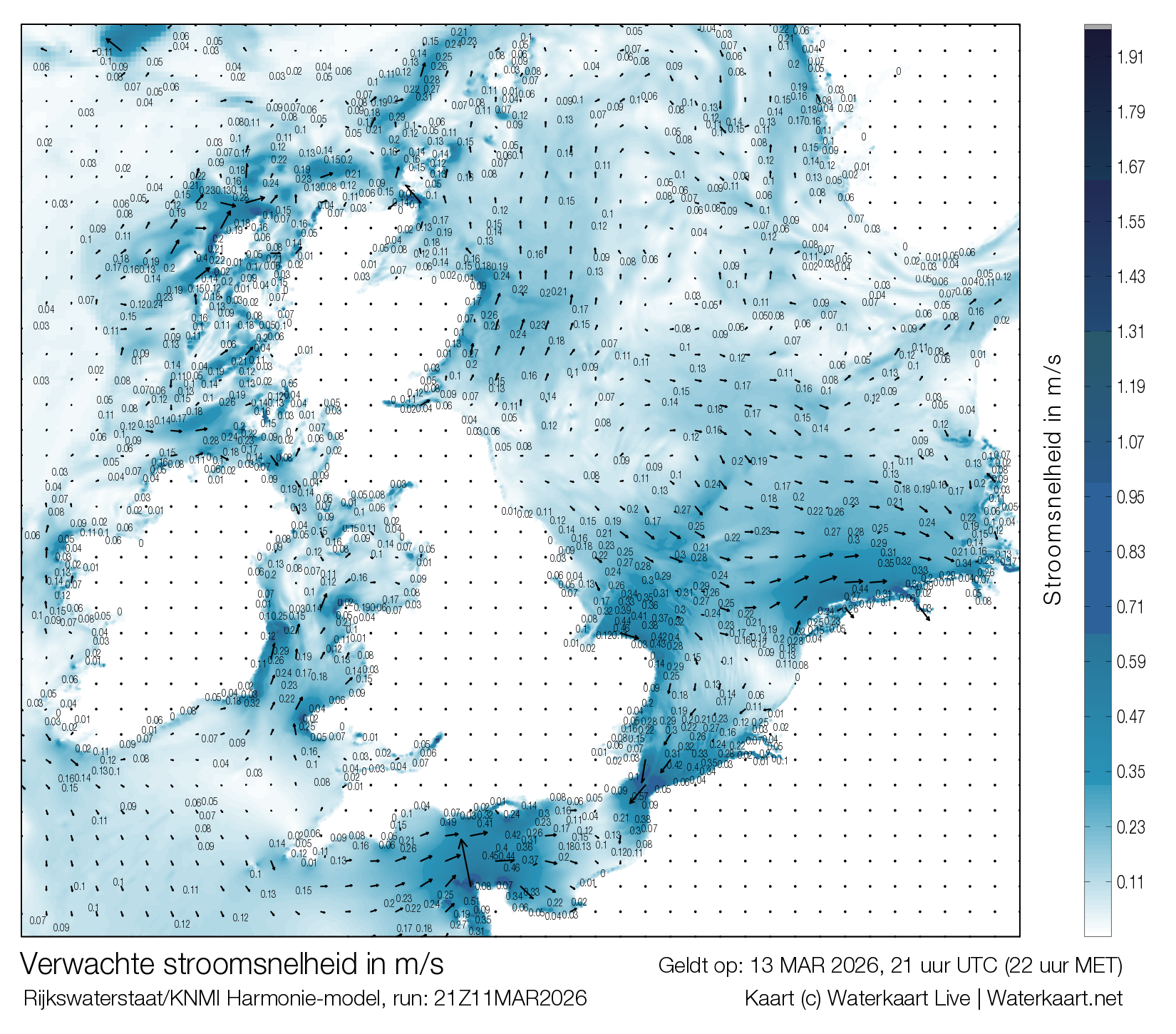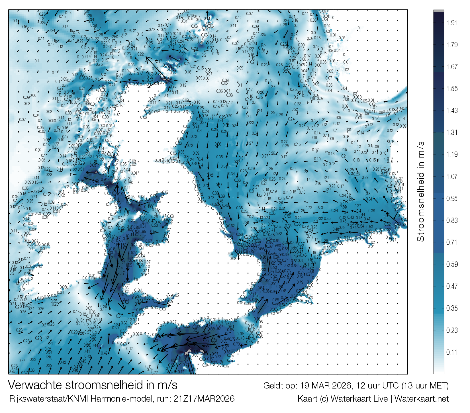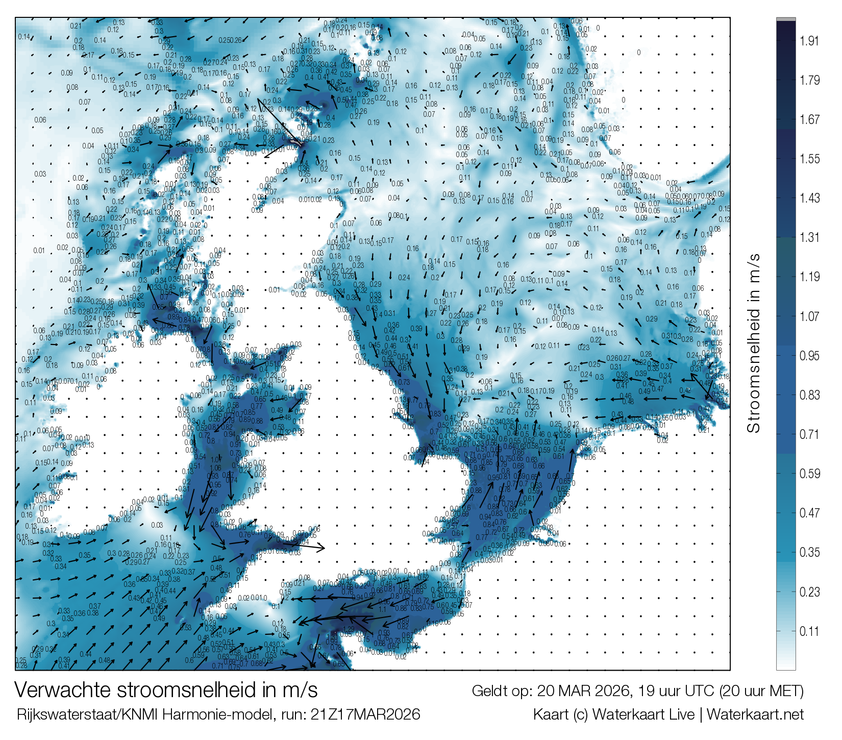 Stroomsnelheden in de Noordzee op basis van de Stroomatlas, verrekend met weersinvloeden. Deze worden iedere dag ververst met data uit het zeestromingen model van Rijkswaterstaat op basis van Harmonie weerdata, voor ieder uur een kaart, tot 48 uur in de toekomst. Lees hieronder meer over dit model