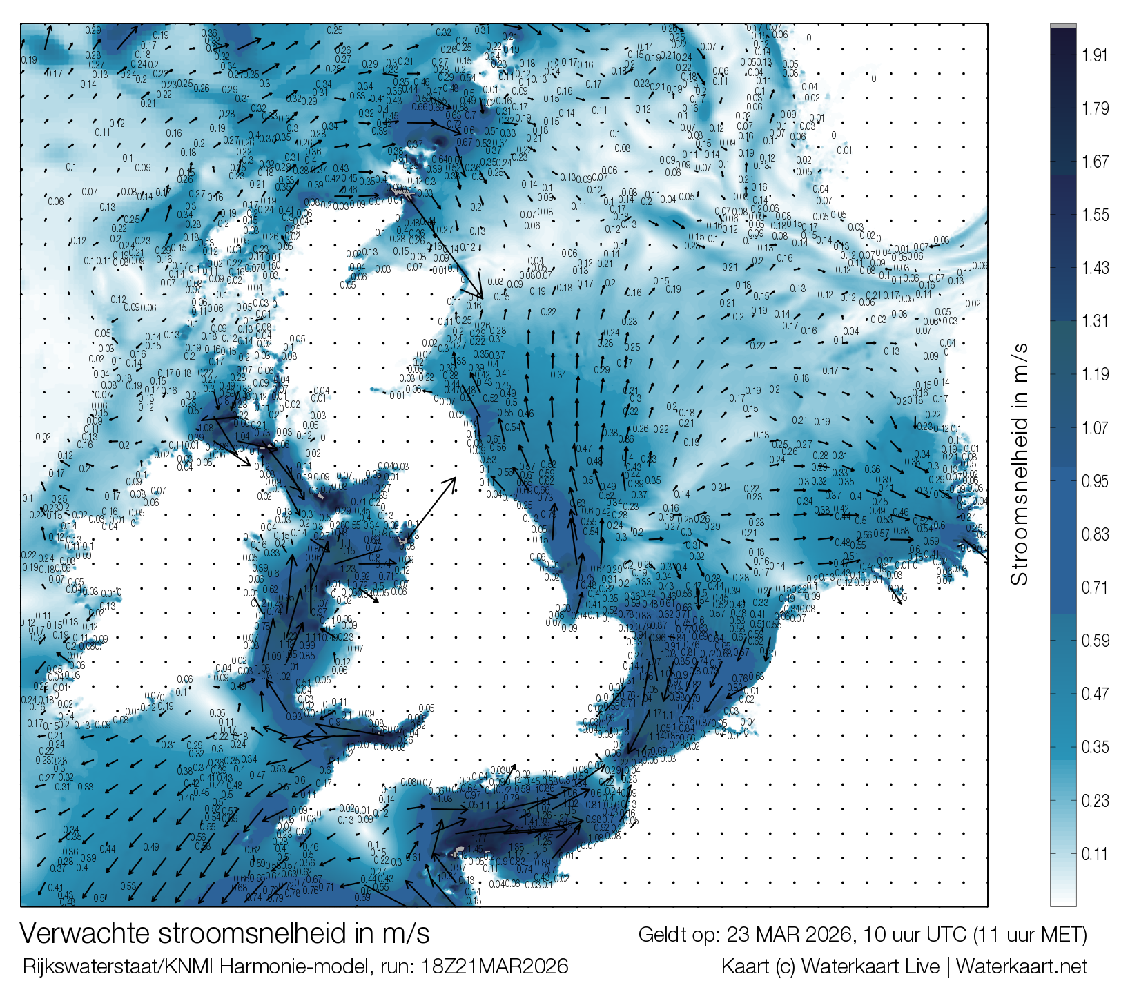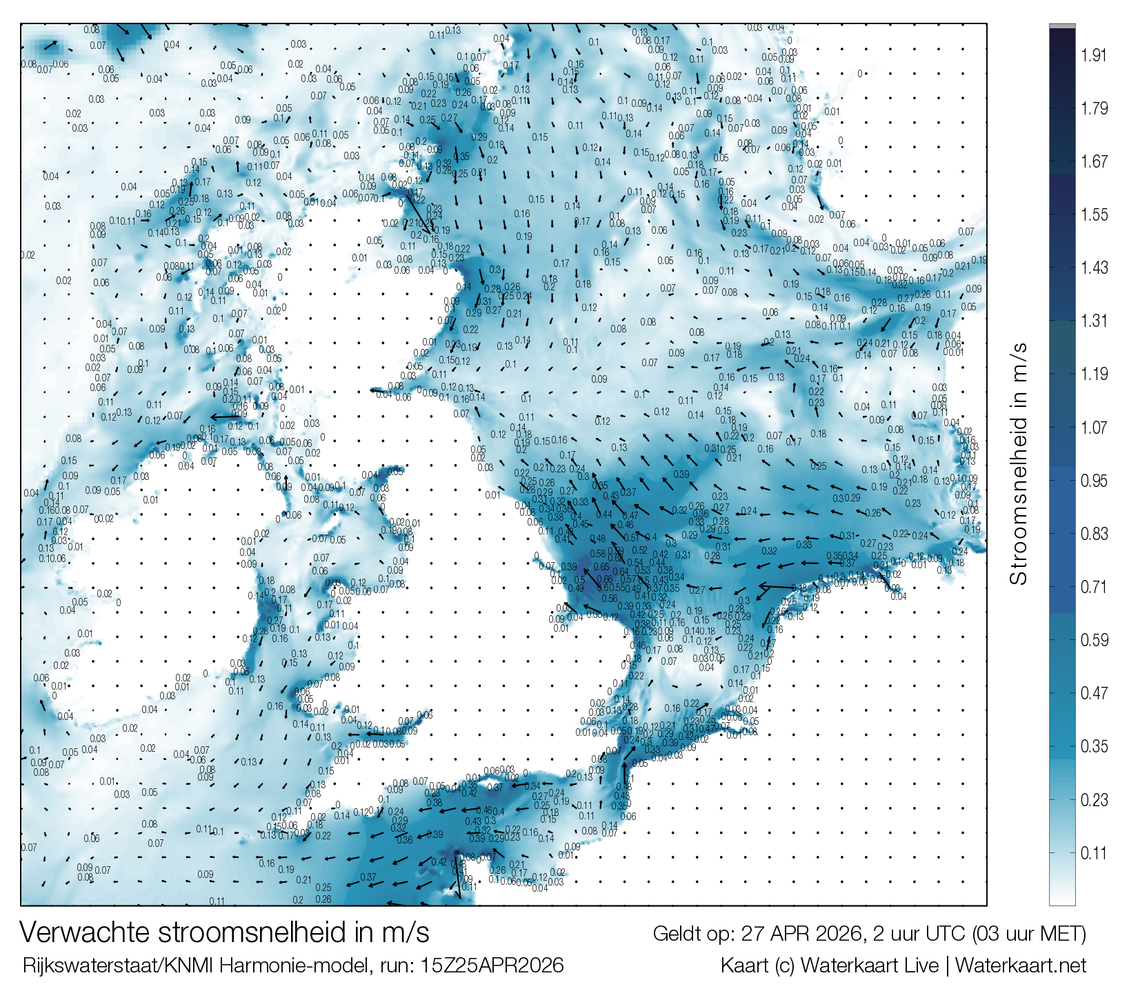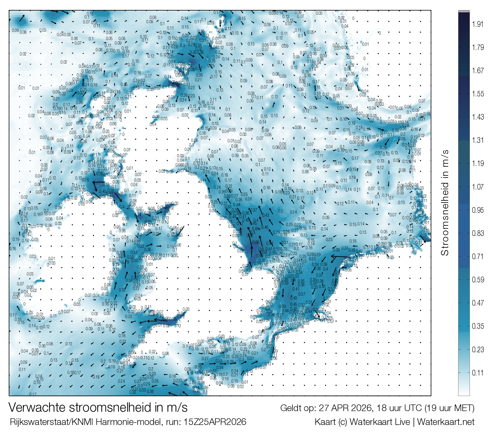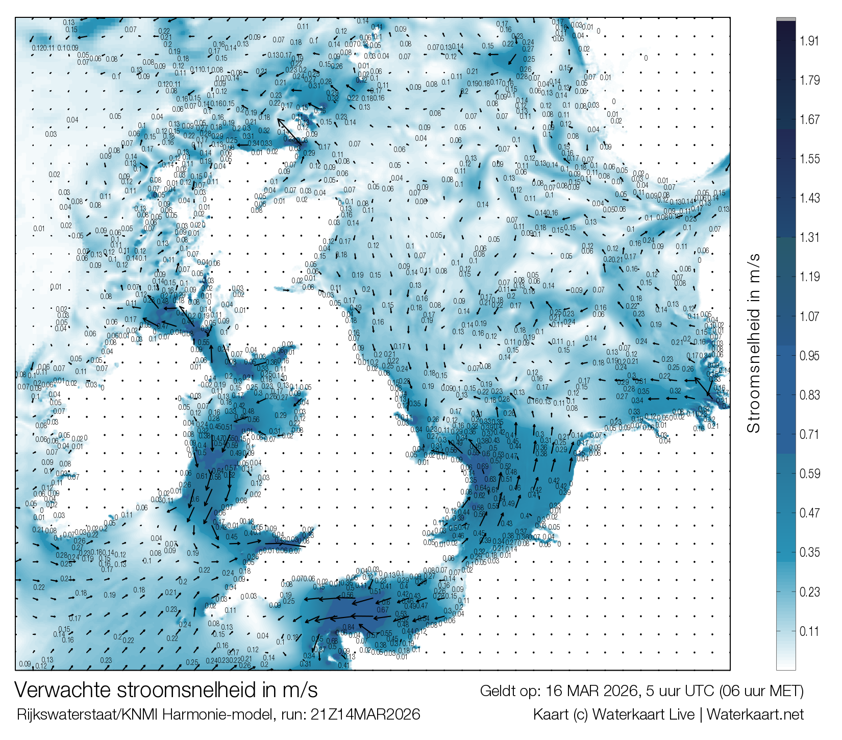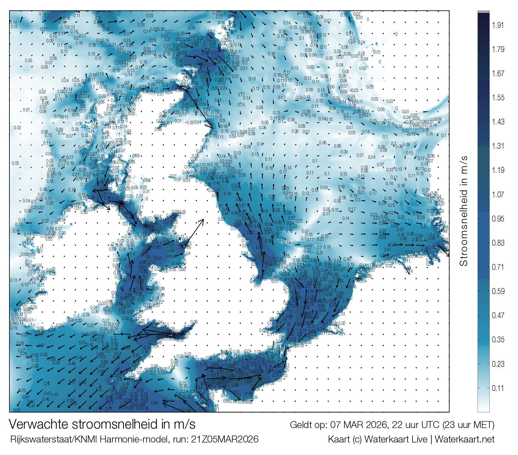 Stroomsnelheden in de Noordzee op basis van de Stroomatlas, verrekend met weersinvloeden. Deze worden iedere dag ververst met data uit het zeestromingen model van Rijkswaterstaat op basis van Harmonie weerdata, voor ieder uur een kaart, tot 48 uur in de toekomst. Lees hieronder meer over dit model