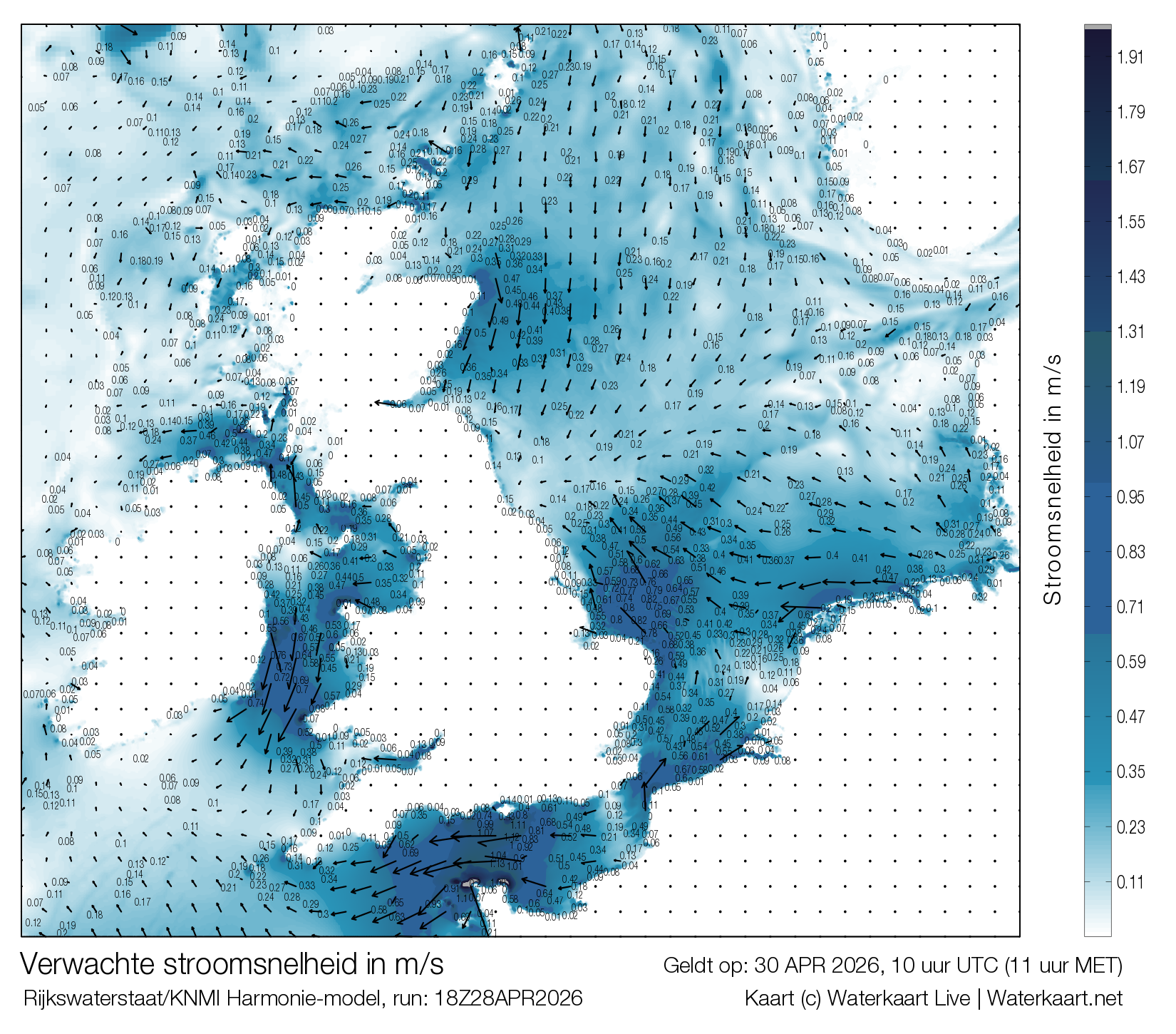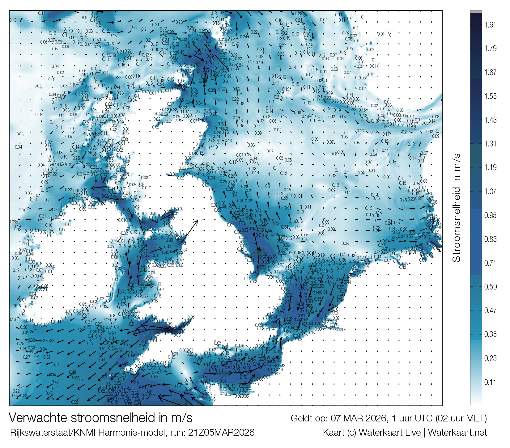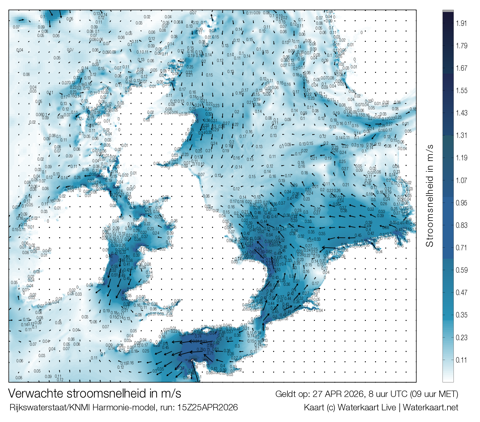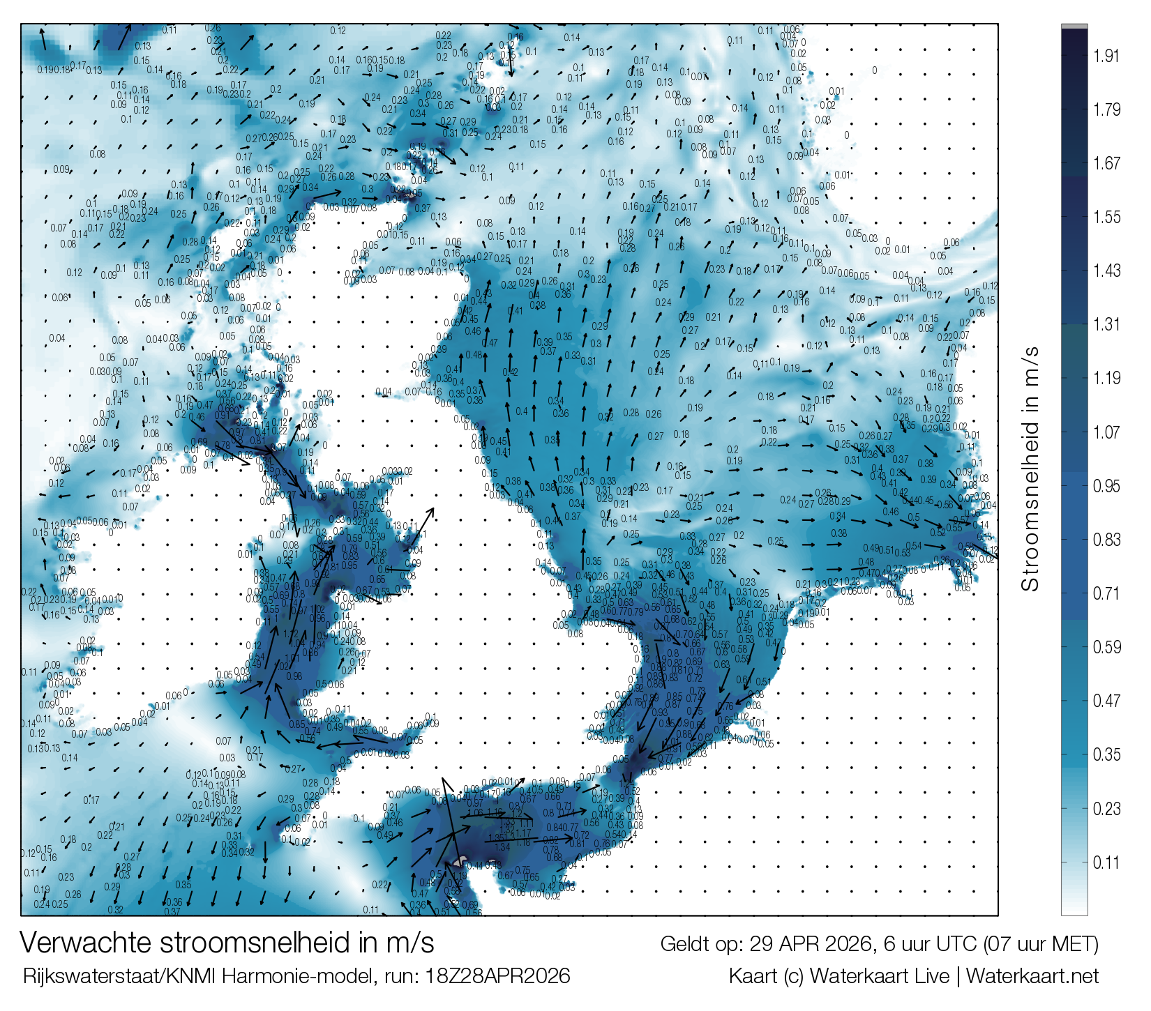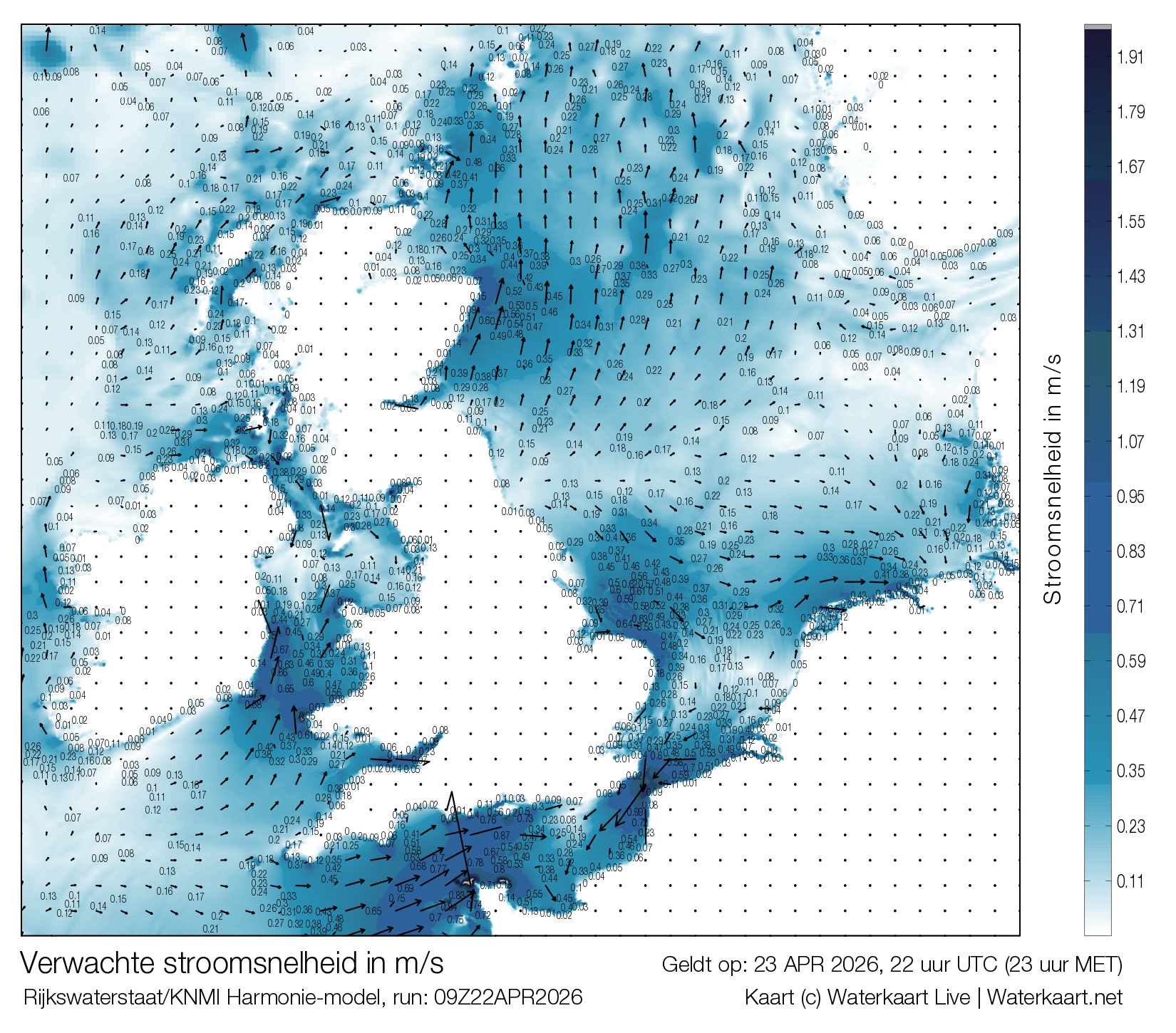Stroomsnelheden in de Noordzee op basis van de Stroomatlas, verrekend met weersinvloeden. Deze worden iedere dag ververst met data uit het zeestromingen model van Rijkswaterstaat op basis van Harmonie weerdata, voor ieder uur een kaart, tot 48 uur in de toekomst. Lees hieronder meer over dit model