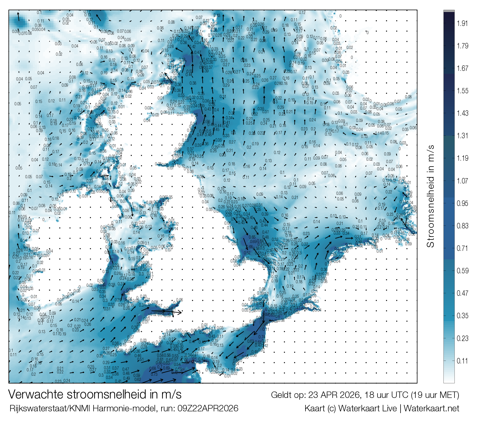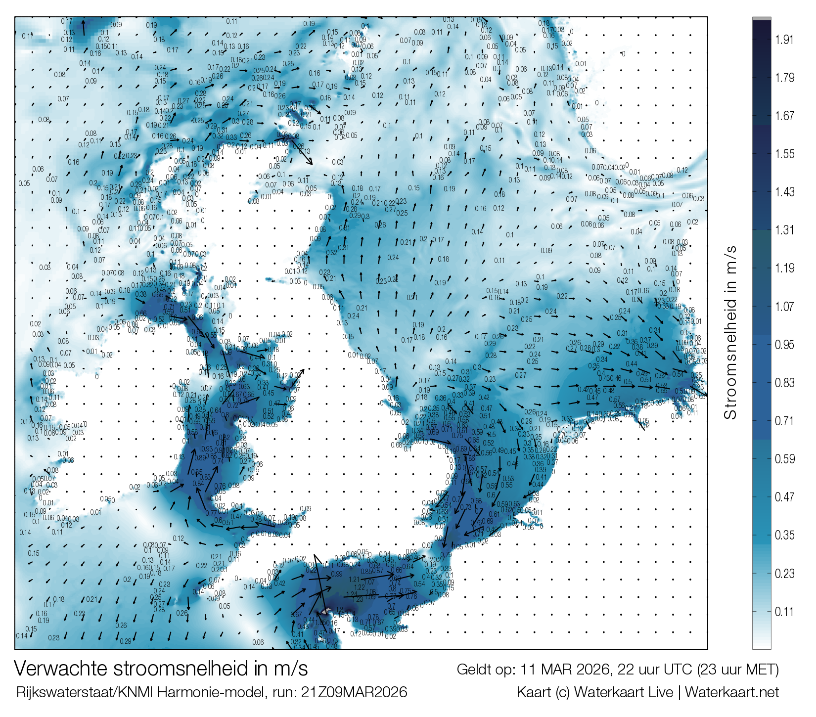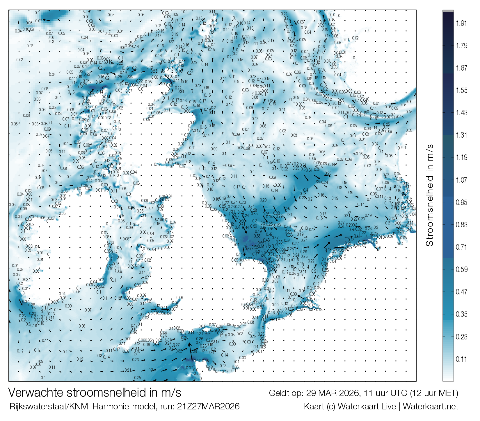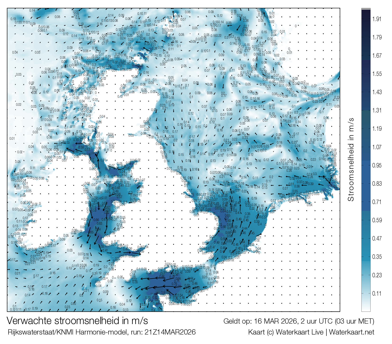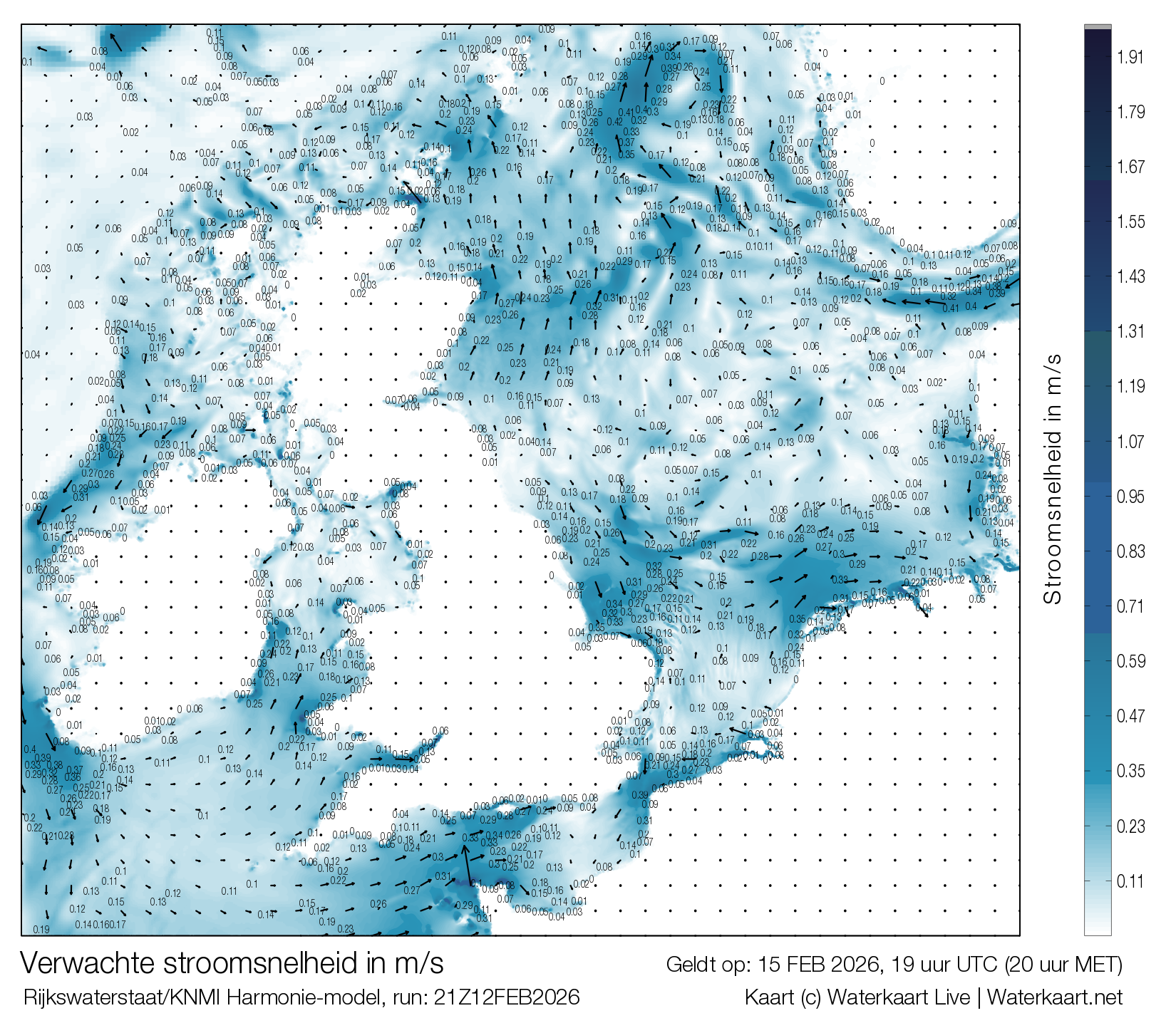 Stroomsnelheden in de Noordzee op basis van de Stroomatlas, verrekend met weersinvloeden. Deze worden iedere dag ververst met data uit het zeestromingen model van Rijkswaterstaat op basis van Harmonie weerdata, voor ieder uur een kaart, tot 48 uur in de toekomst. Lees hieronder meer over dit model