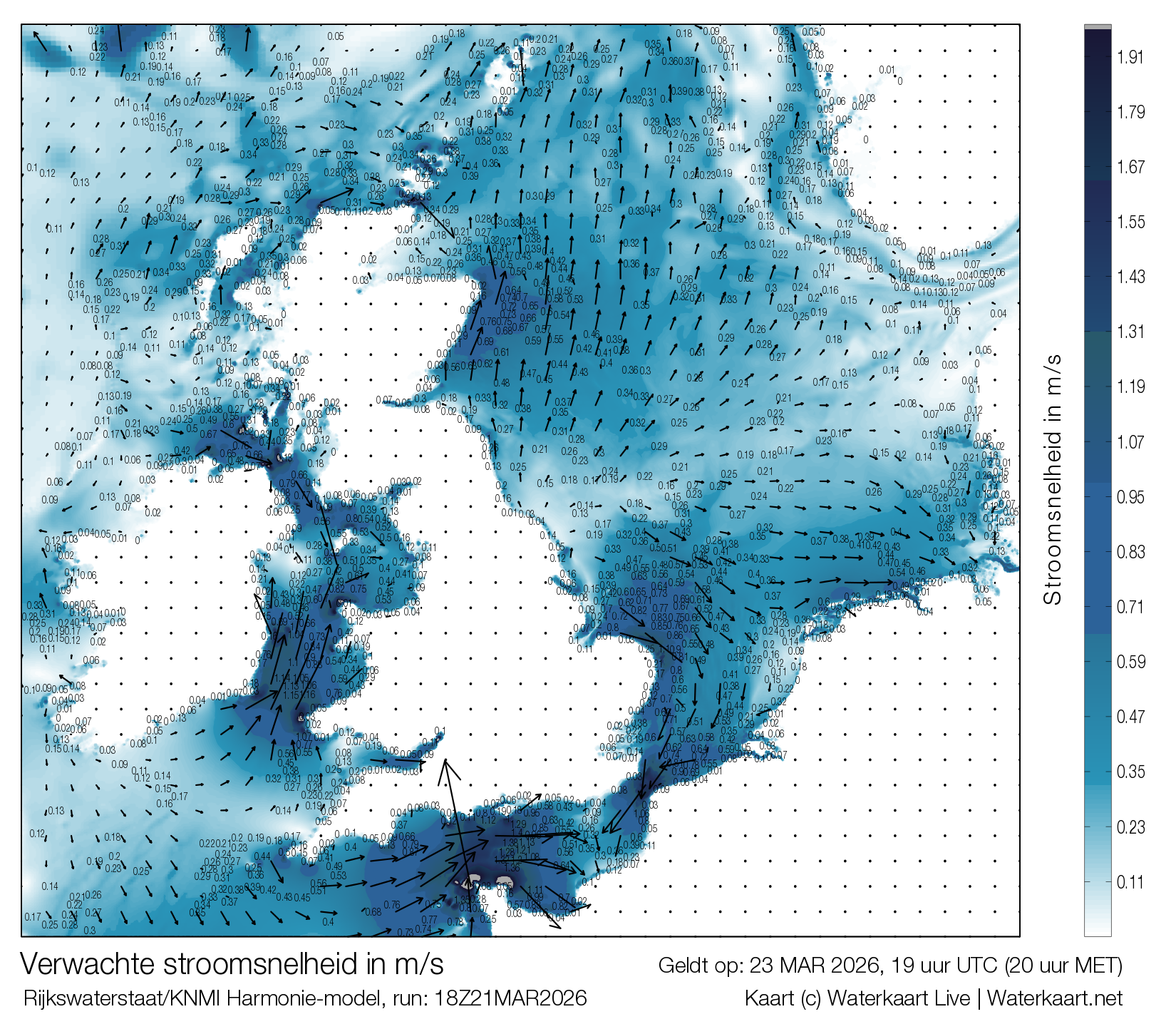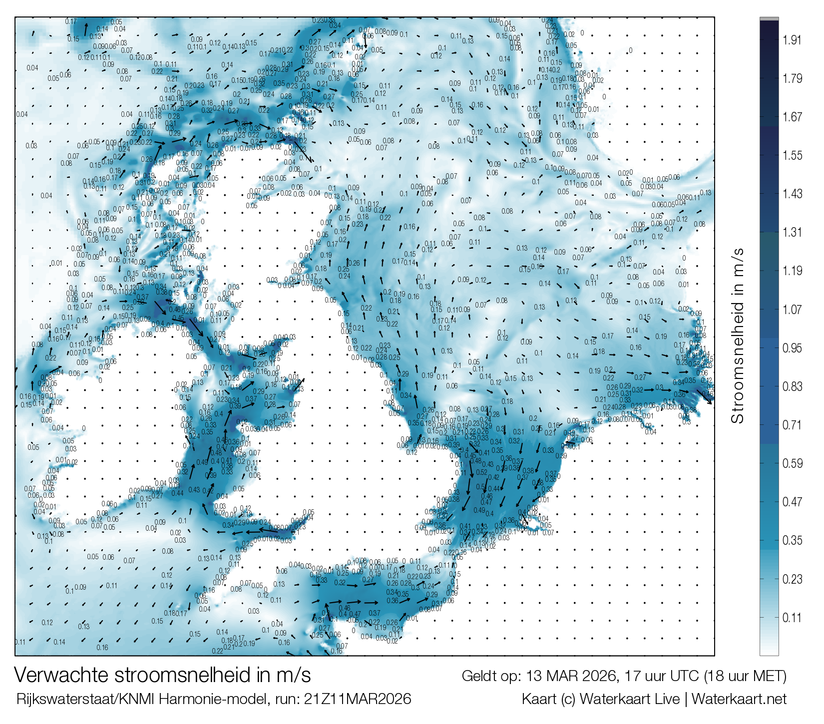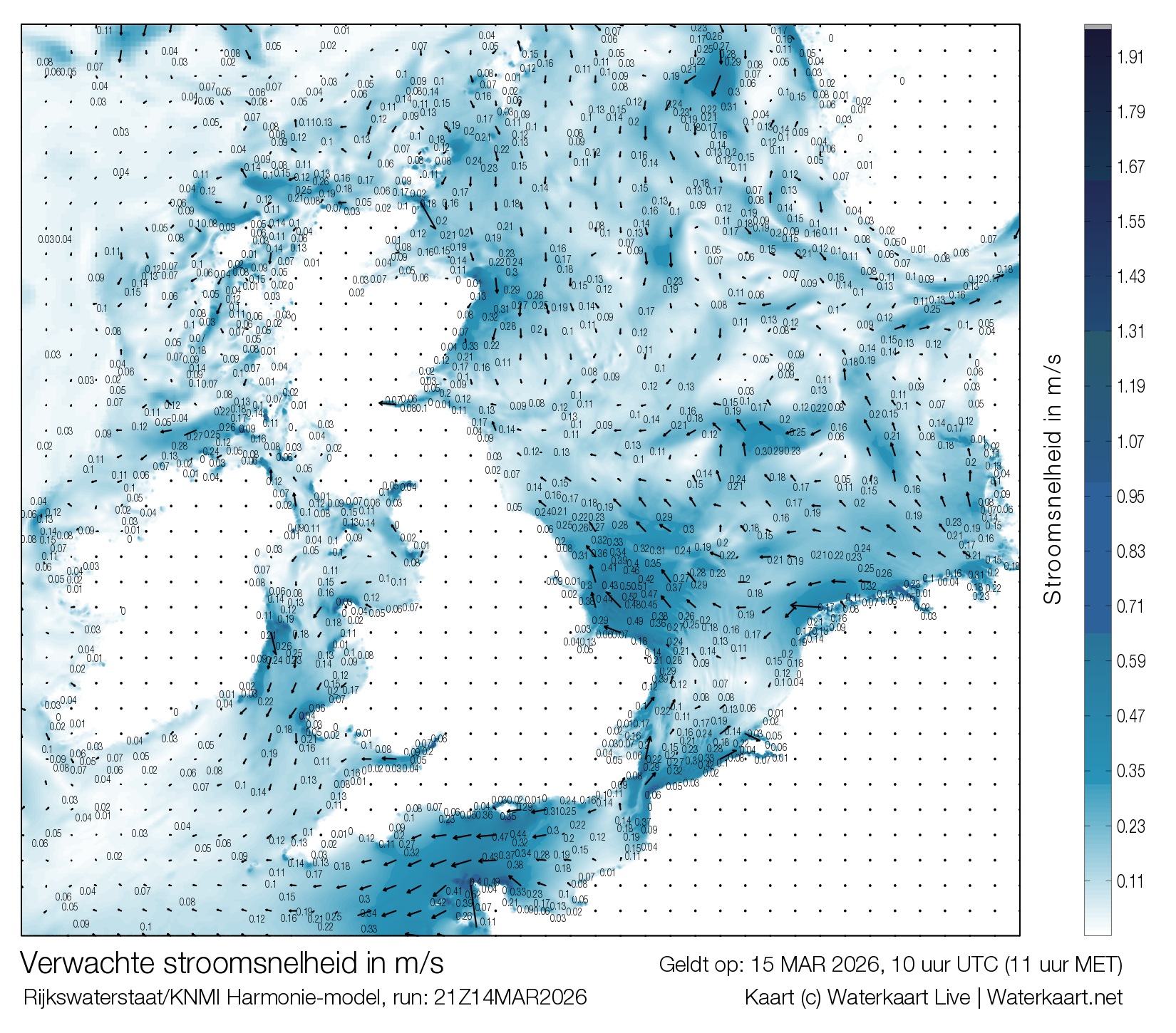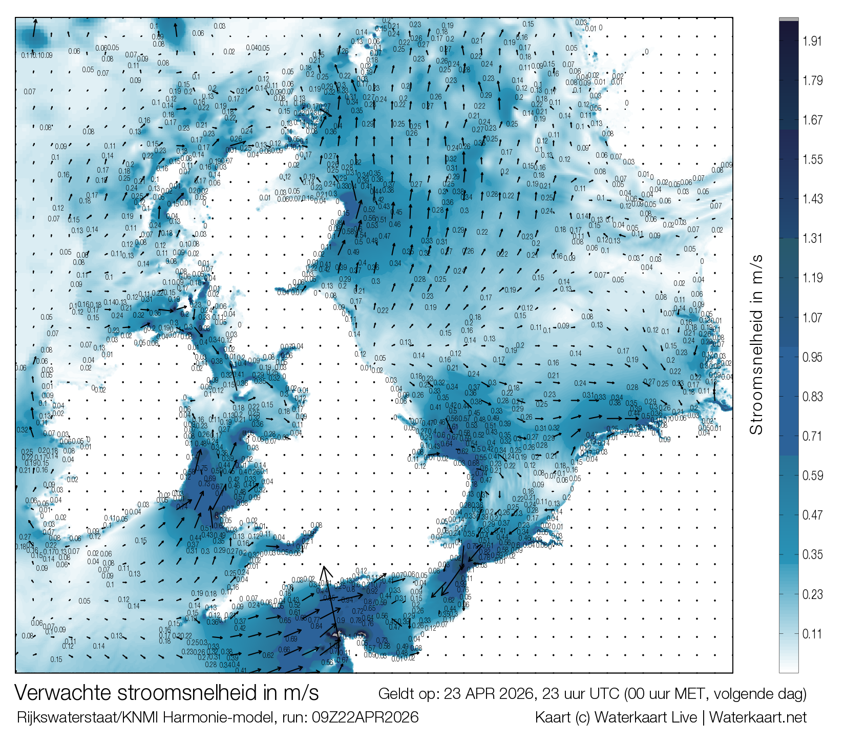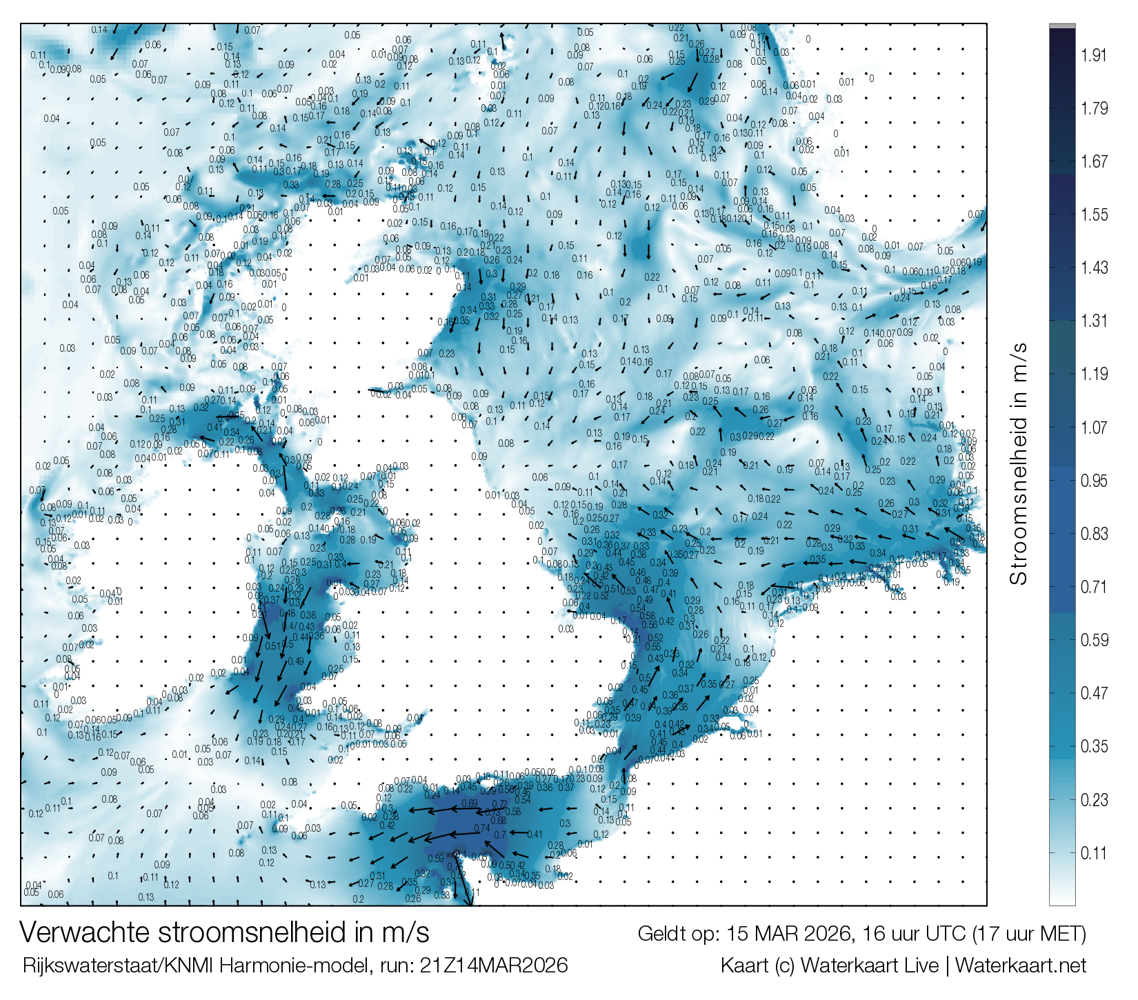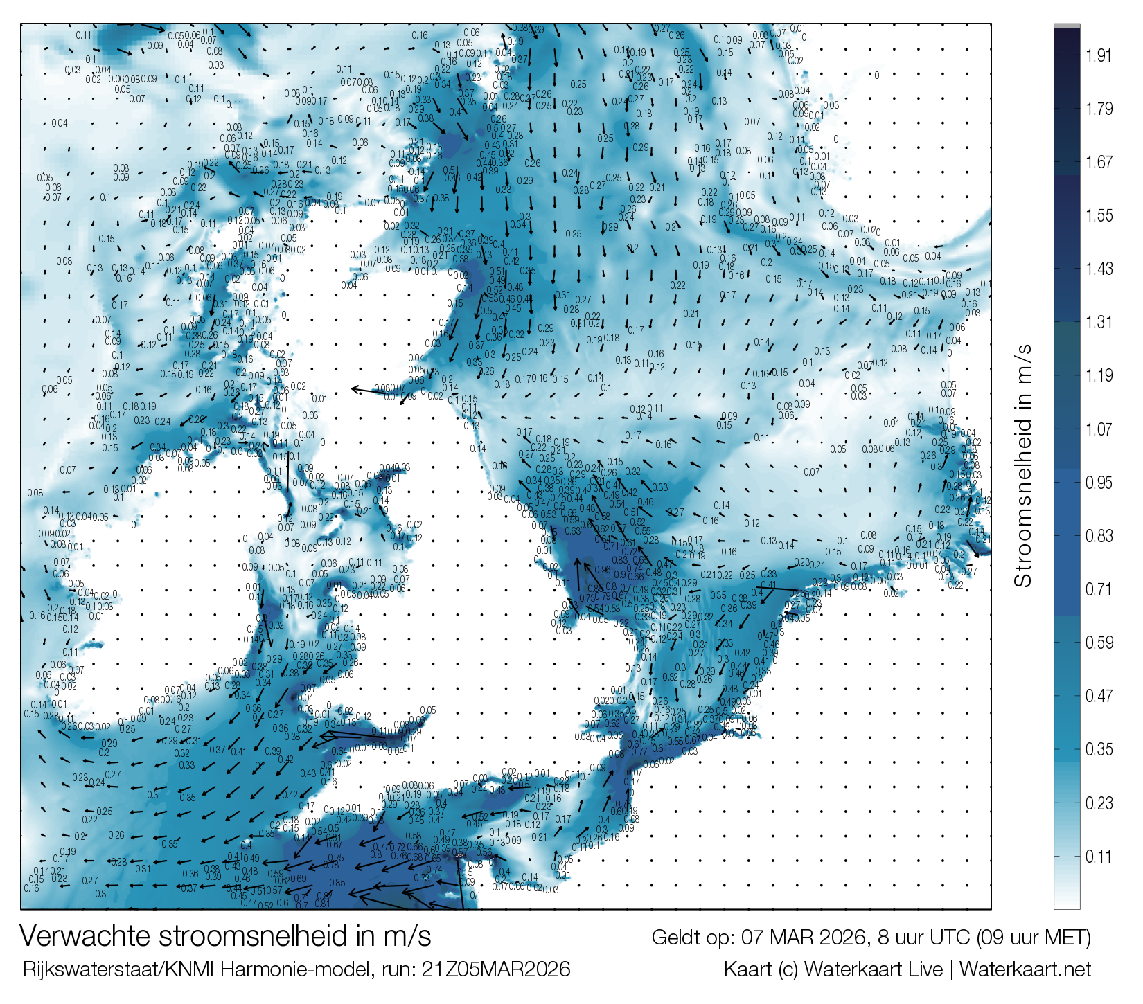 Stroomsnelheden in de Noordzee op basis van de Stroomatlas, verrekend met weersinvloeden. Deze worden iedere dag ververst met data uit het zeestromingen model van Rijkswaterstaat op basis van Harmonie weerdata, voor ieder uur een kaart, tot 48 uur in de toekomst. Lees hieronder meer over dit model